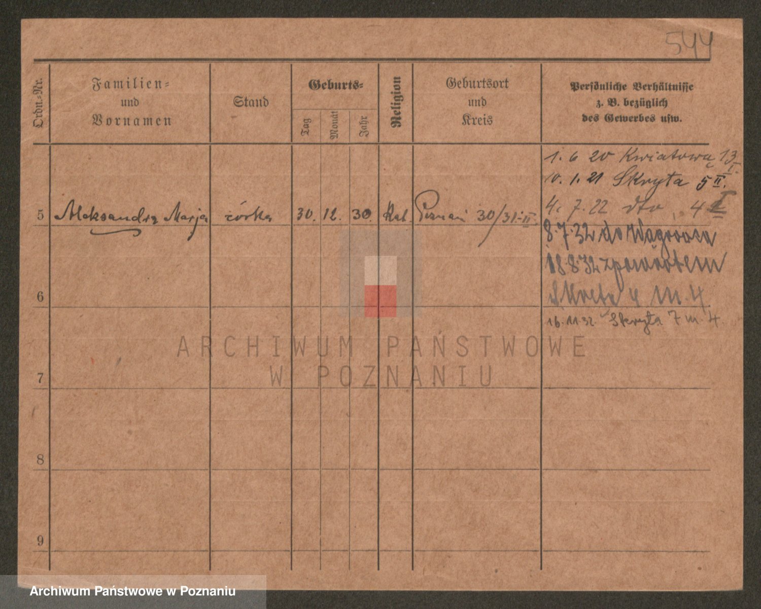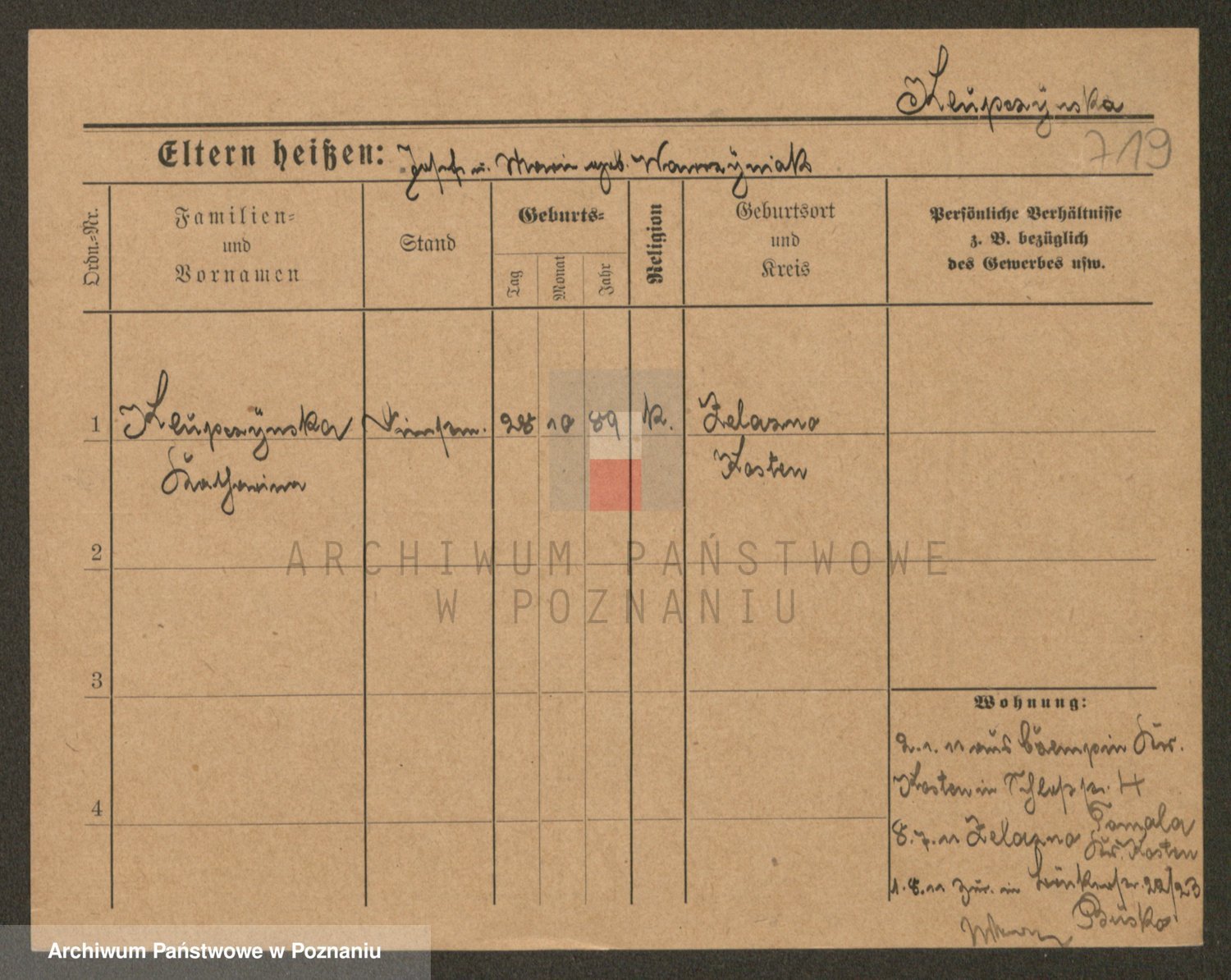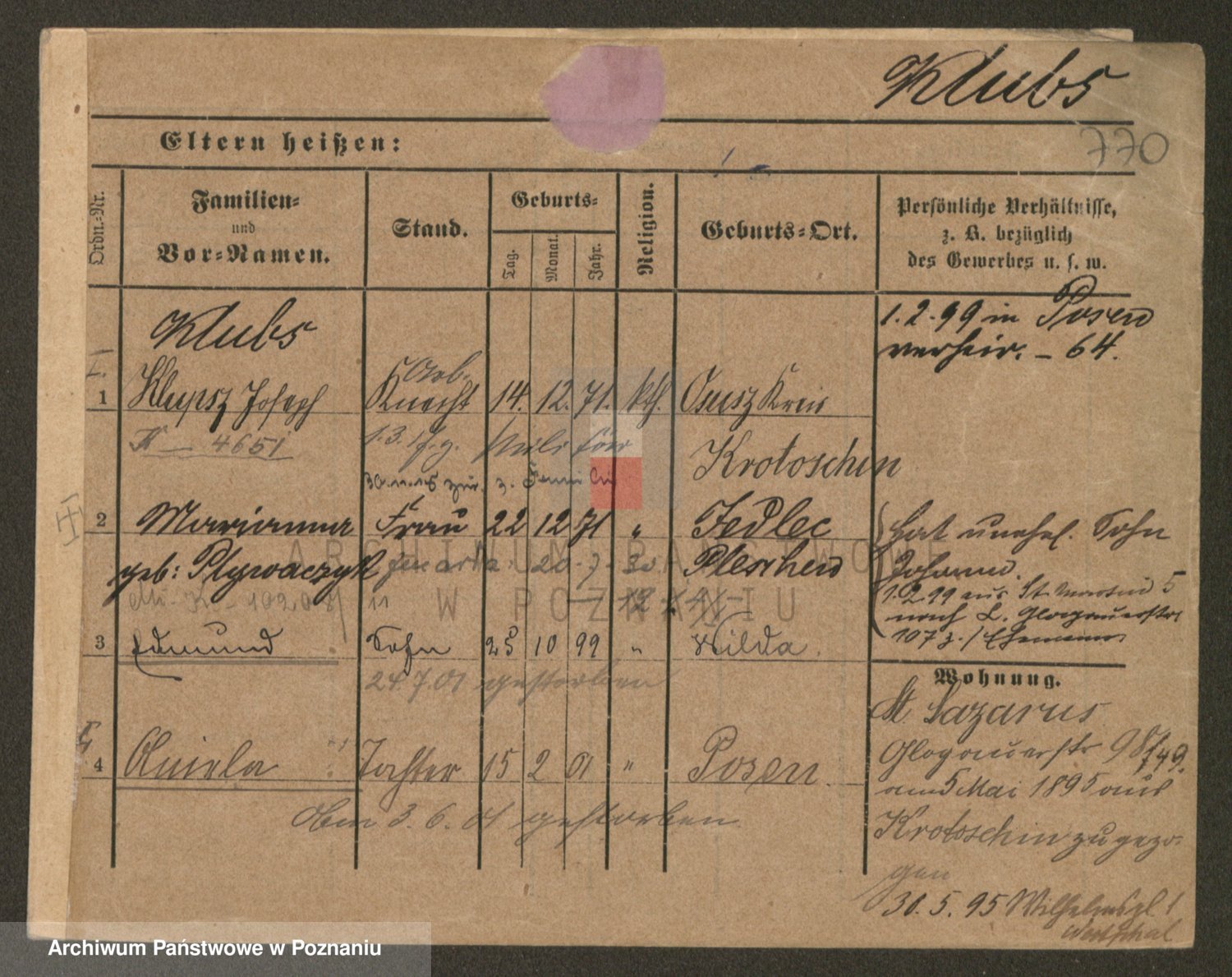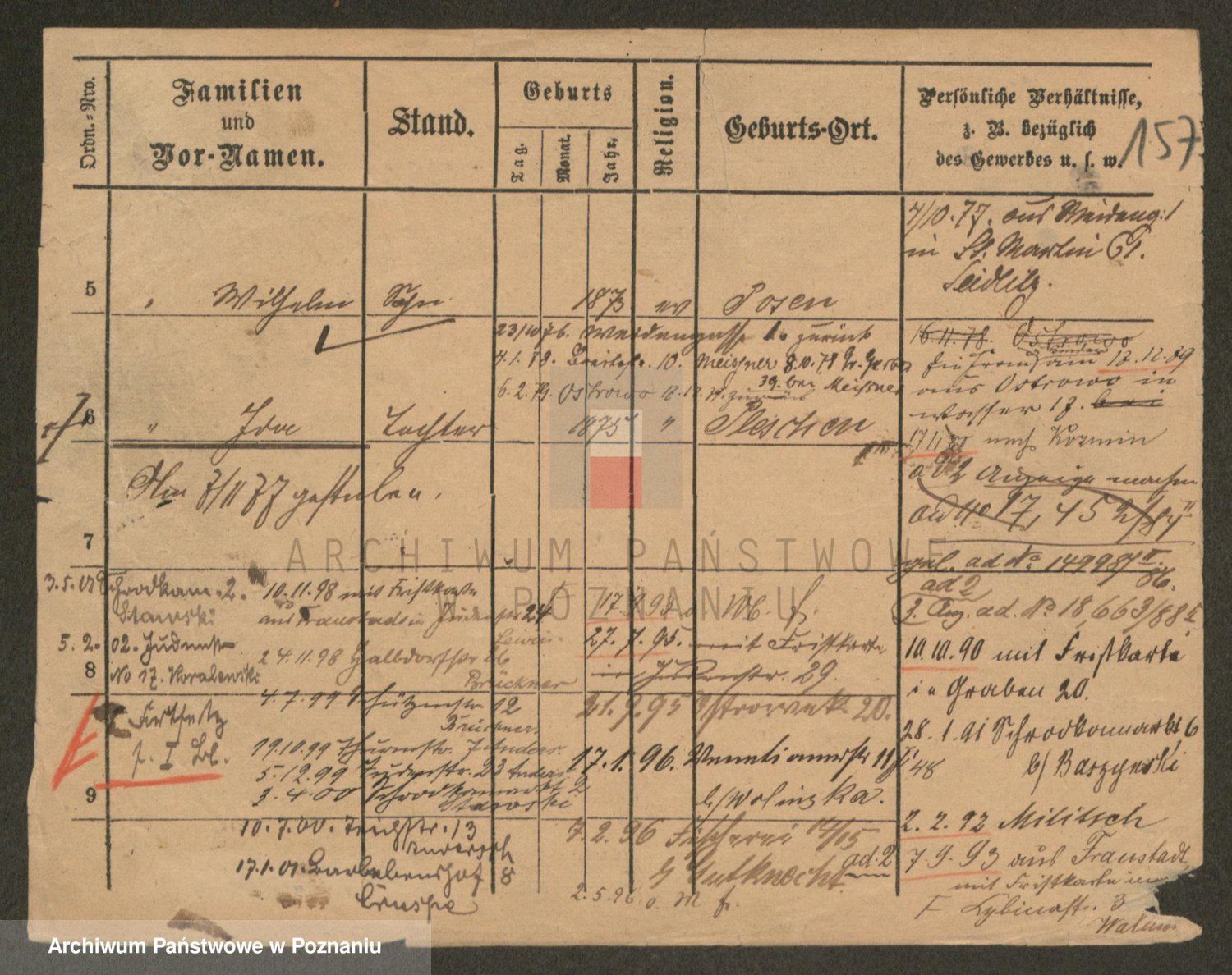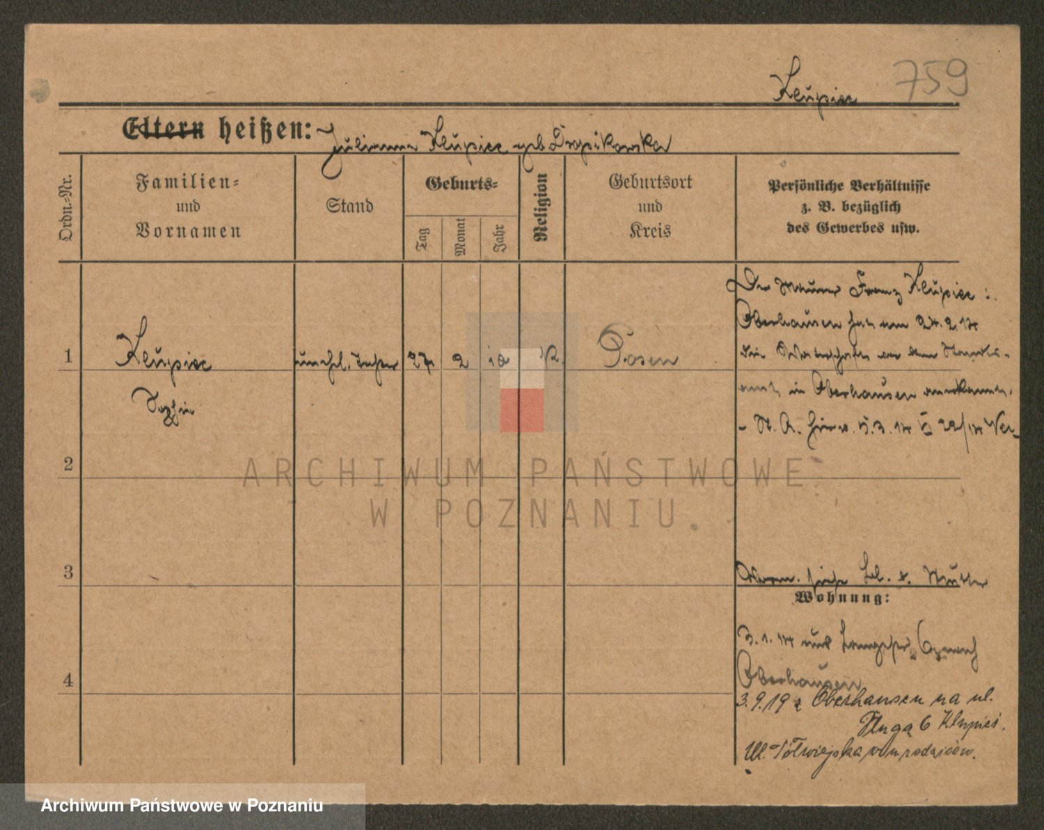 Podgląd karty osobowej dostępny jest po kliknięciu na nazwisko lub ikonkę karty. Można dokonywać powiększenia (ikony na górze) lub przechodzić między kolejnymi skanami (strzałki po bokach).