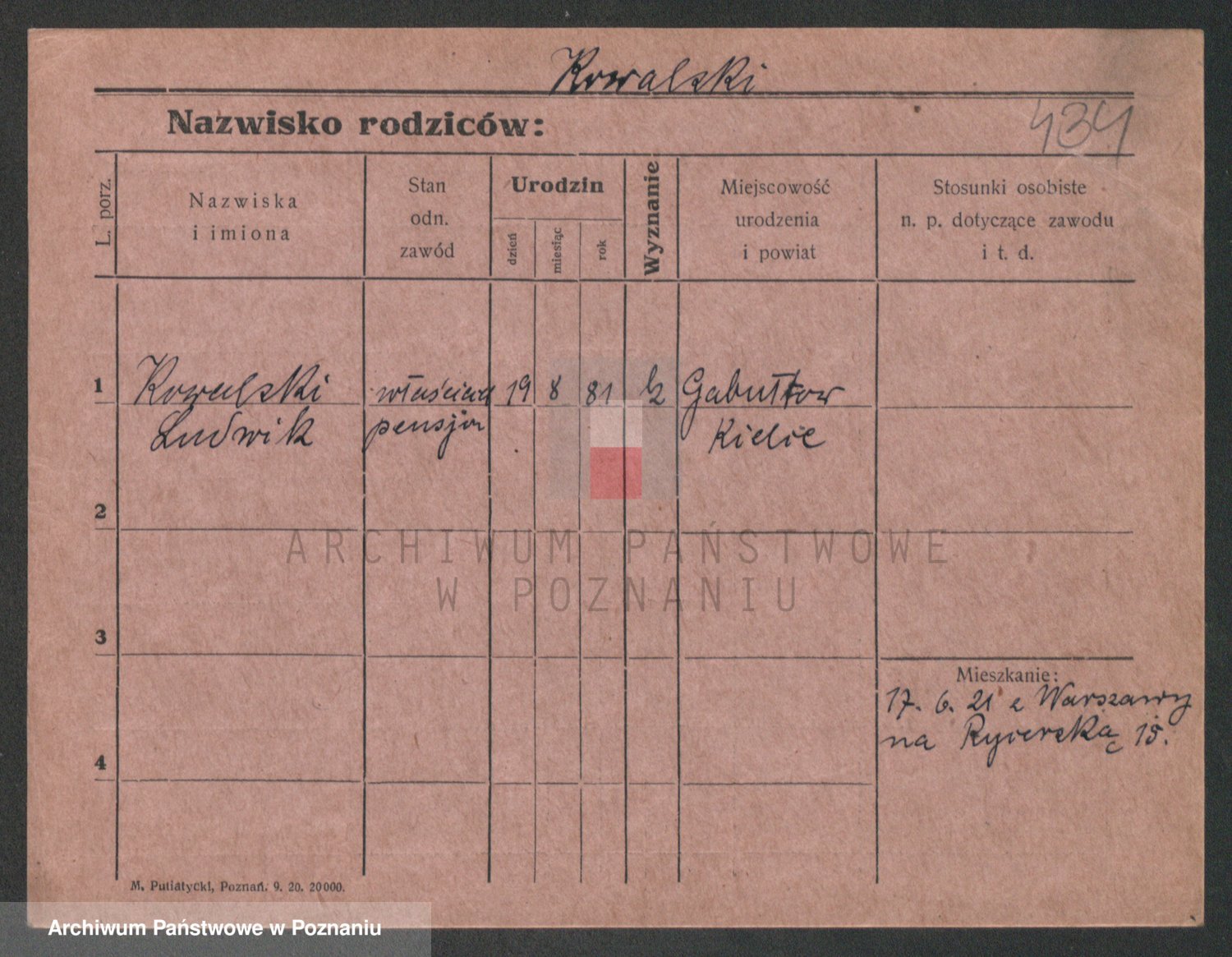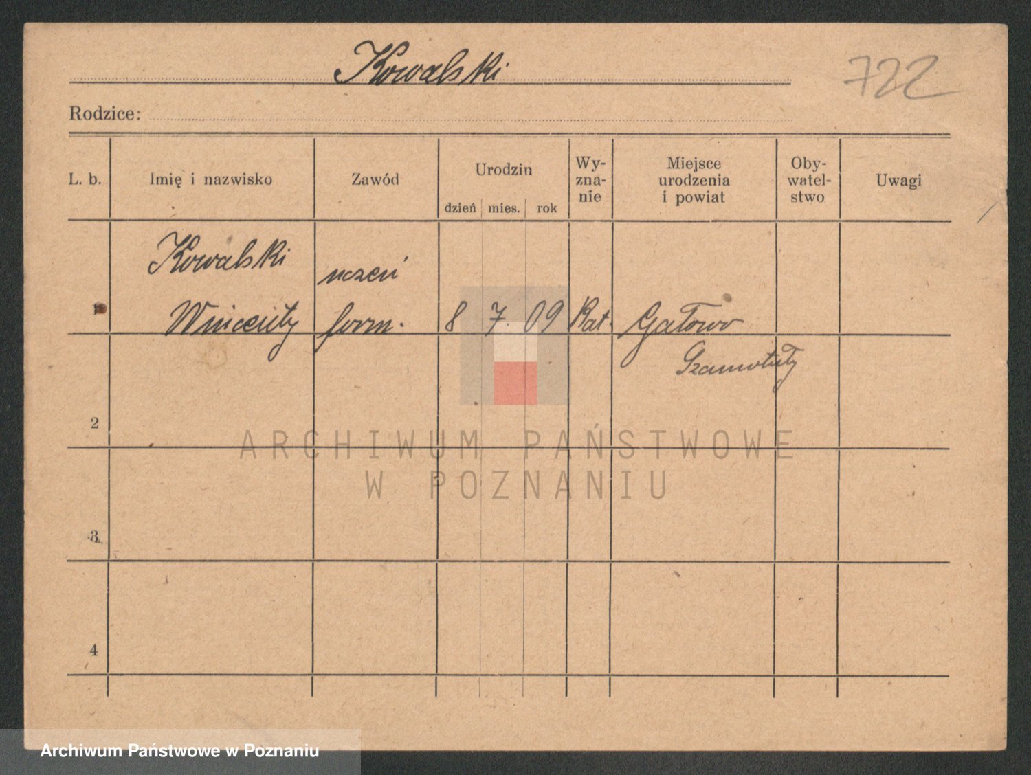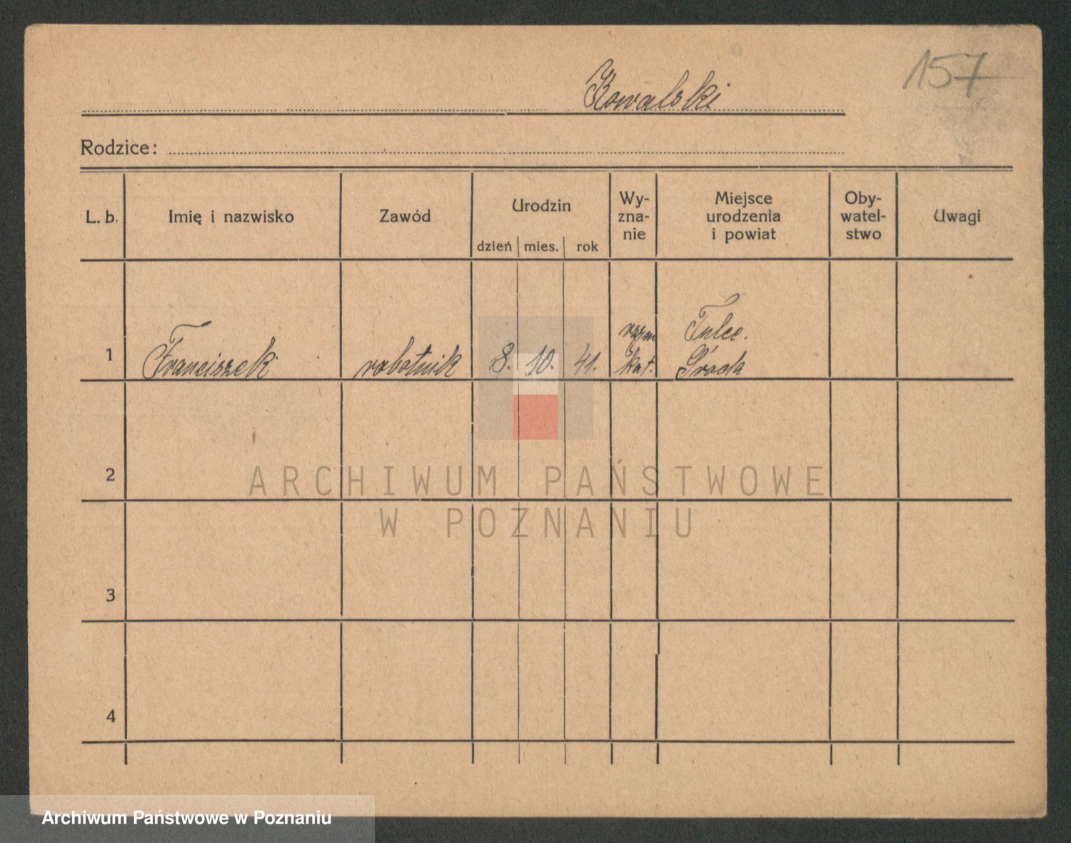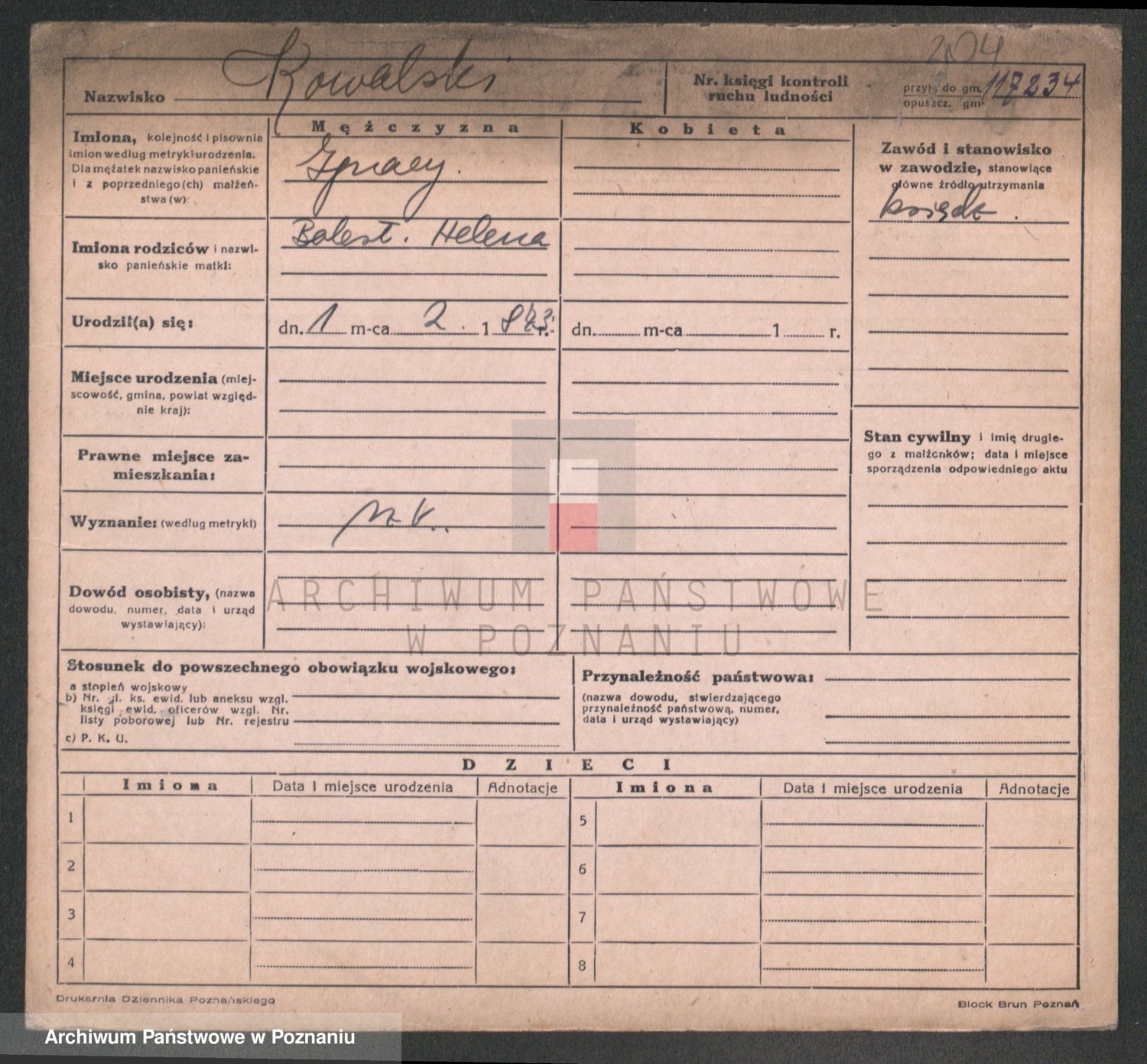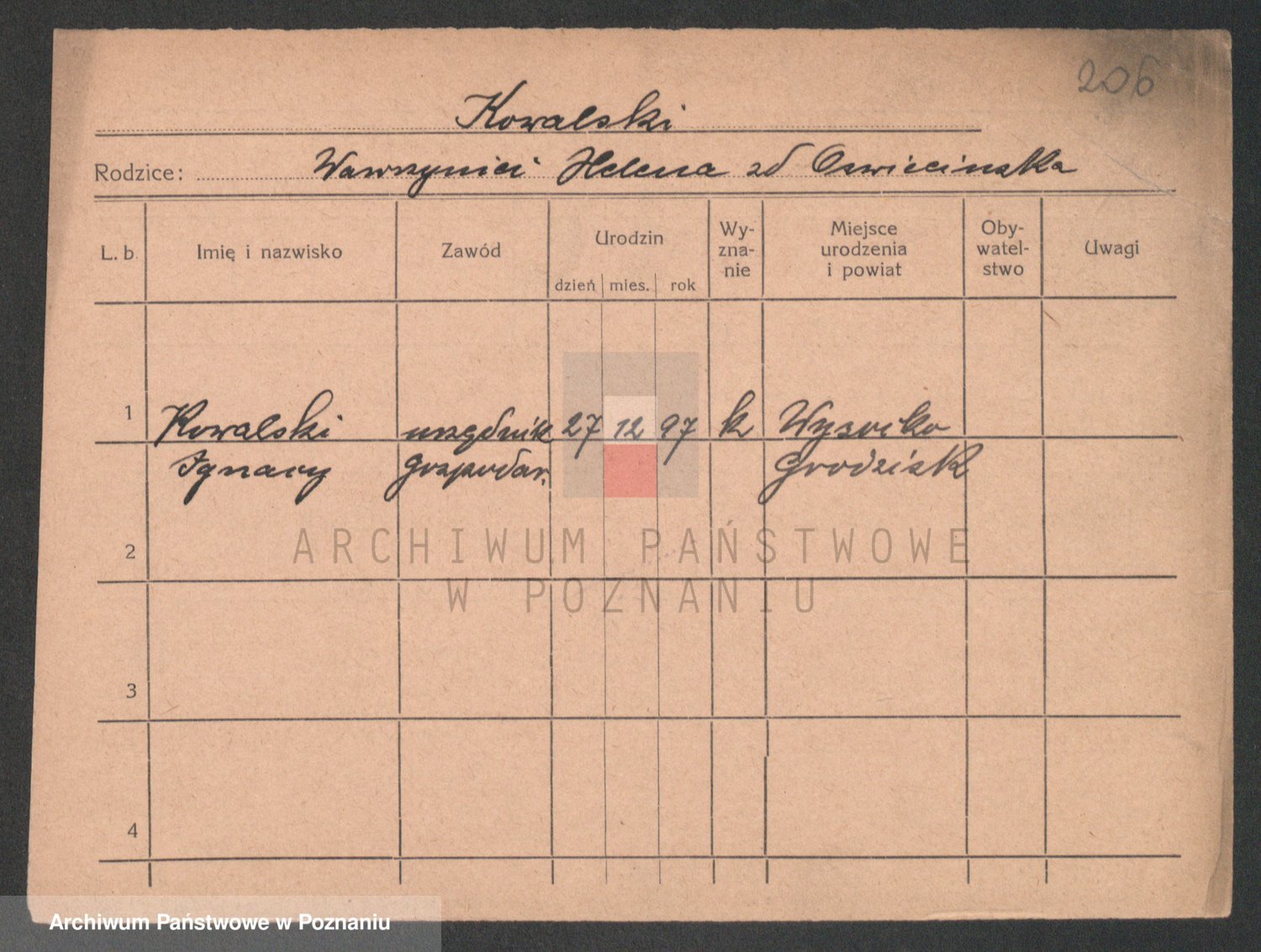 Podgląd karty osobowej dostępny jest po kliknięciu na nazwisko lub ikonkę karty. Można dokonywać powiększenia (ikony na górze) lub przechodzić między kolejnymi skanami (strzałki po bokach).