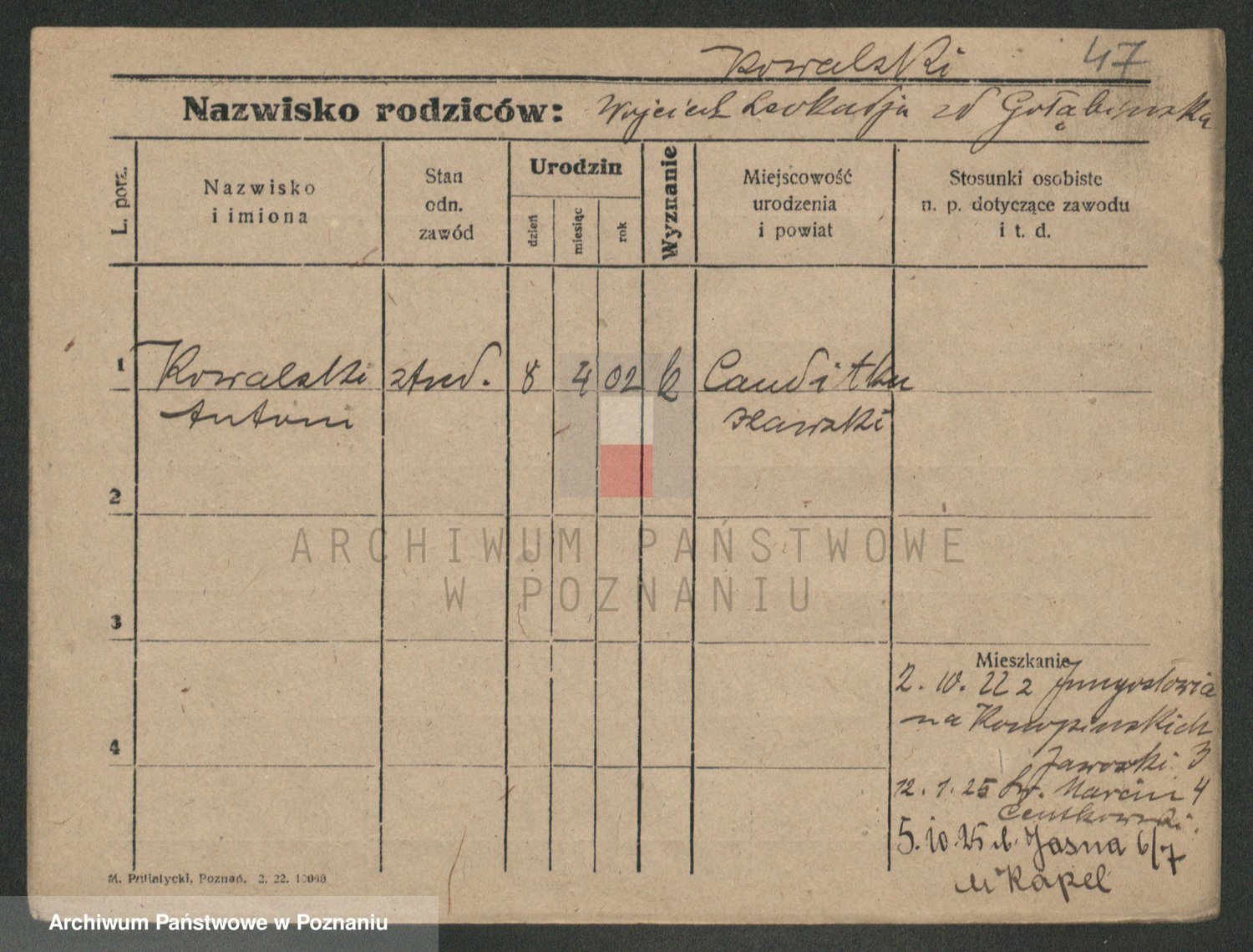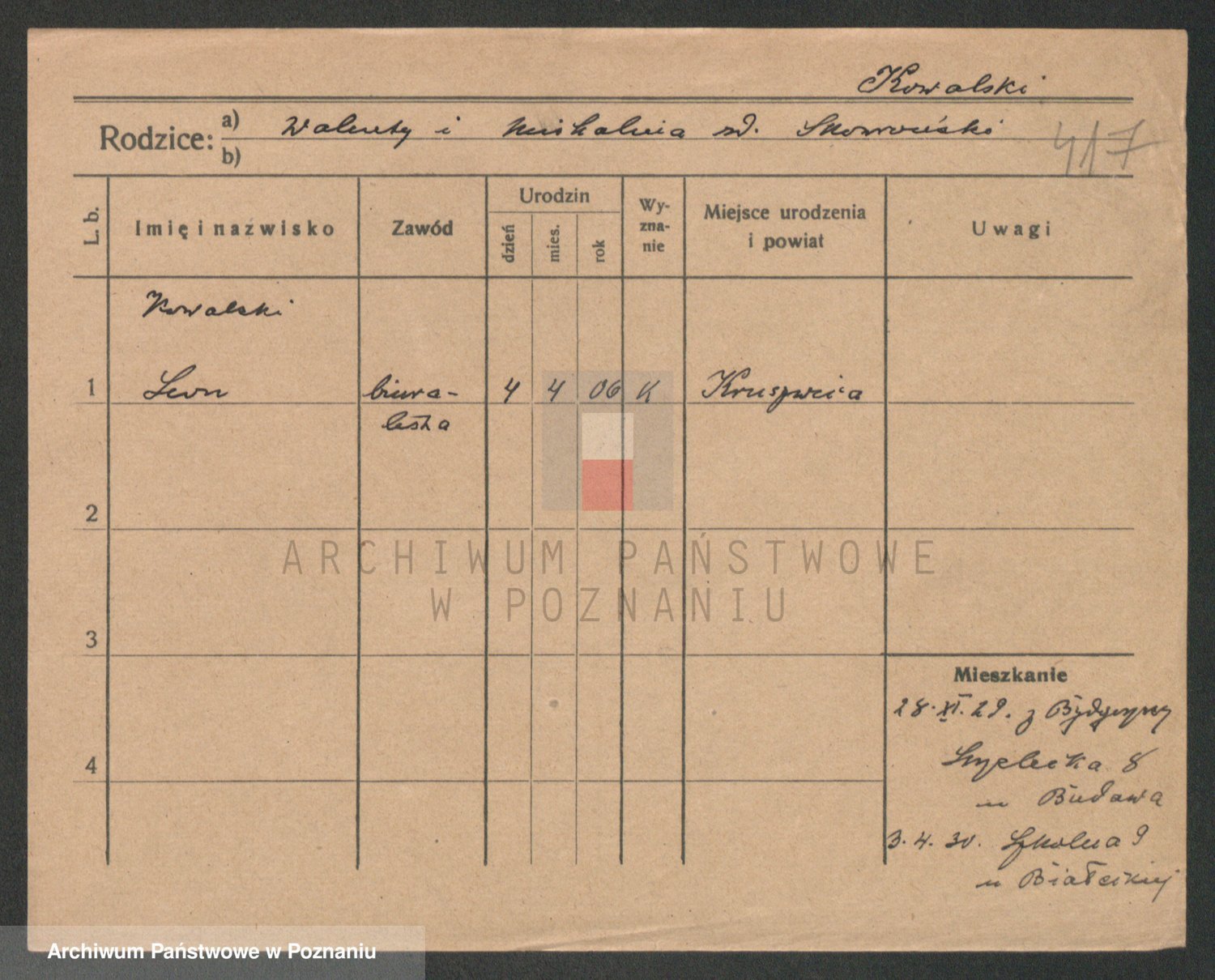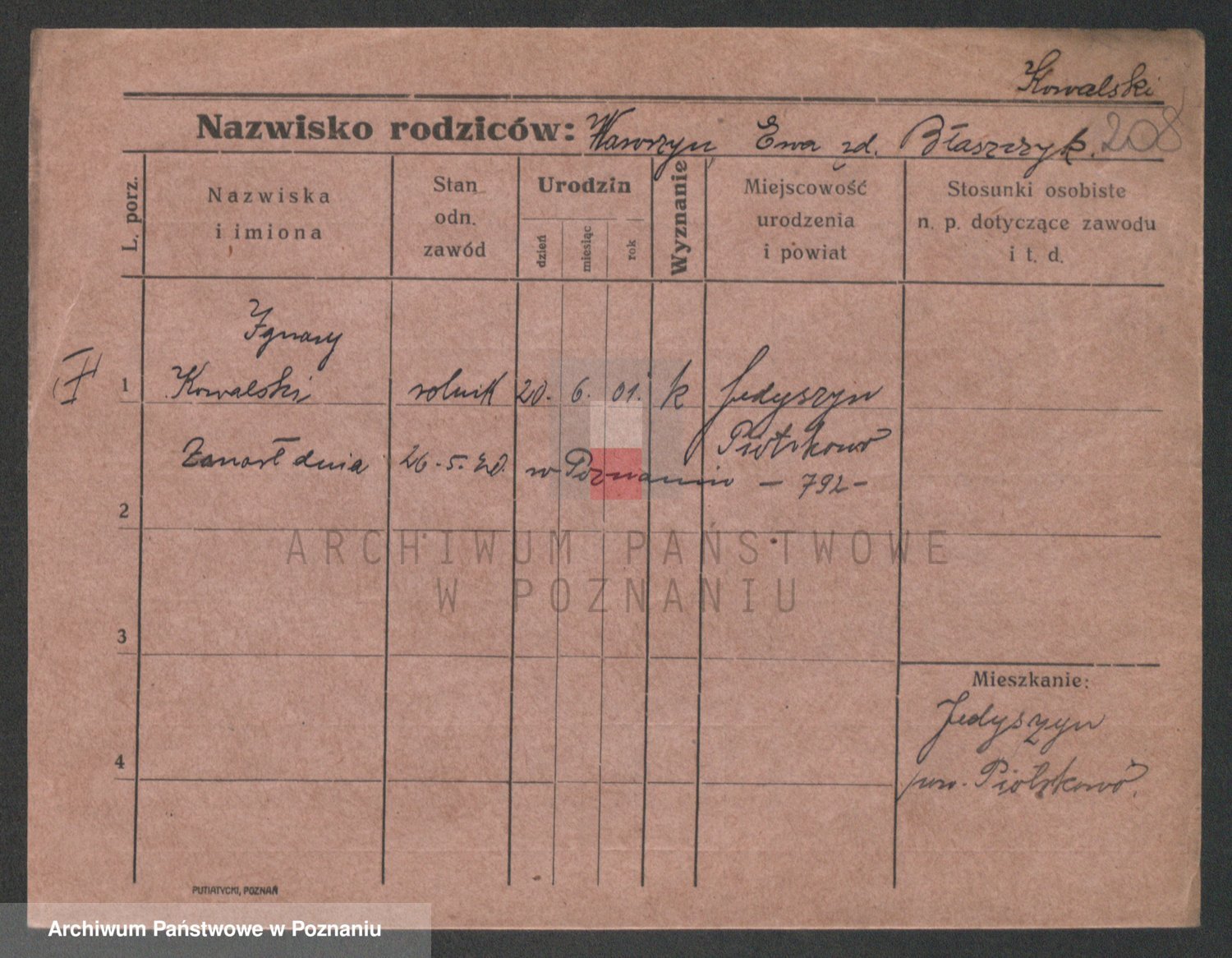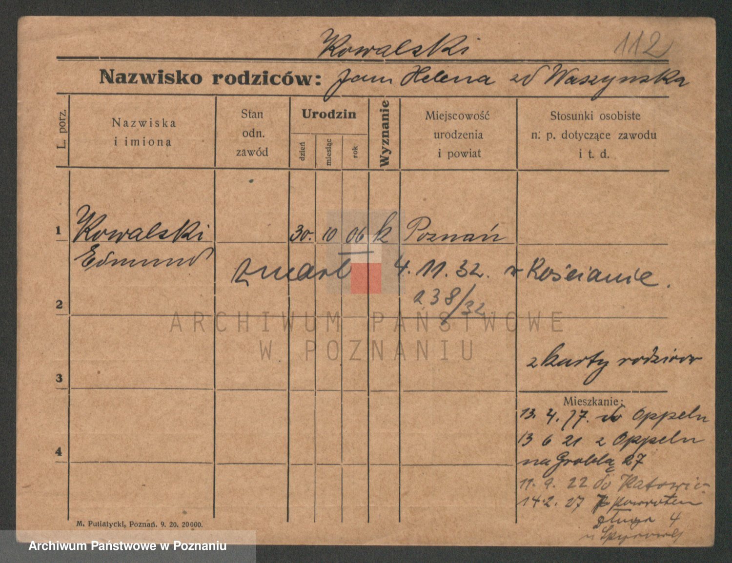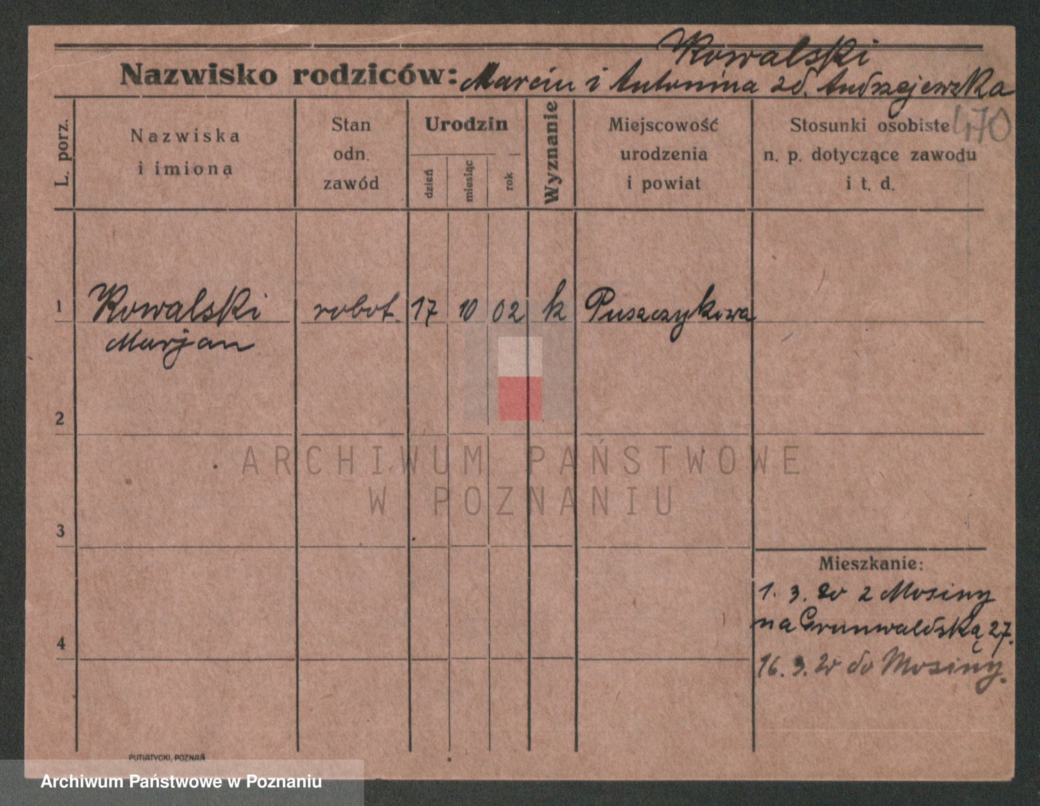 Podgląd karty osobowej dostępny jest po kliknięciu na nazwisko lub ikonkę karty. Można dokonywać powiększenia (ikony na górze) lub przechodzić między kolejnymi skanami (strzałki po bokach).