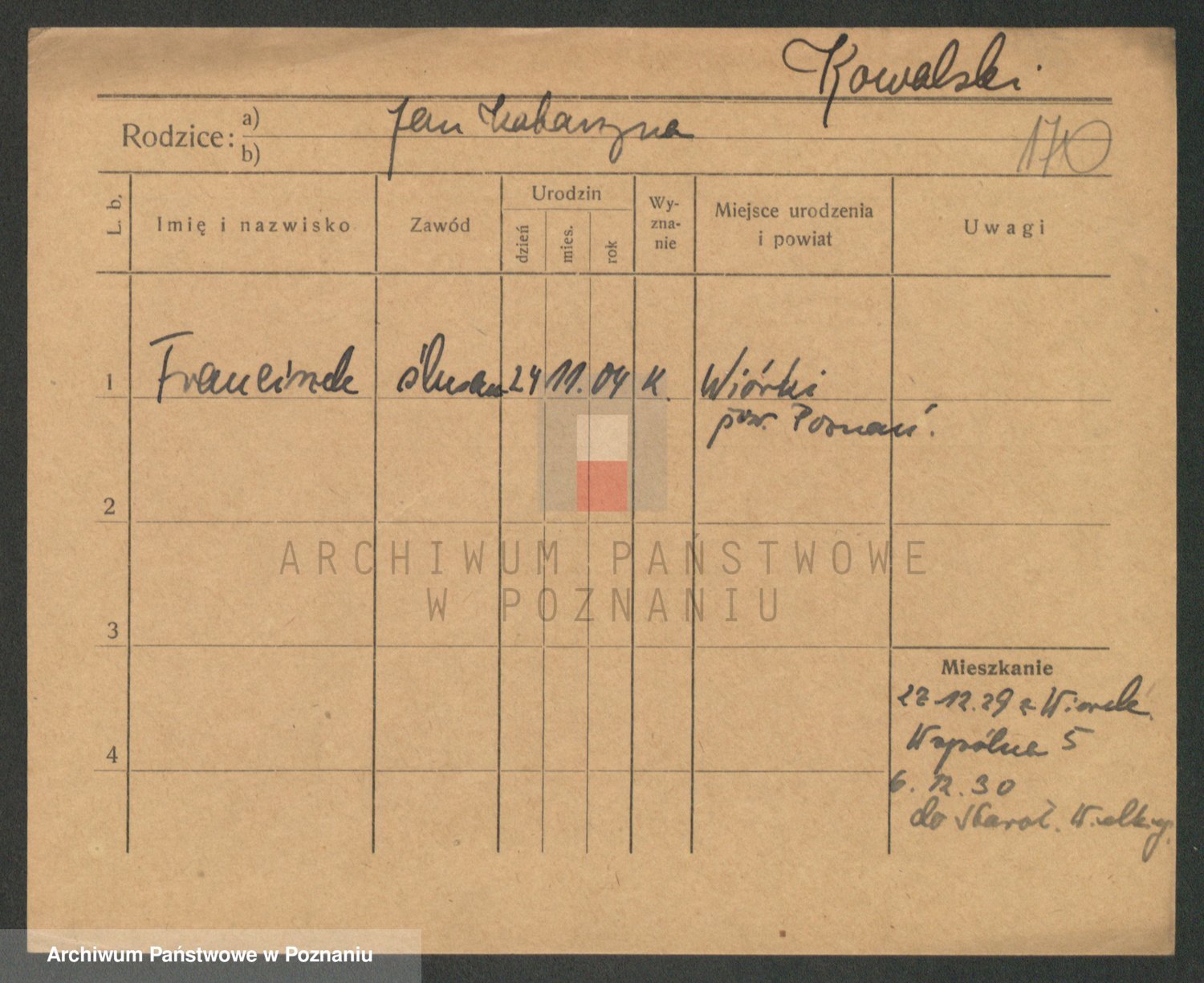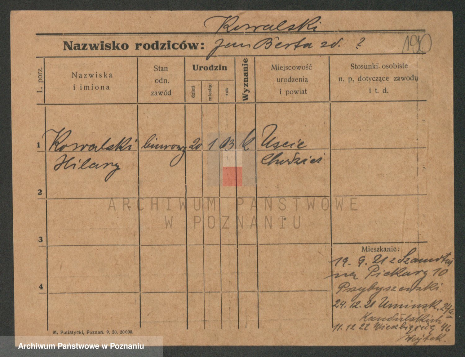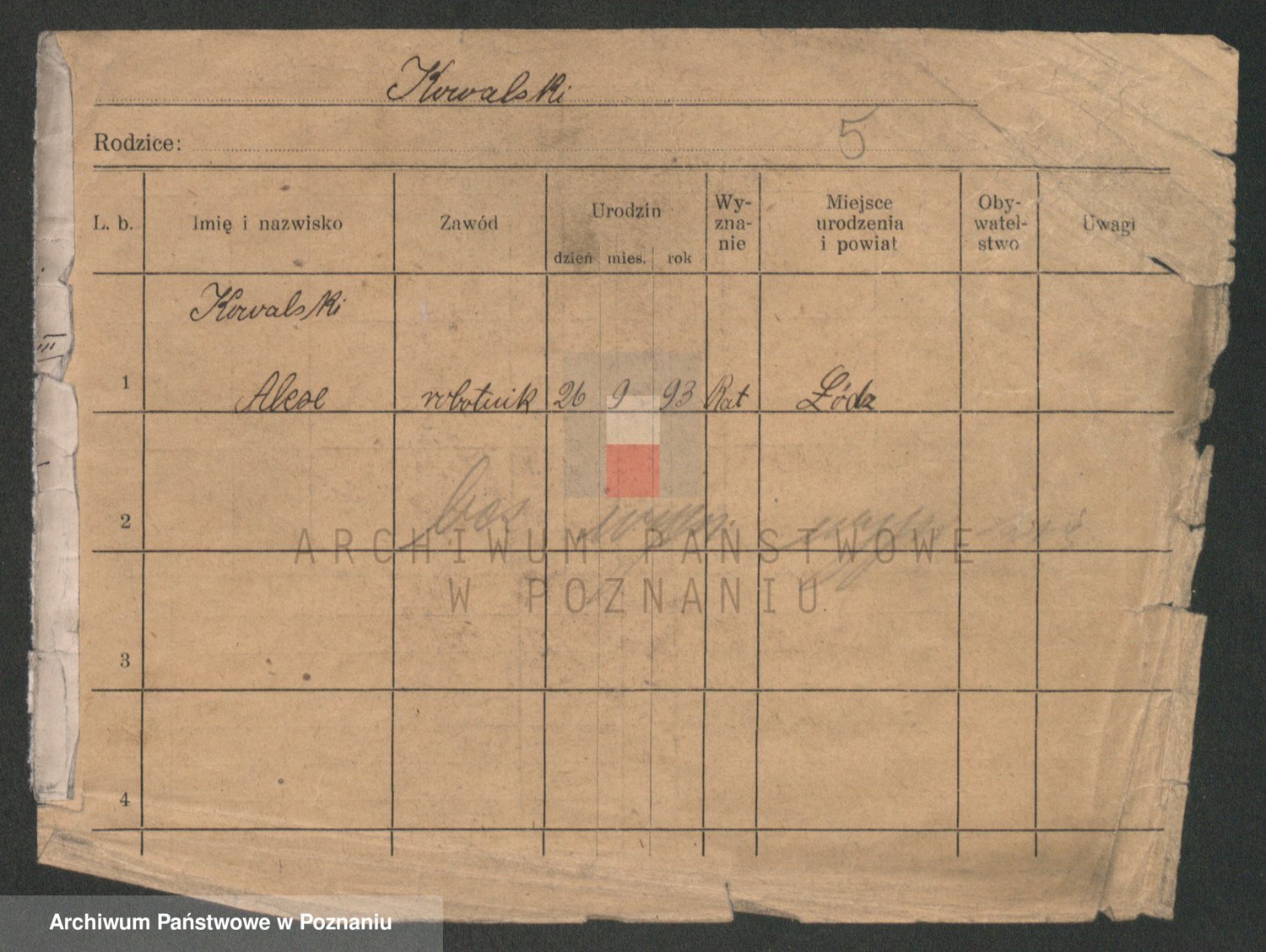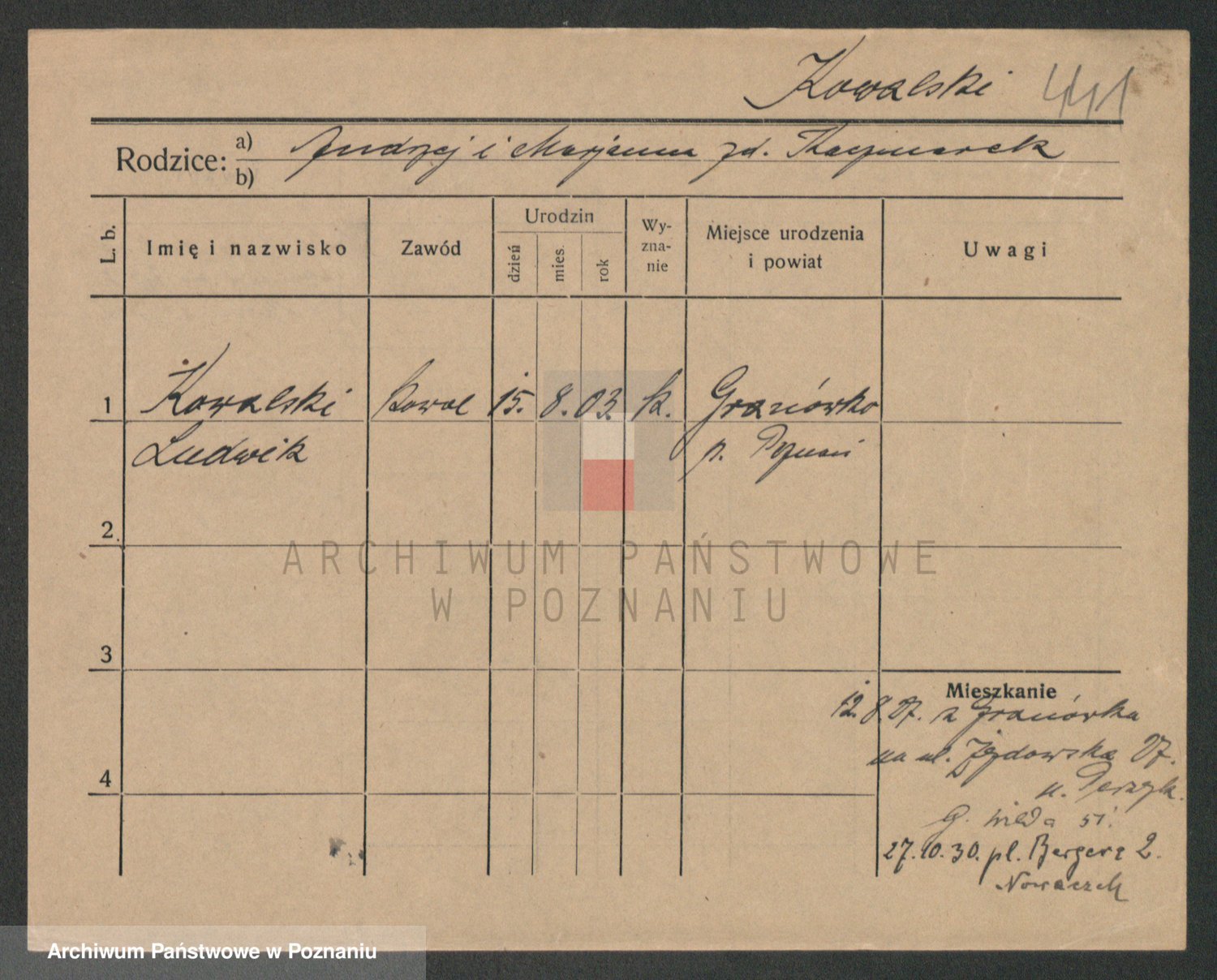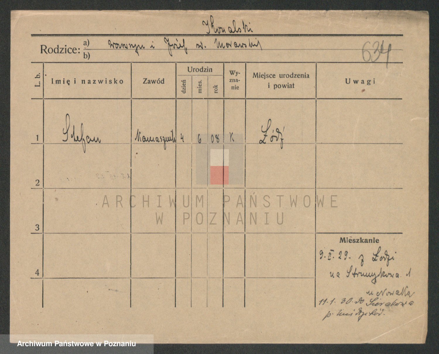 Podgląd karty osobowej dostępny jest po kliknięciu na nazwisko lub ikonkę karty. Można dokonywać powiększenia (ikony na górze) lub przechodzić między kolejnymi skanami (strzałki po bokach).