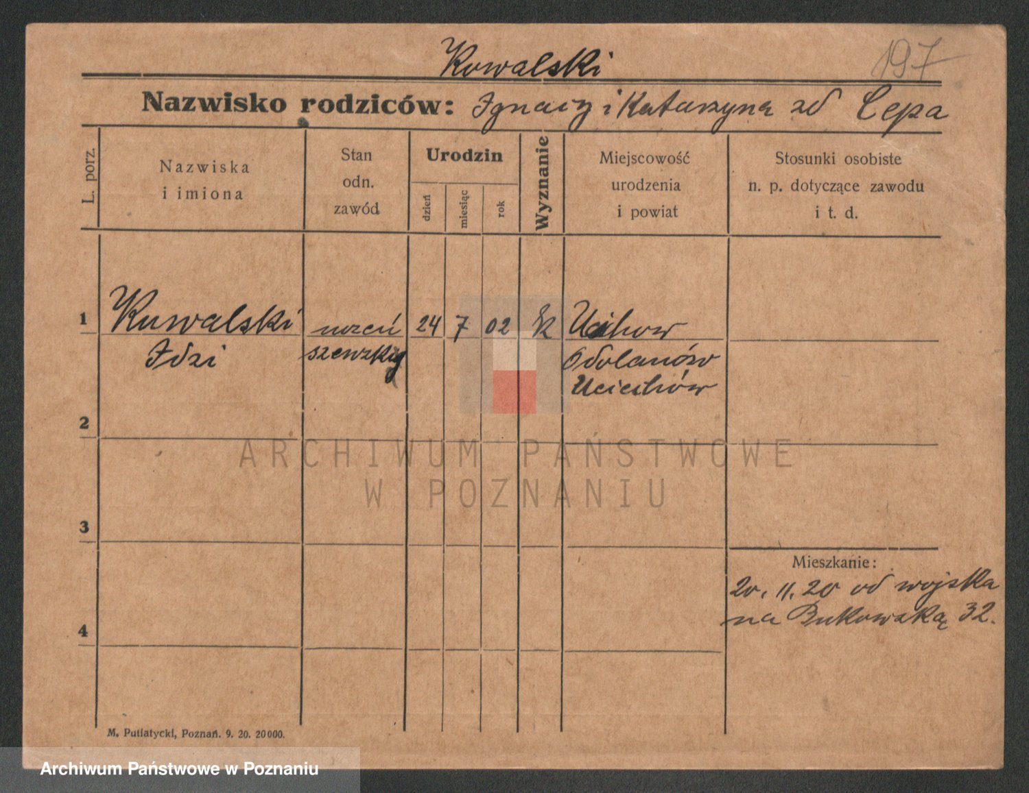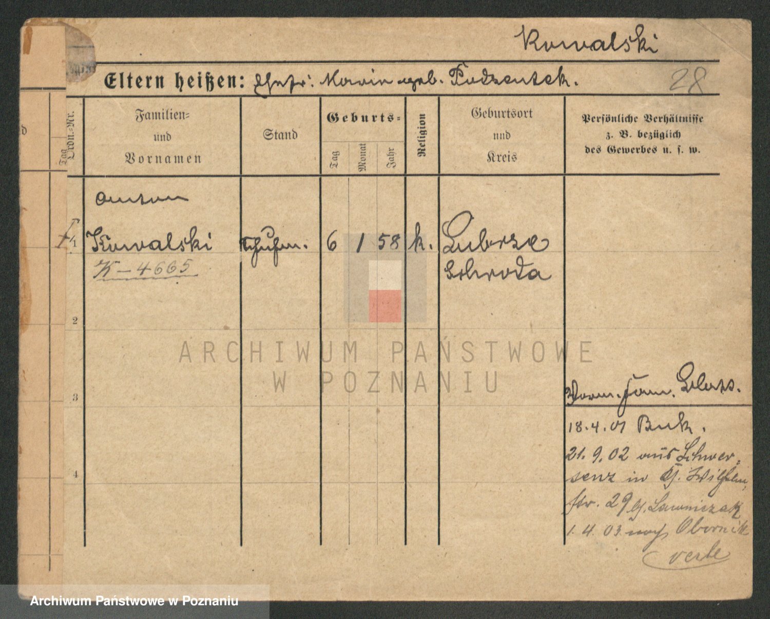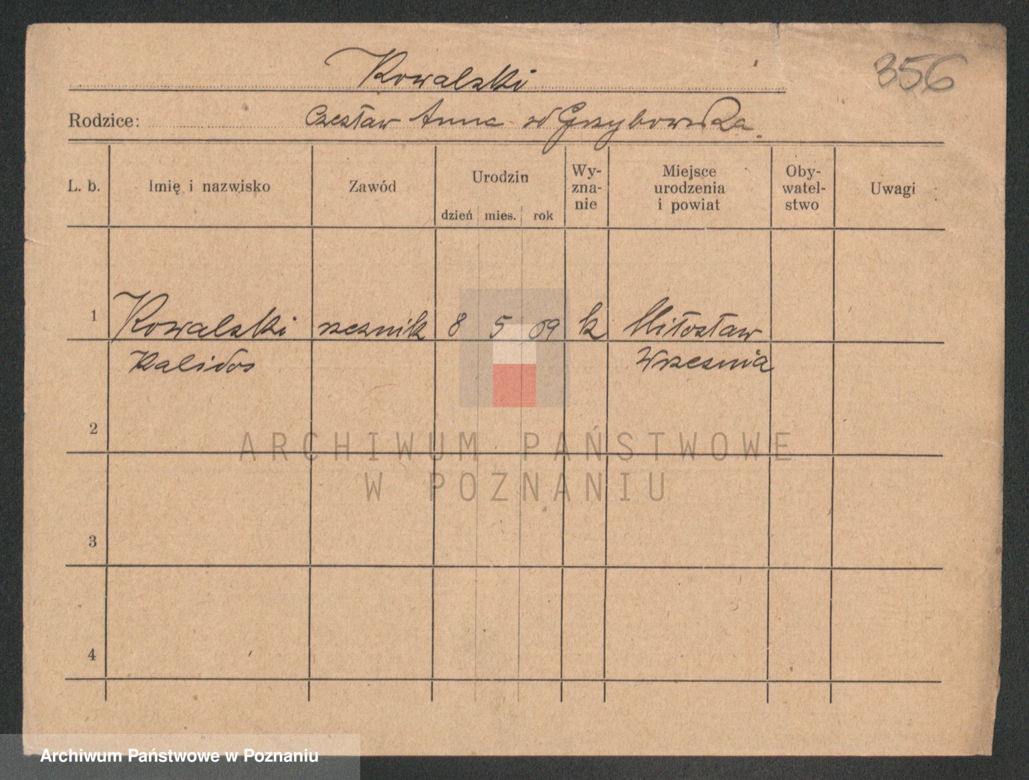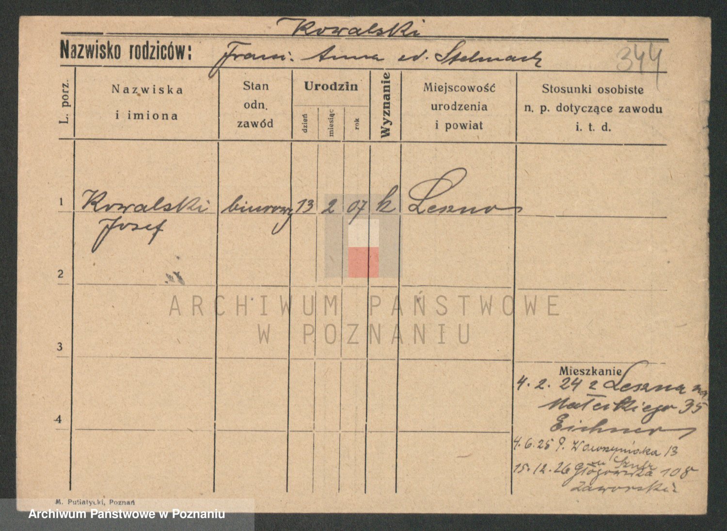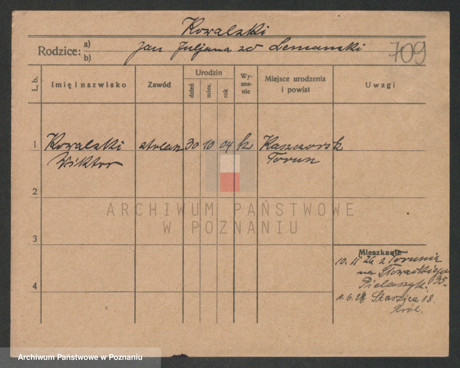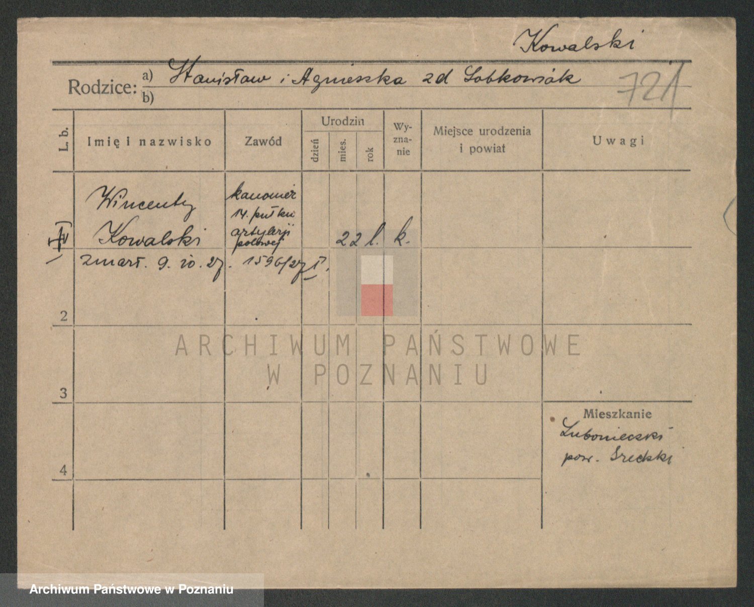 Podgląd karty osobowej dostępny jest po kliknięciu na nazwisko lub ikonkę karty. Można dokonywać powiększenia (ikony na górze) lub przechodzić między kolejnymi skanami (strzałki po bokach).