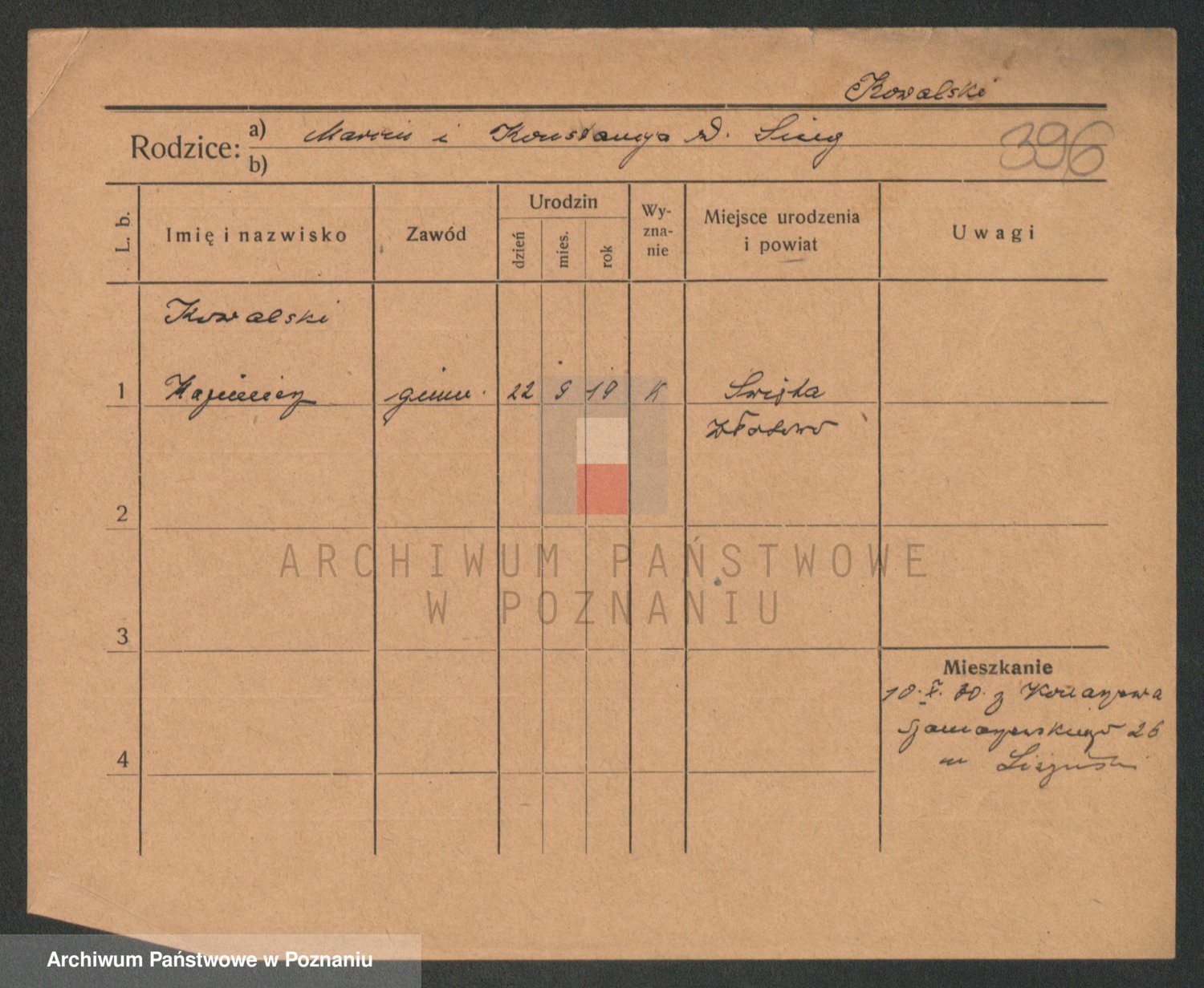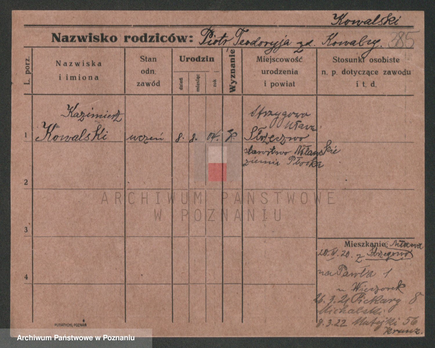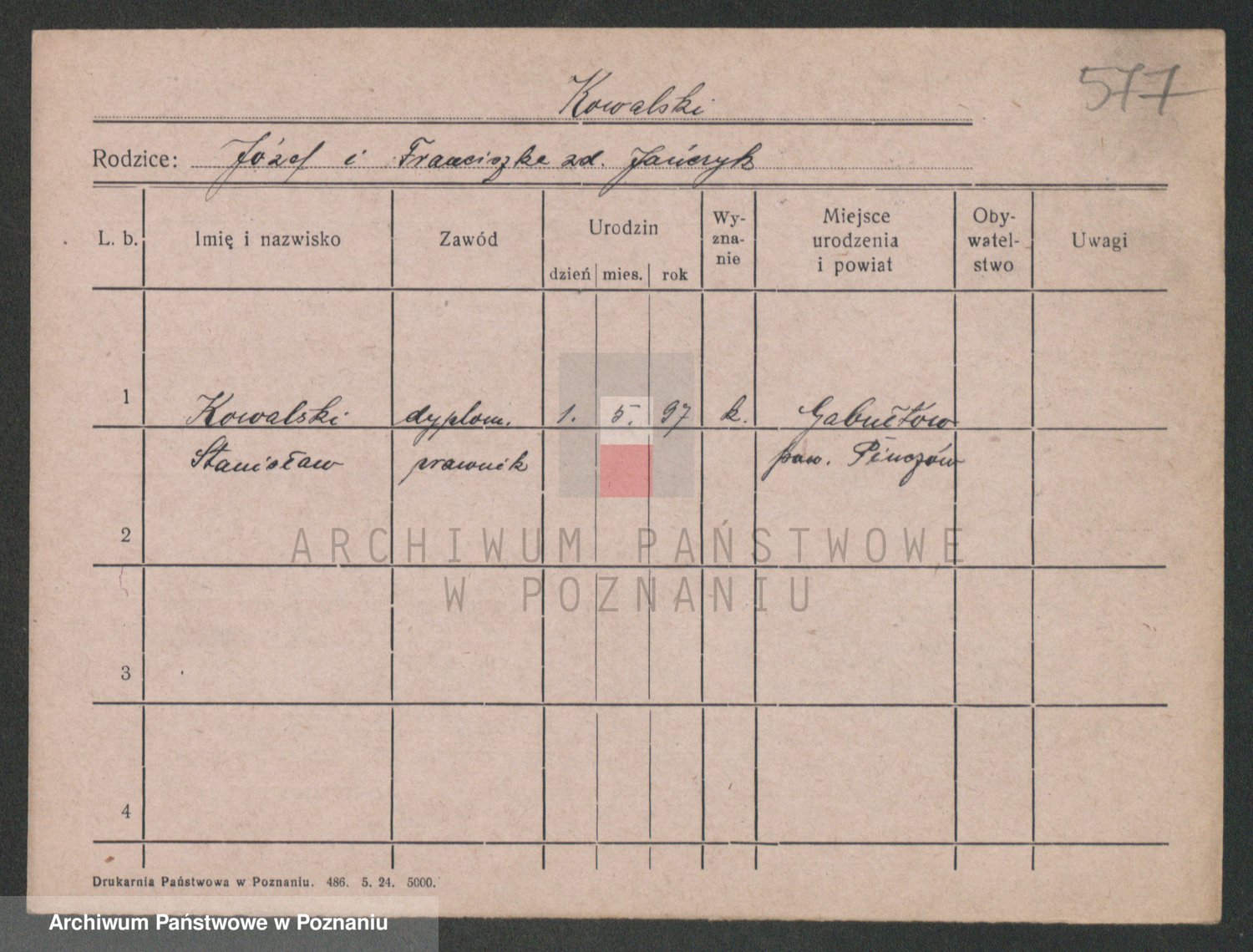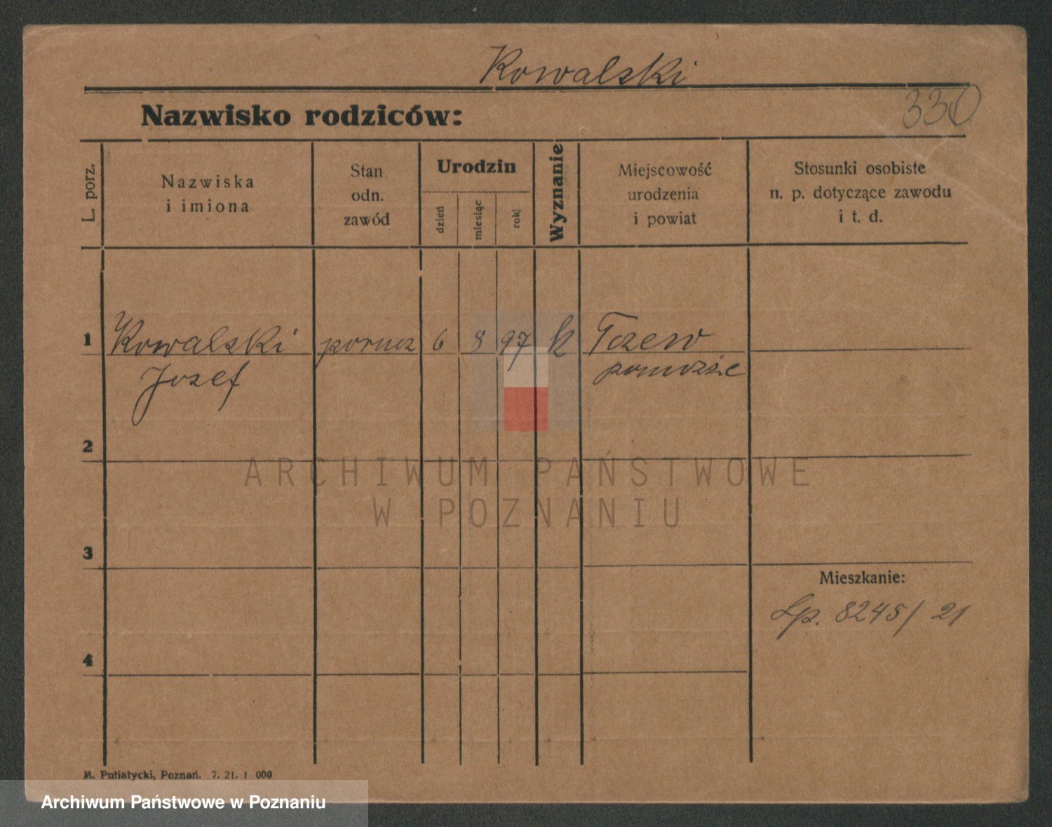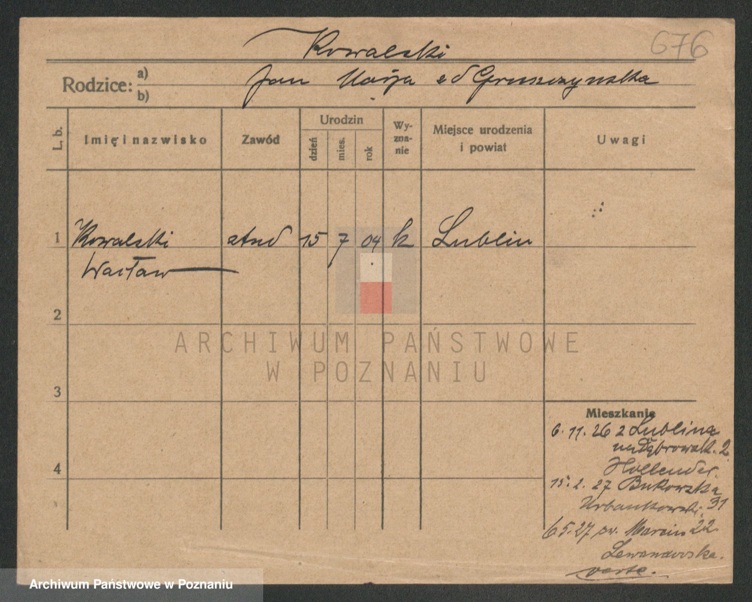 Podgląd karty osobowej dostępny jest po kliknięciu na nazwisko lub ikonkę karty. Można dokonywać powiększenia (ikony na górze) lub przechodzić między kolejnymi skanami (strzałki po bokach).