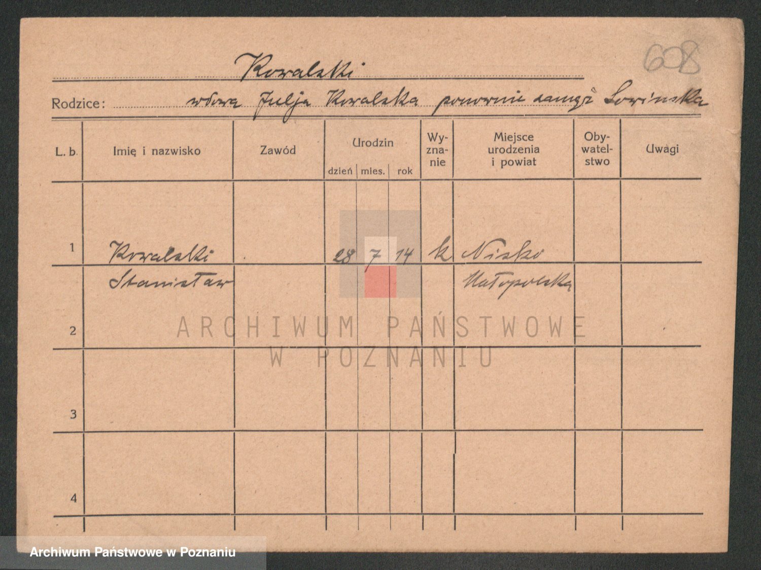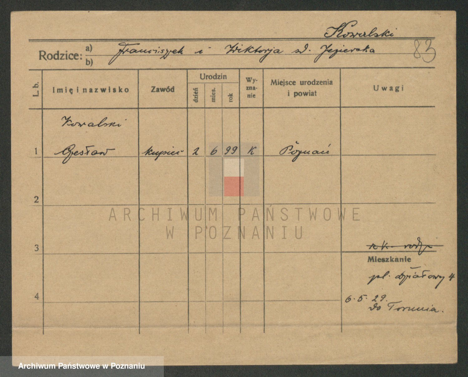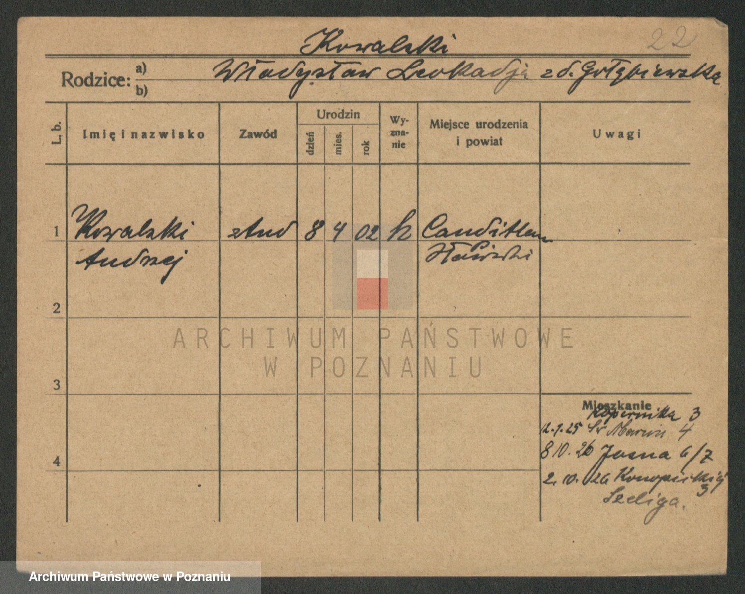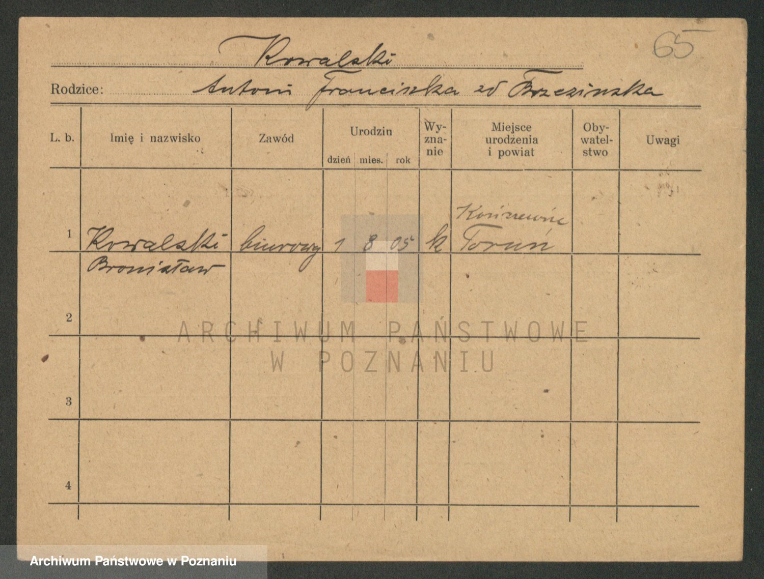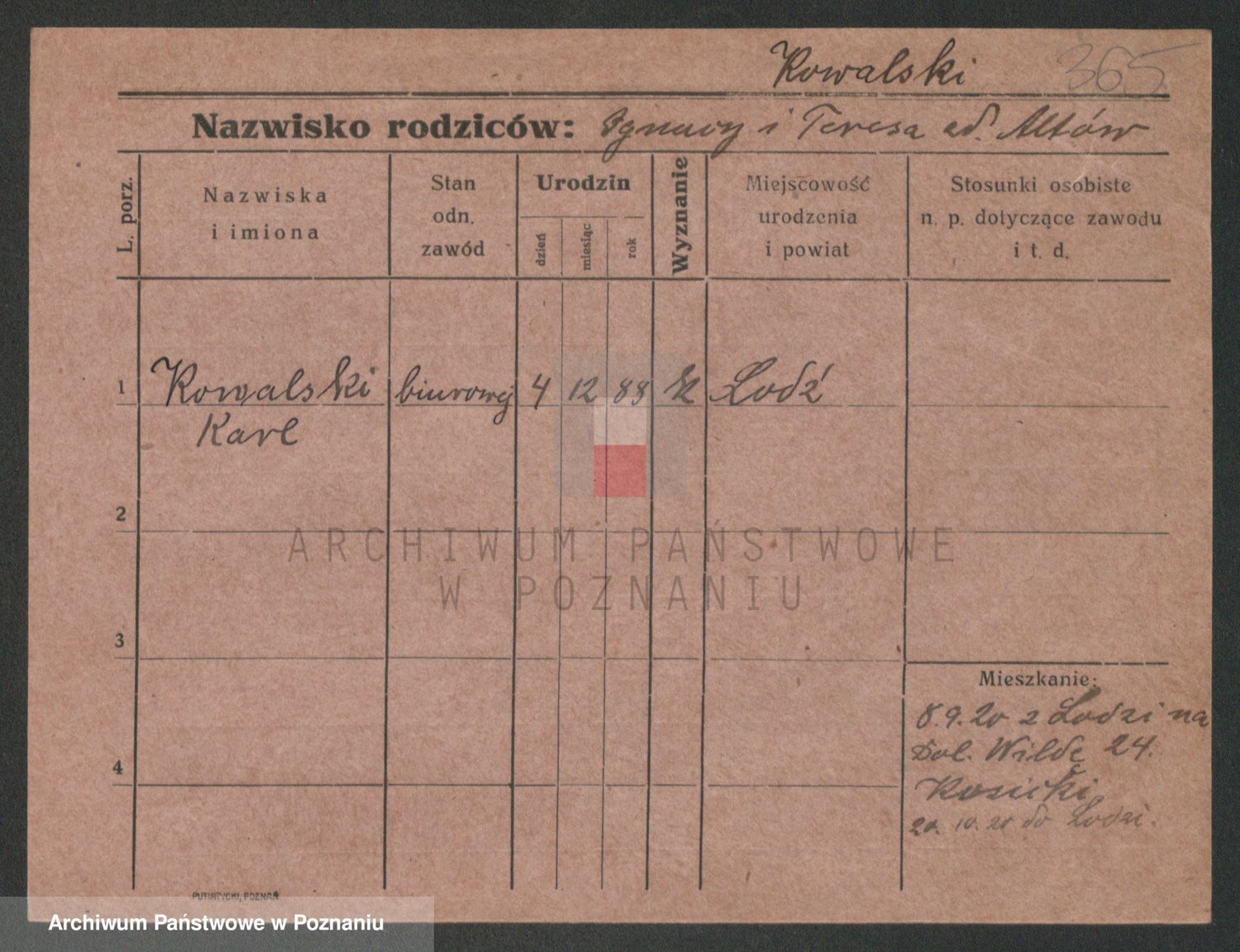 Podgląd karty osobowej dostępny jest po kliknięciu na nazwisko lub ikonkę karty. Można dokonywać powiększenia (ikony na górze) lub przechodzić między kolejnymi skanami (strzałki po bokach).