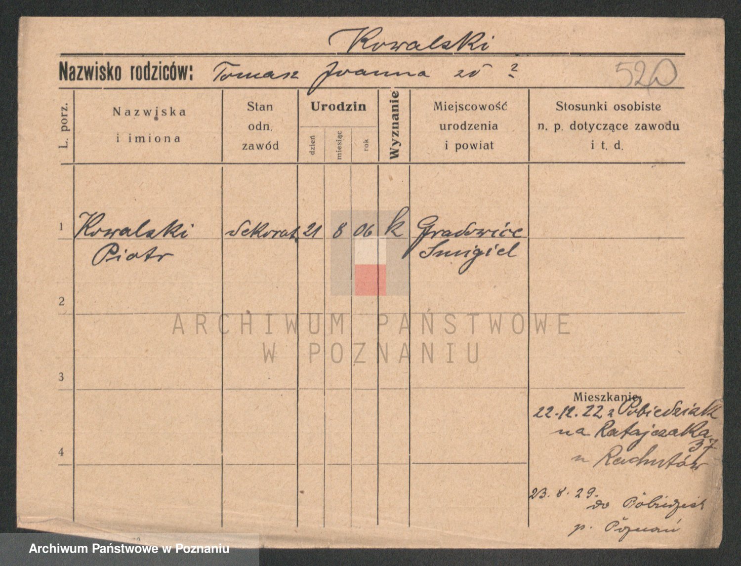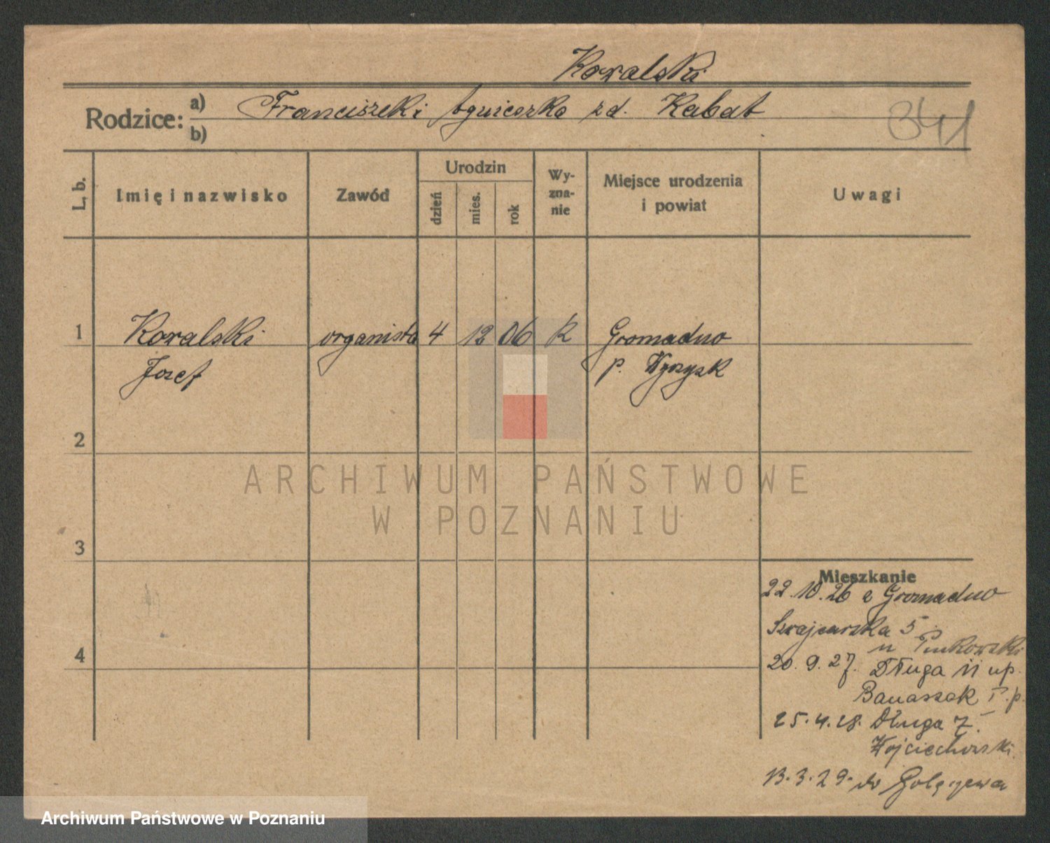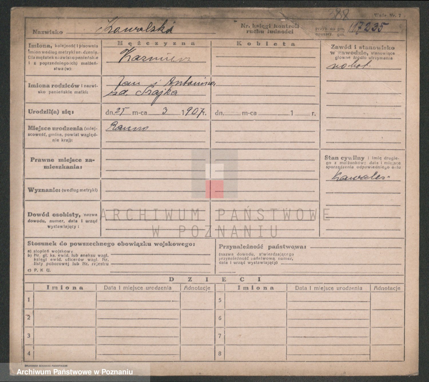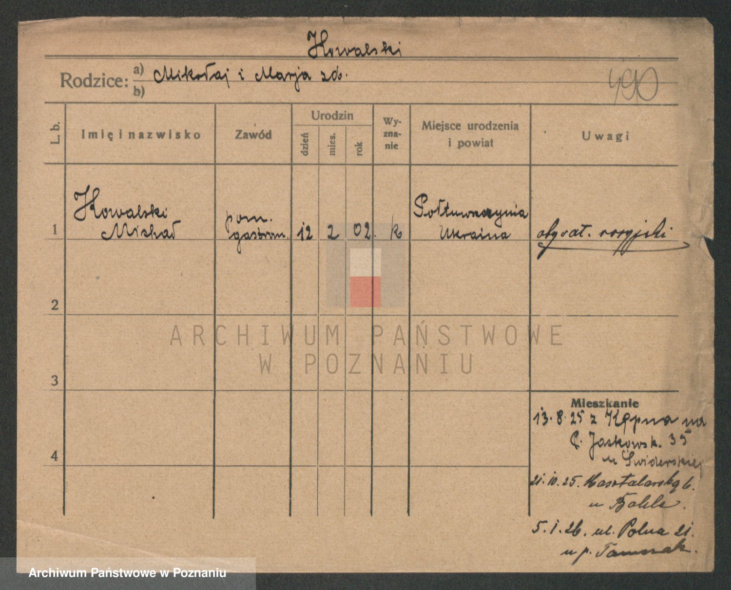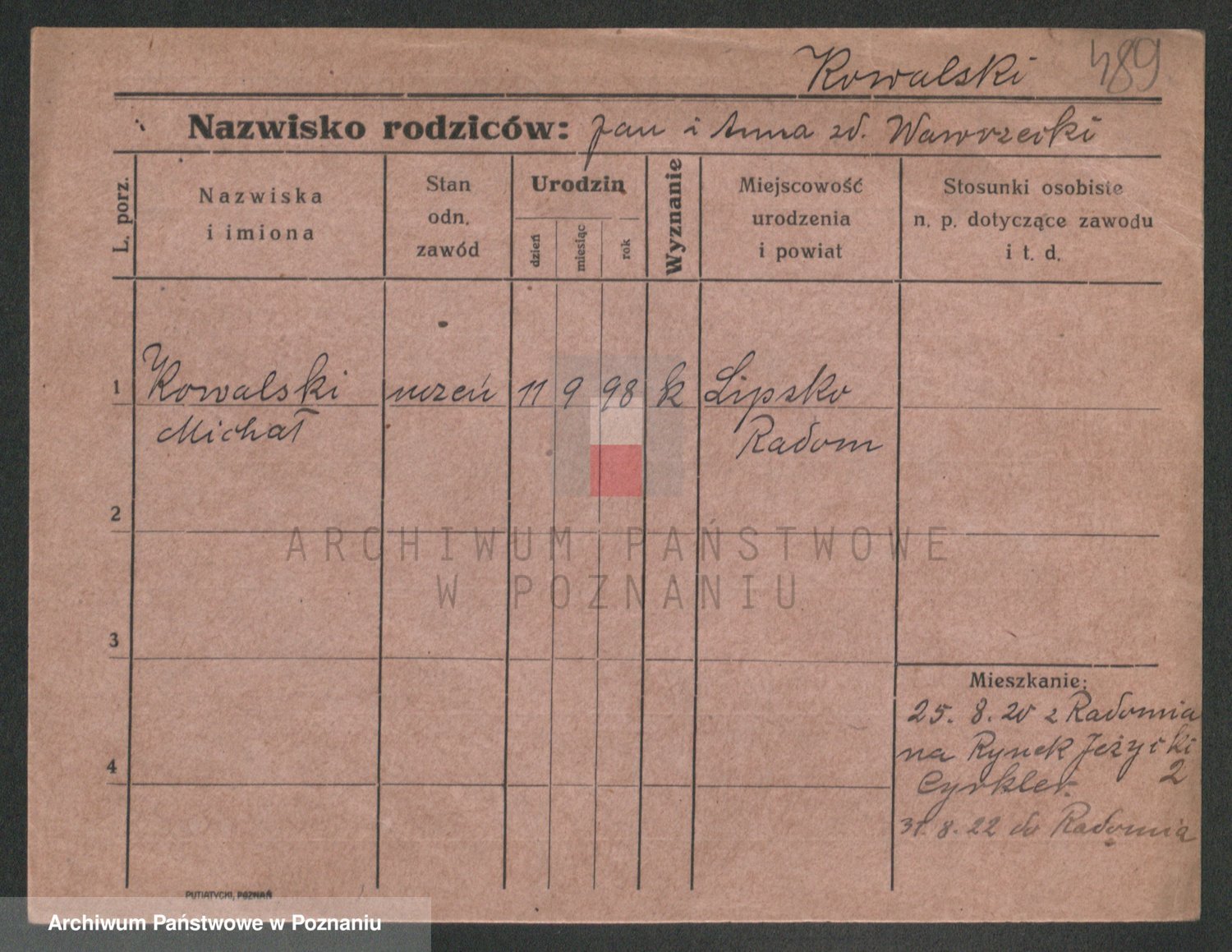 Podgląd karty osobowej dostępny jest po kliknięciu na nazwisko lub ikonkę karty. Można dokonywać powiększenia (ikony na górze) lub przechodzić między kolejnymi skanami (strzałki po bokach).