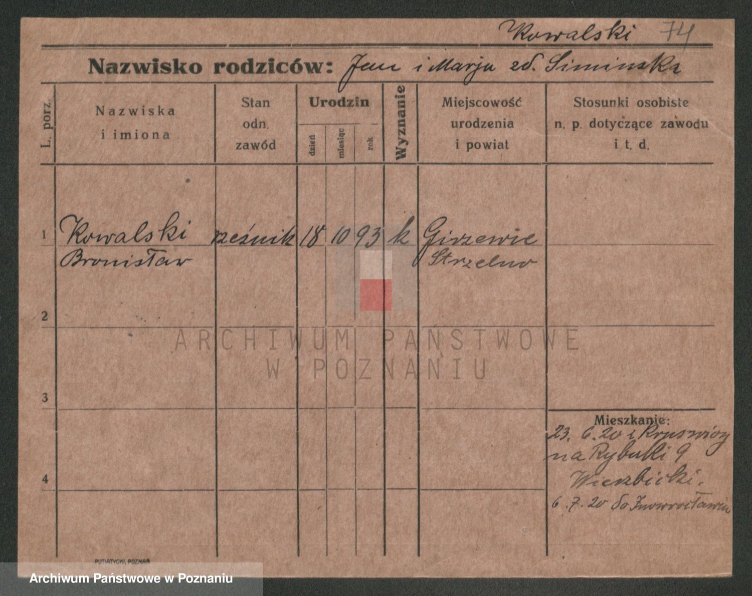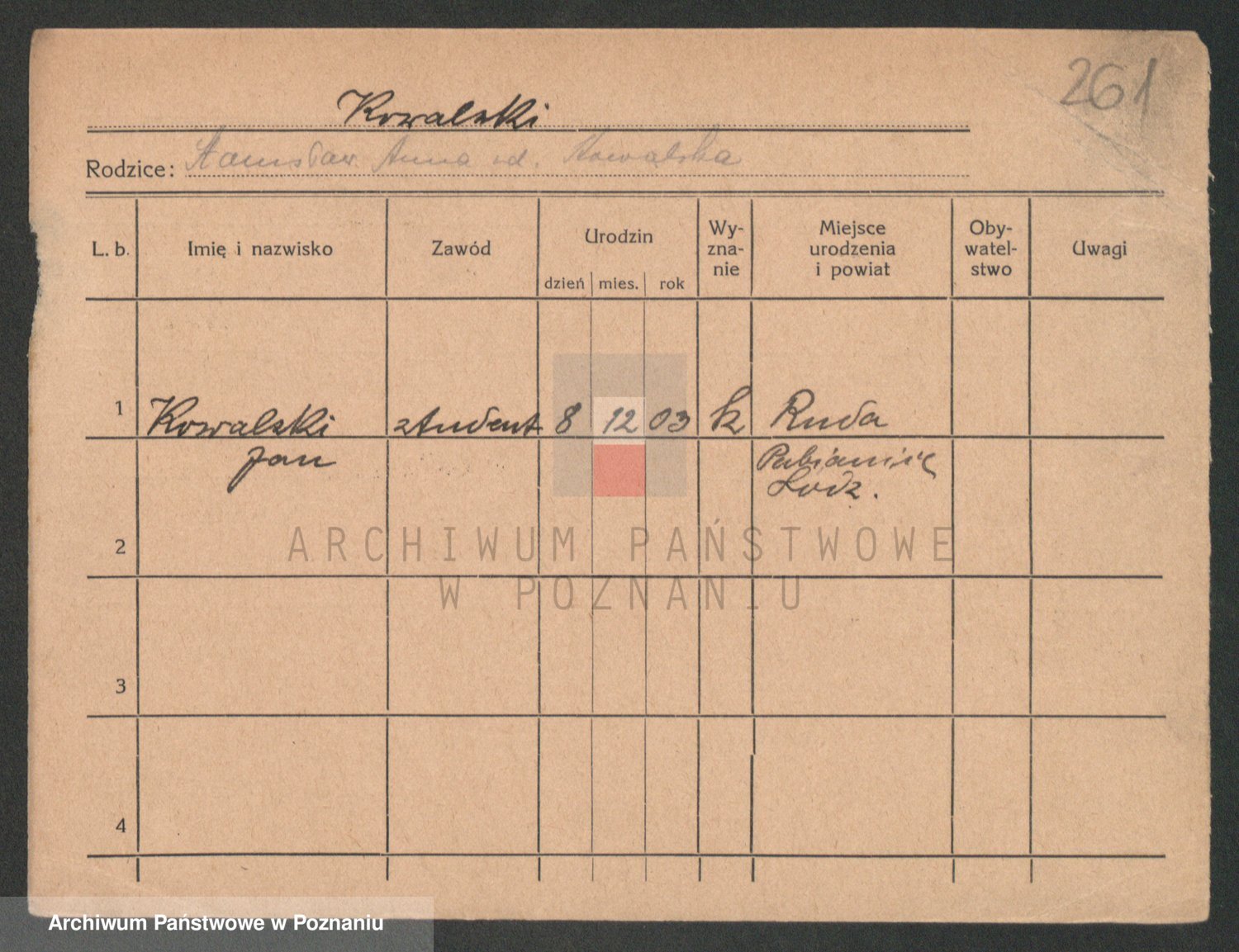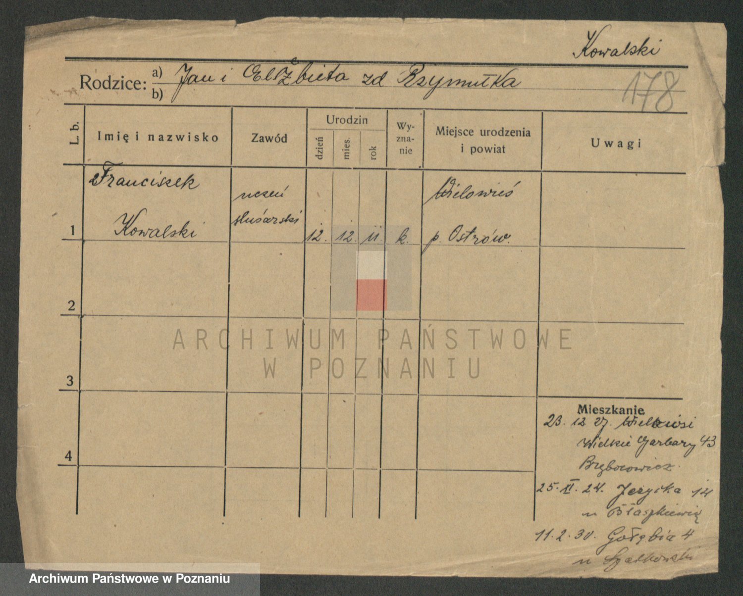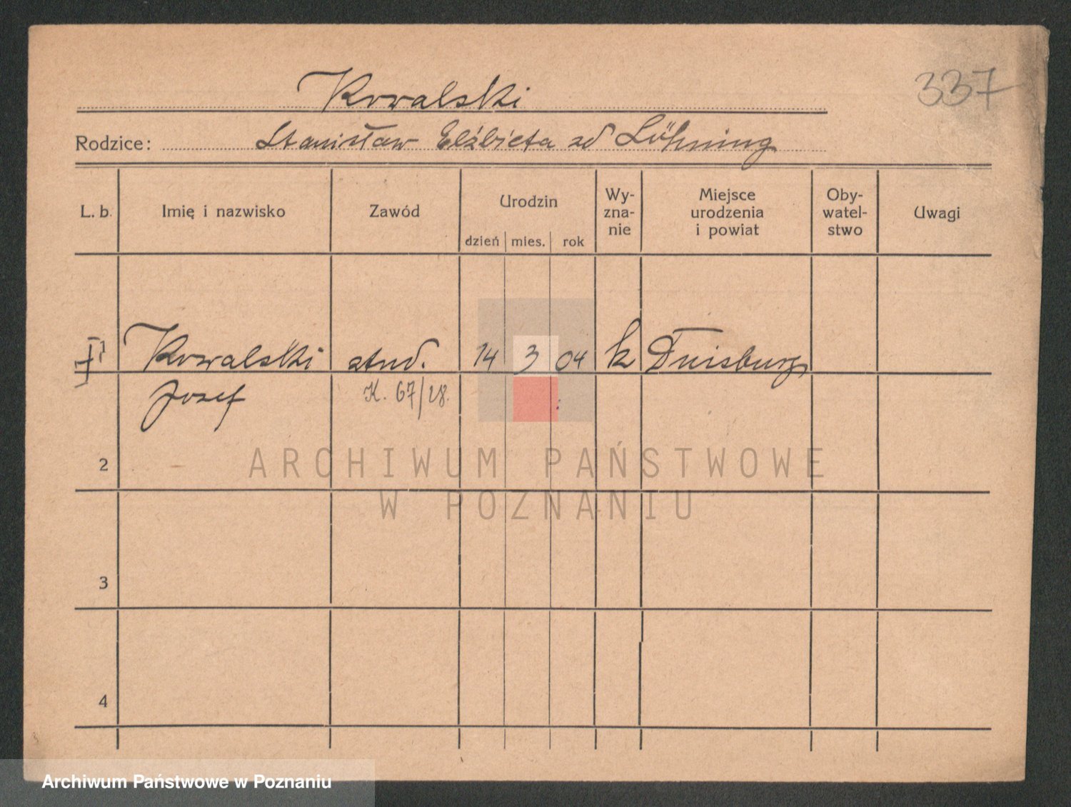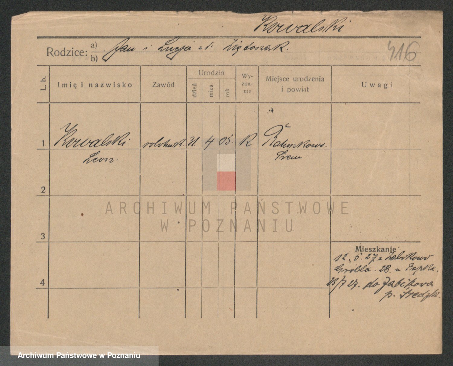 Podgląd karty osobowej dostępny jest po kliknięciu na nazwisko lub ikonkę karty. Można dokonywać powiększenia (ikony na górze) lub przechodzić między kolejnymi skanami (strzałki po bokach).