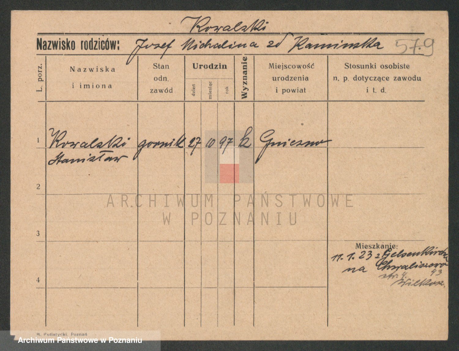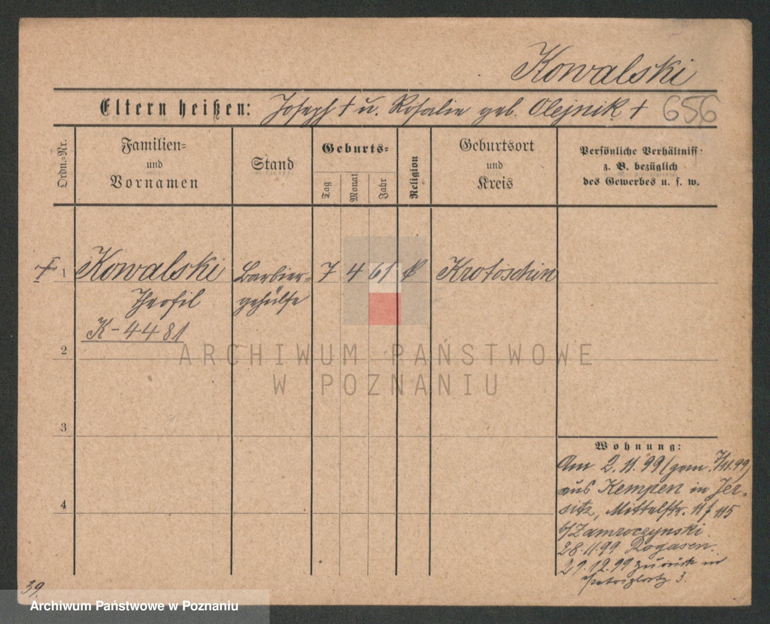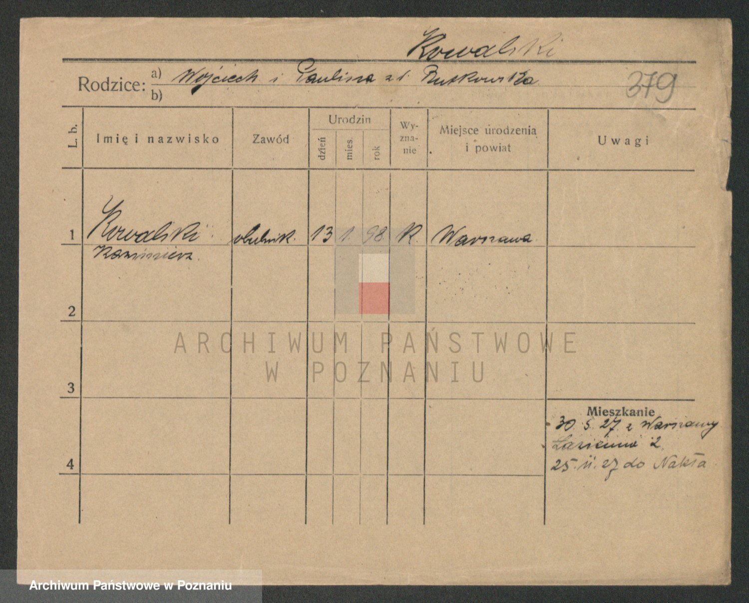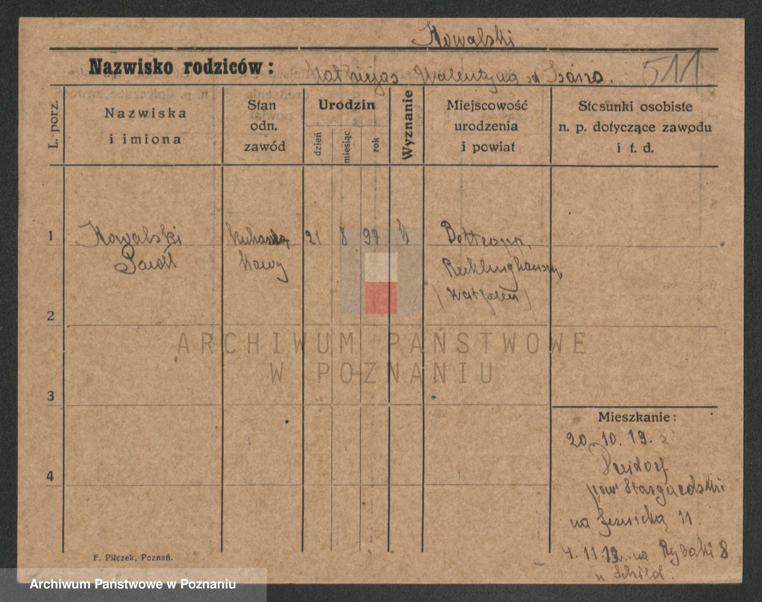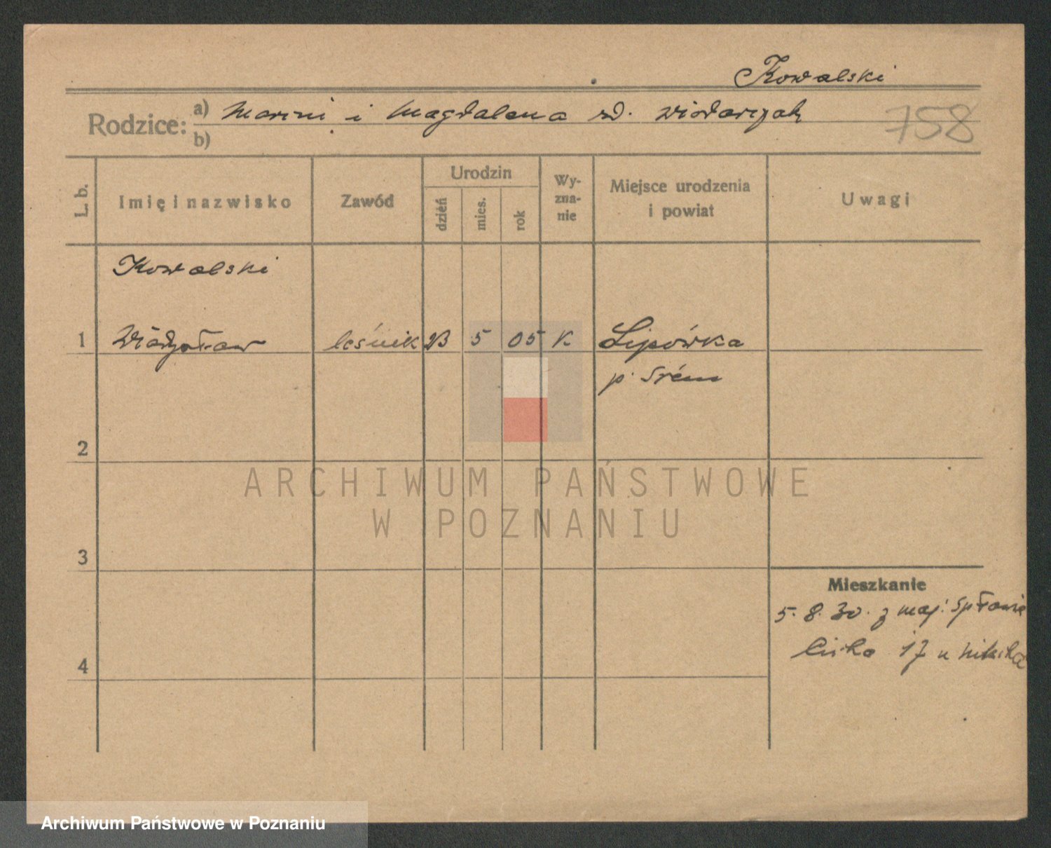 Podgląd karty osobowej dostępny jest po kliknięciu na nazwisko lub ikonkę karty. Można dokonywać powiększenia (ikony na górze) lub przechodzić między kolejnymi skanami (strzałki po bokach).
