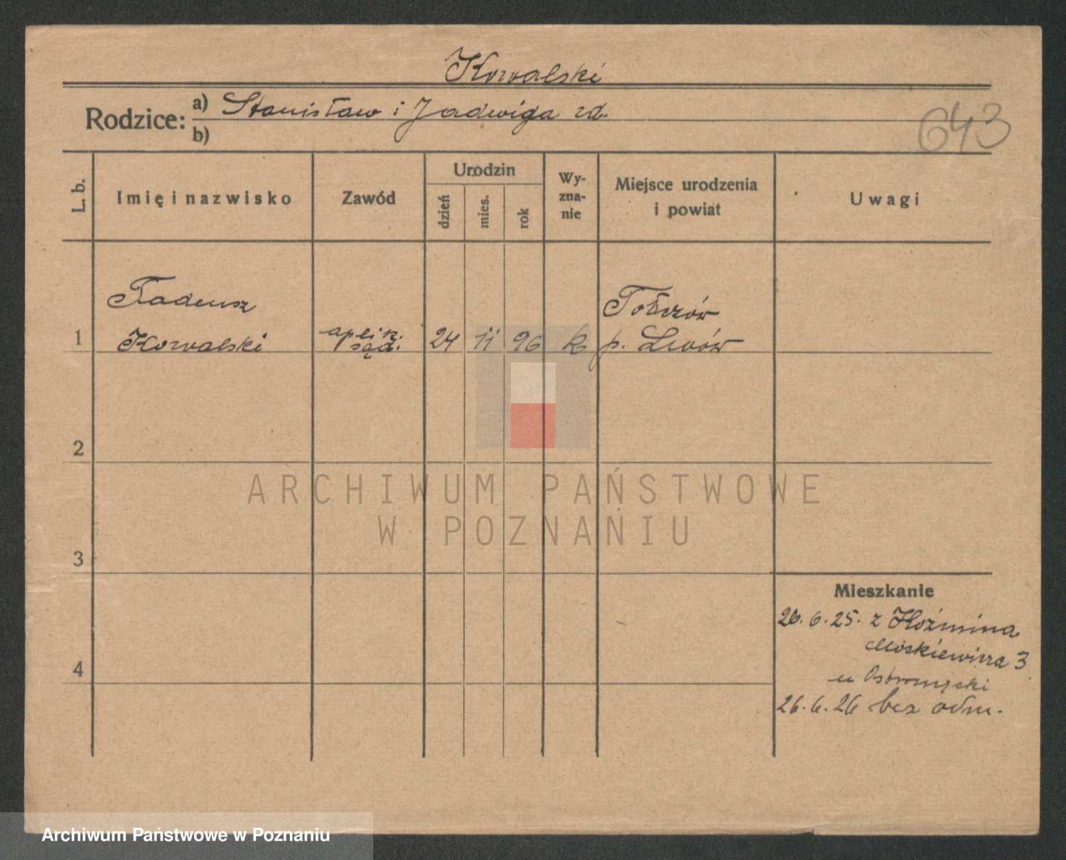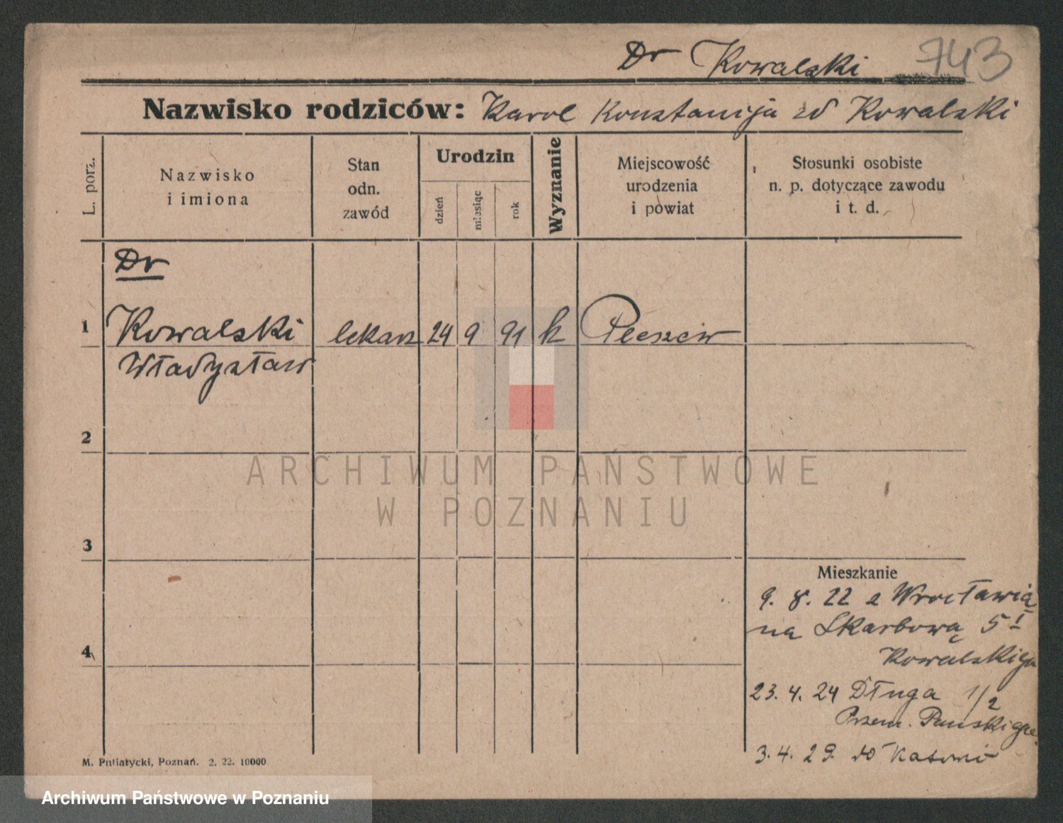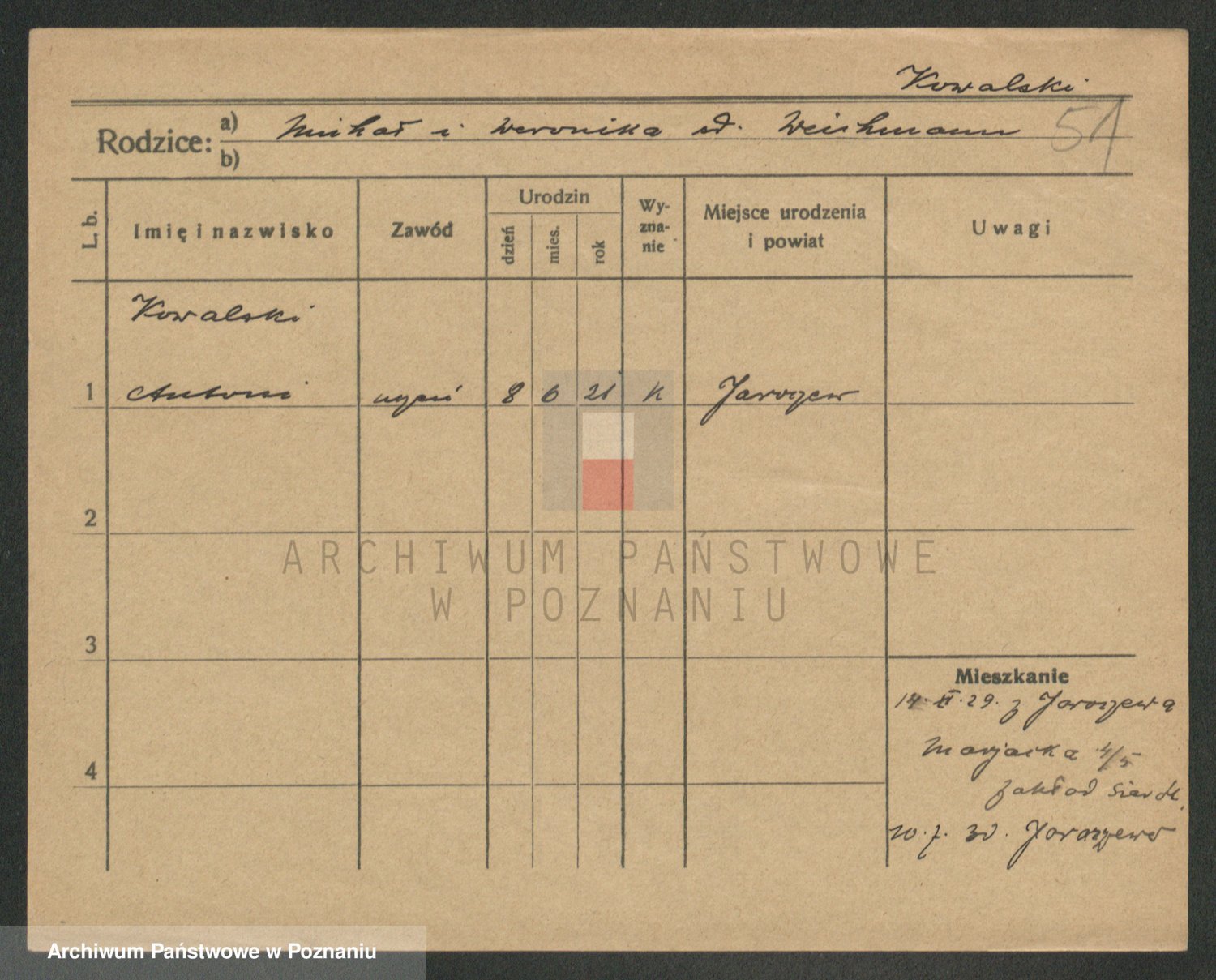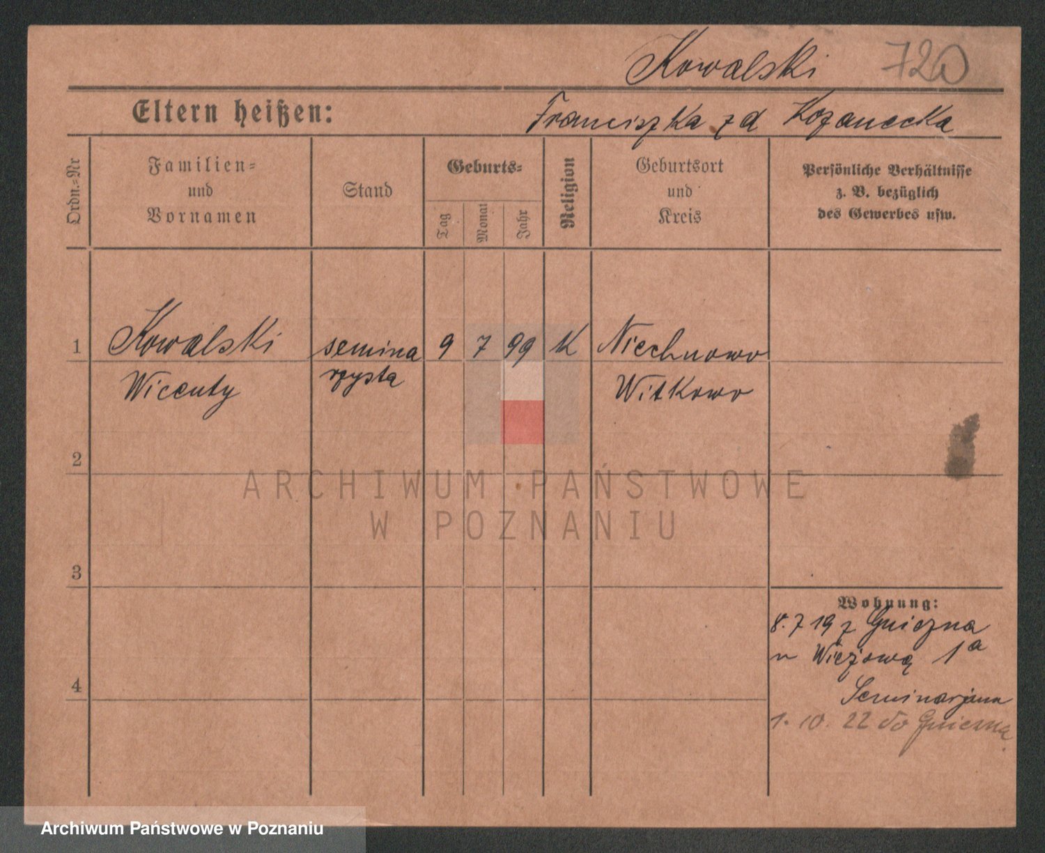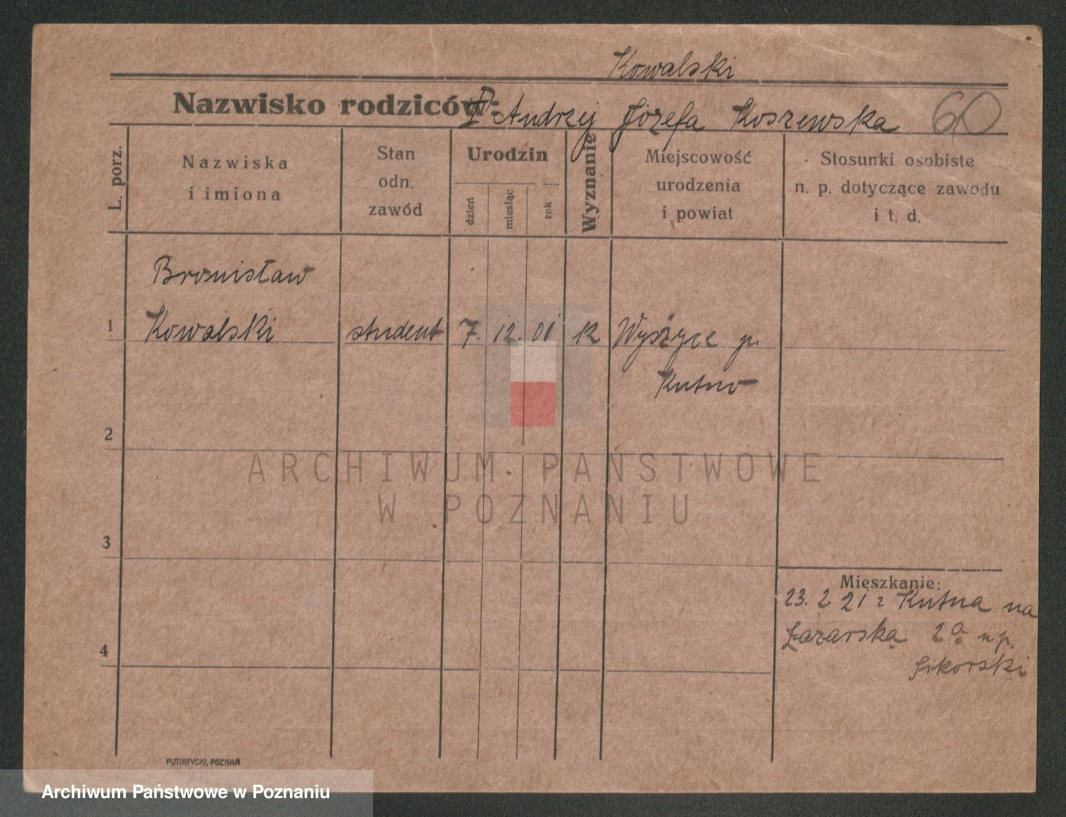 Podgląd karty osobowej dostępny jest po kliknięciu na nazwisko lub ikonkę karty. Można dokonywać powiększenia (ikony na górze) lub przechodzić między kolejnymi skanami (strzałki po bokach).