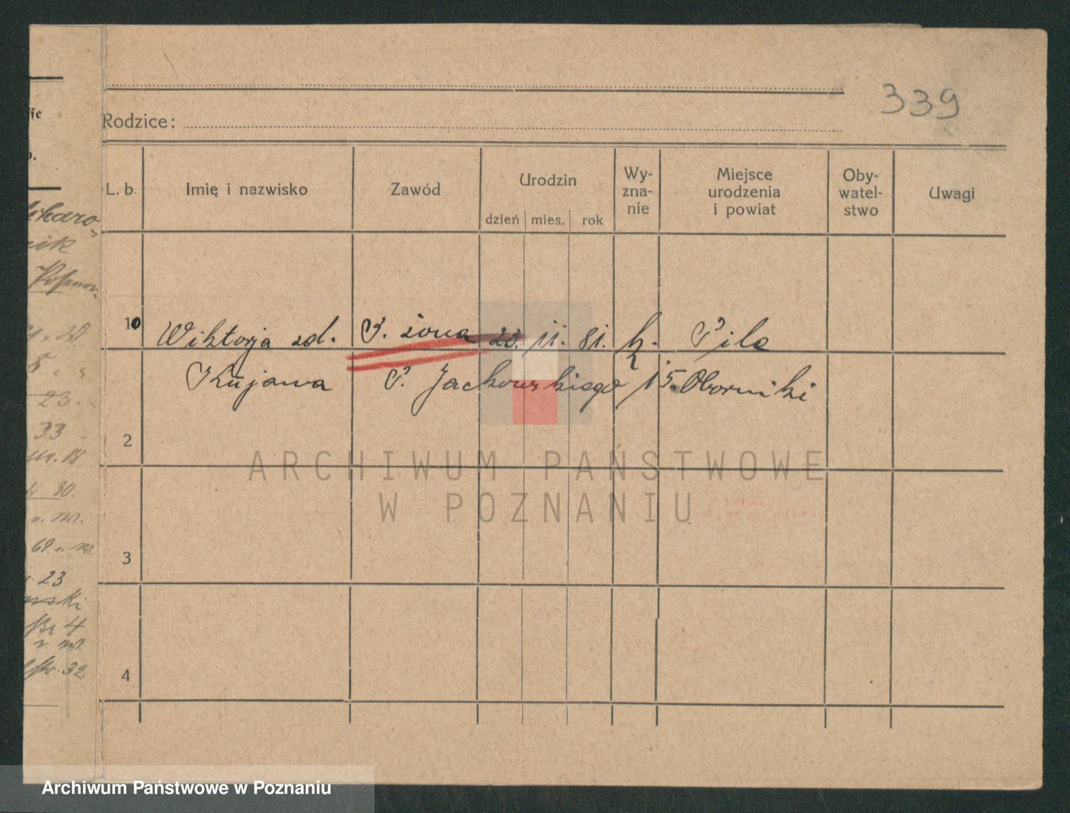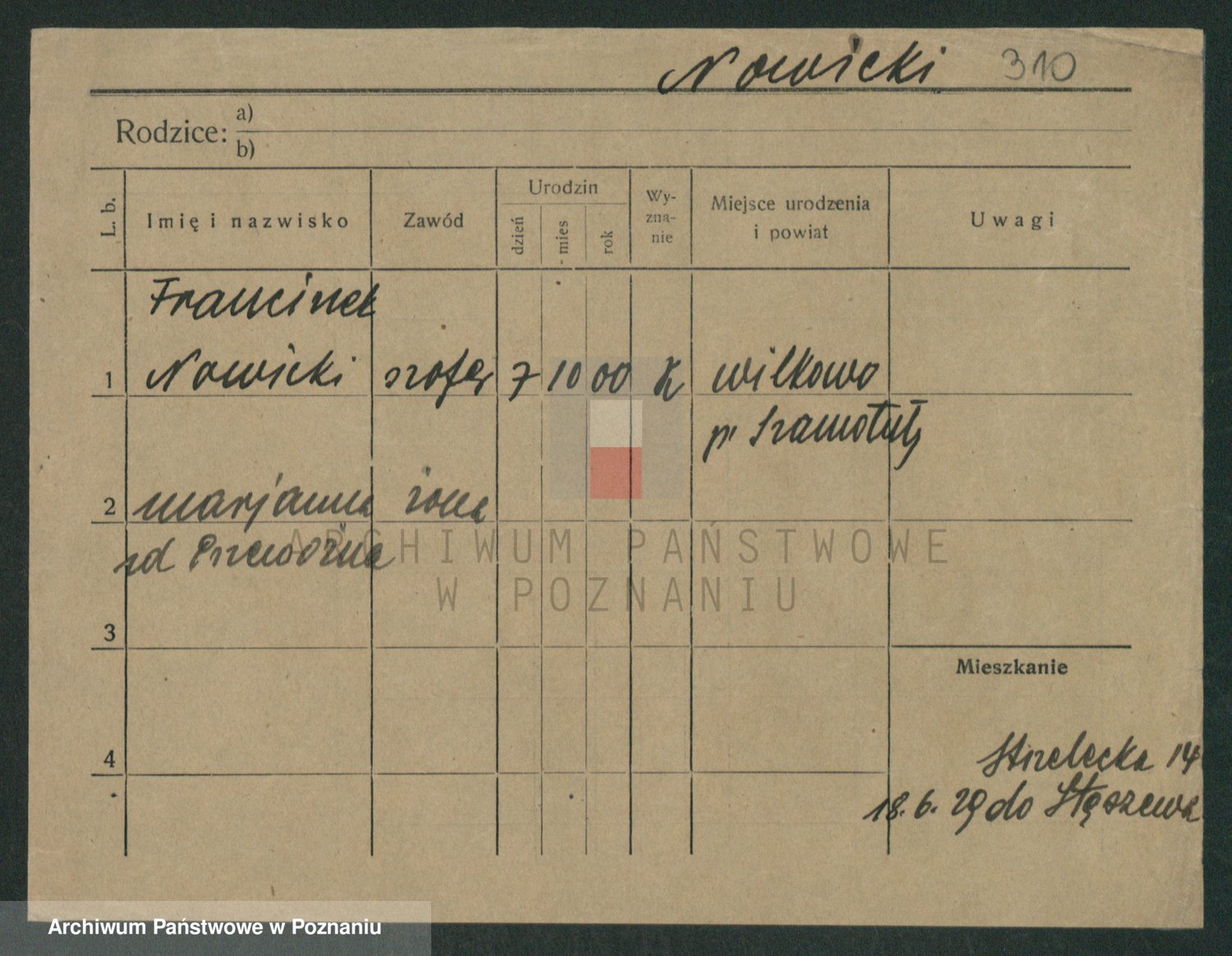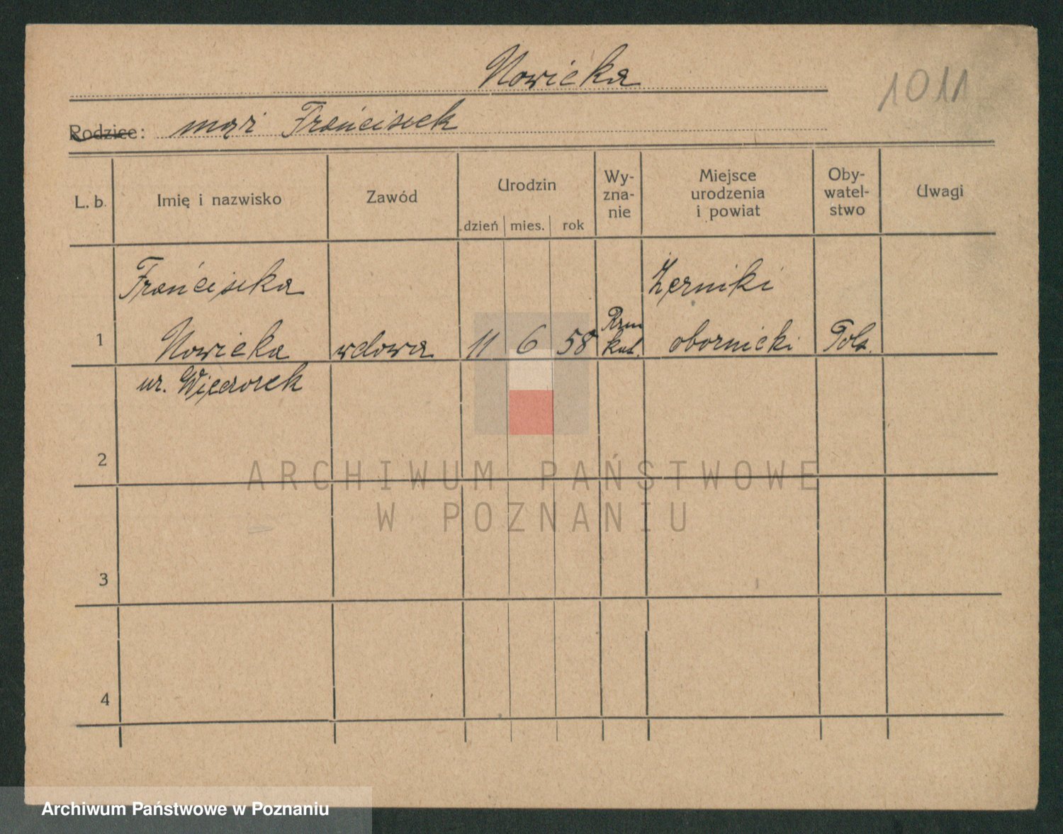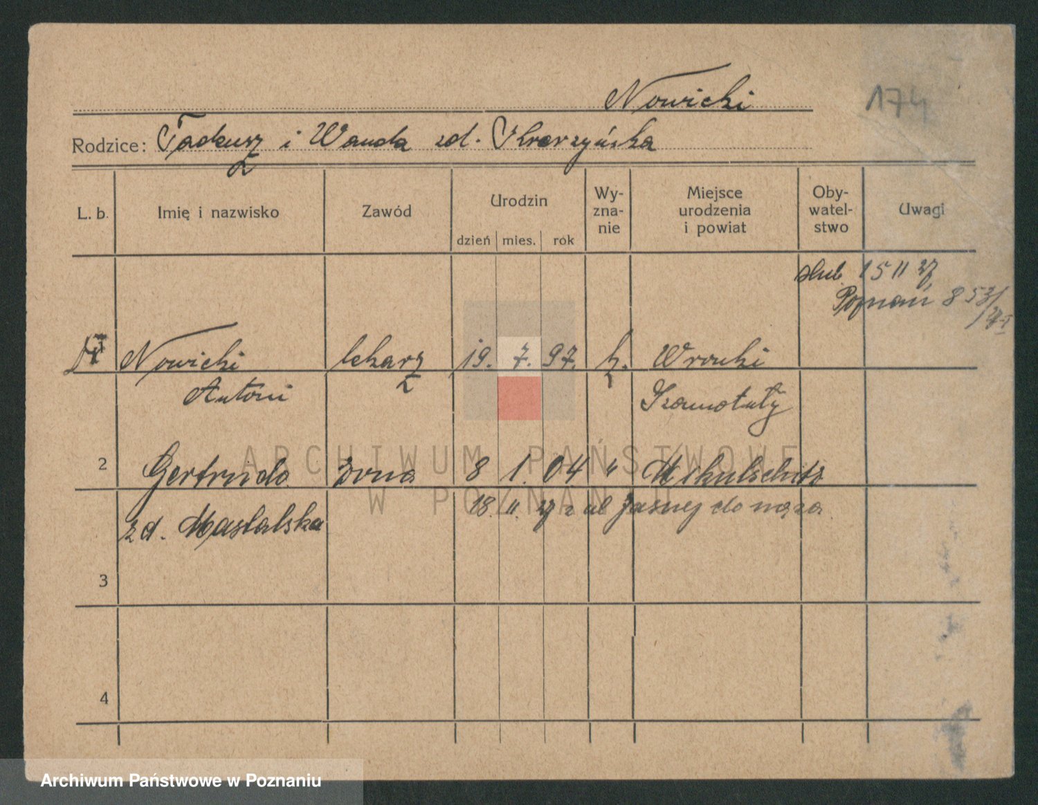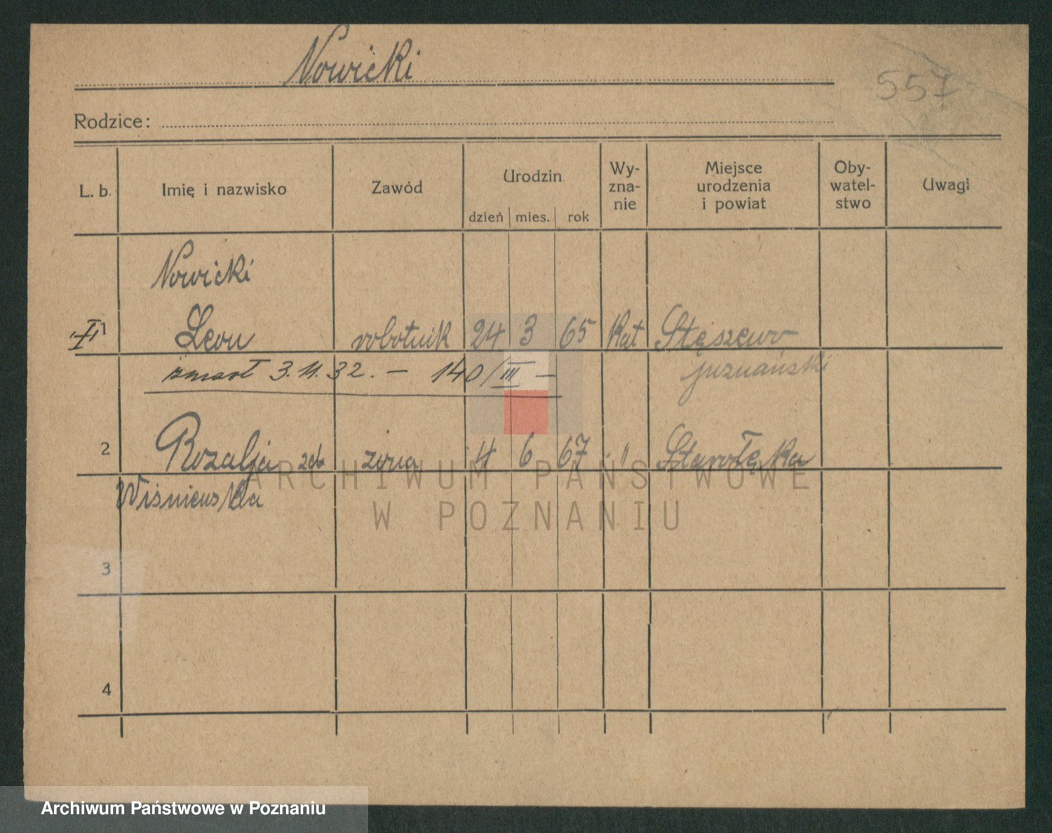 Podgląd karty osobowej dostępny jest po kliknięciu na nazwisko lub ikonkę karty. Można dokonywać powiększenia (ikony na górze) lub przechodzić między kolejnymi skanami (strzałki po bokach).