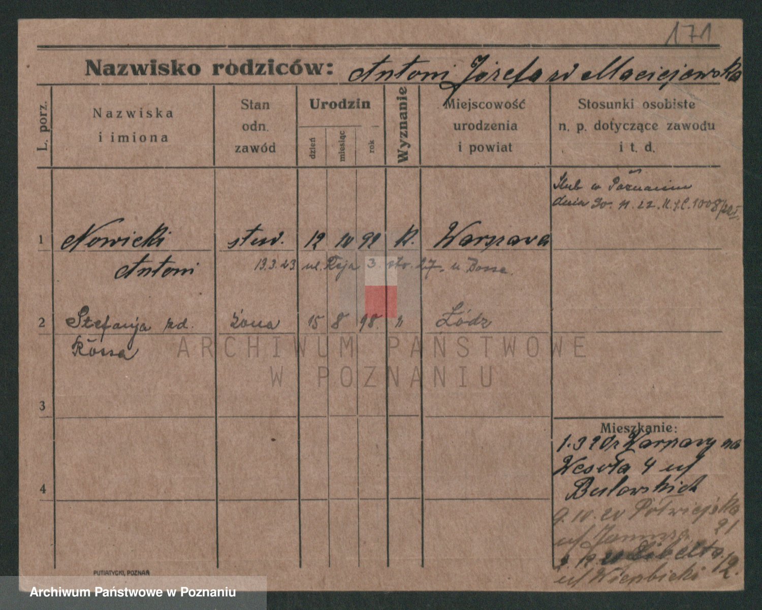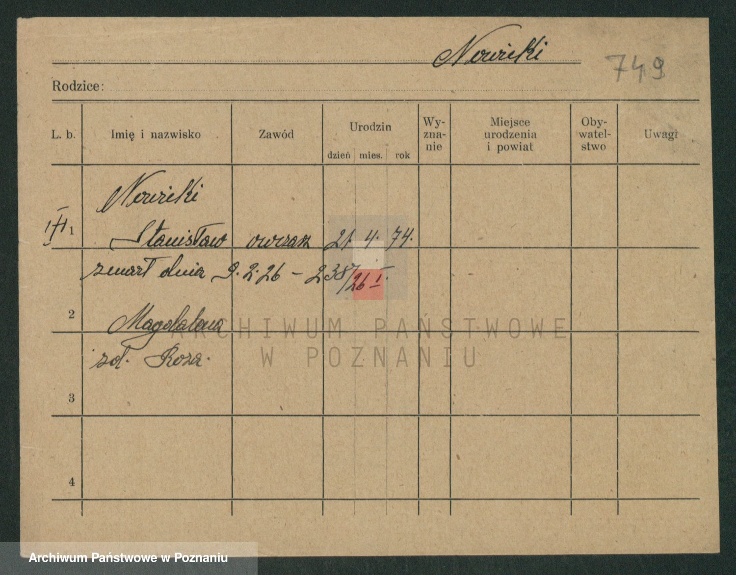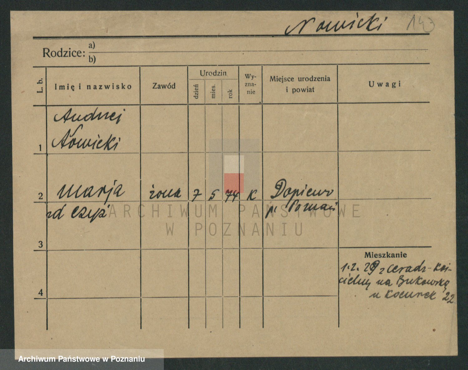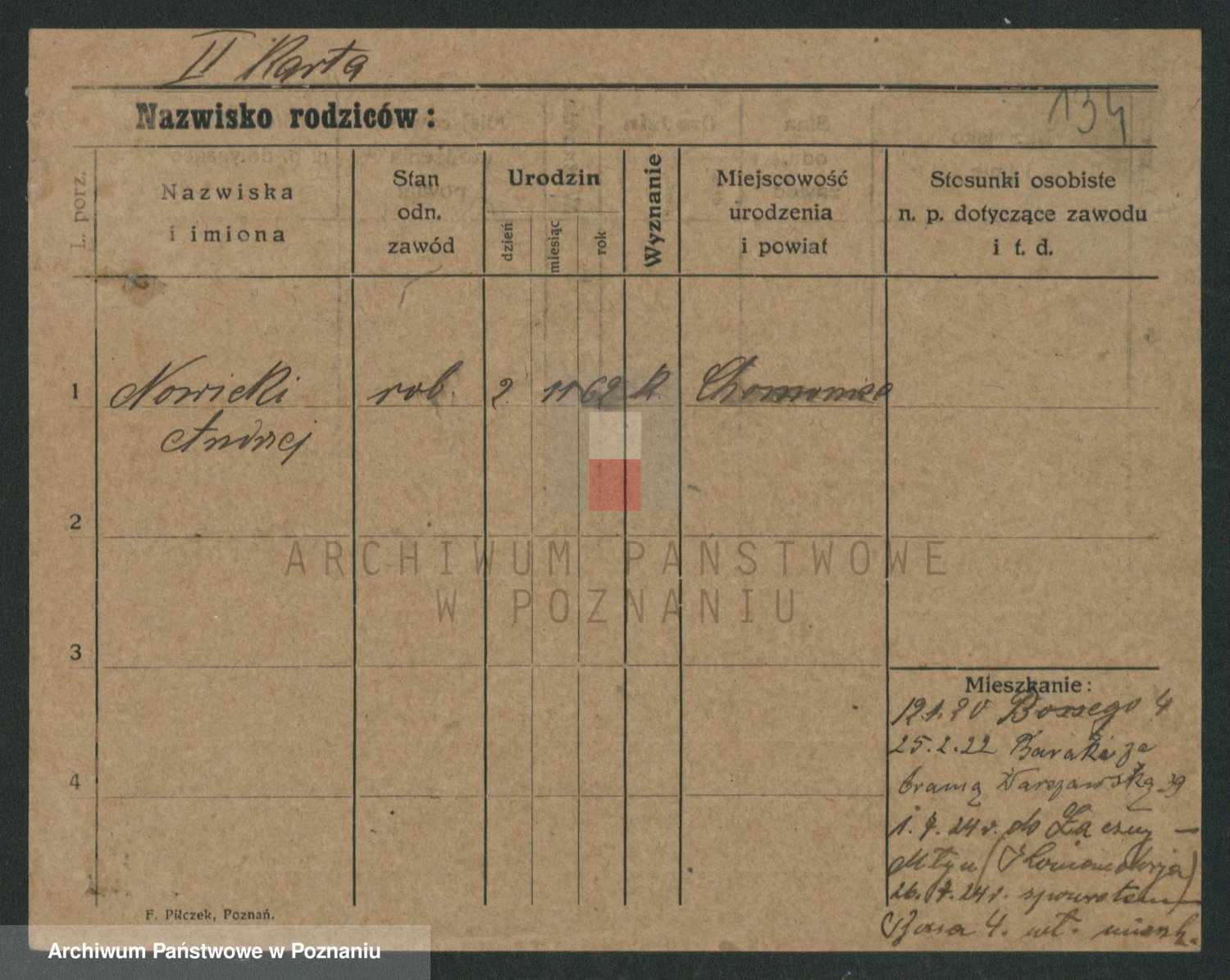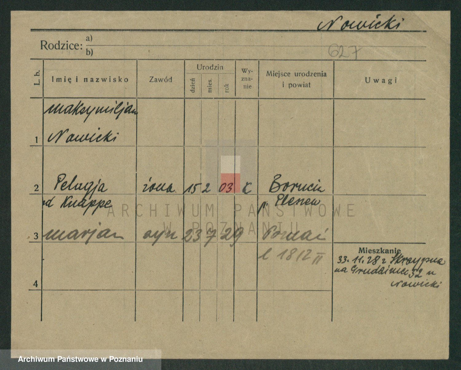 Podgląd karty osobowej dostępny jest po kliknięciu na nazwisko lub ikonkę karty. Można dokonywać powiększenia (ikony na górze) lub przechodzić między kolejnymi skanami (strzałki po bokach).