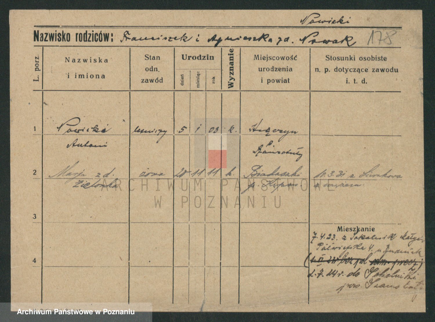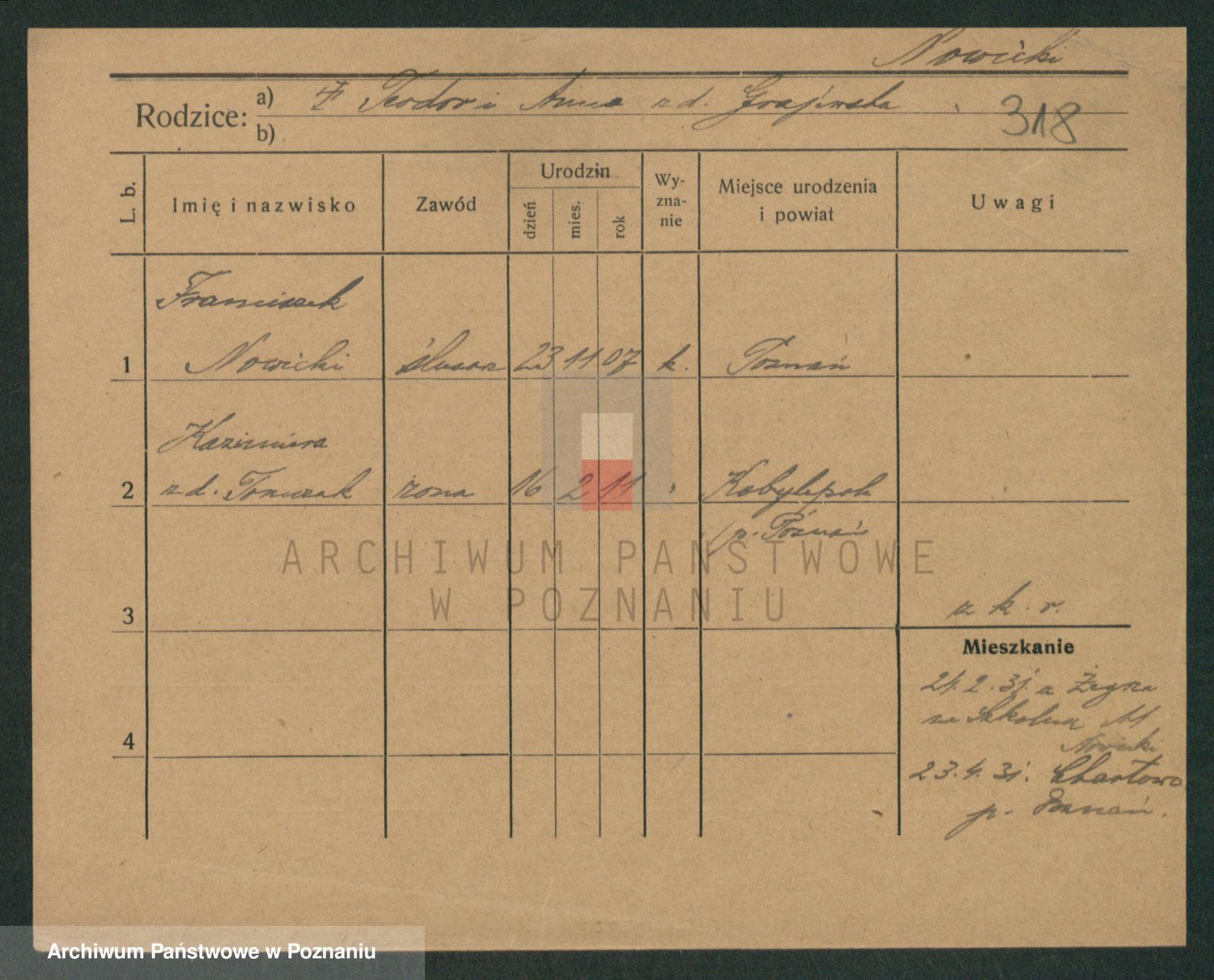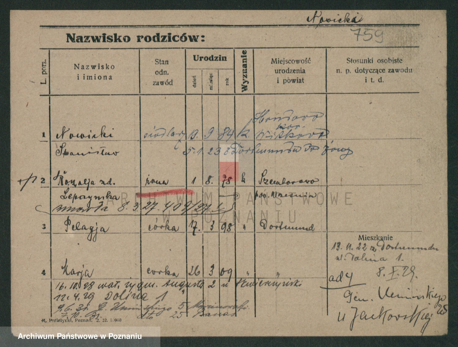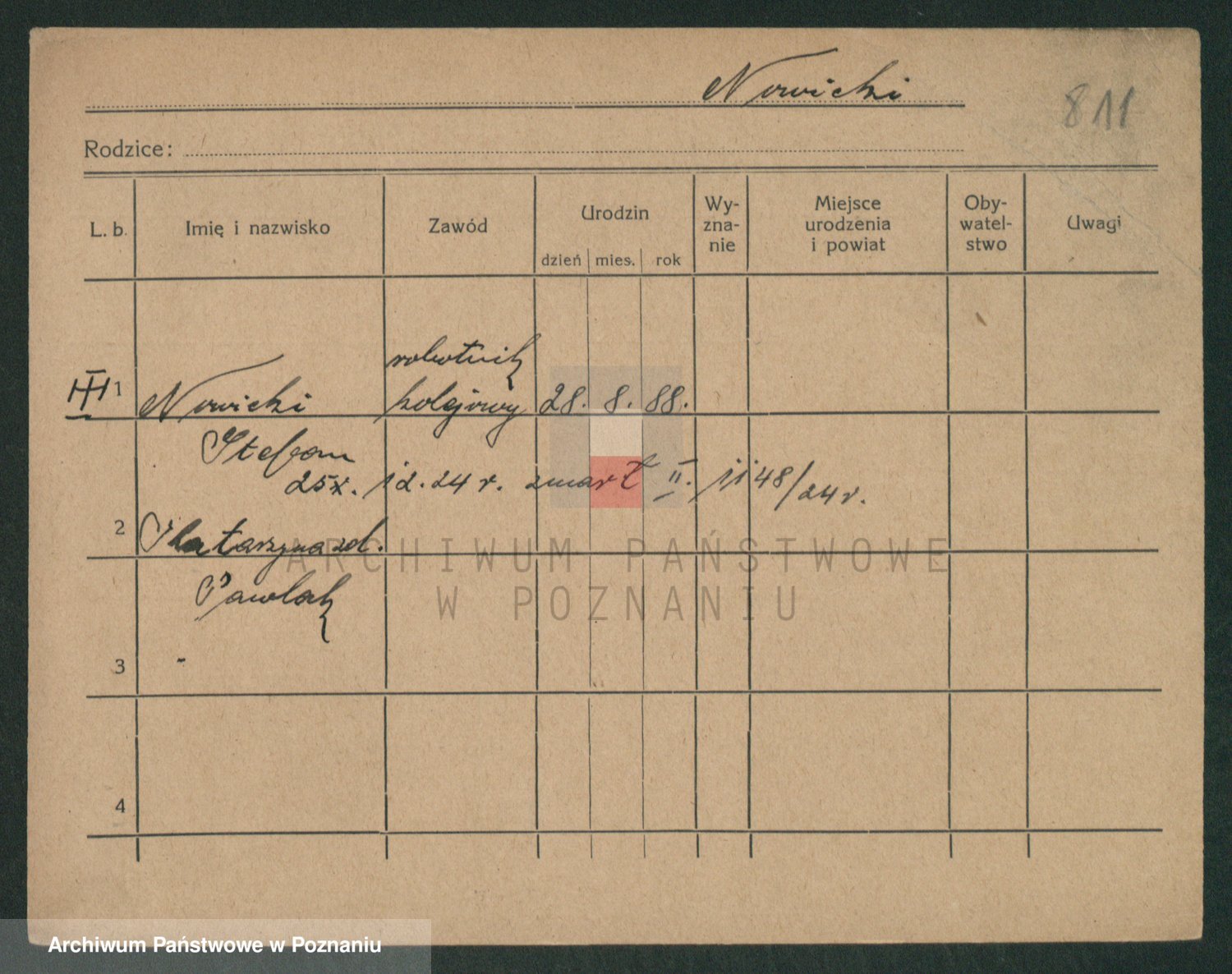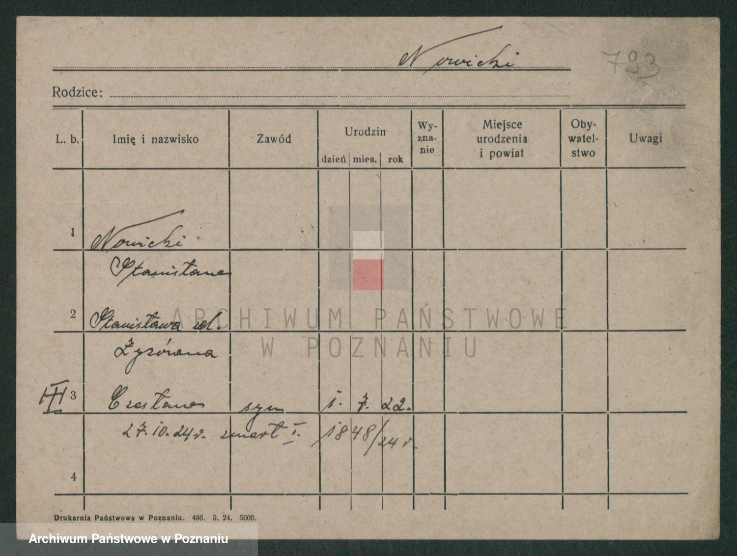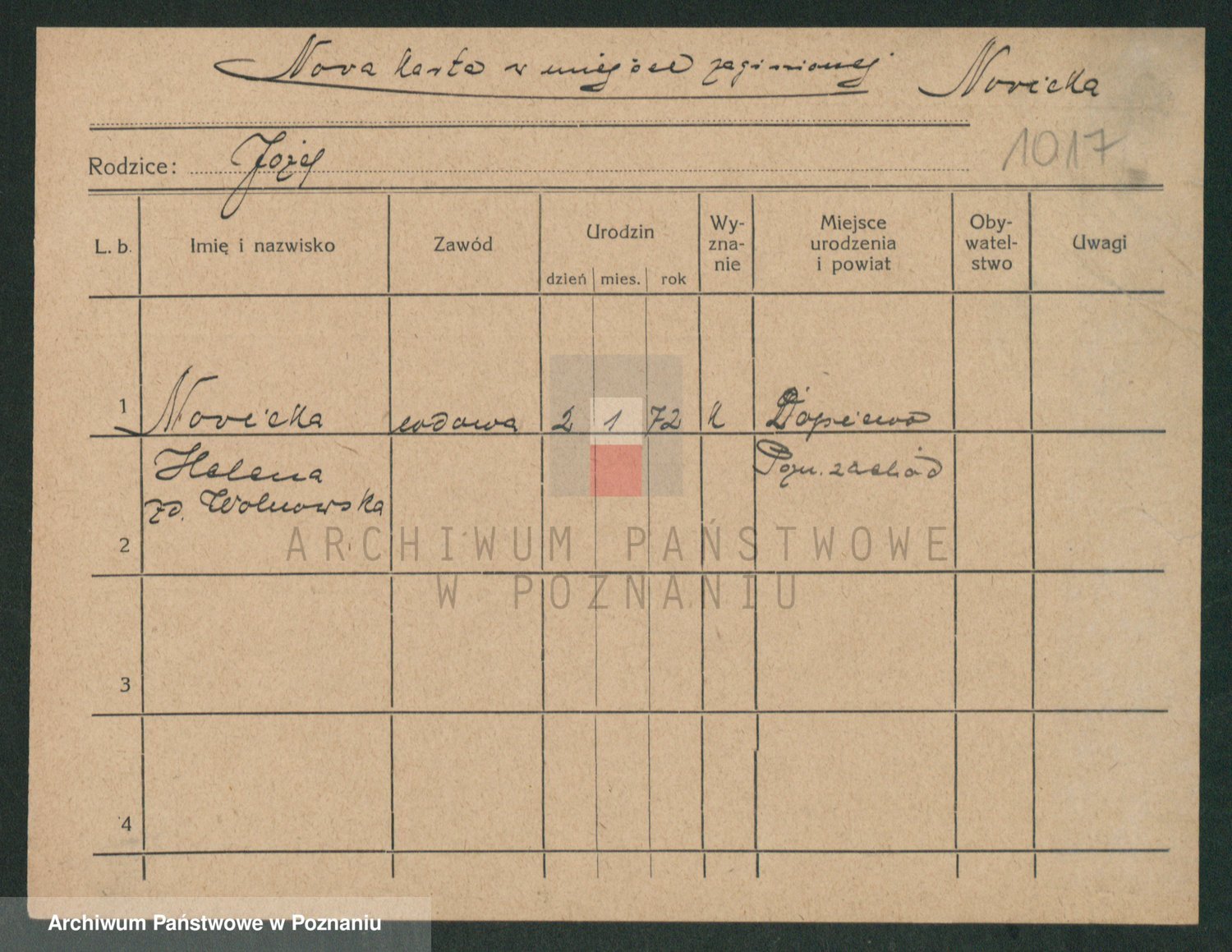Podgląd karty osobowej dostępny jest po kliknięciu na nazwisko lub ikonkę karty. Można dokonywać powiększenia (ikony na górze) lub przechodzić między kolejnymi skanami (strzałki po bokach).