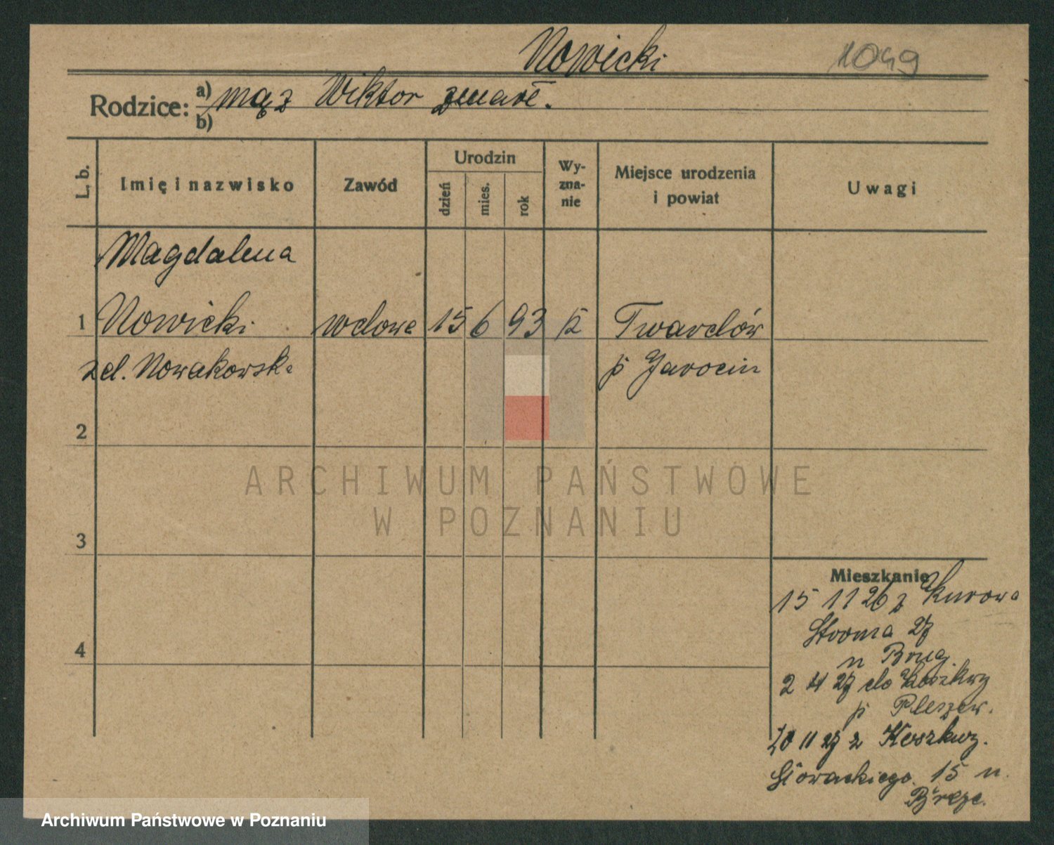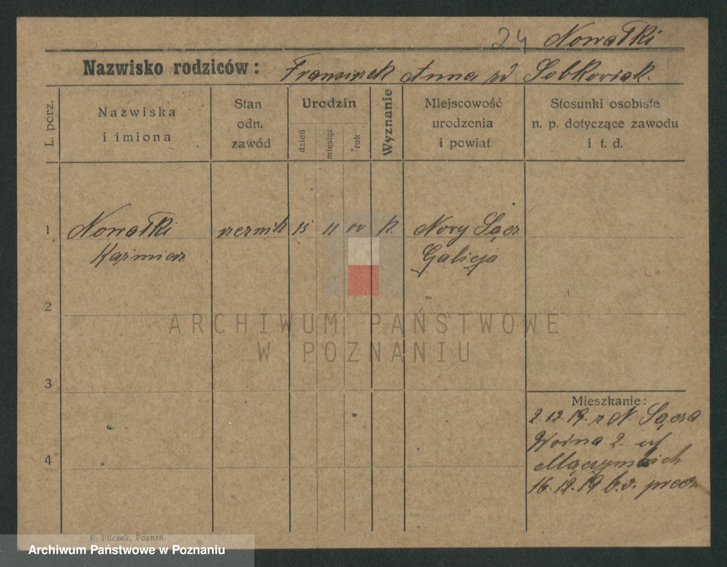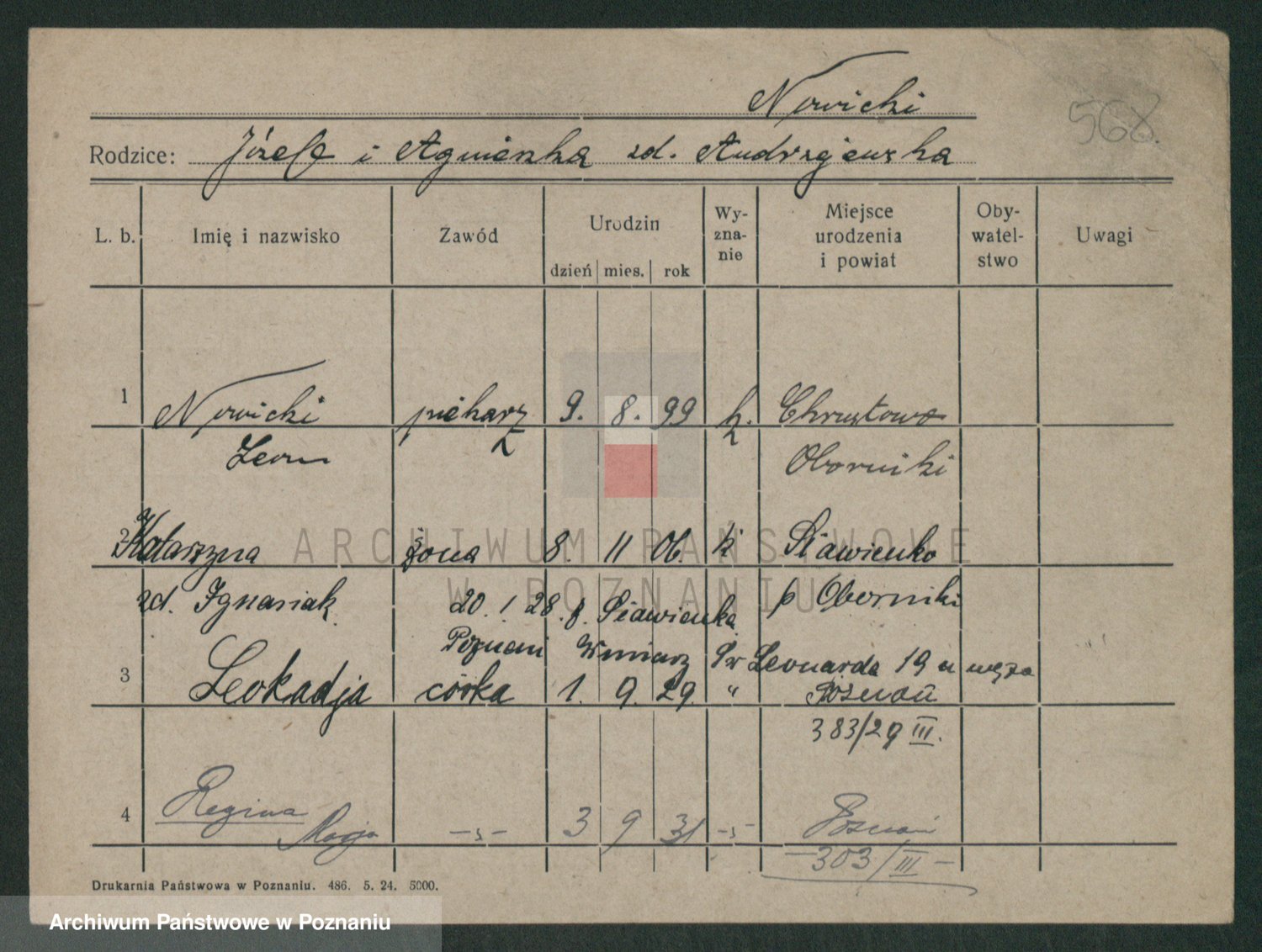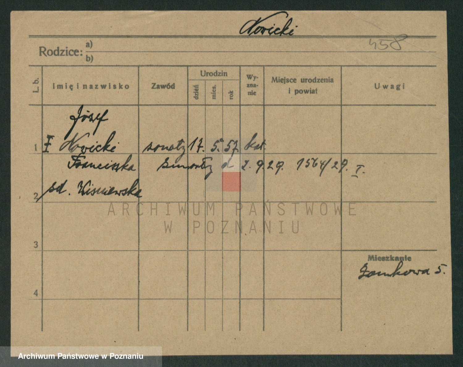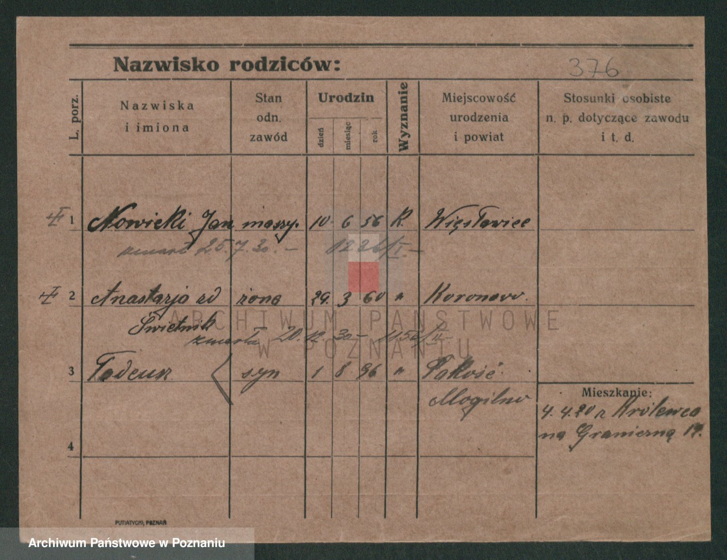 Podgląd karty osobowej dostępny jest po kliknięciu na nazwisko lub ikonkę karty. Można dokonywać powiększenia (ikony na górze) lub przechodzić między kolejnymi skanami (strzałki po bokach).