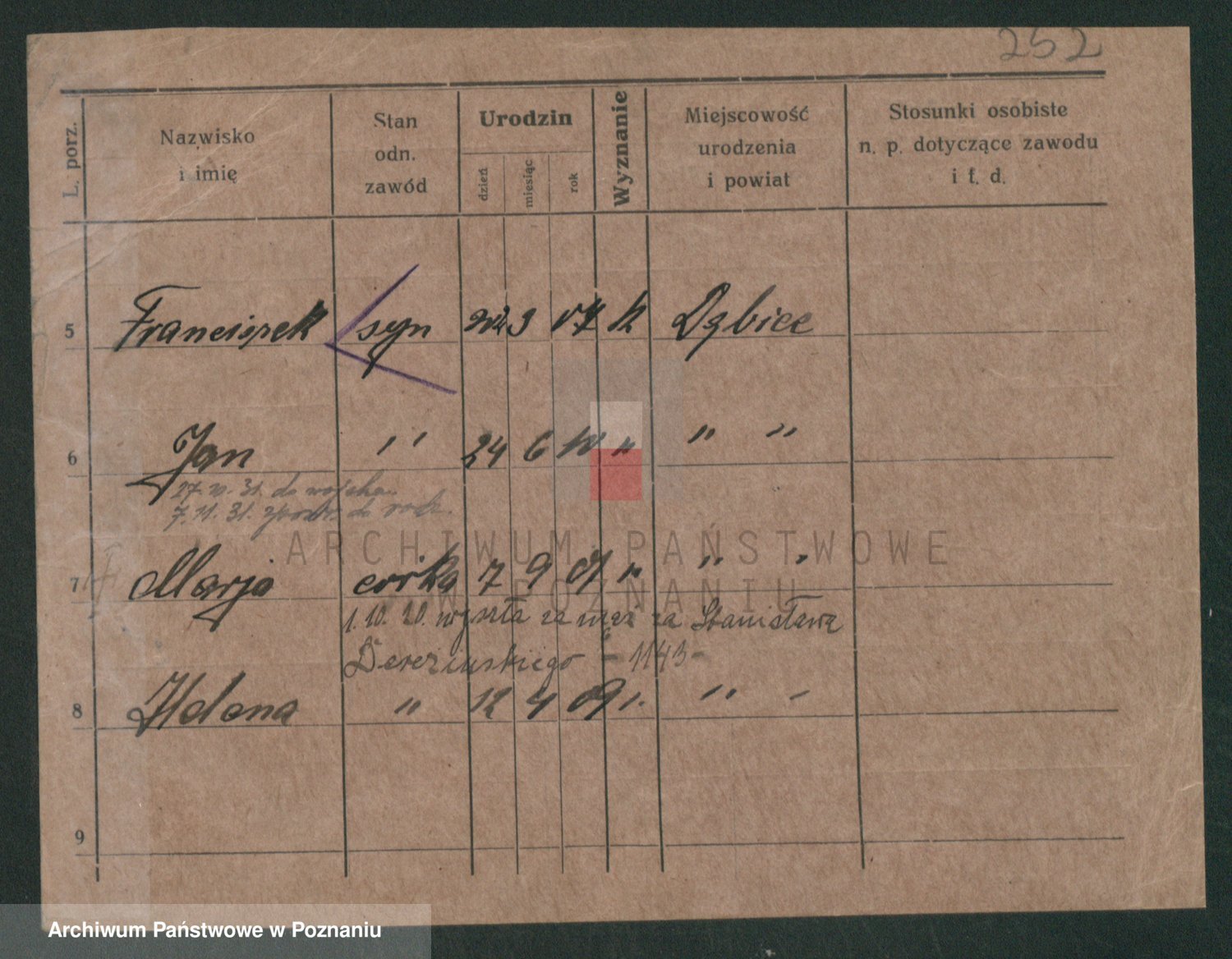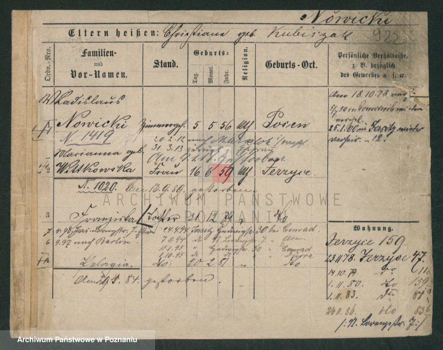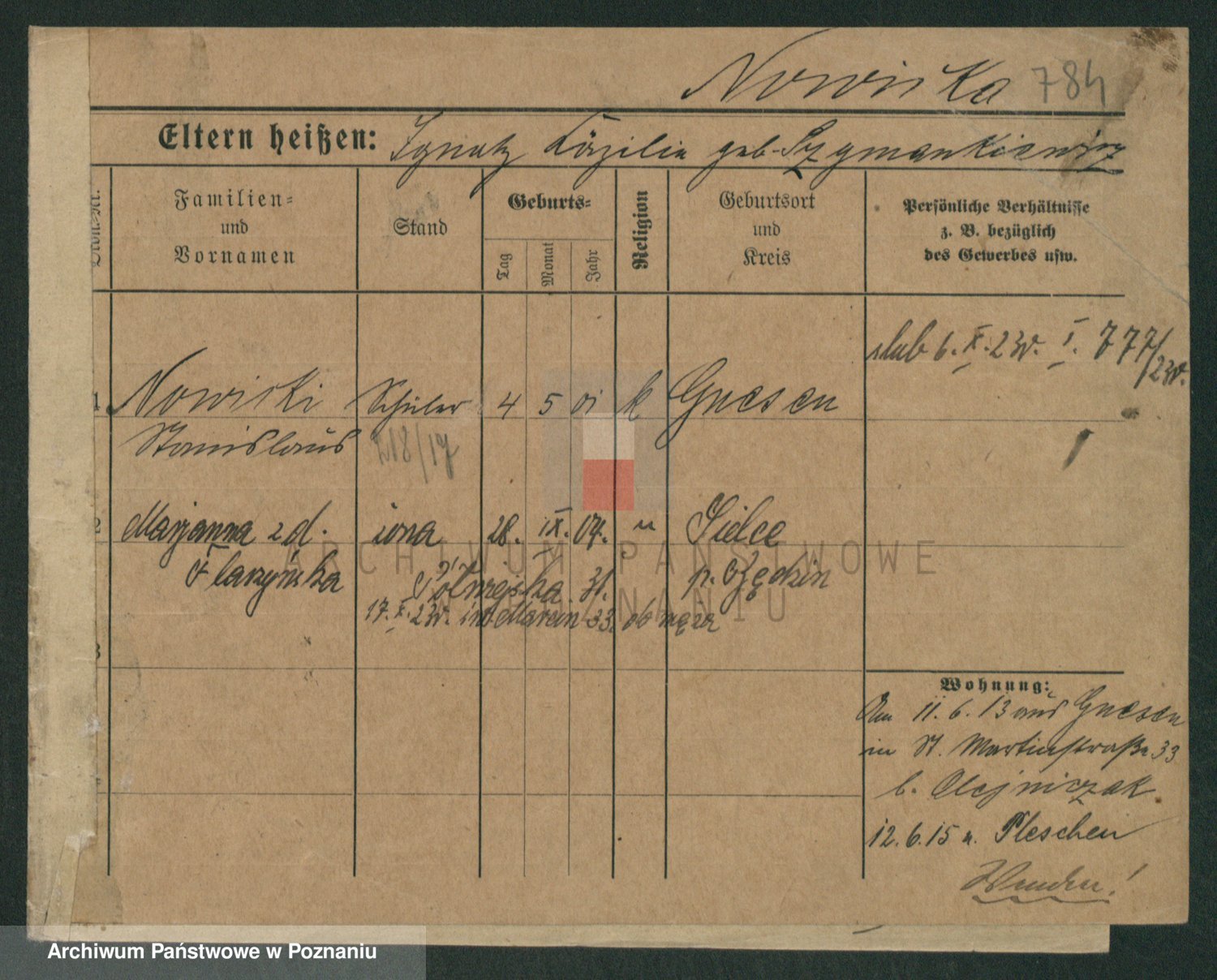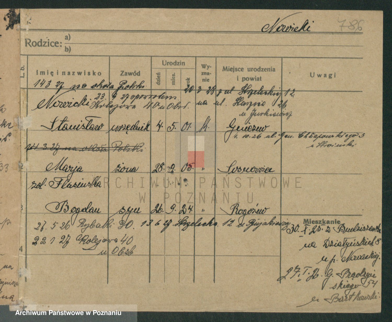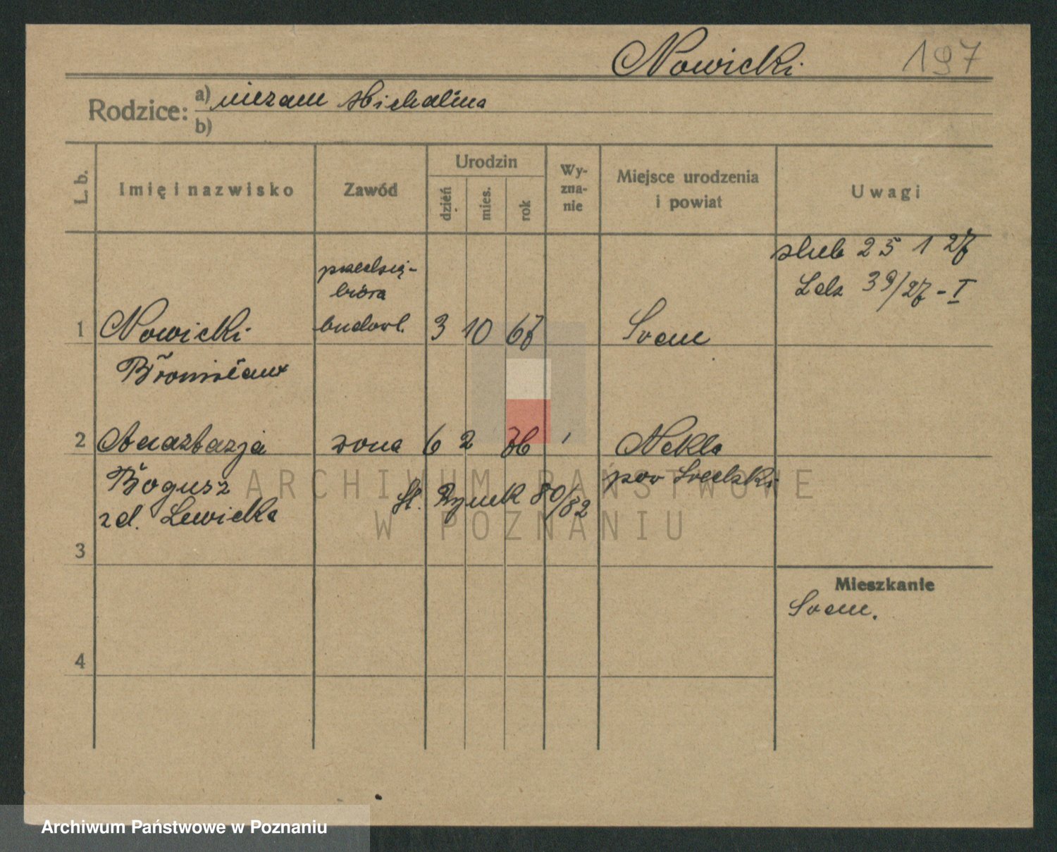 Podgląd karty osobowej dostępny jest po kliknięciu na nazwisko lub ikonkę karty. Można dokonywać powiększenia (ikony na górze) lub przechodzić między kolejnymi skanami (strzałki po bokach).