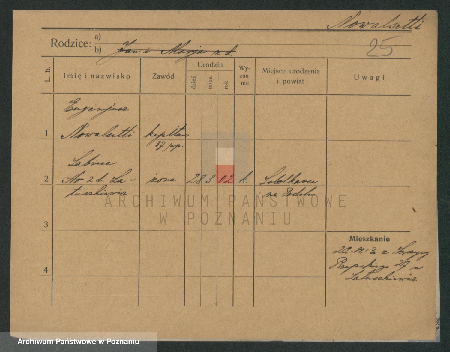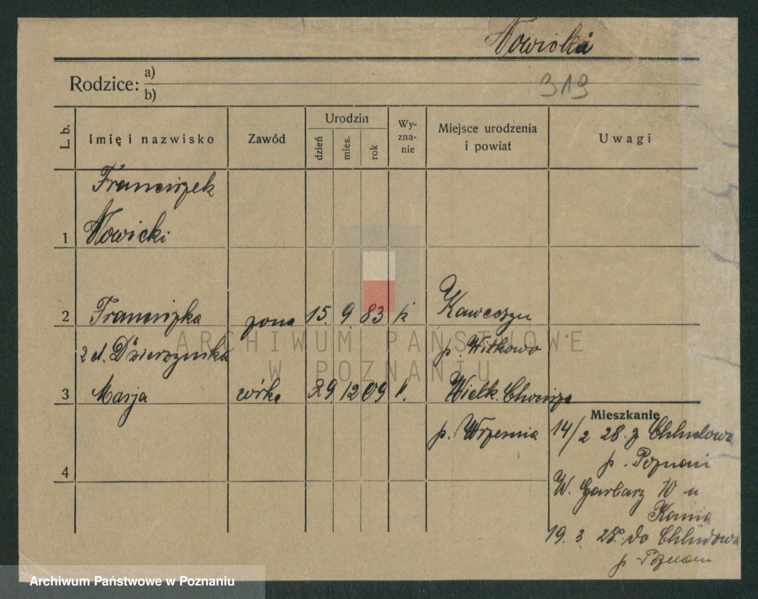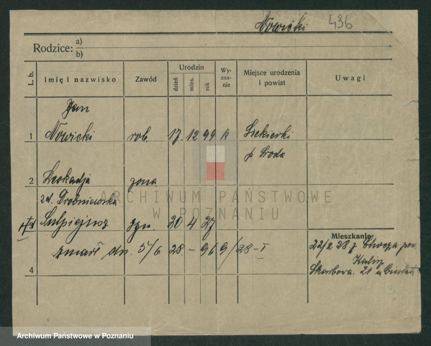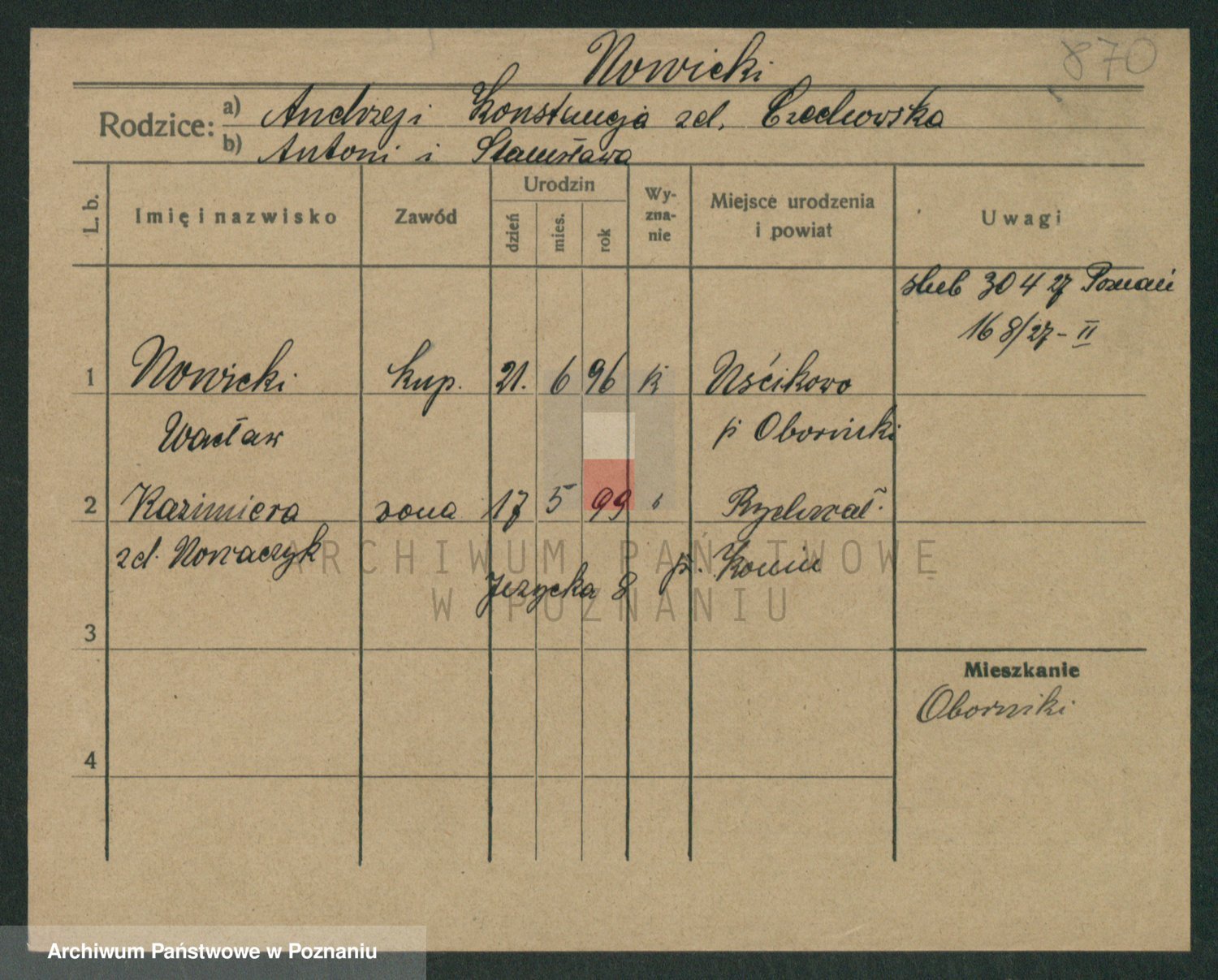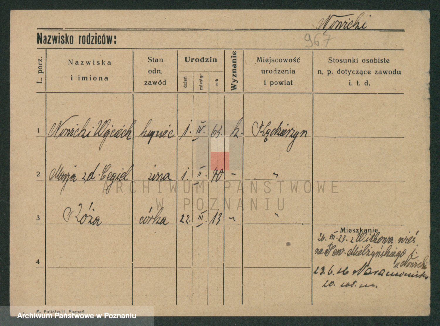 Podgląd karty osobowej dostępny jest po kliknięciu na nazwisko lub ikonkę karty. Można dokonywać powiększenia (ikony na górze) lub przechodzić między kolejnymi skanami (strzałki po bokach).