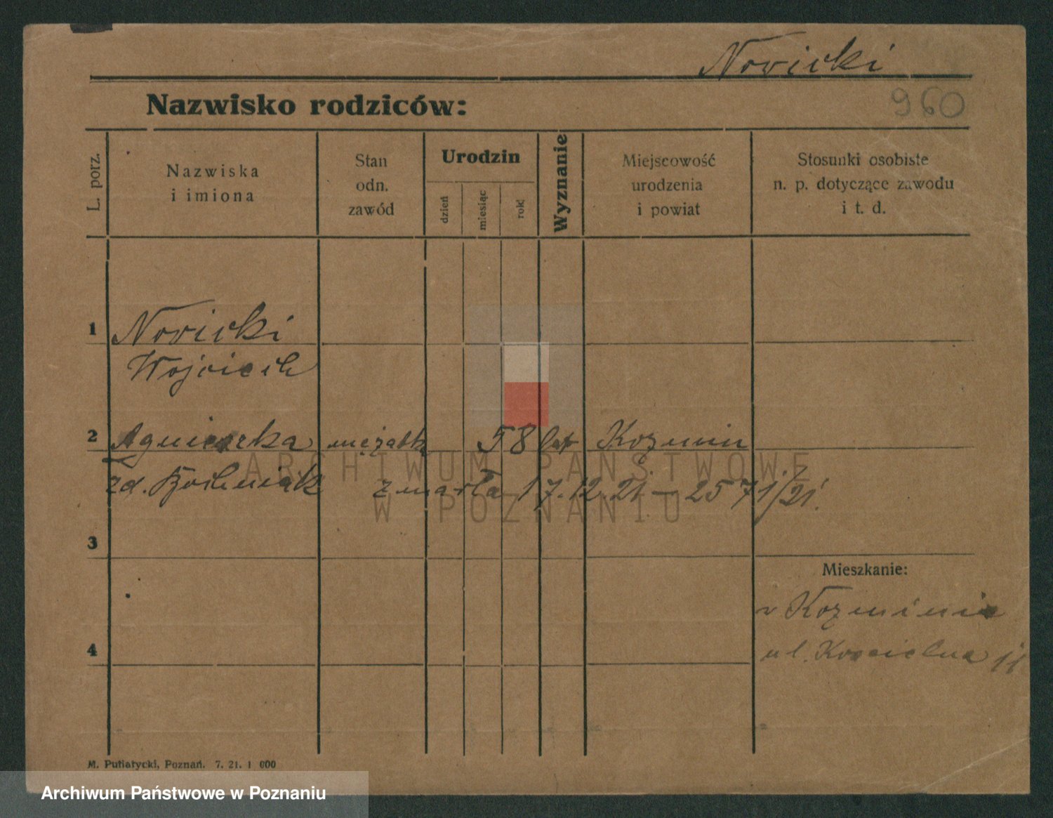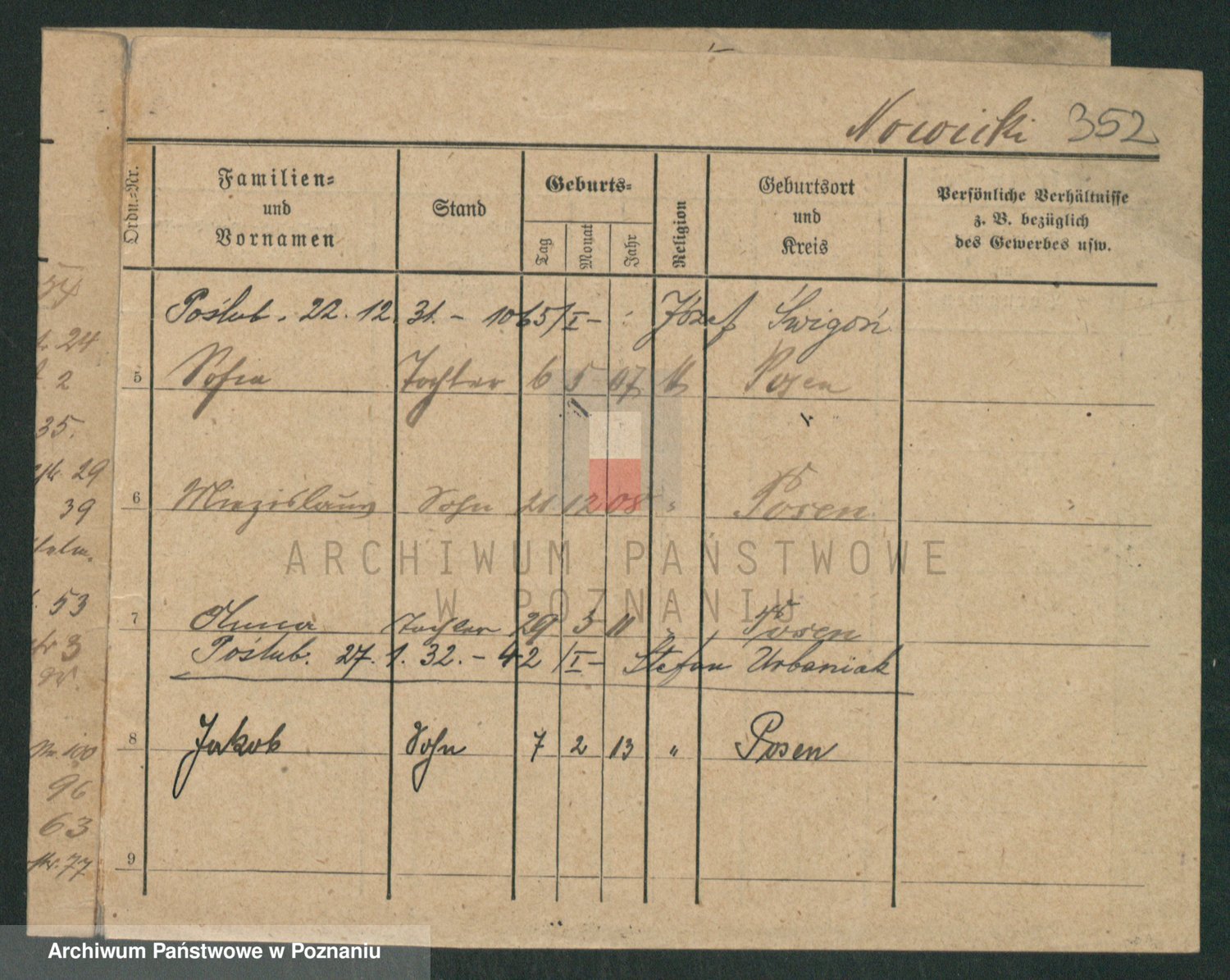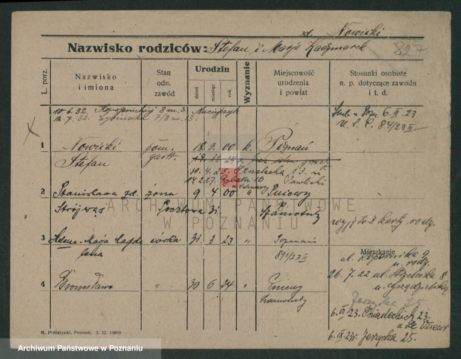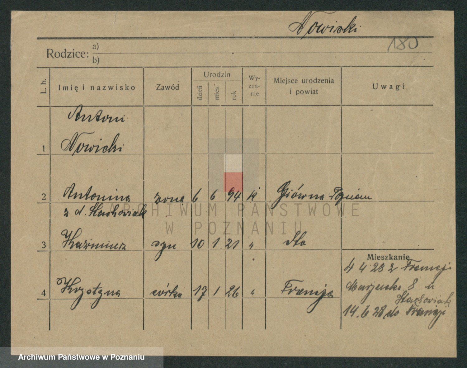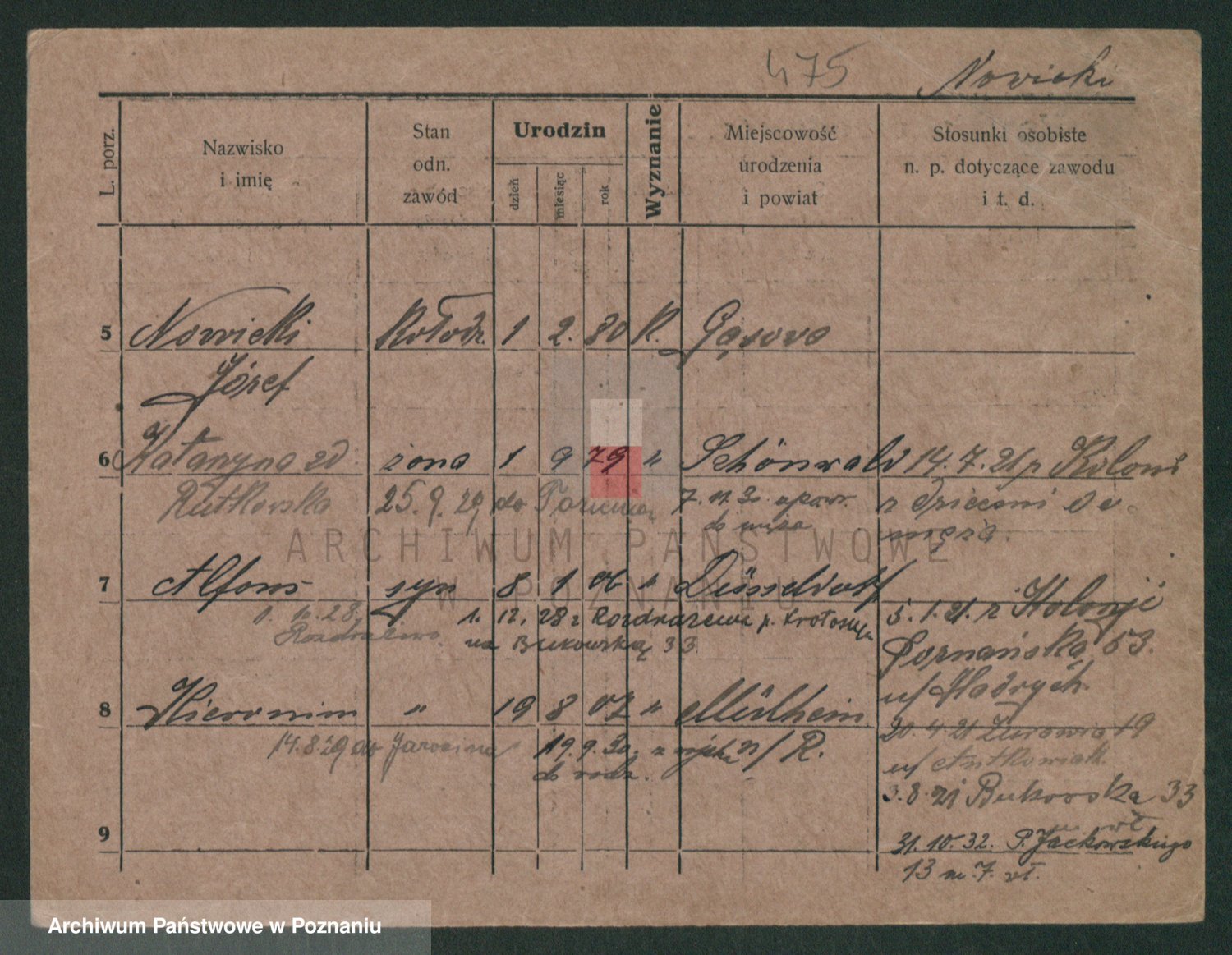 Podgląd karty osobowej dostępny jest po kliknięciu na nazwisko lub ikonkę karty. Można dokonywać powiększenia (ikony na górze) lub przechodzić między kolejnymi skanami (strzałki po bokach).
