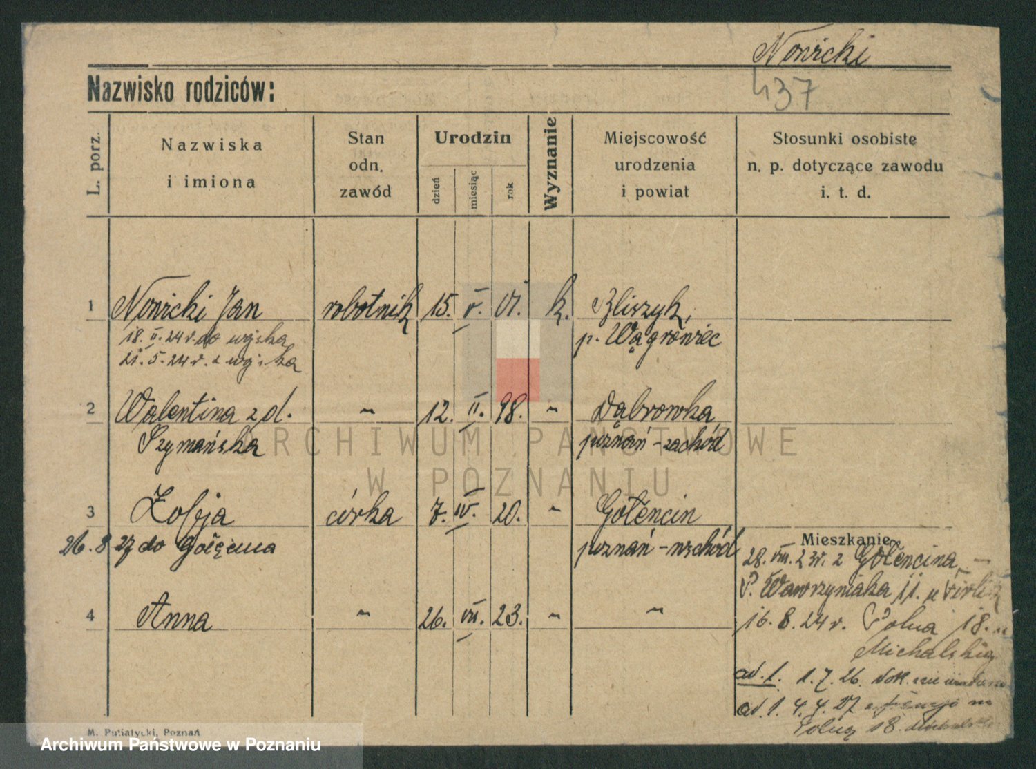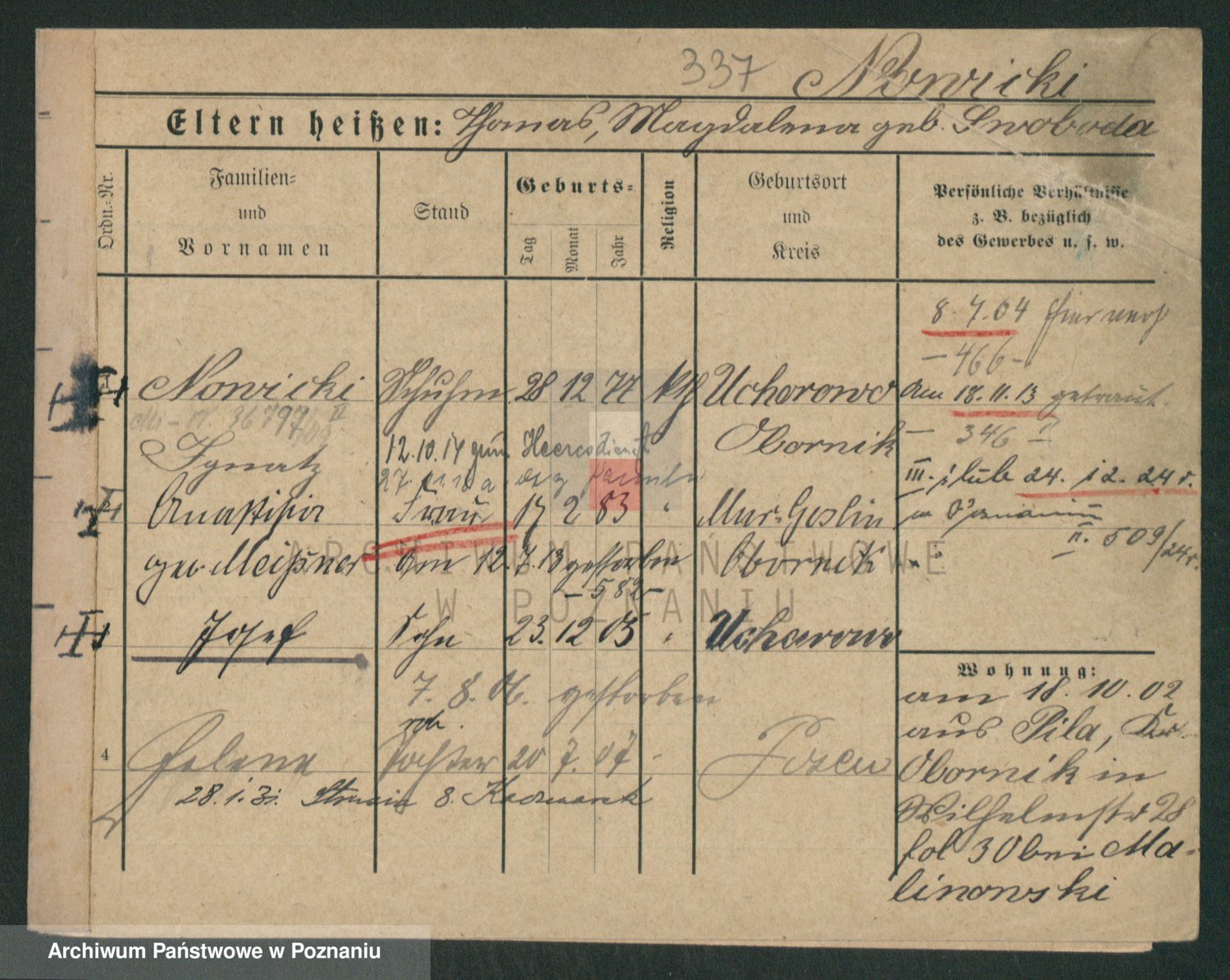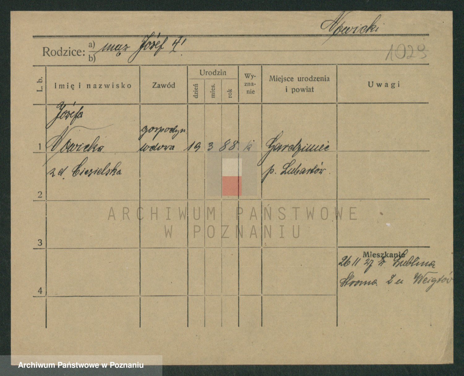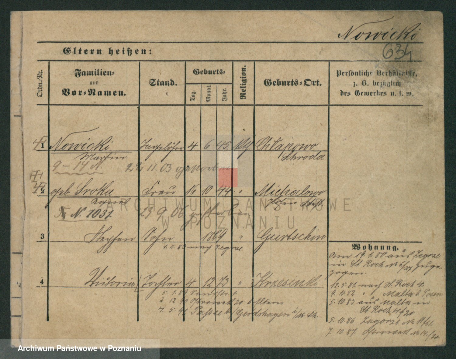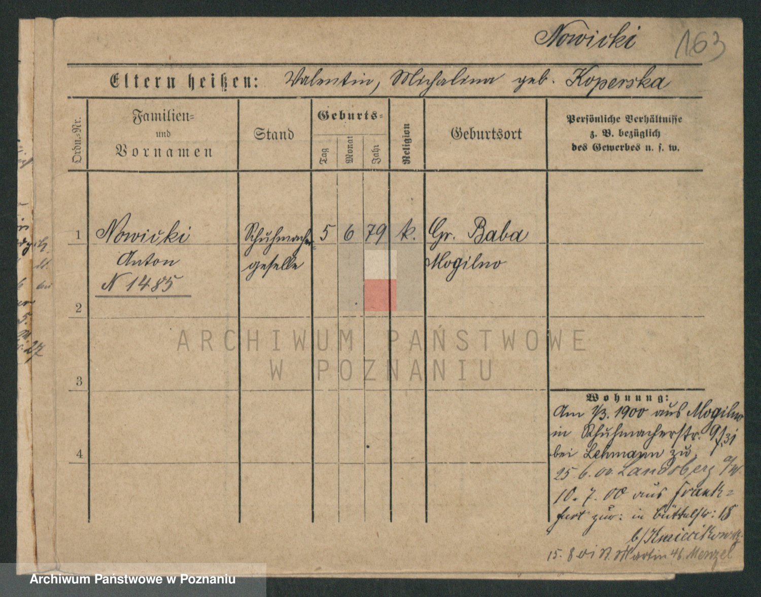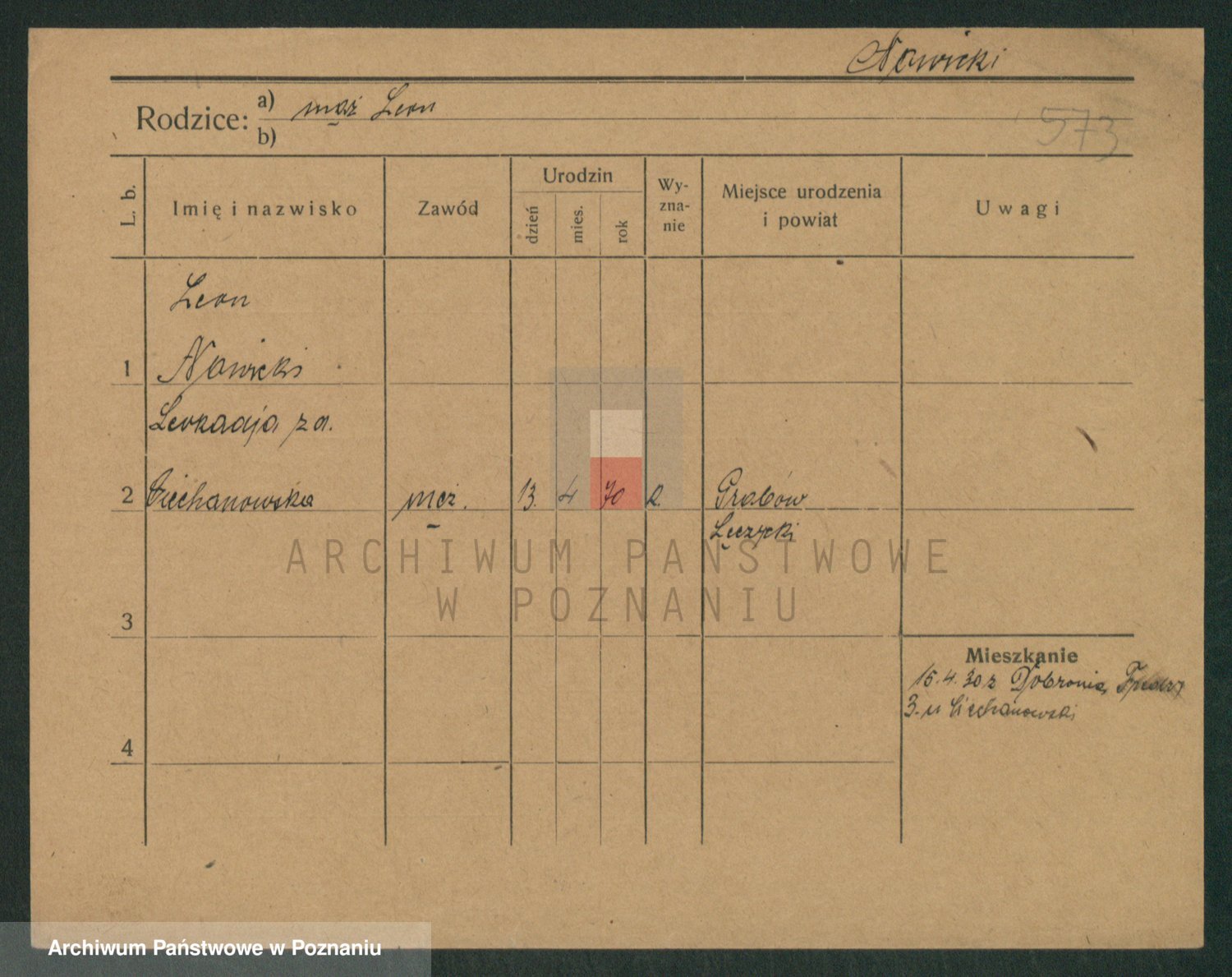 Podgląd karty osobowej dostępny jest po kliknięciu na nazwisko lub ikonkę karty. Można dokonywać powiększenia (ikony na górze) lub przechodzić między kolejnymi skanami (strzałki po bokach).