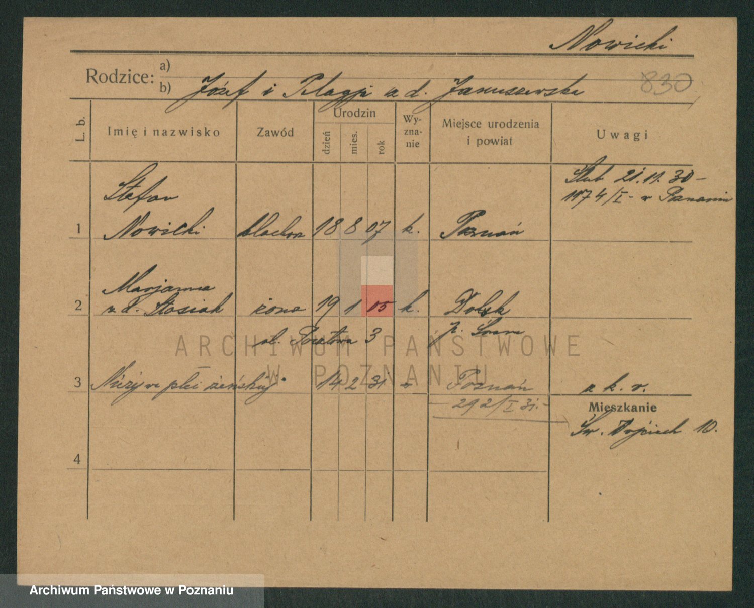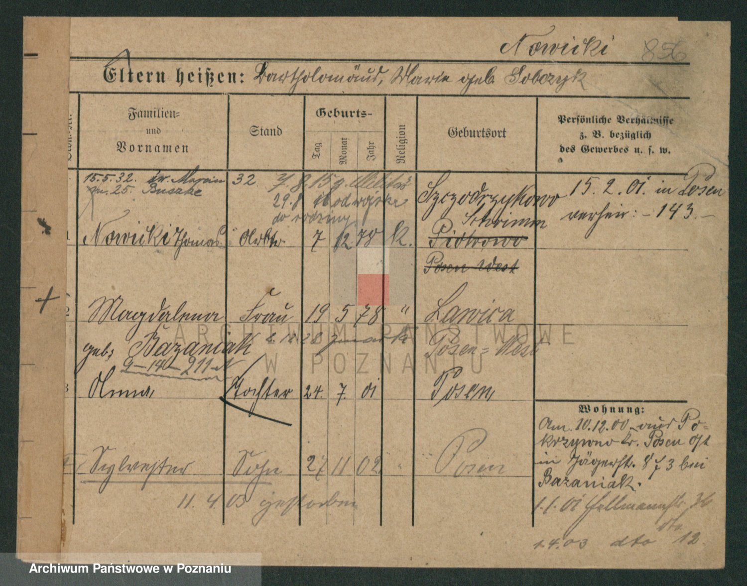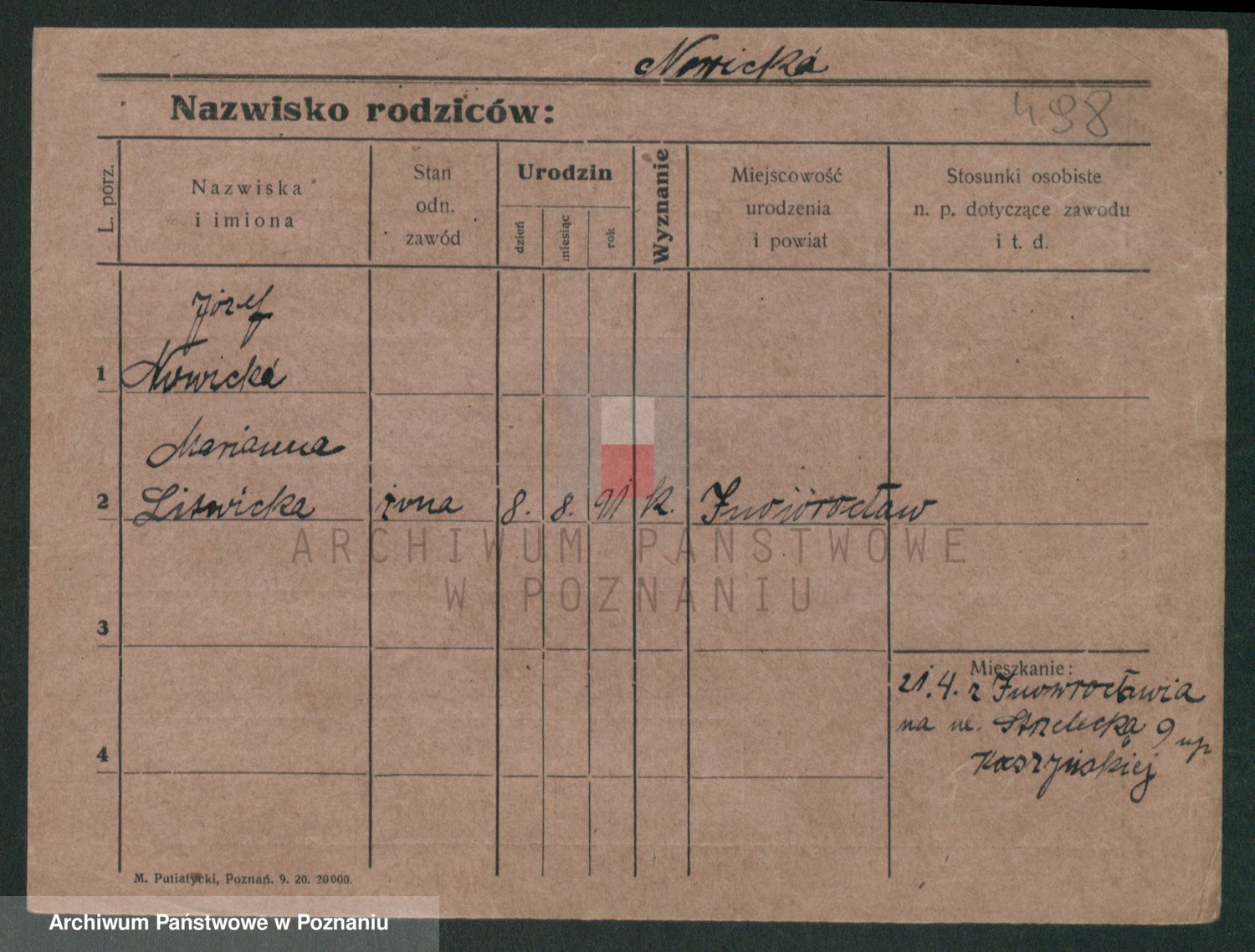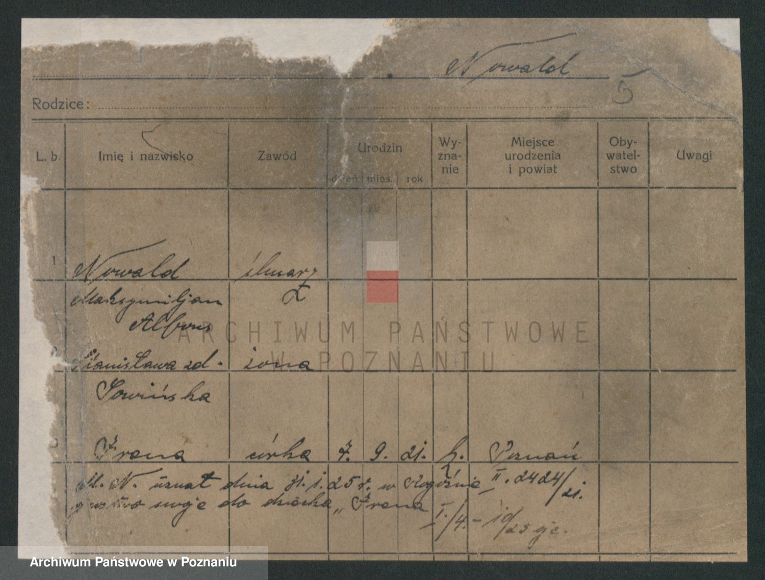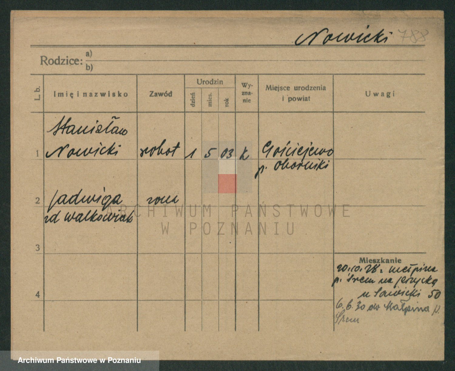 Podgląd karty osobowej dostępny jest po kliknięciu na nazwisko lub ikonkę karty. Można dokonywać powiększenia (ikony na górze) lub przechodzić między kolejnymi skanami (strzałki po bokach).