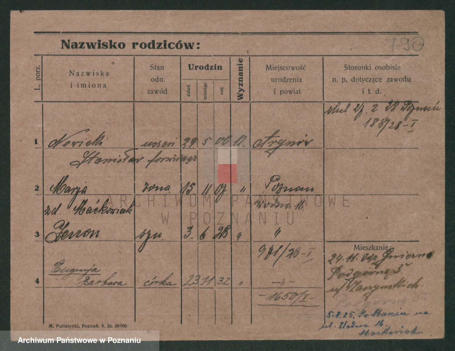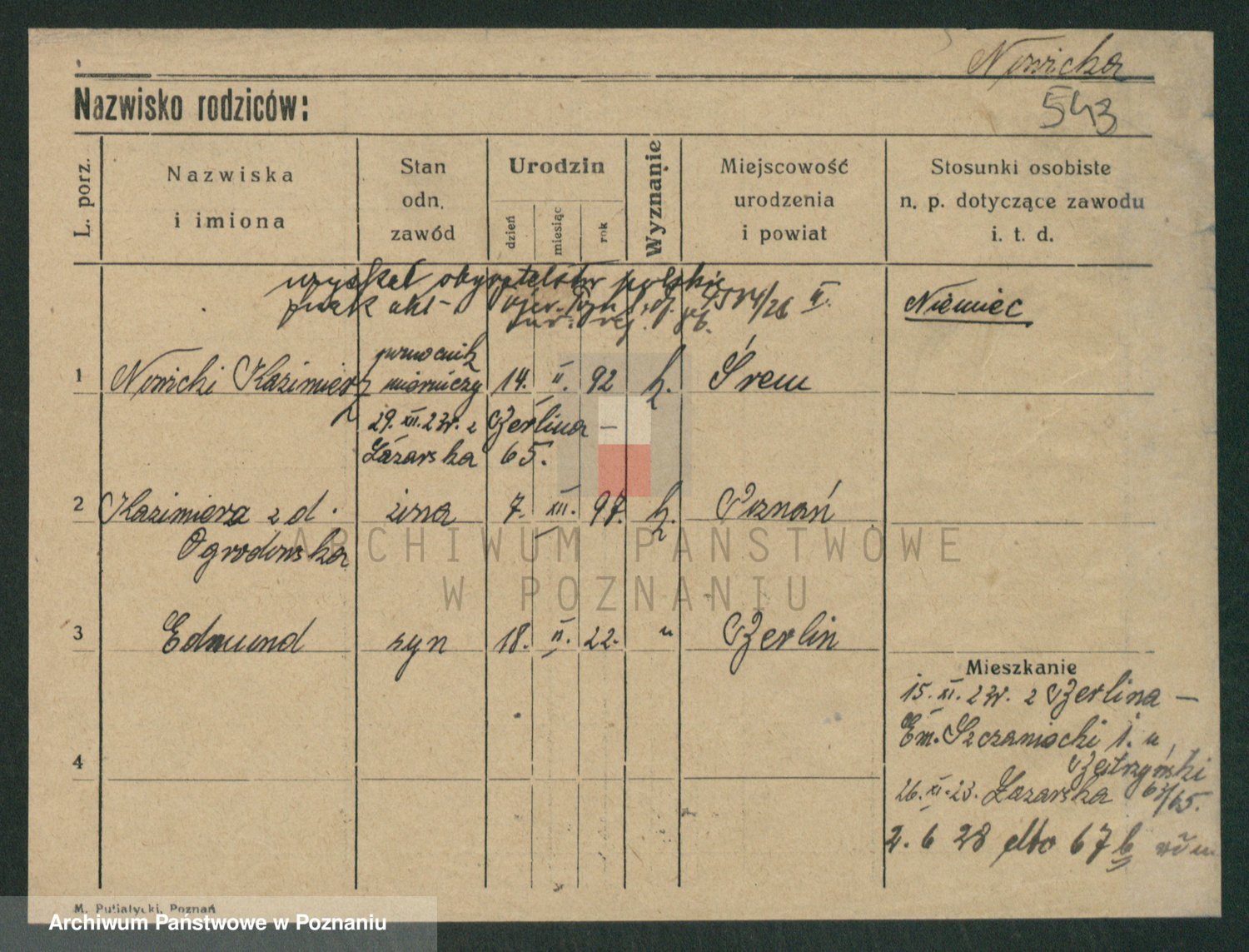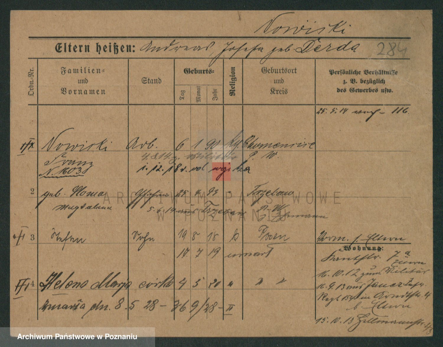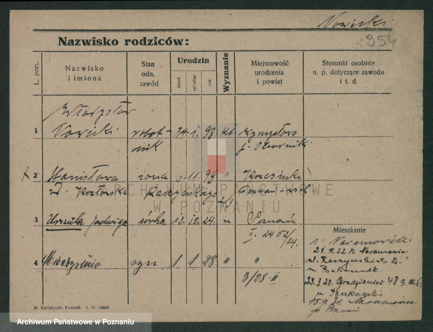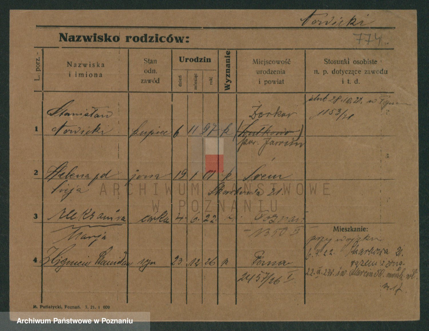 Podgląd karty osobowej dostępny jest po kliknięciu na nazwisko lub ikonkę karty. Można dokonywać powiększenia (ikony na górze) lub przechodzić między kolejnymi skanami (strzałki po bokach).