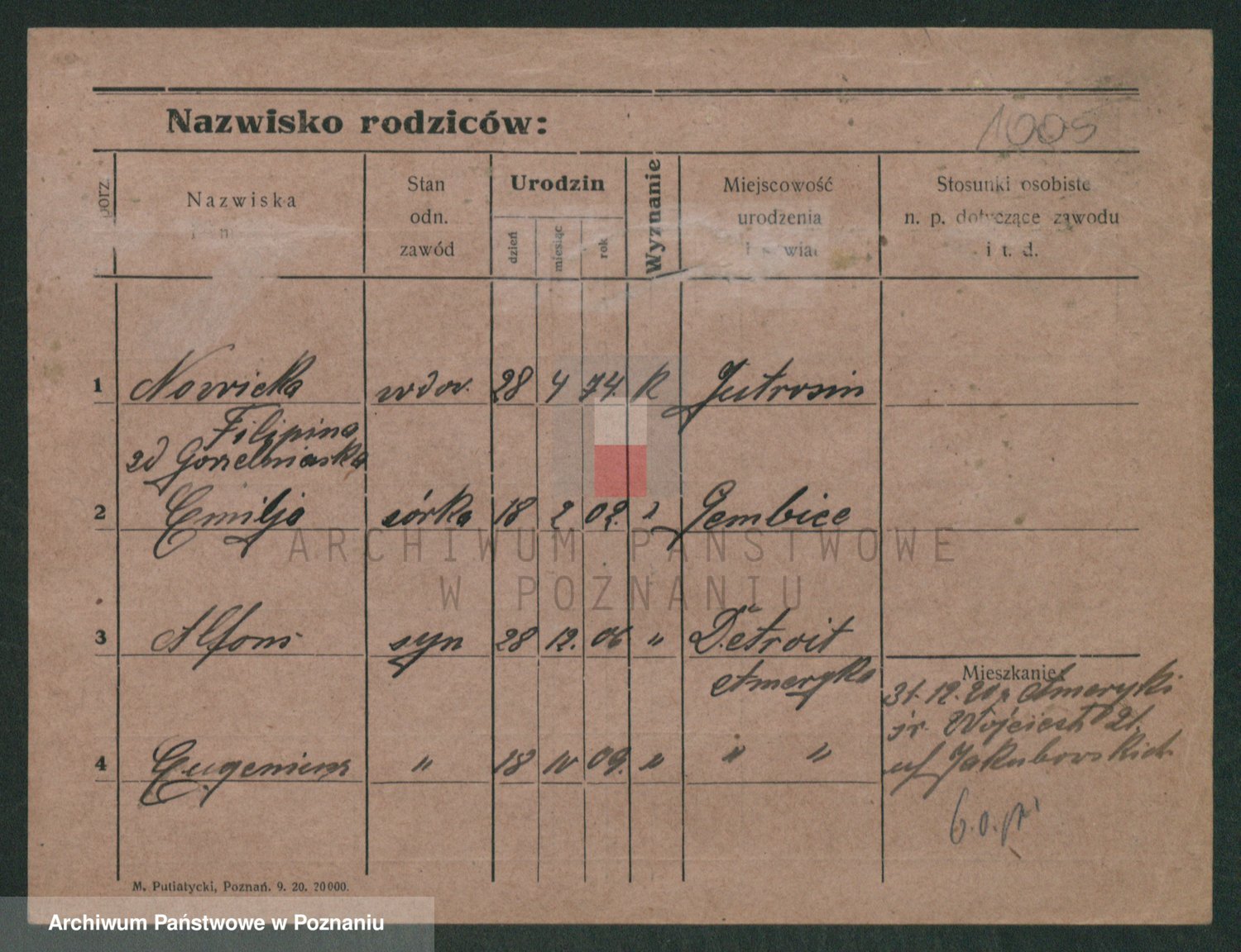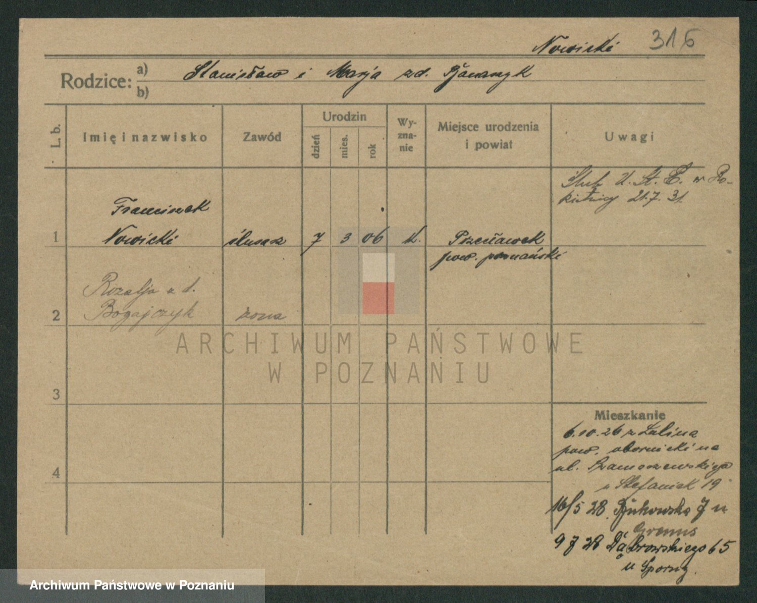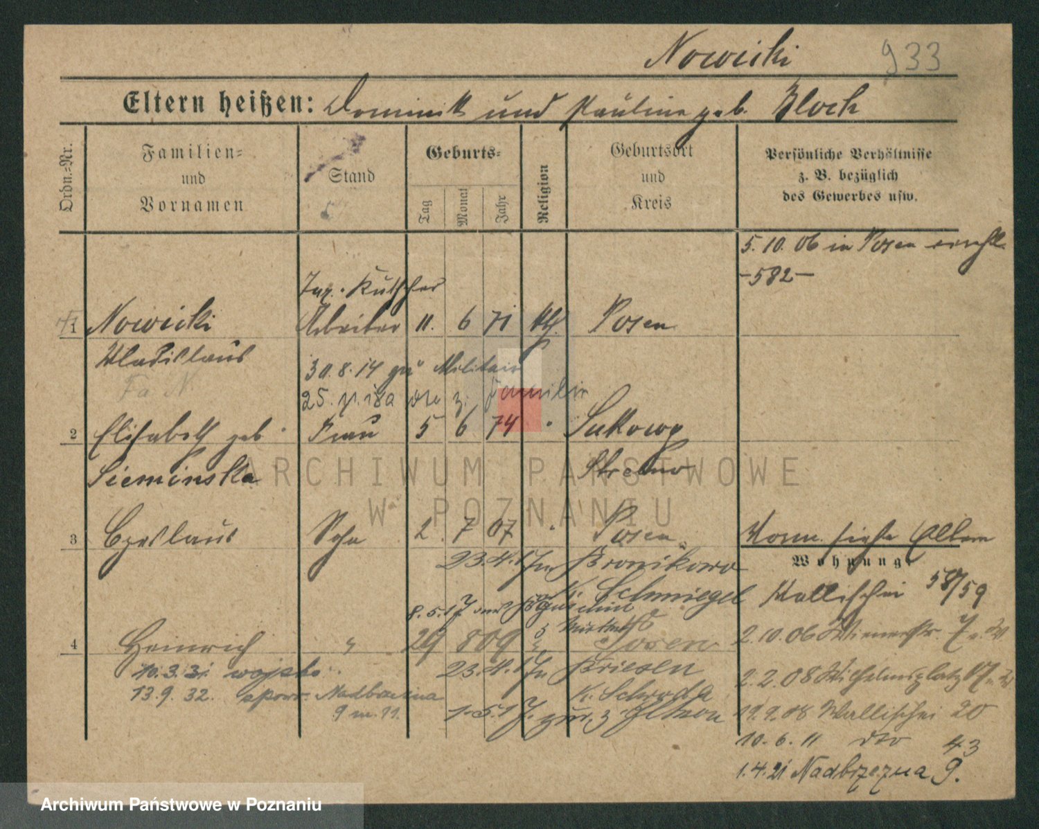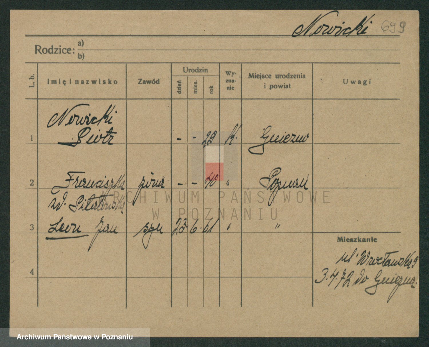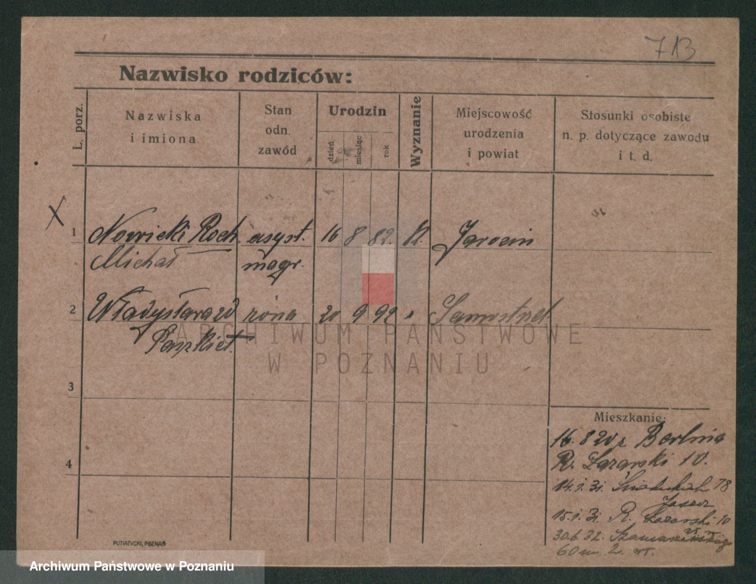 Podgląd karty osobowej dostępny jest po kliknięciu na nazwisko lub ikonkę karty. Można dokonywać powiększenia (ikony na górze) lub przechodzić między kolejnymi skanami (strzałki po bokach).