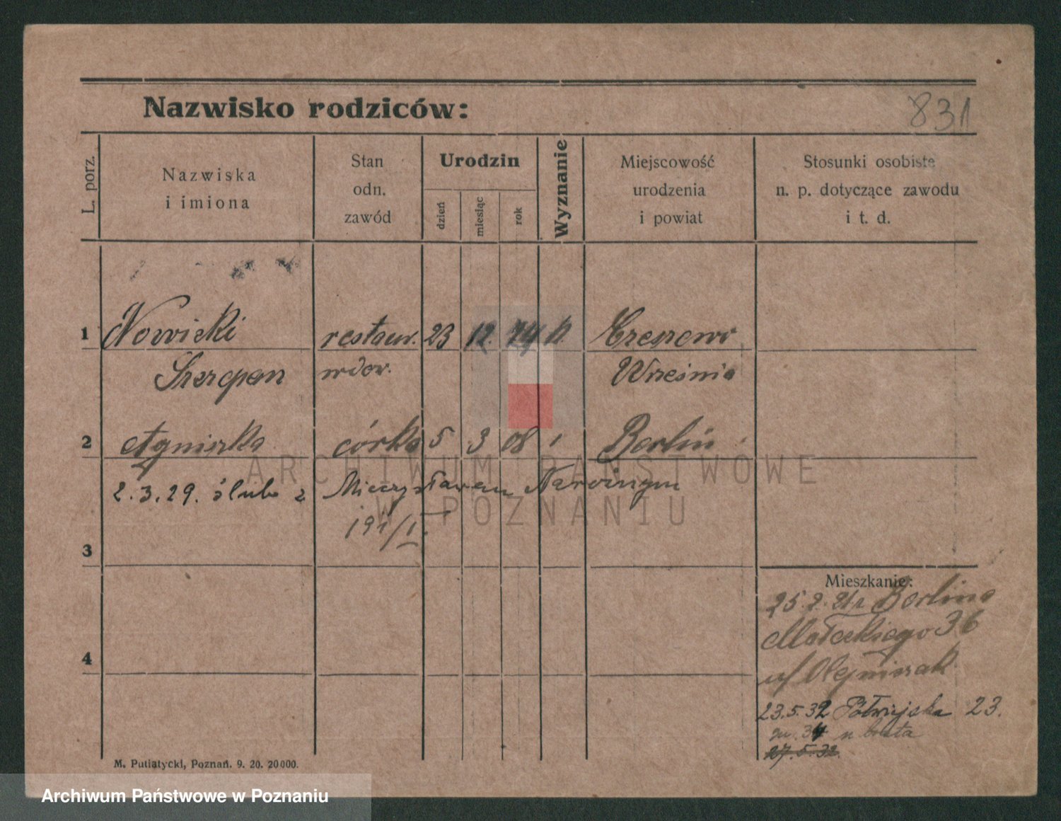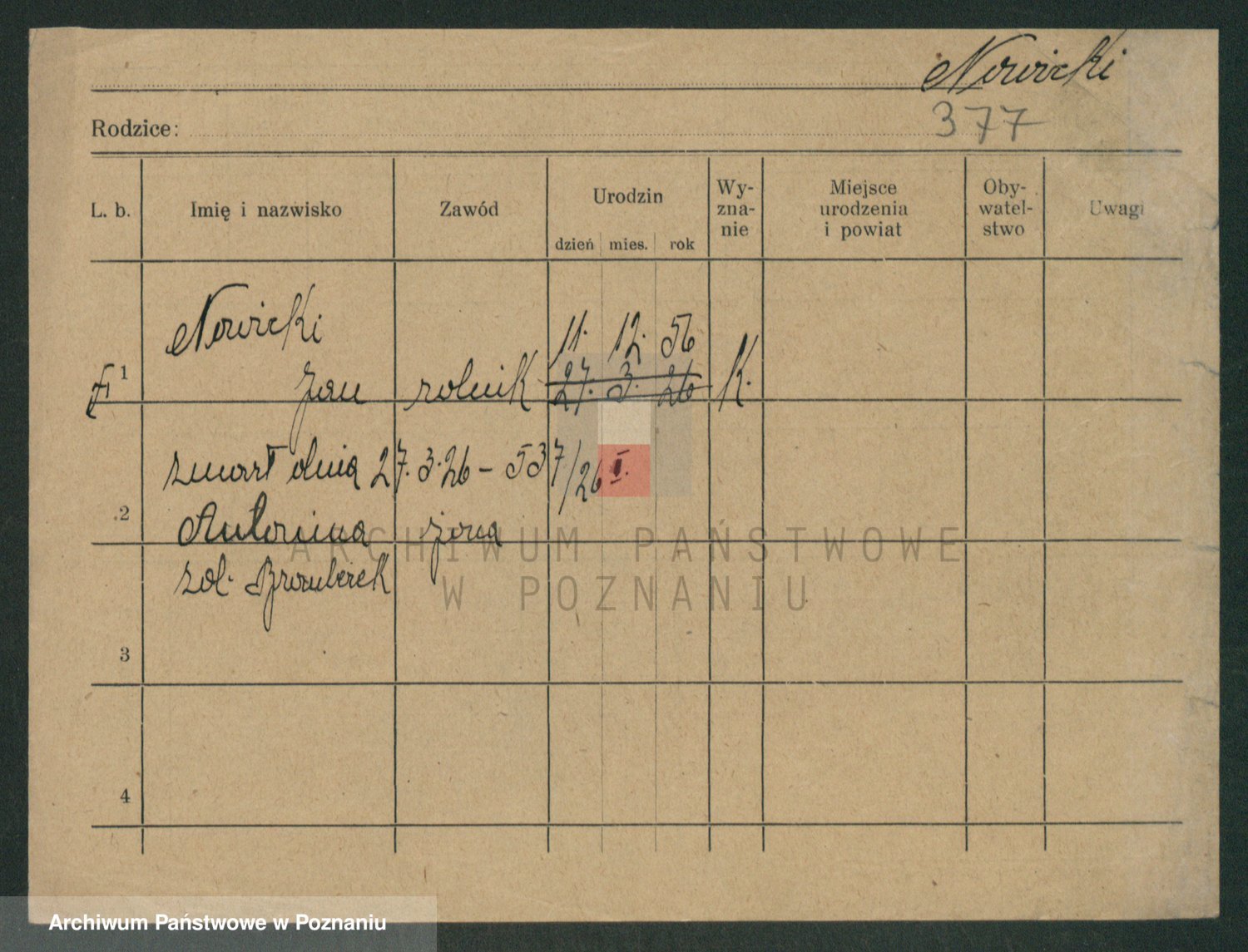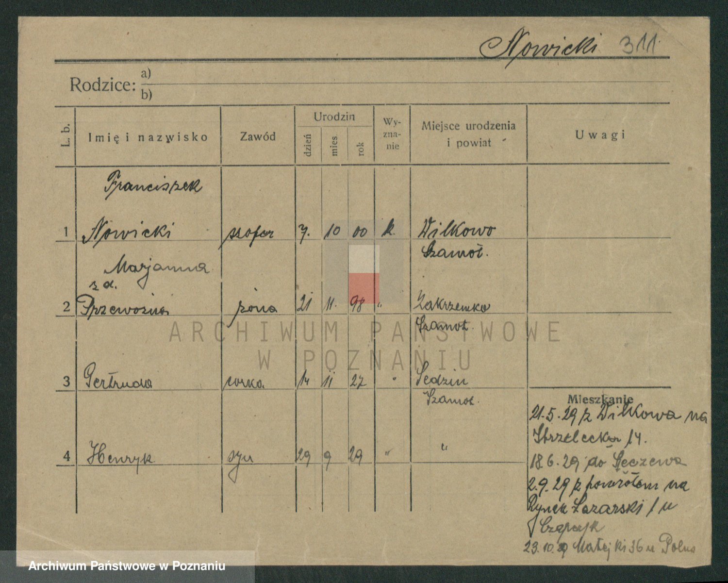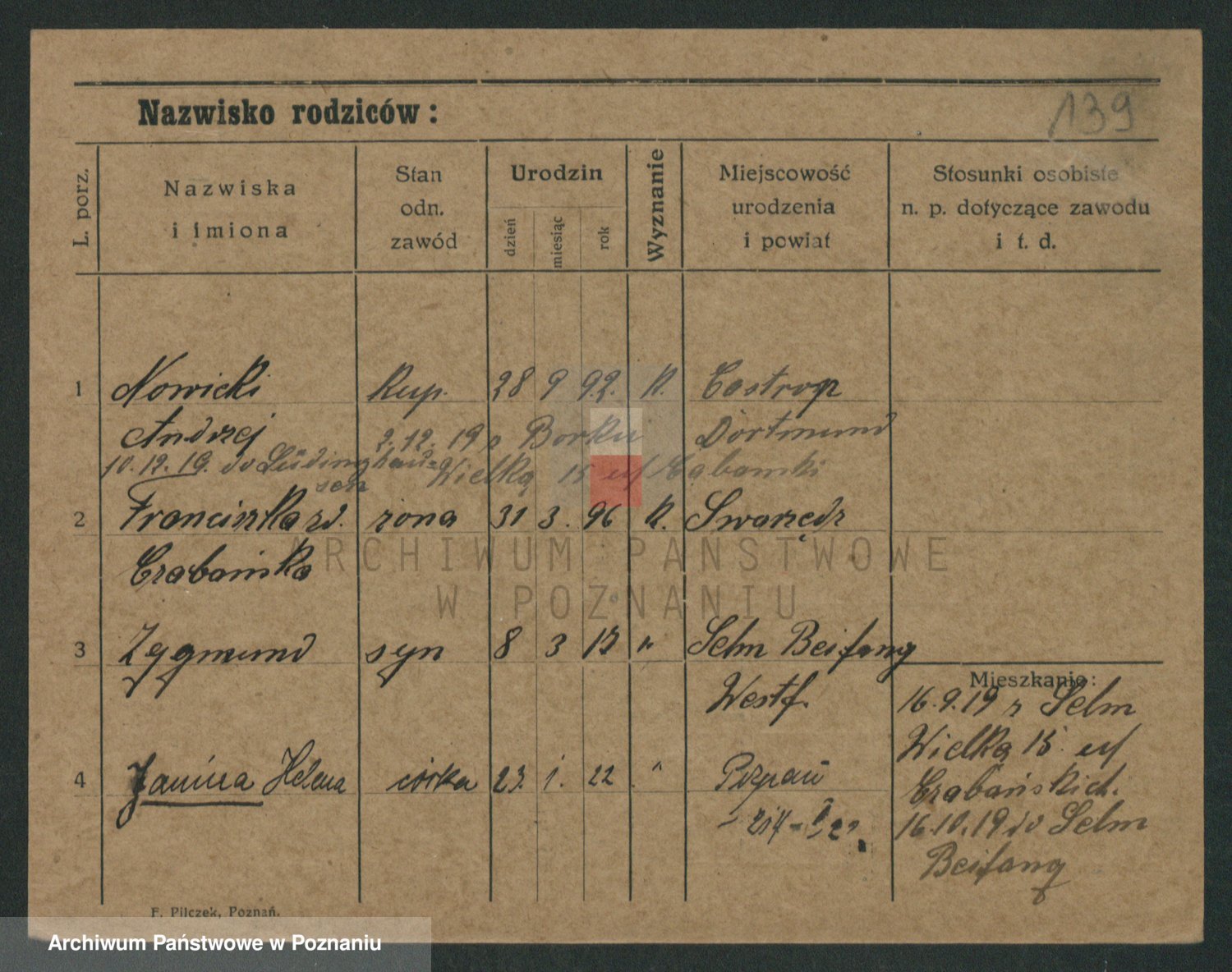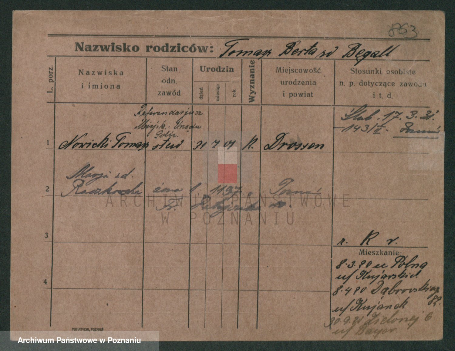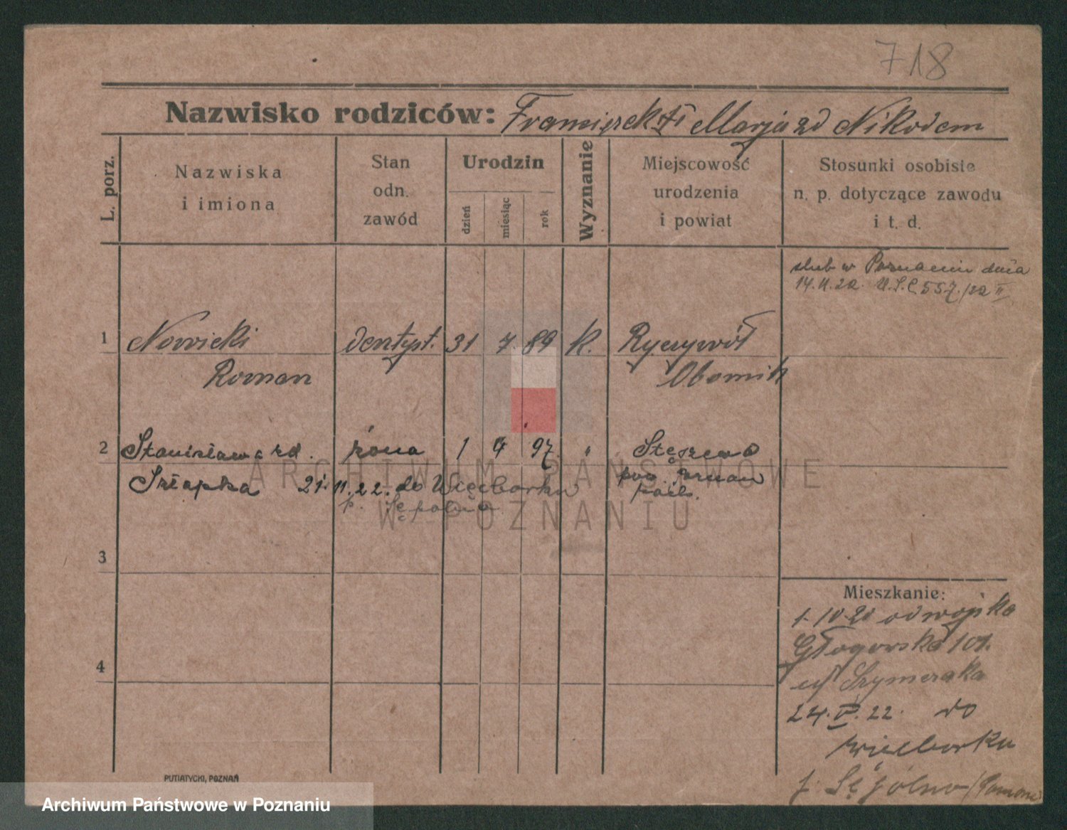Podgląd karty osobowej dostępny jest po kliknięciu na nazwisko lub ikonkę karty. Można dokonywać powiększenia (ikony na górze) lub przechodzić między kolejnymi skanami (strzałki po bokach).