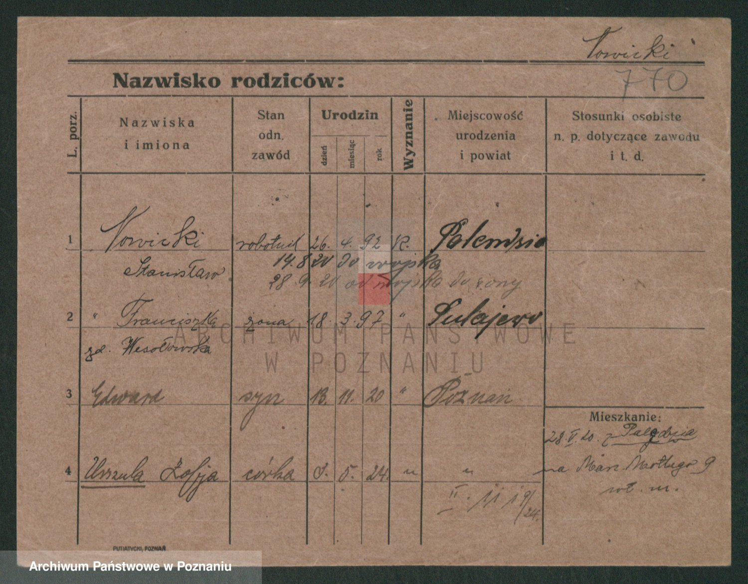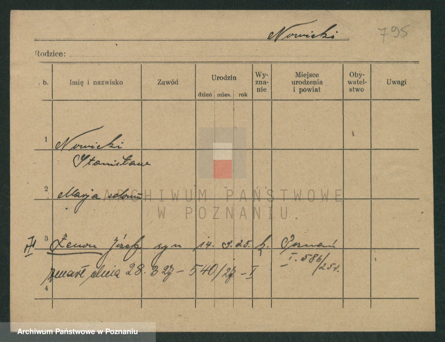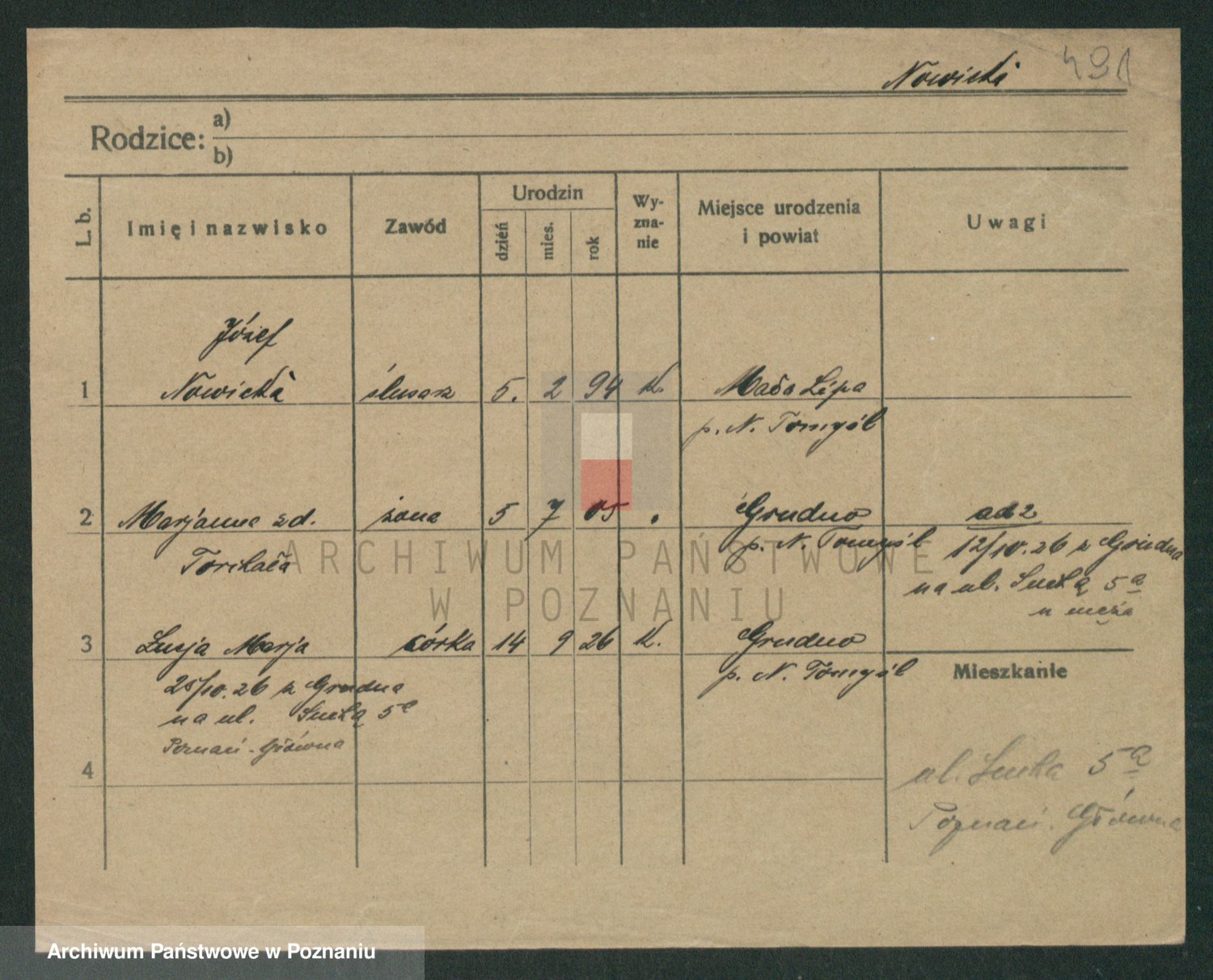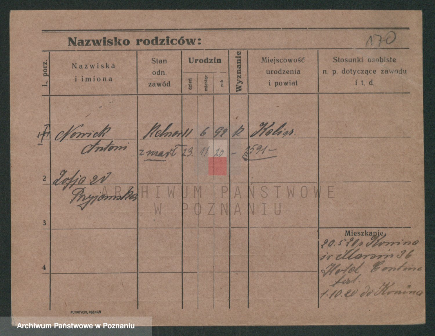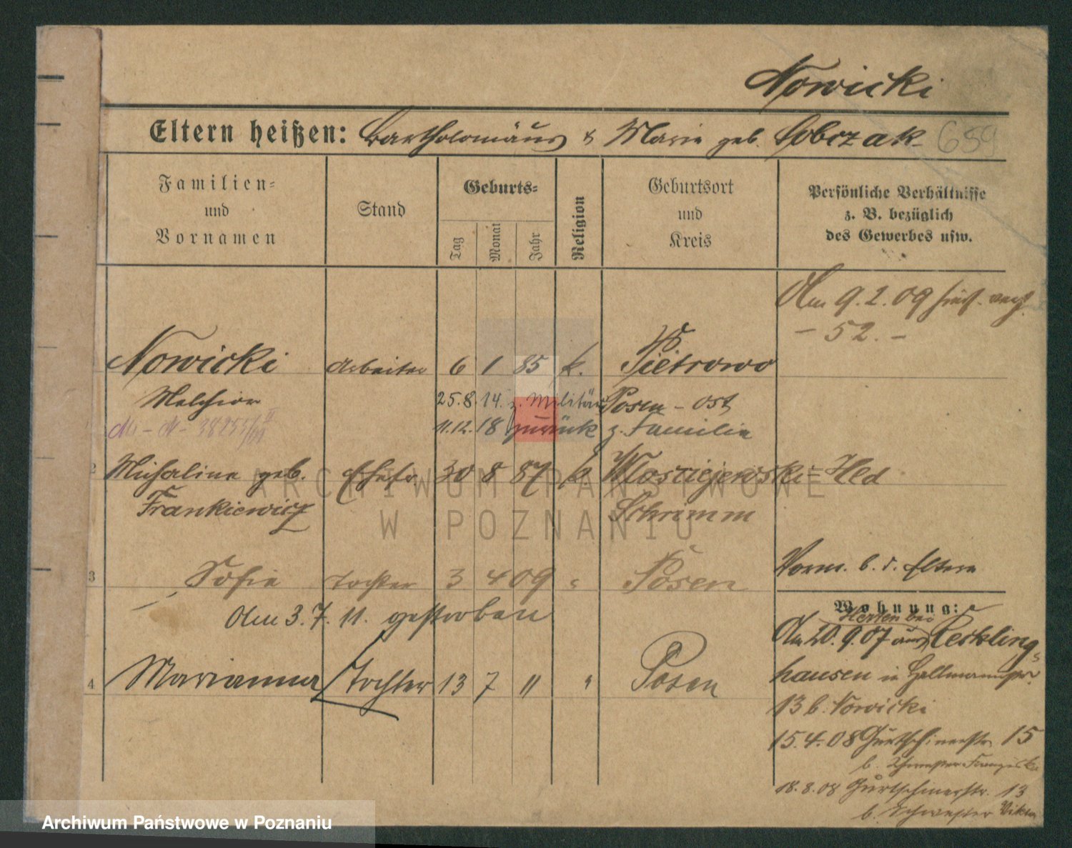 Podgląd karty osobowej dostępny jest po kliknięciu na nazwisko lub ikonkę karty. Można dokonywać powiększenia (ikony na górze) lub przechodzić między kolejnymi skanami (strzałki po bokach).