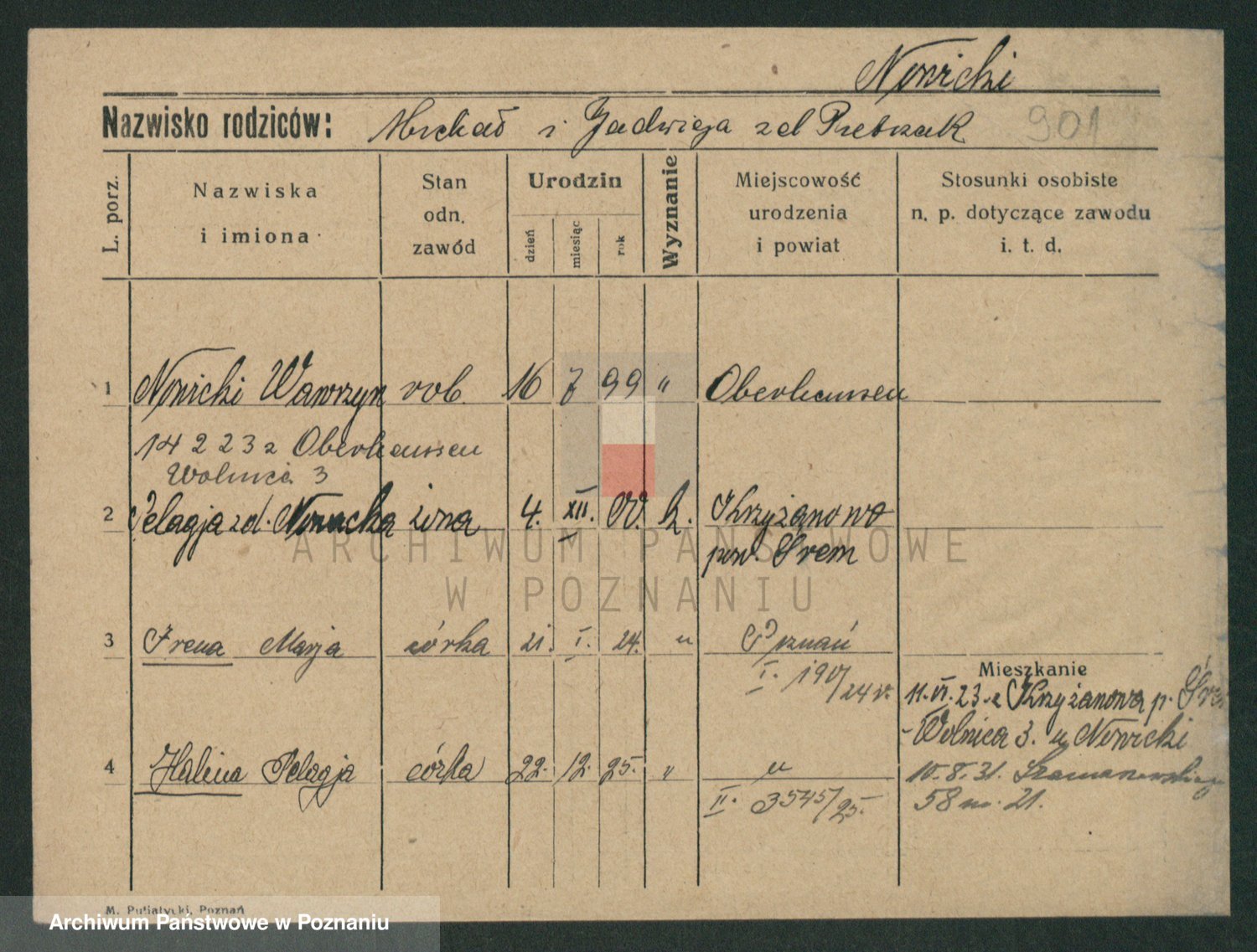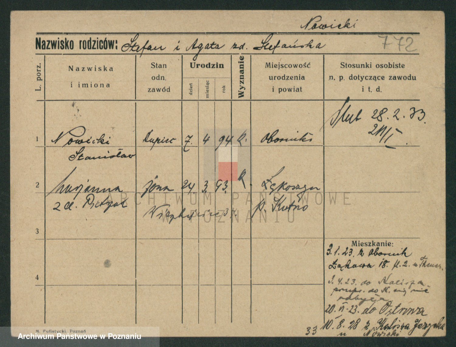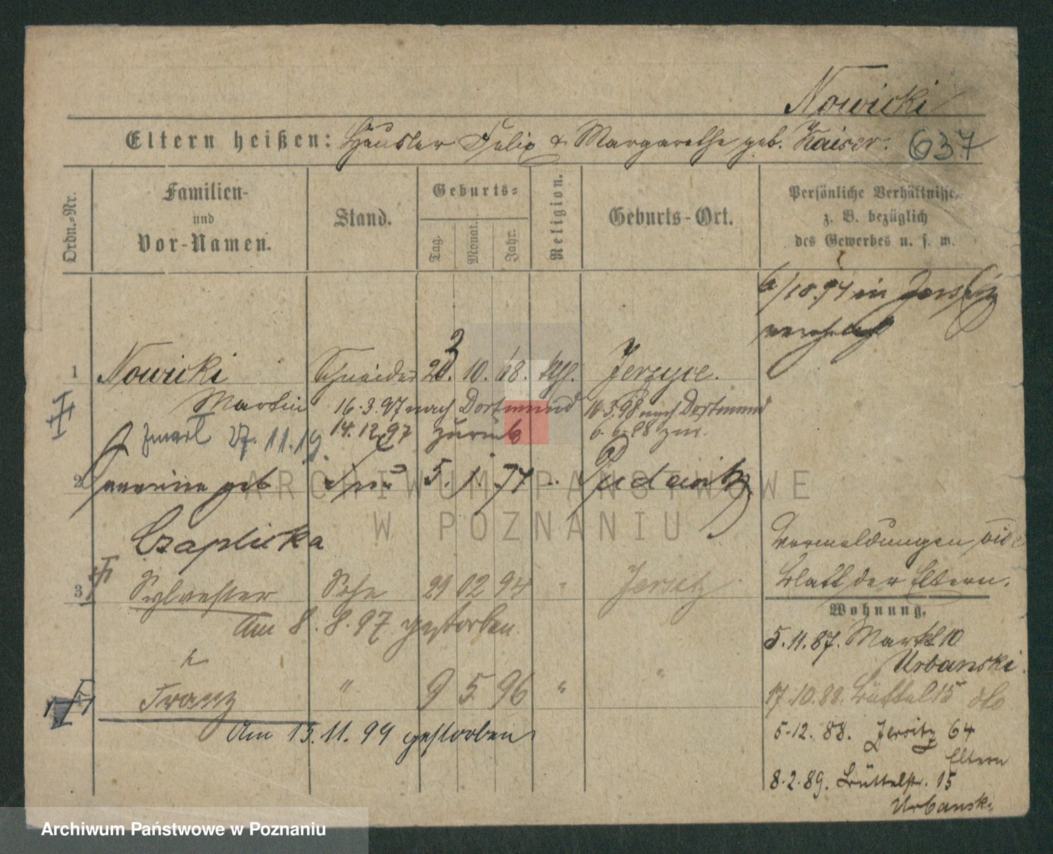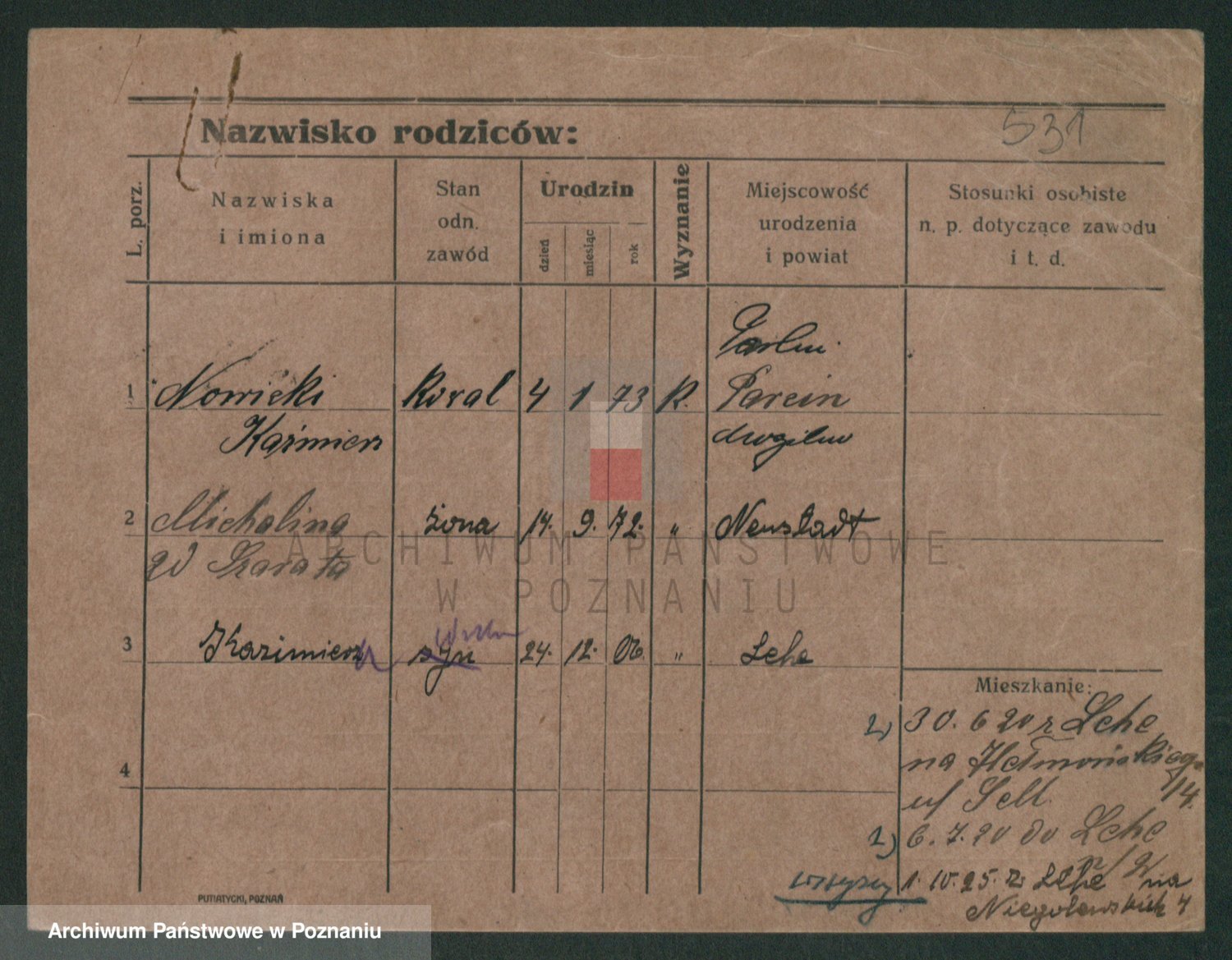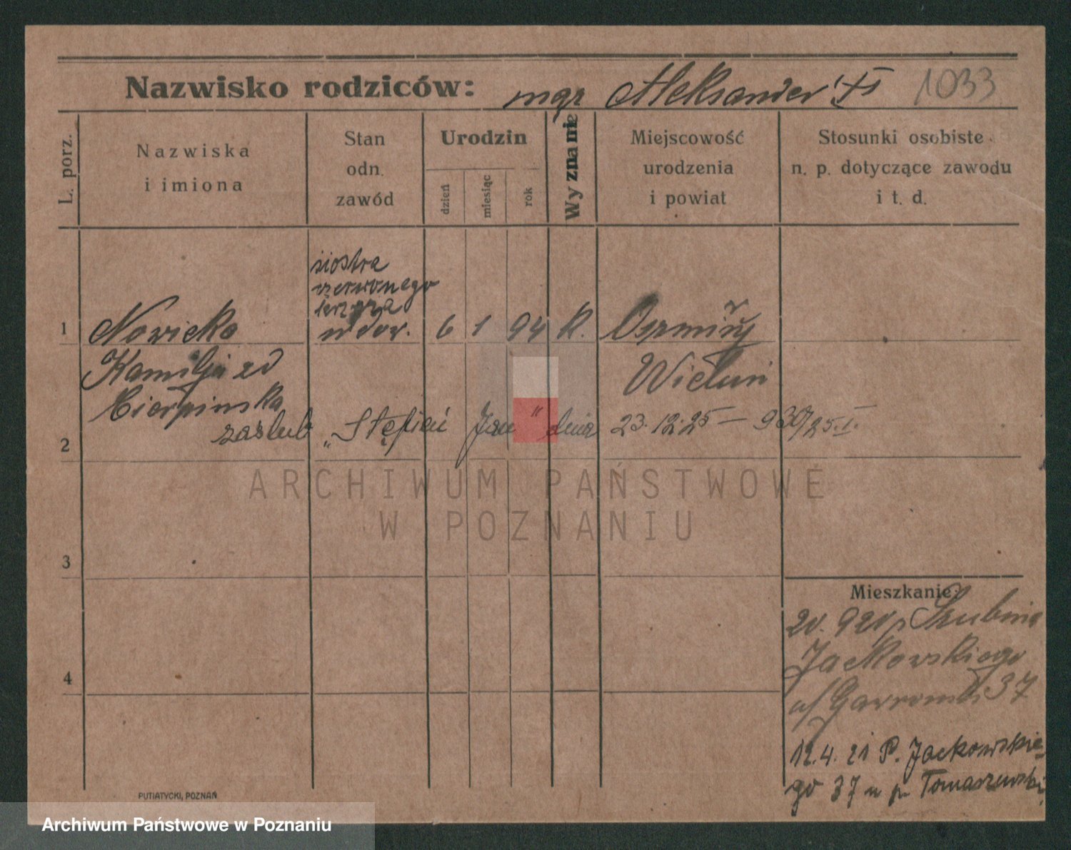 Podgląd karty osobowej dostępny jest po kliknięciu na nazwisko lub ikonkę karty. Można dokonywać powiększenia (ikony na górze) lub przechodzić między kolejnymi skanami (strzałki po bokach).