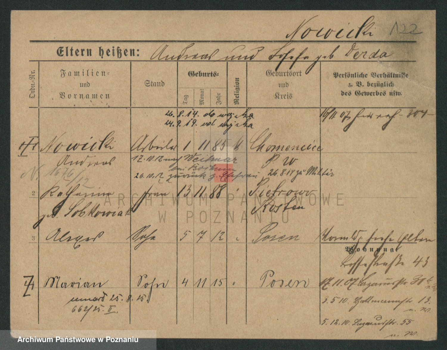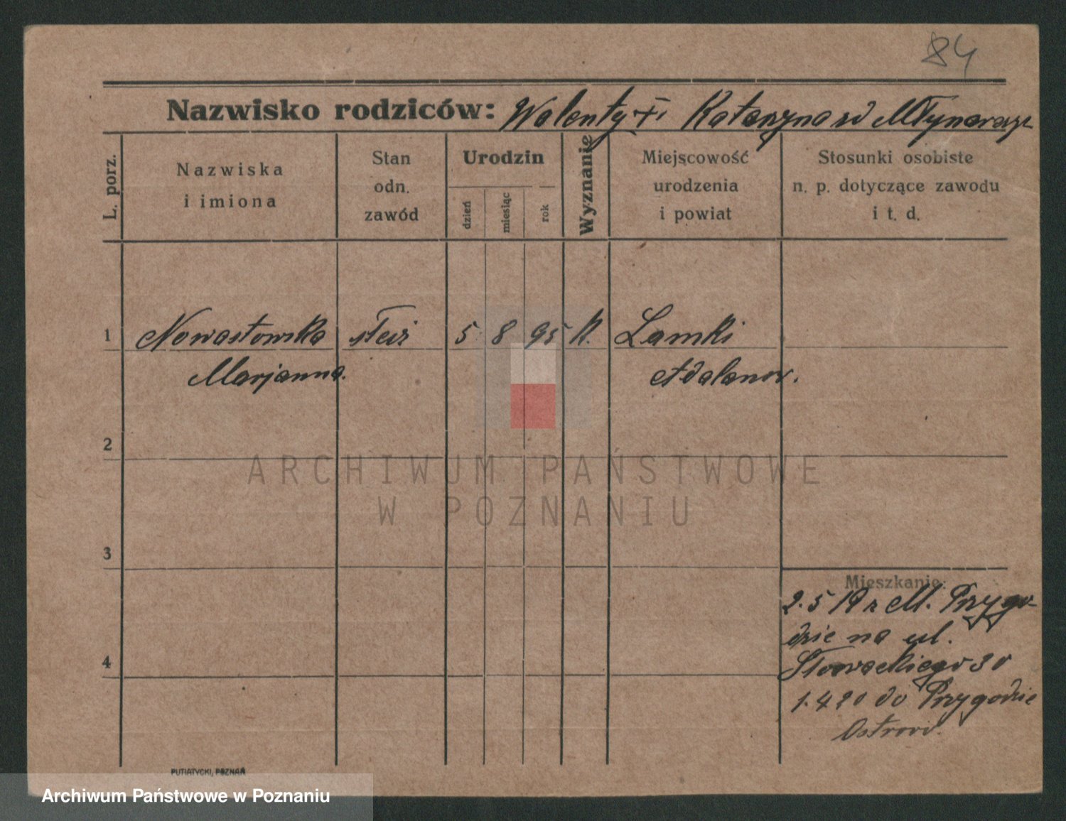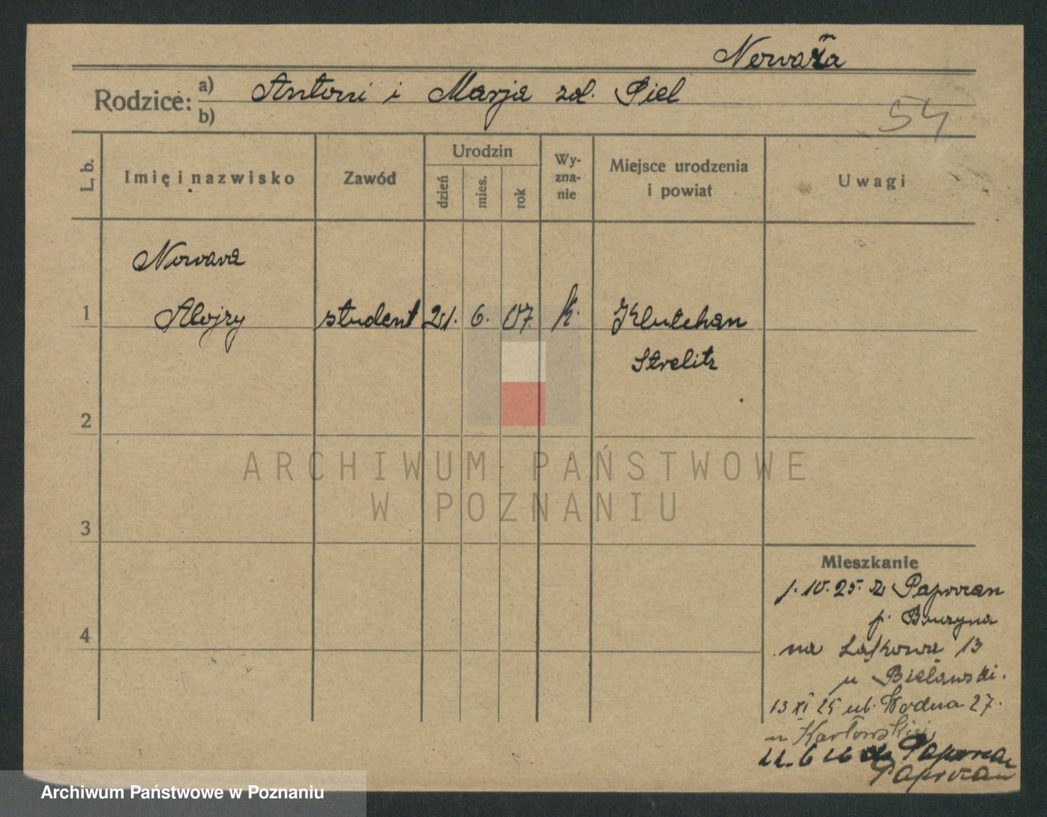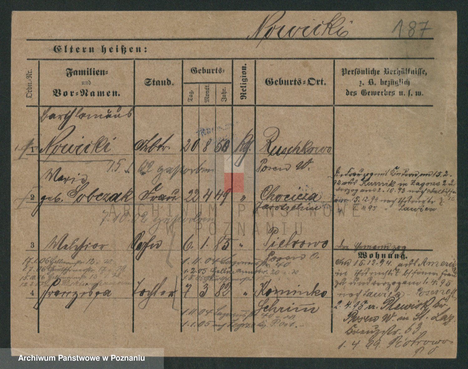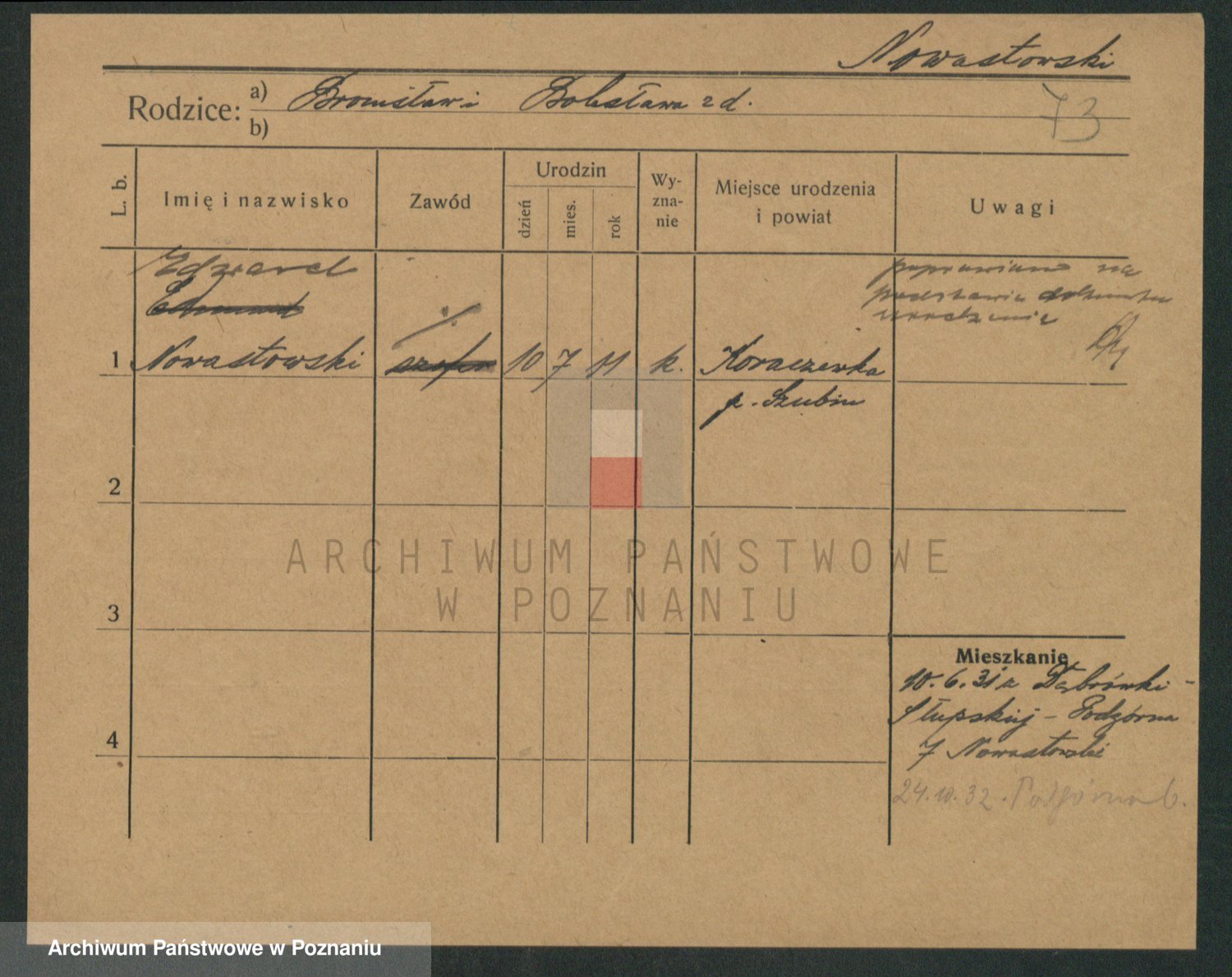 Podgląd karty osobowej dostępny jest po kliknięciu na nazwisko lub ikonkę karty. Można dokonywać powiększenia (ikony na górze) lub przechodzić między kolejnymi skanami (strzałki po bokach).
