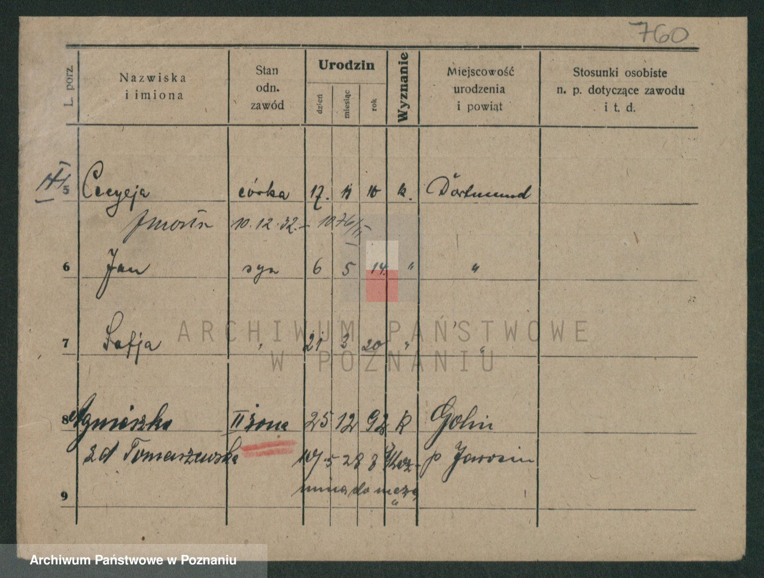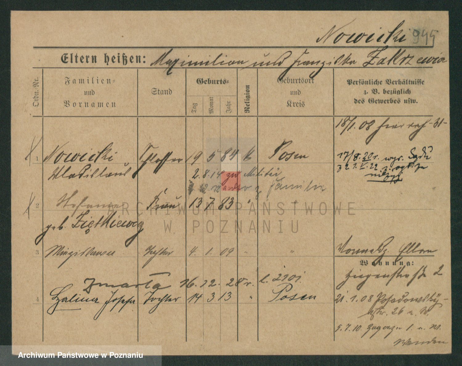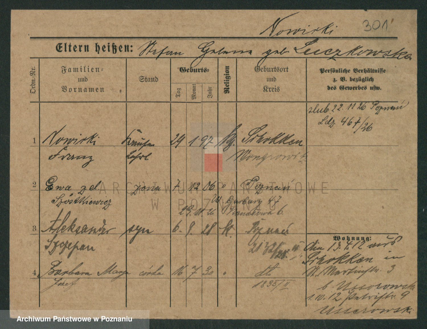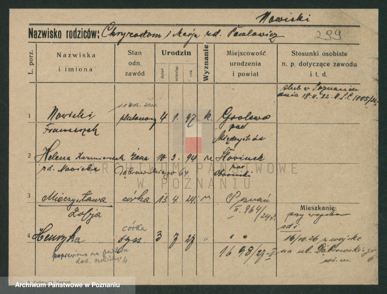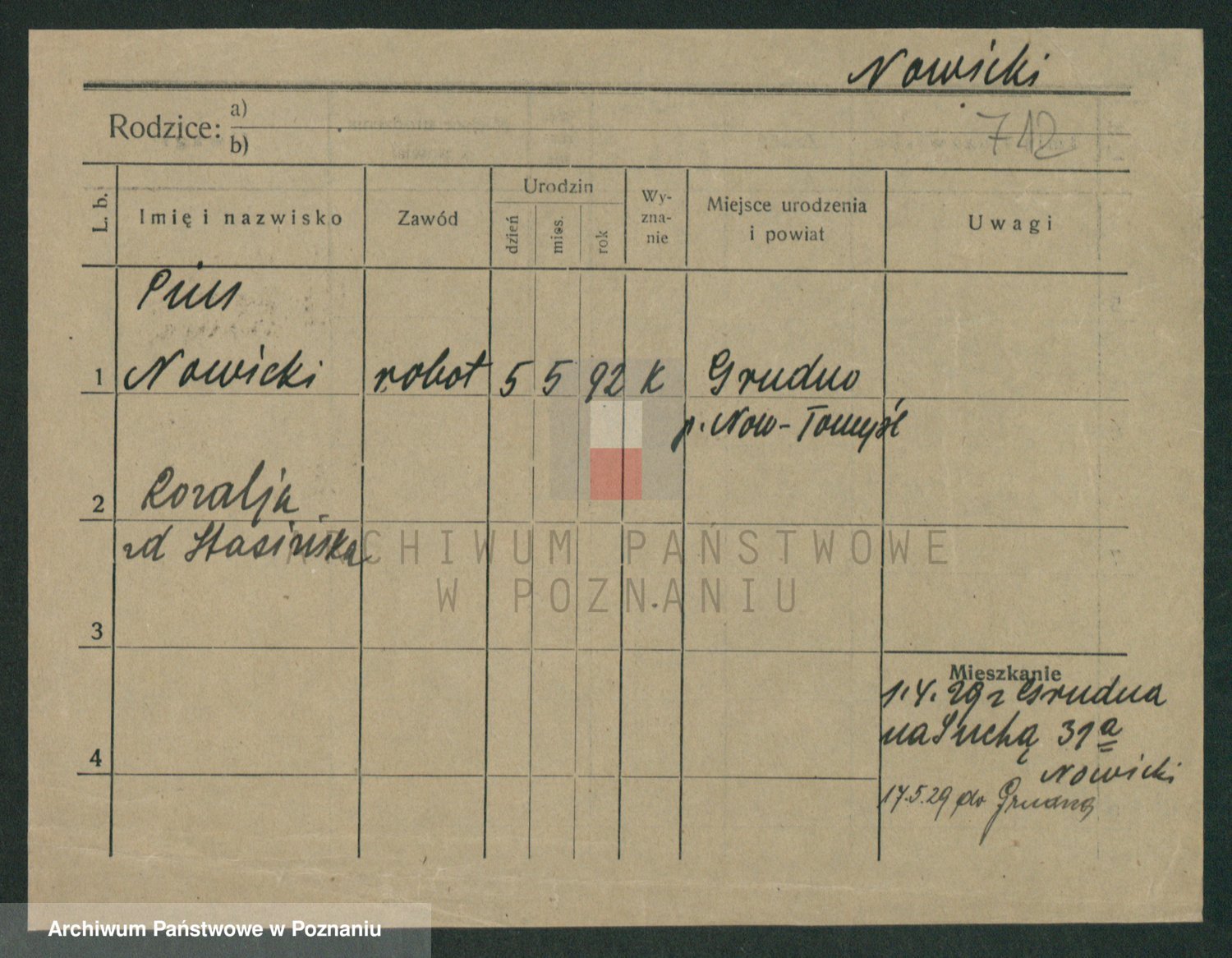 Podgląd karty osobowej dostępny jest po kliknięciu na nazwisko lub ikonkę karty. Można dokonywać powiększenia (ikony na górze) lub przechodzić między kolejnymi skanami (strzałki po bokach).