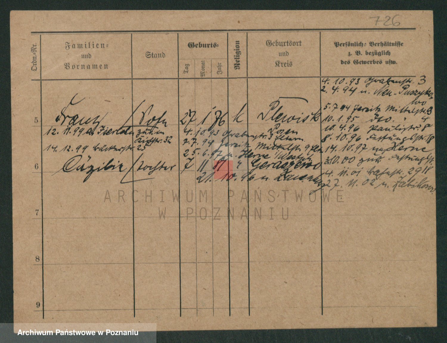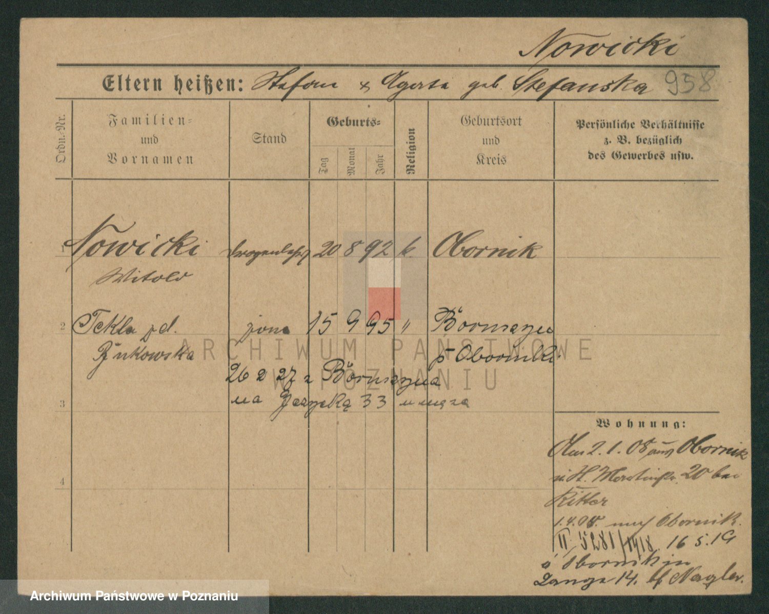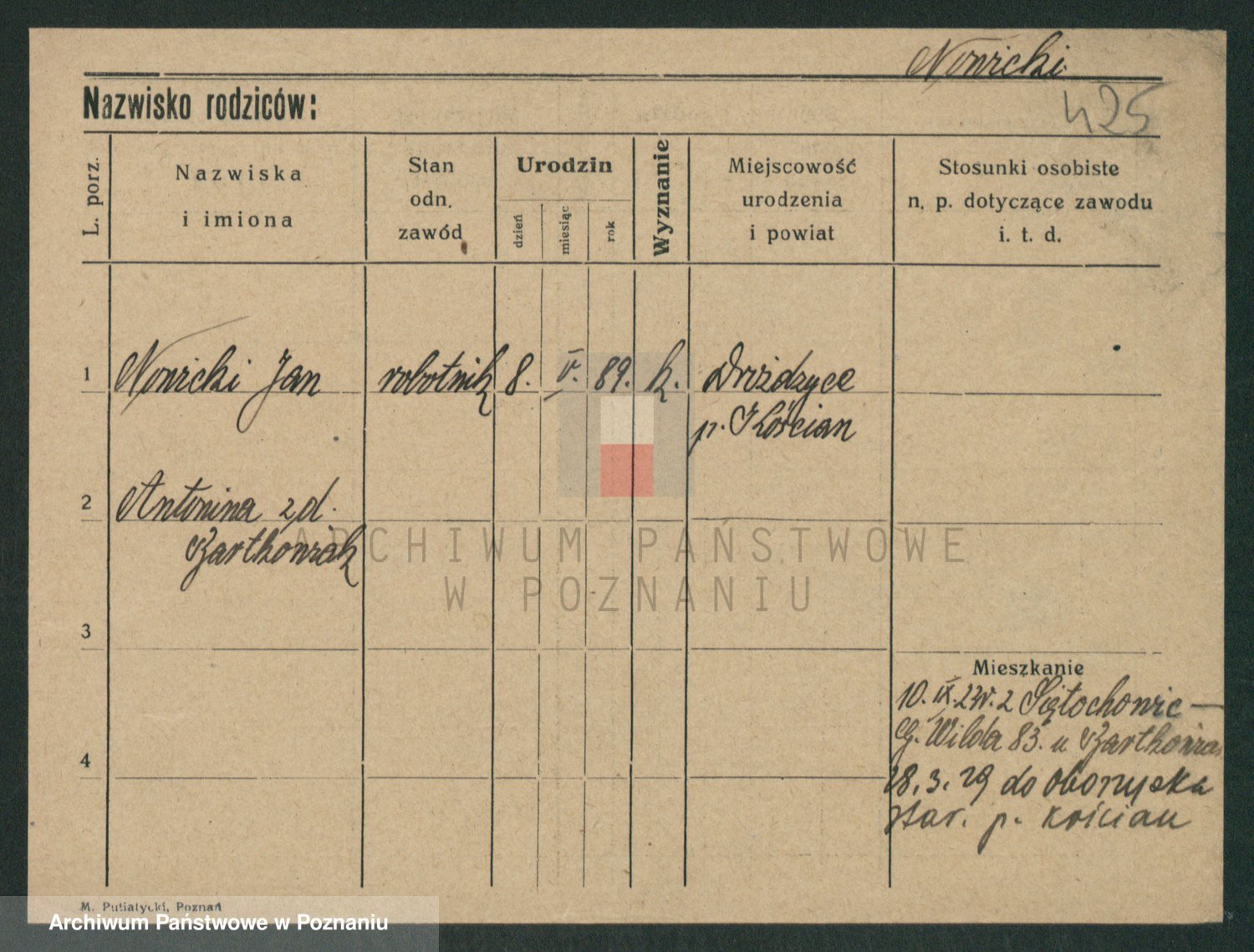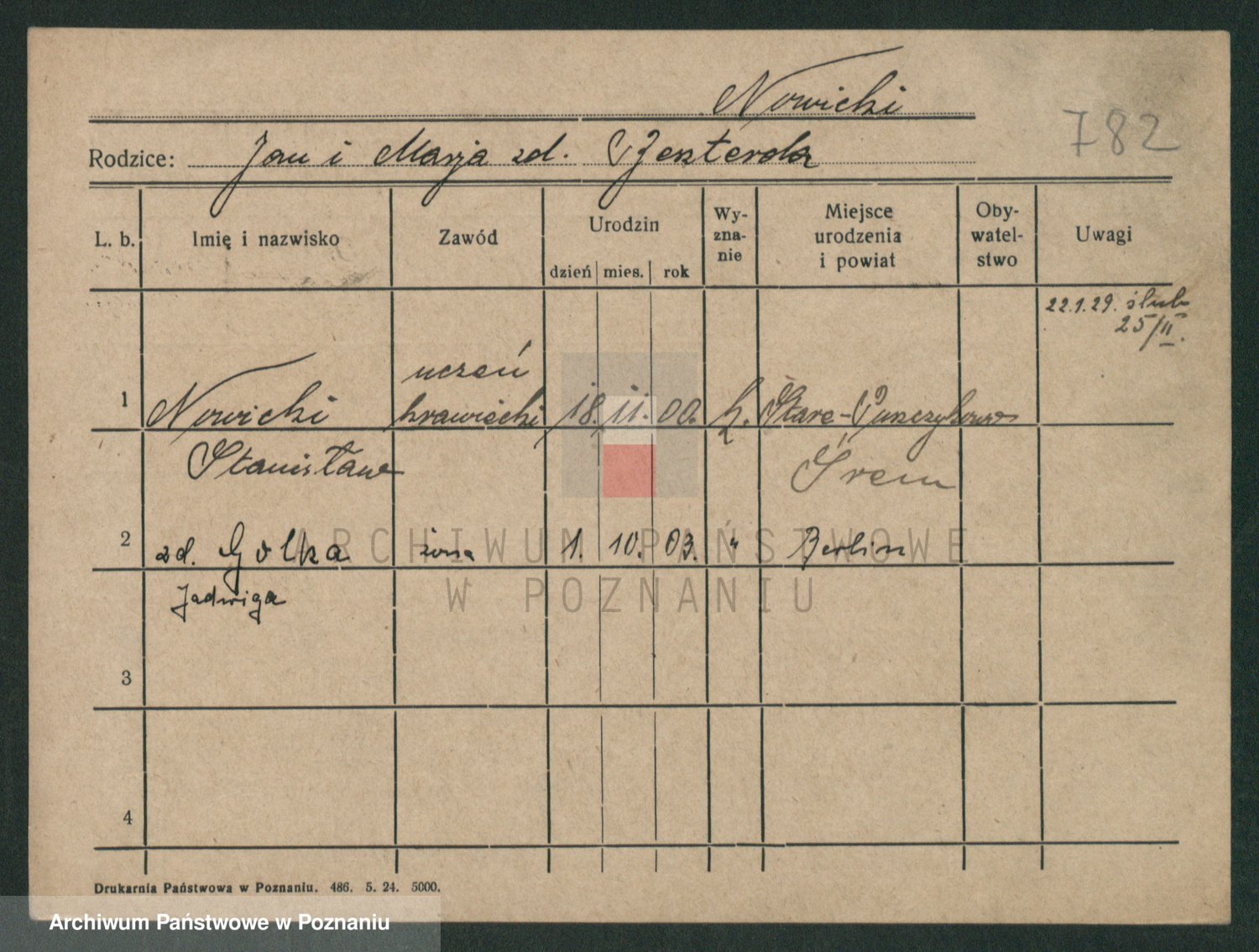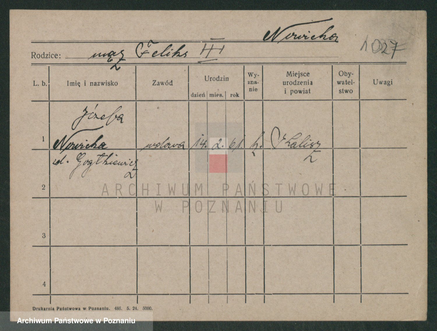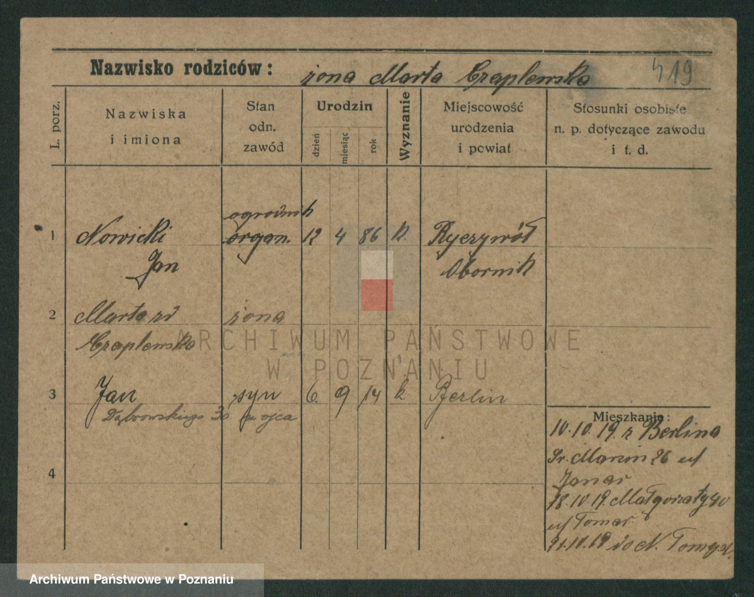 Podgląd karty osobowej dostępny jest po kliknięciu na nazwisko lub ikonkę karty. Można dokonywać powiększenia (ikony na górze) lub przechodzić między kolejnymi skanami (strzałki po bokach).