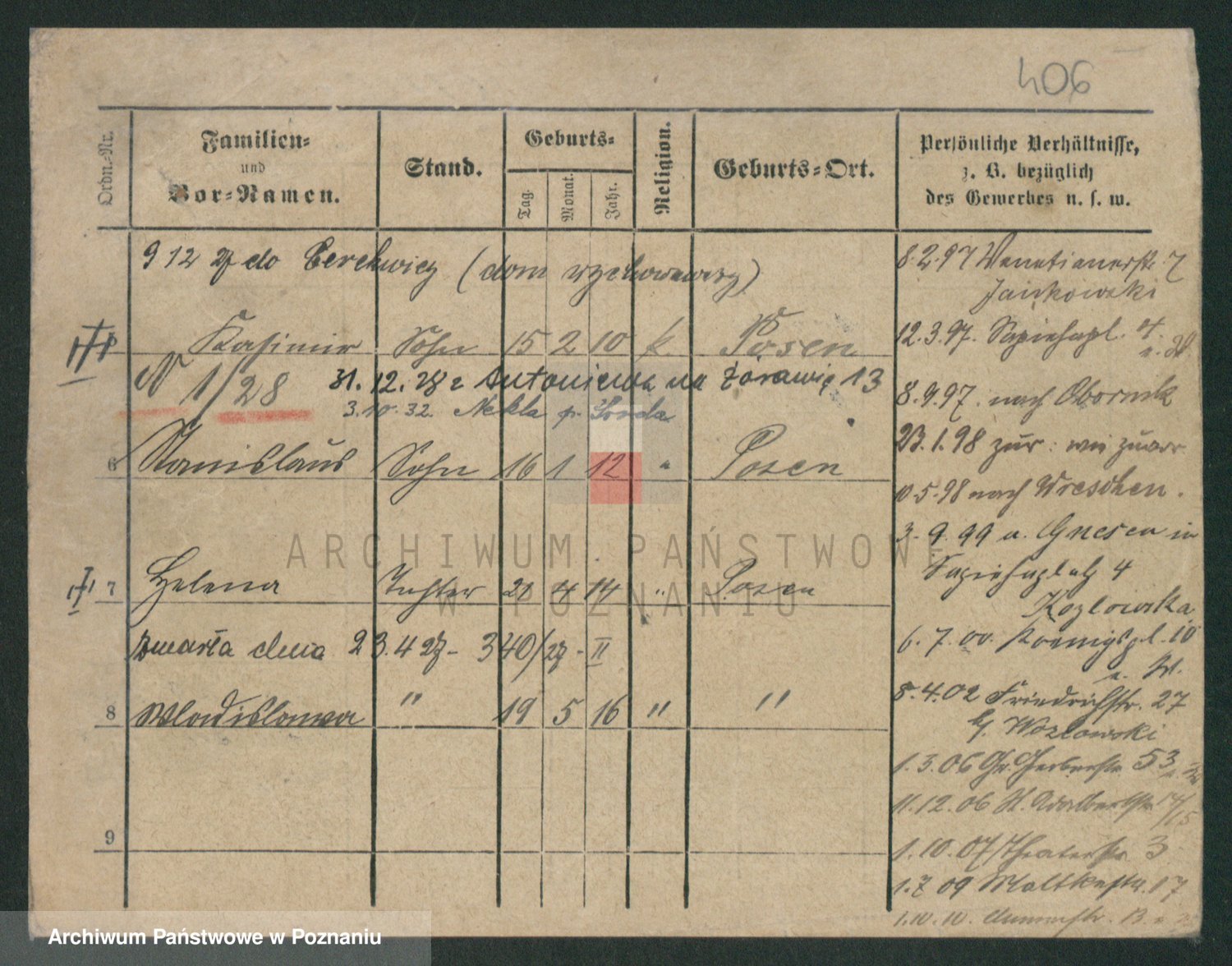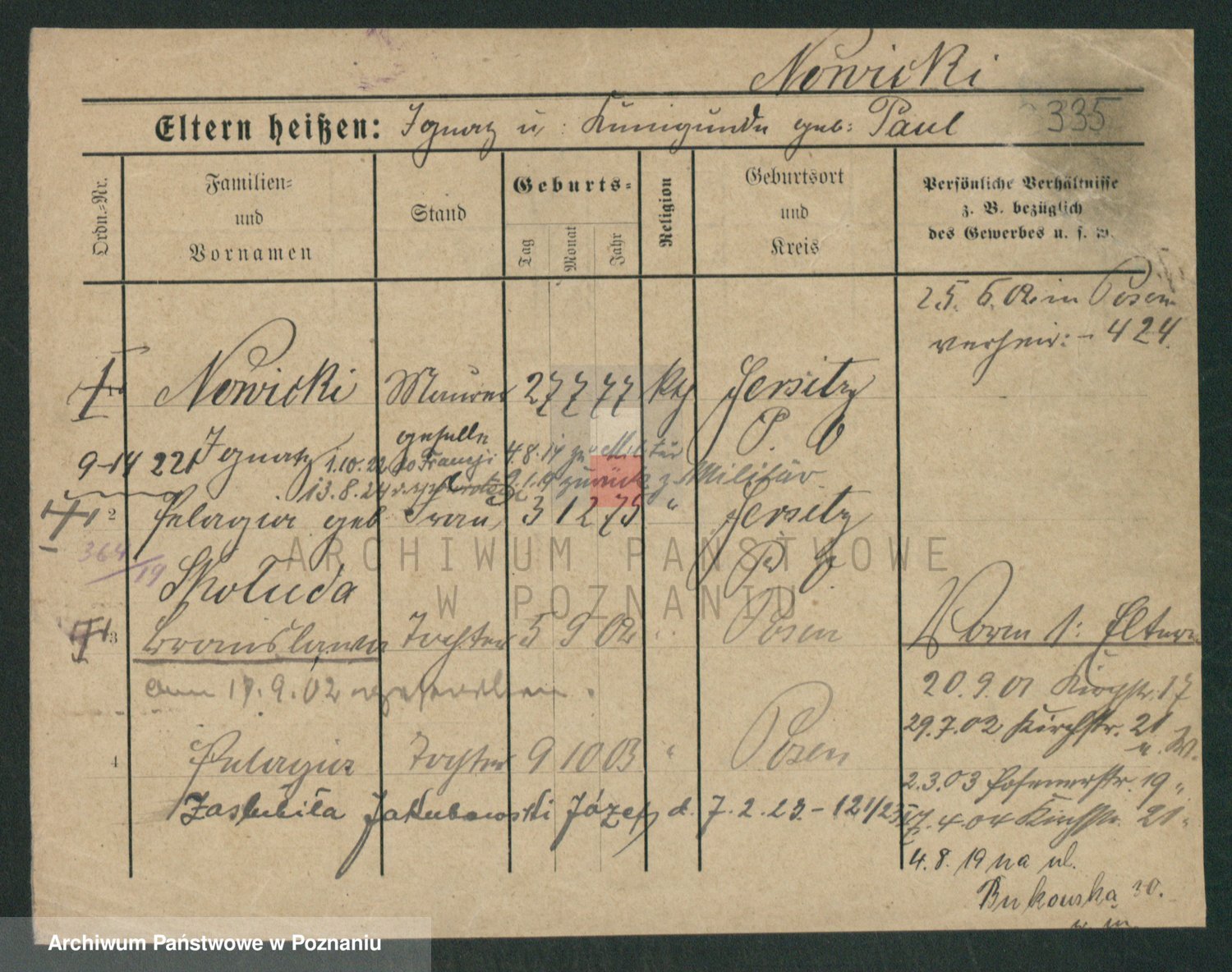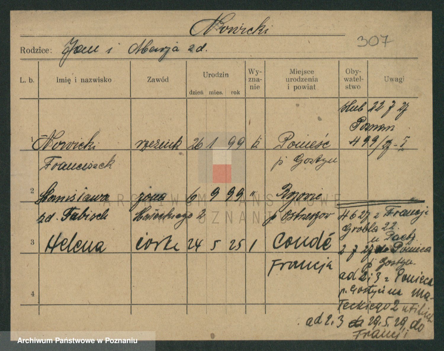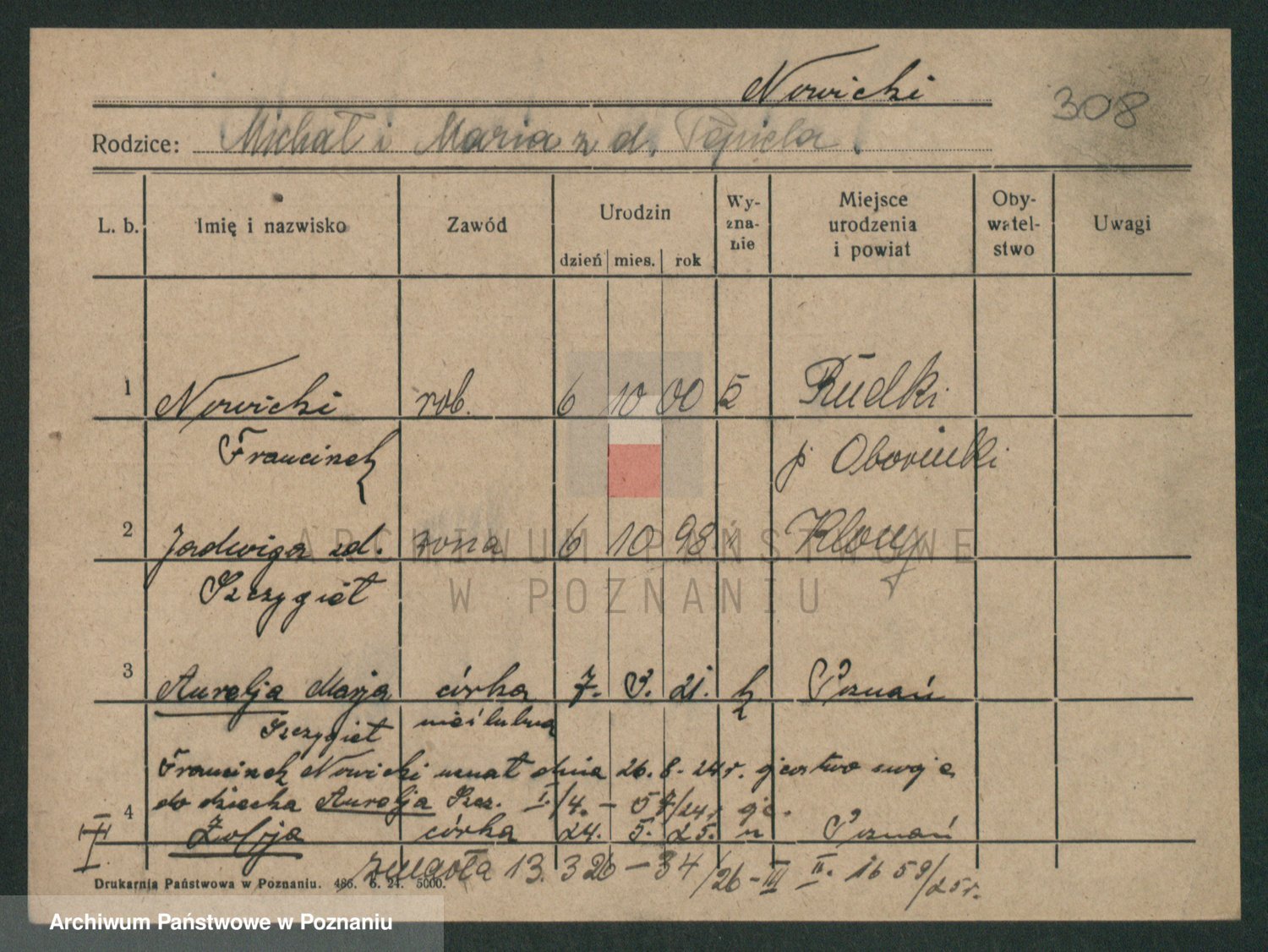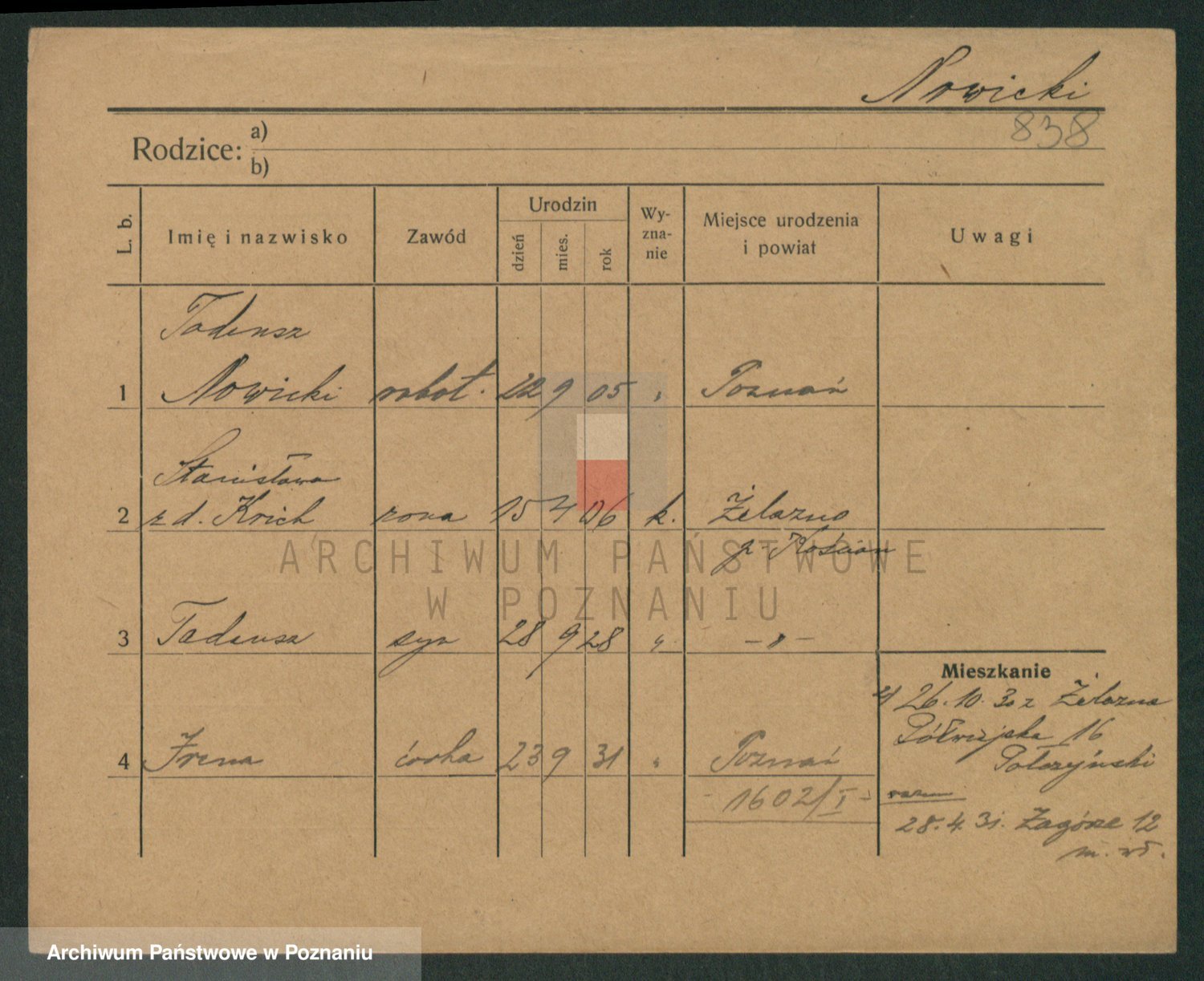 Podgląd karty osobowej dostępny jest po kliknięciu na nazwisko lub ikonkę karty. Można dokonywać powiększenia (ikony na górze) lub przechodzić między kolejnymi skanami (strzałki po bokach).