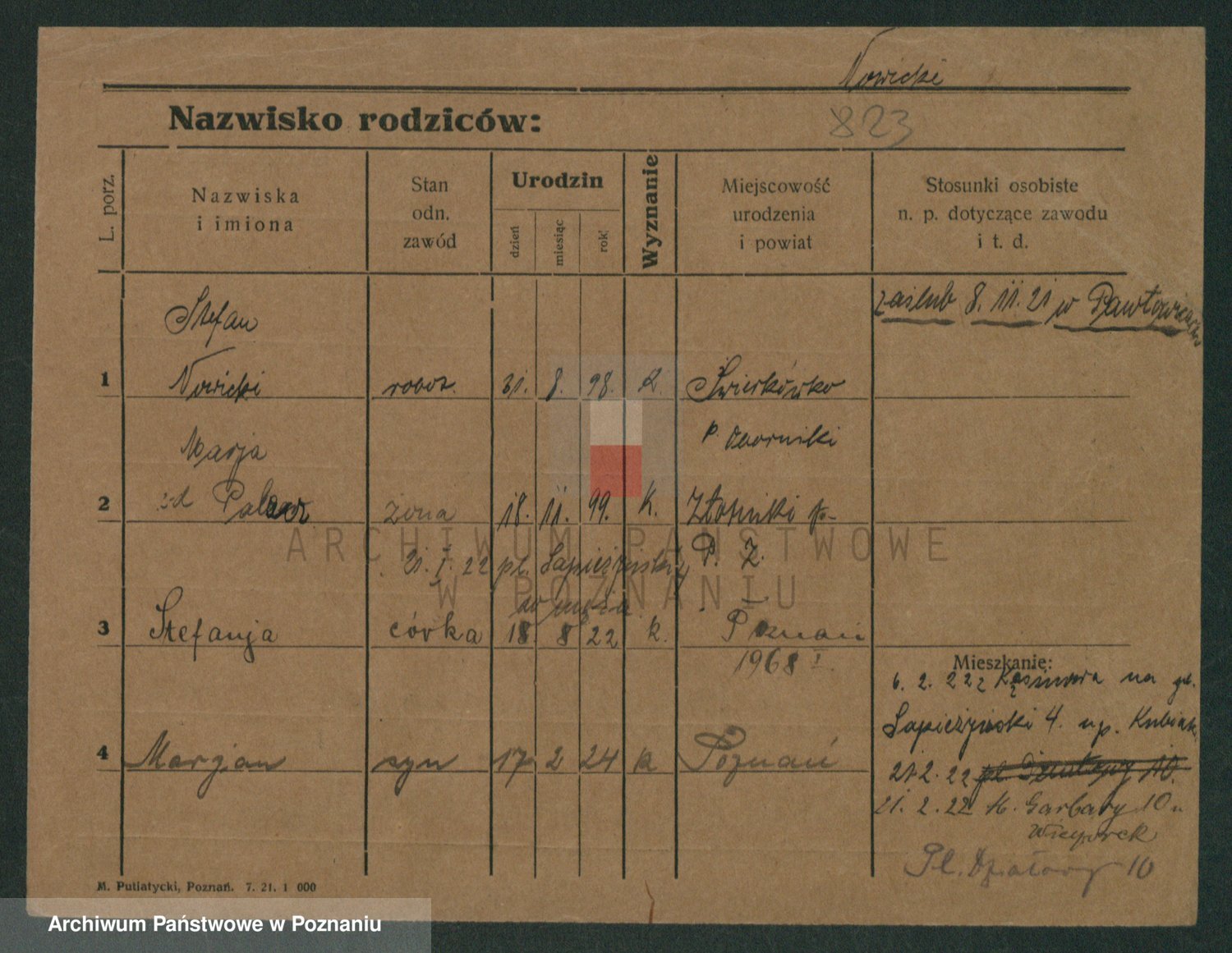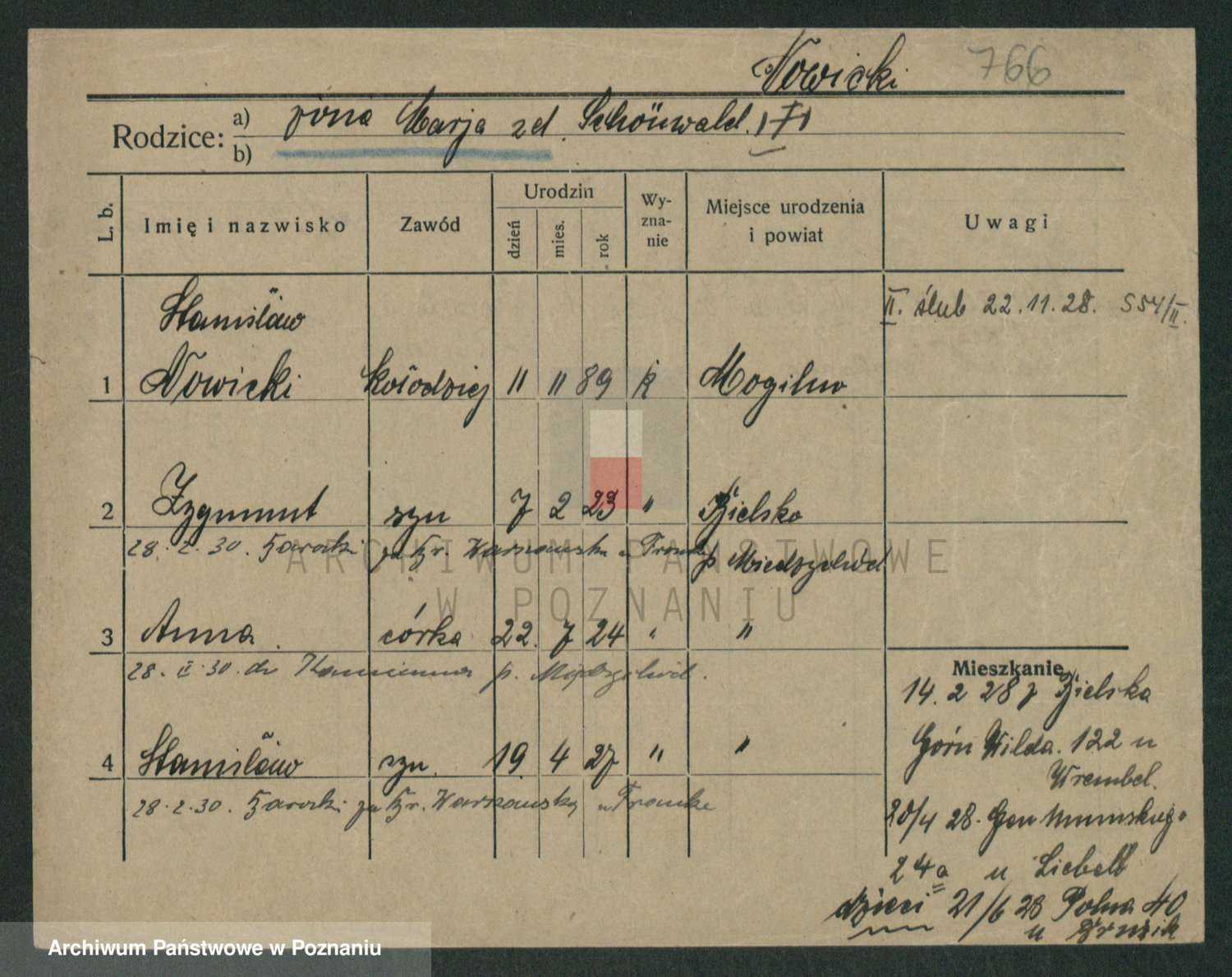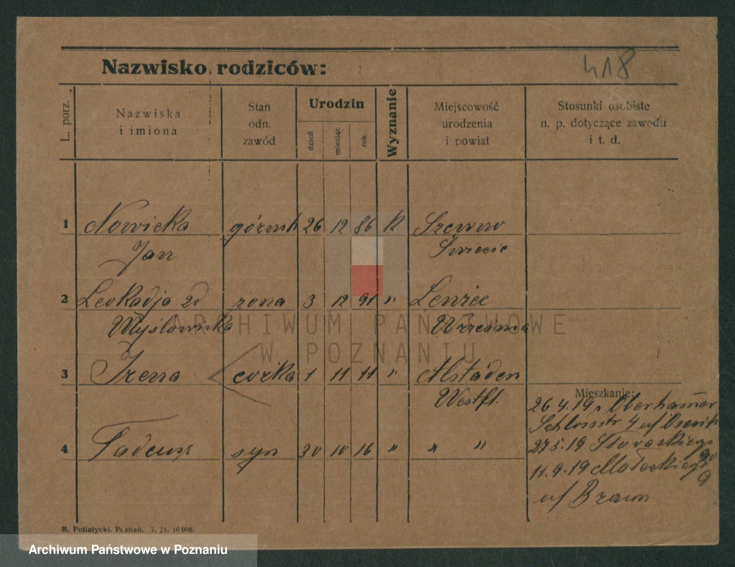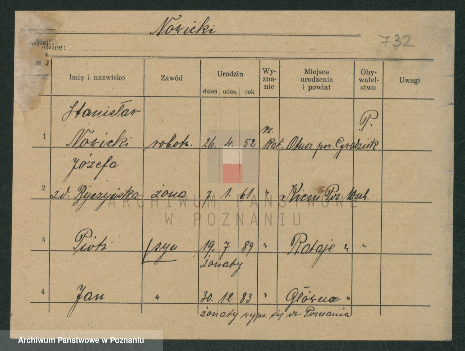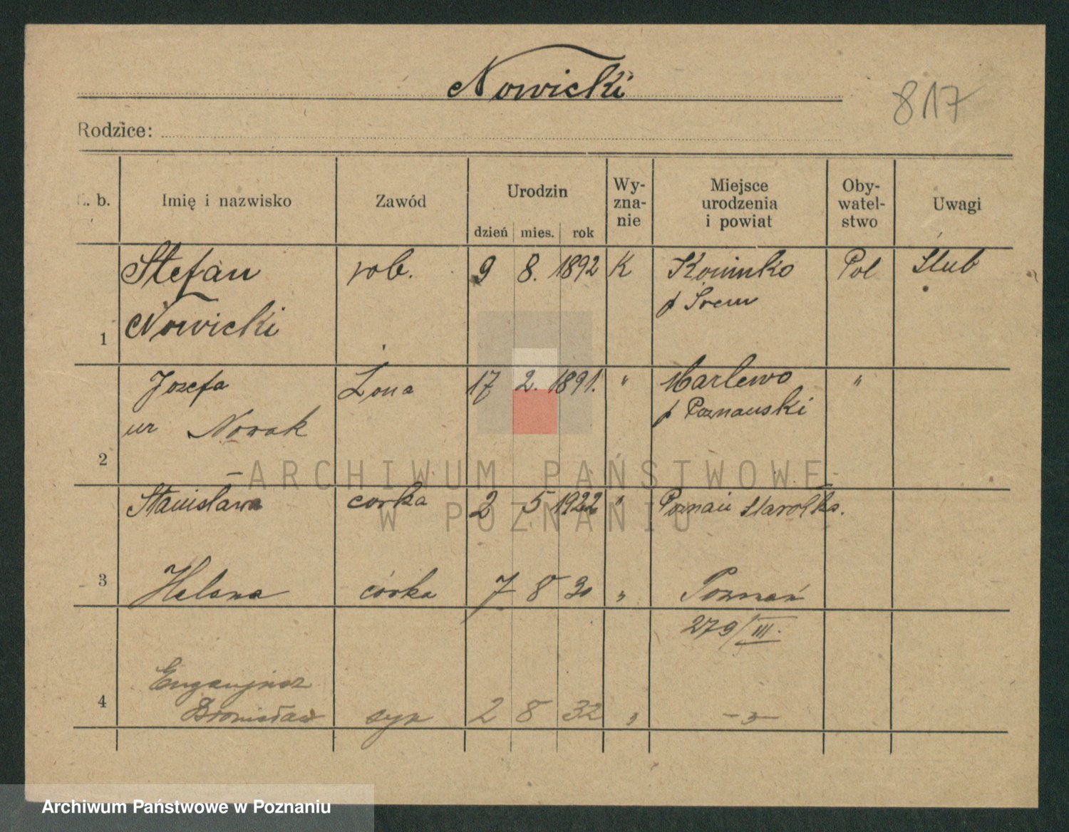 Podgląd karty osobowej dostępny jest po kliknięciu na nazwisko lub ikonkę karty. Można dokonywać powiększenia (ikony na górze) lub przechodzić między kolejnymi skanami (strzałki po bokach).