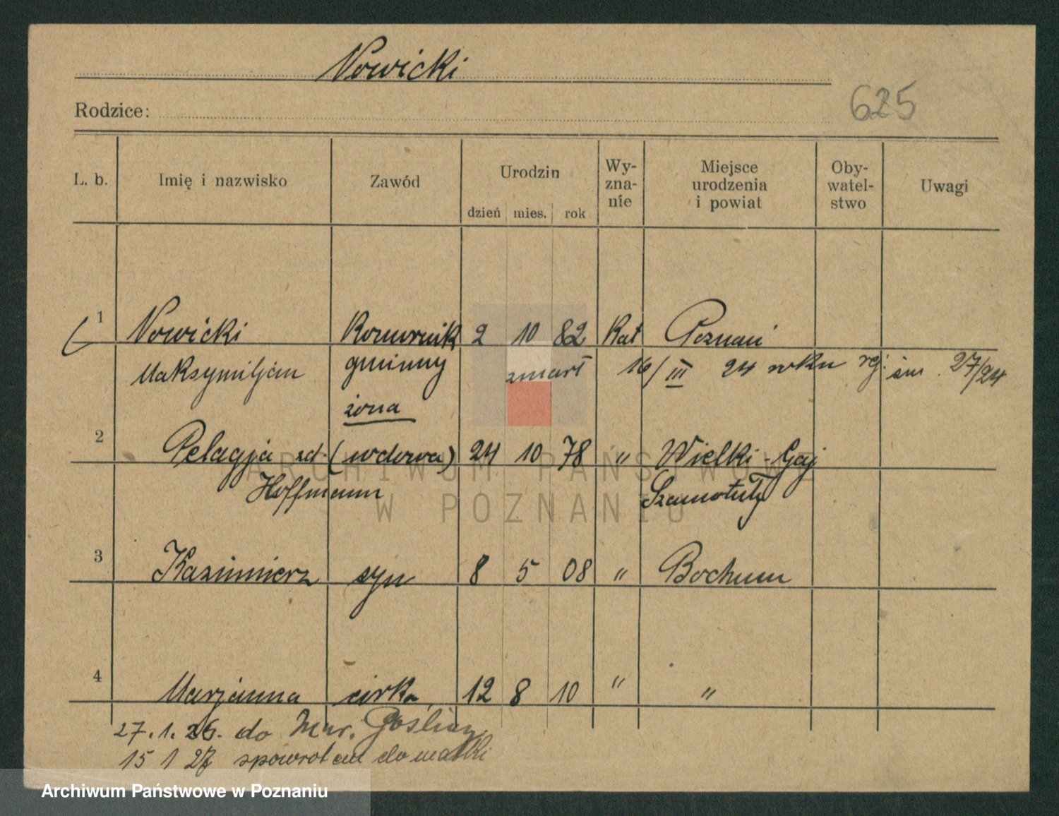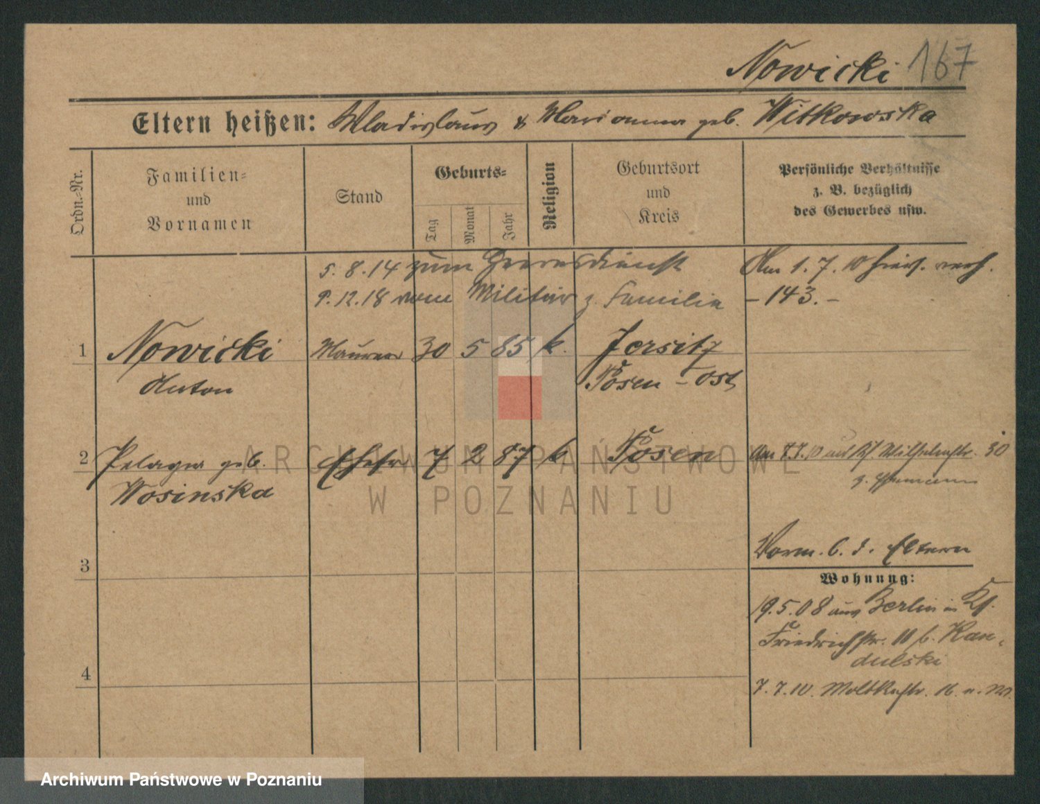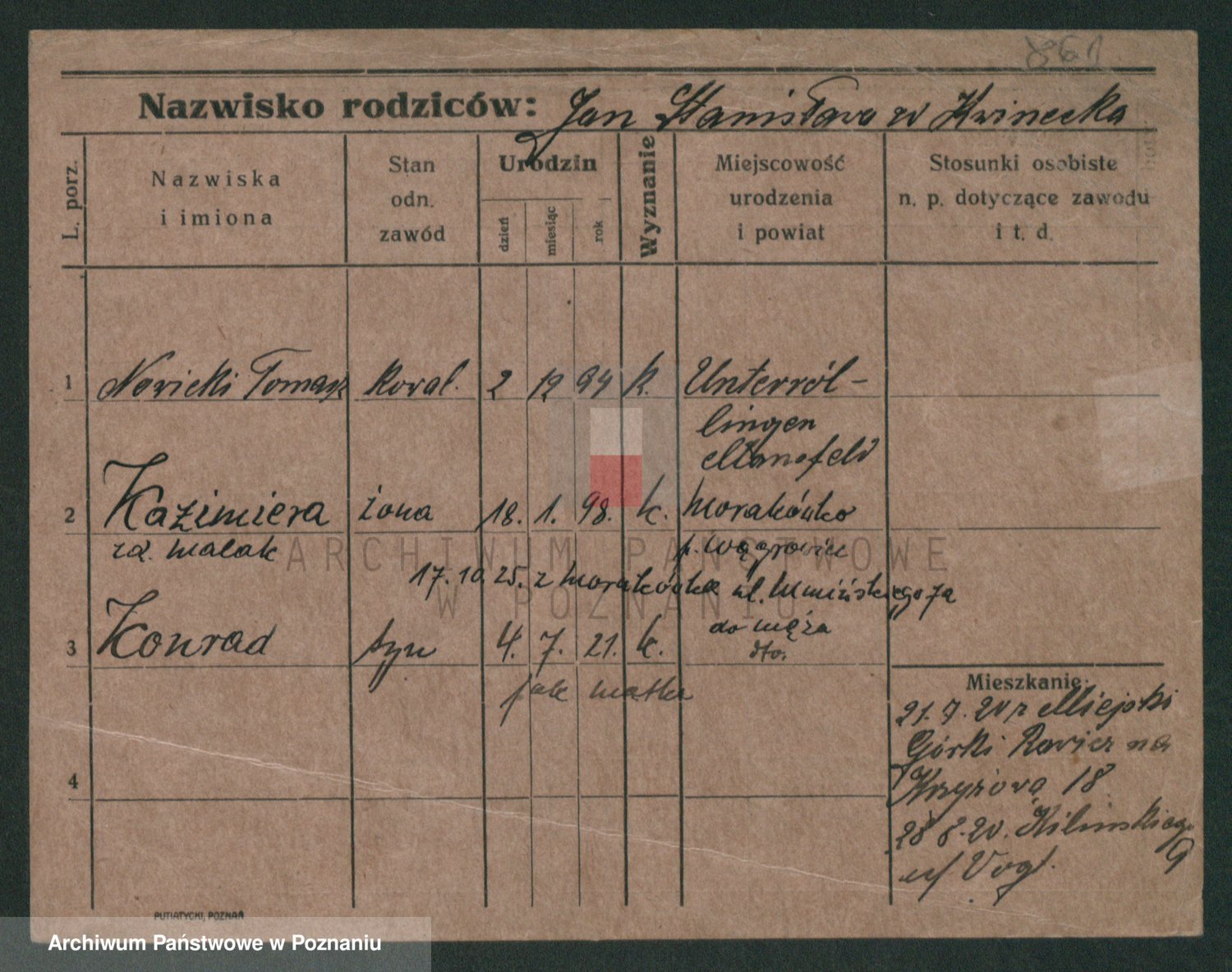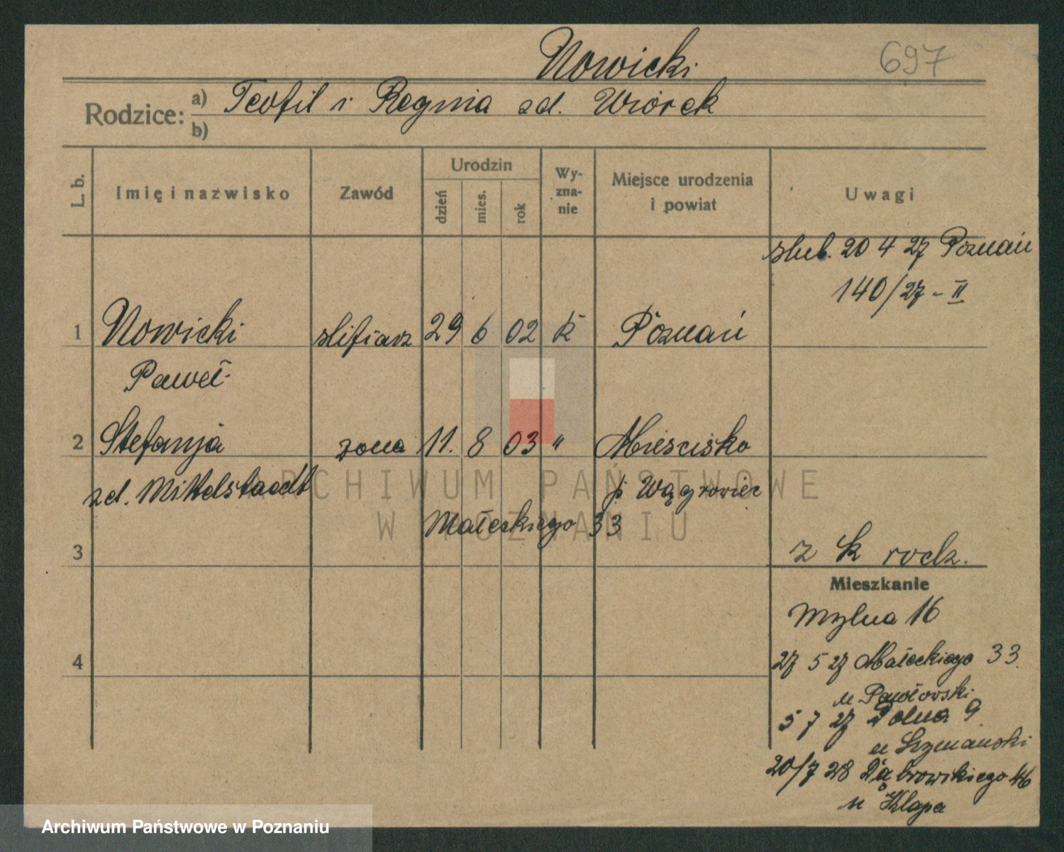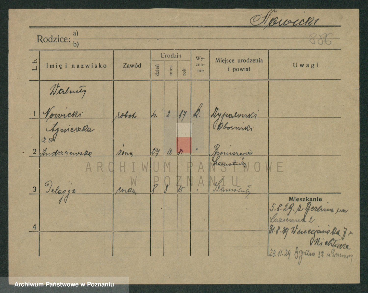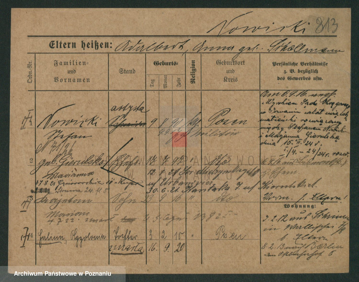 Podgląd karty osobowej dostępny jest po kliknięciu na nazwisko lub ikonkę karty. Można dokonywać powiększenia (ikony na górze) lub przechodzić między kolejnymi skanami (strzałki po bokach).
