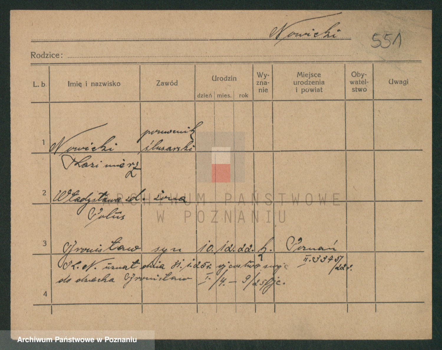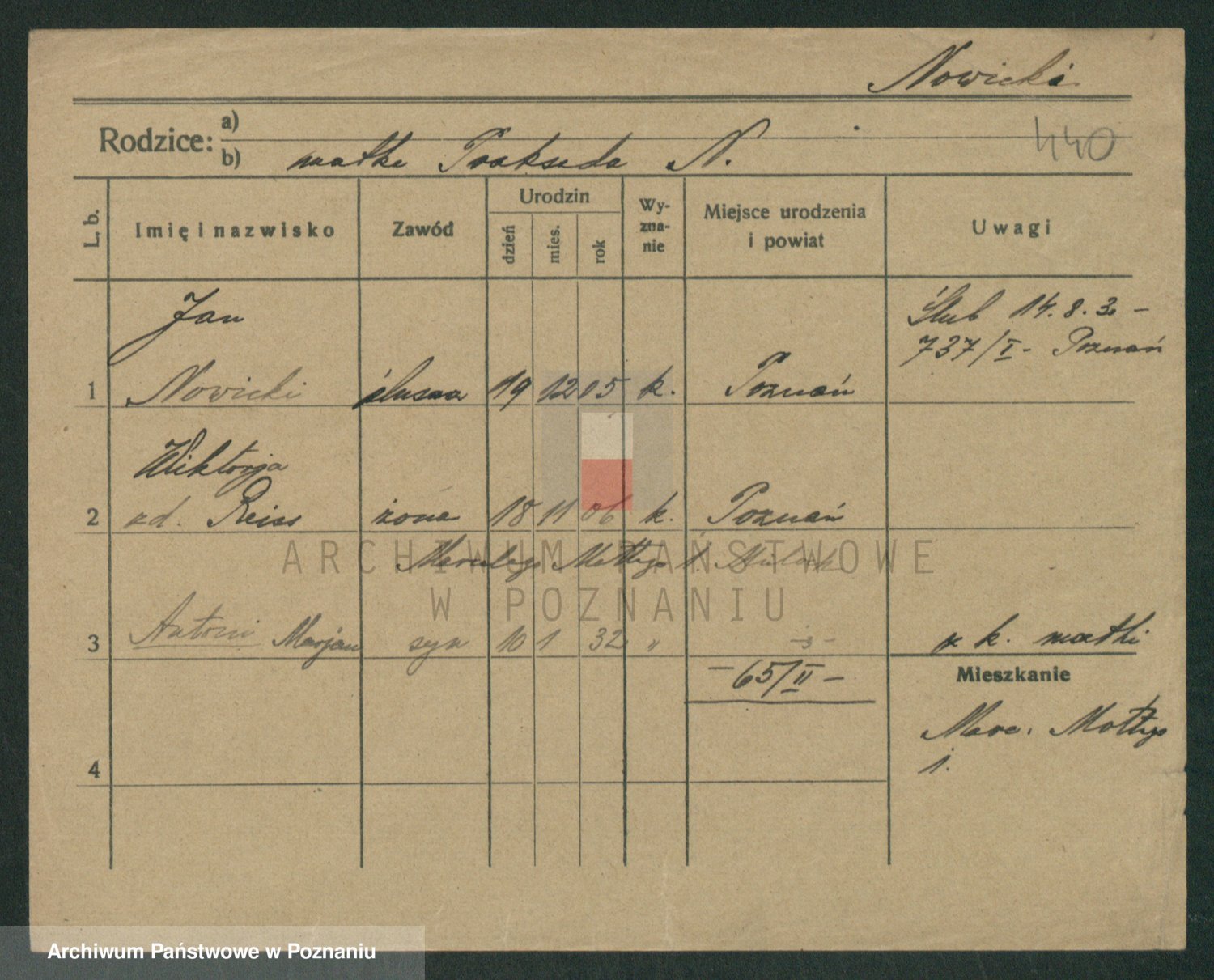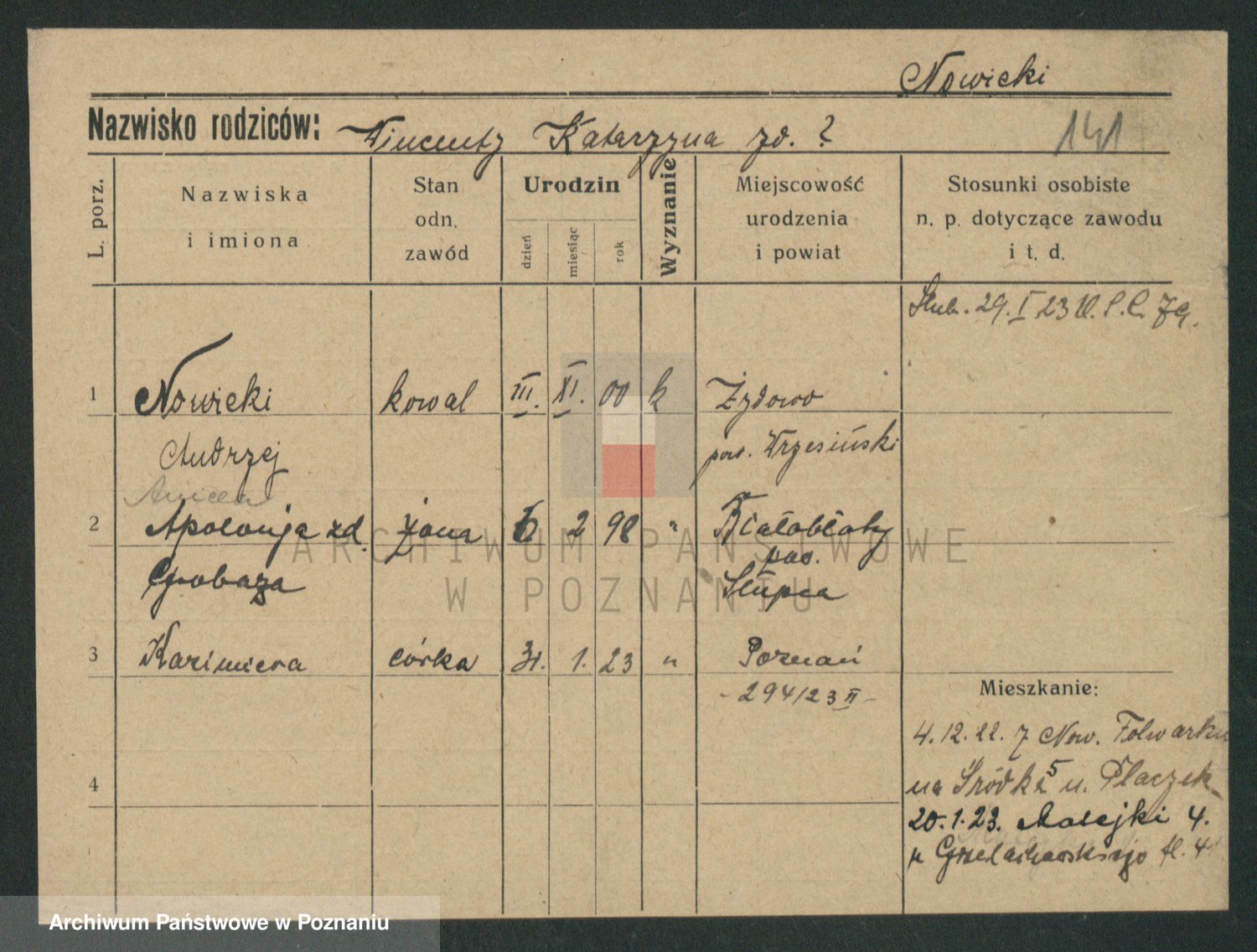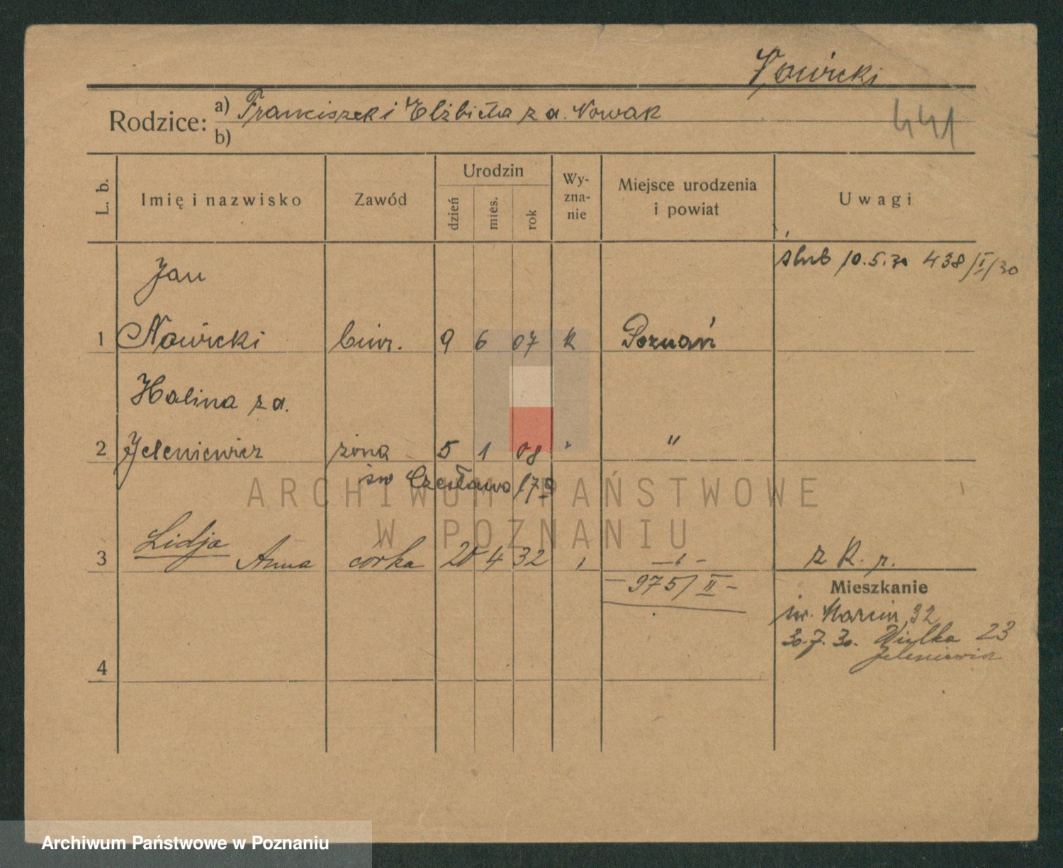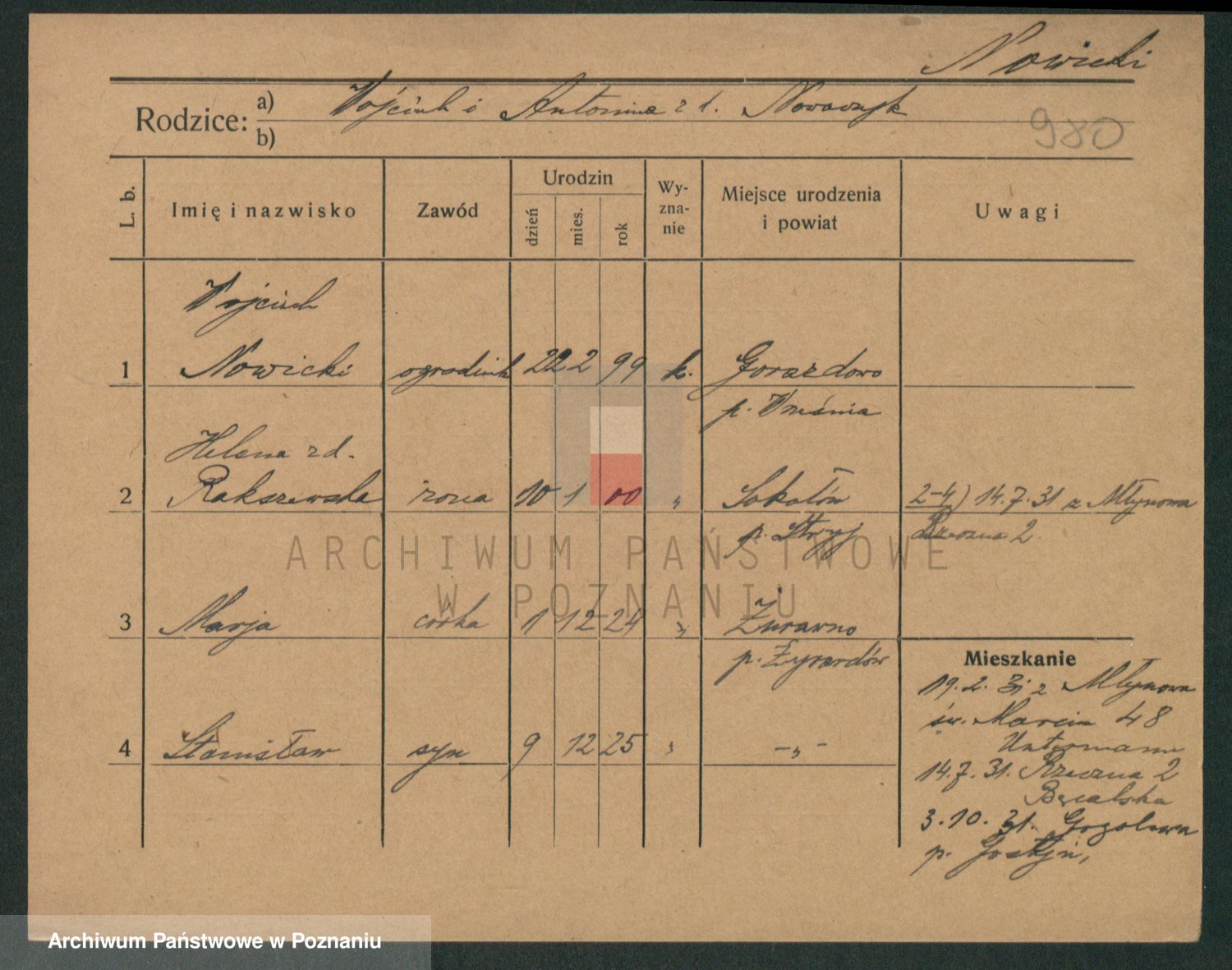 Podgląd karty osobowej dostępny jest po kliknięciu na nazwisko lub ikonkę karty. Można dokonywać powiększenia (ikony na górze) lub przechodzić między kolejnymi skanami (strzałki po bokach).