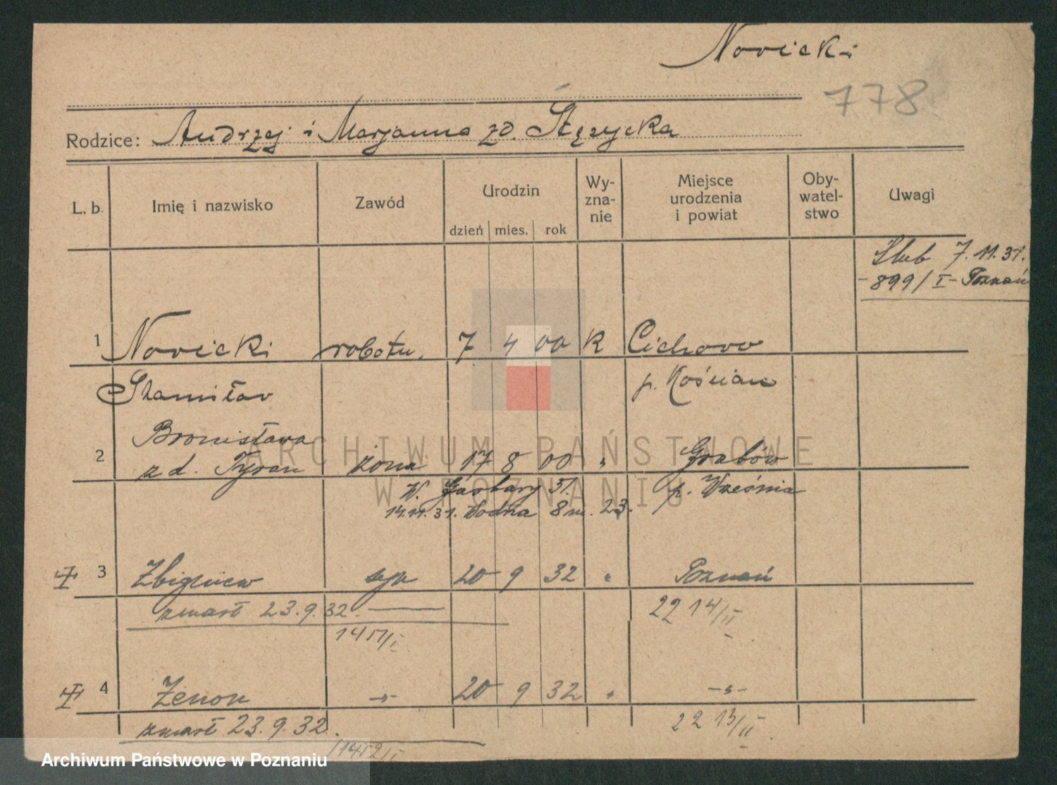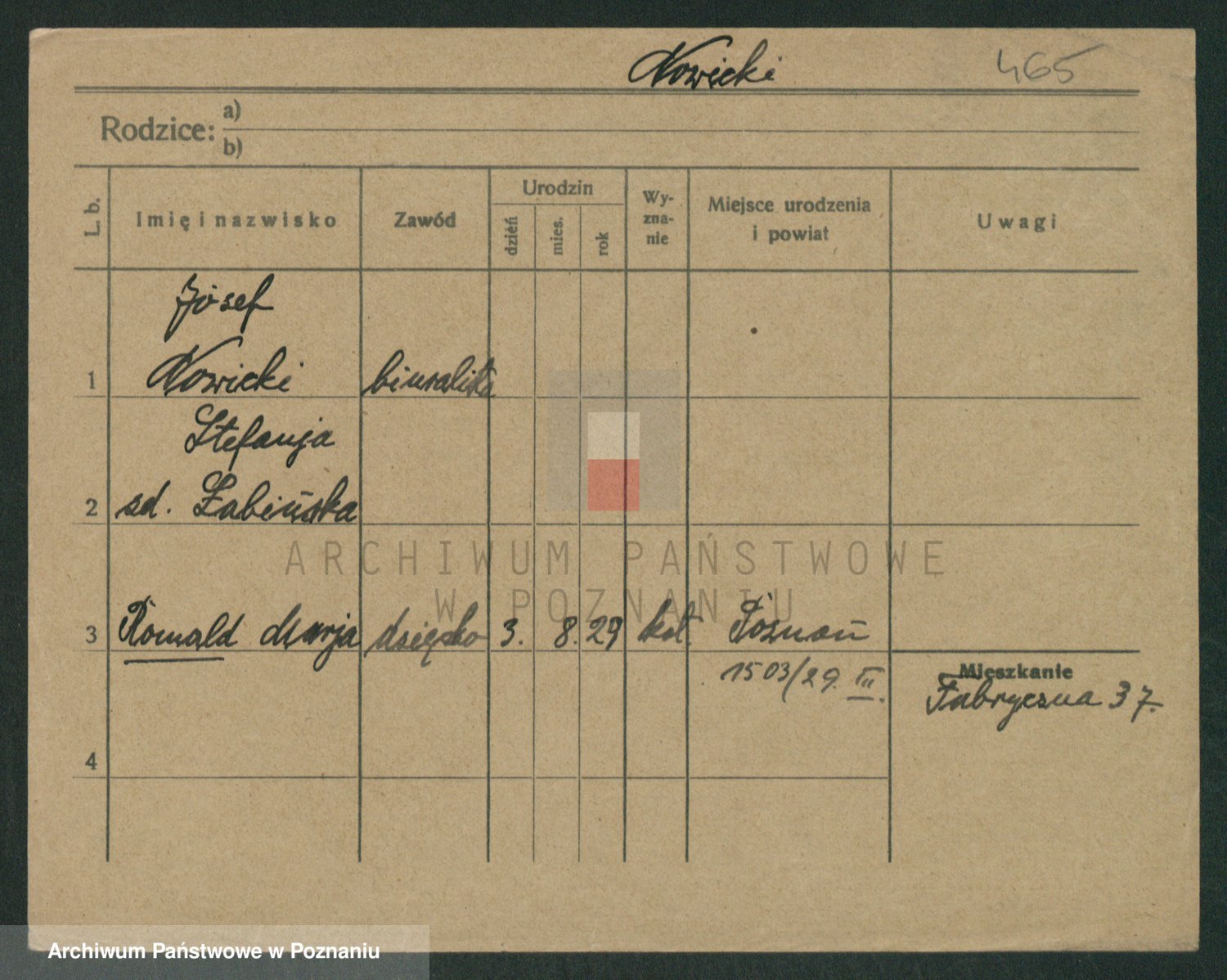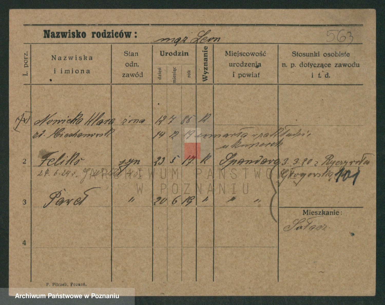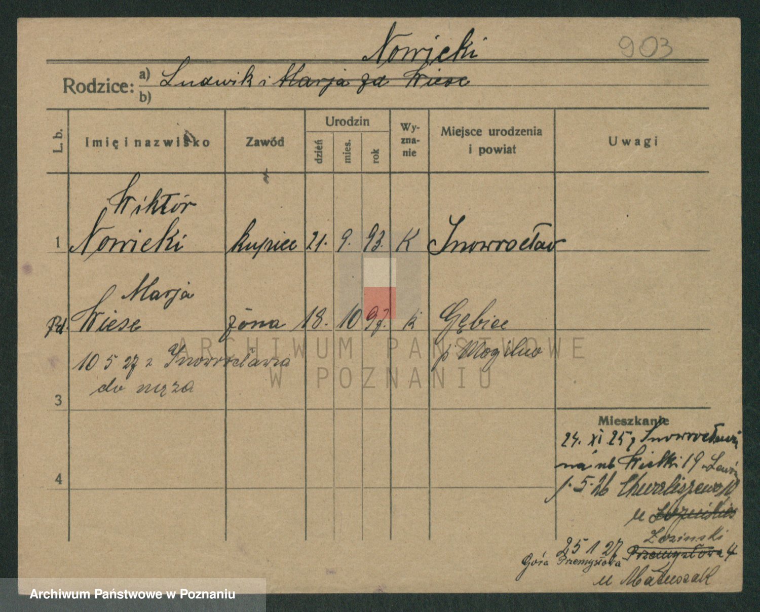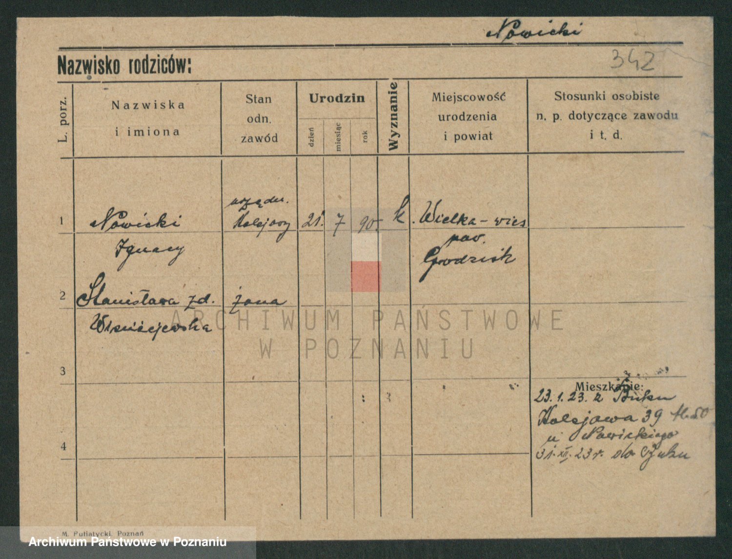 Podgląd karty osobowej dostępny jest po kliknięciu na nazwisko lub ikonkę karty. Można dokonywać powiększenia (ikony na górze) lub przechodzić między kolejnymi skanami (strzałki po bokach).