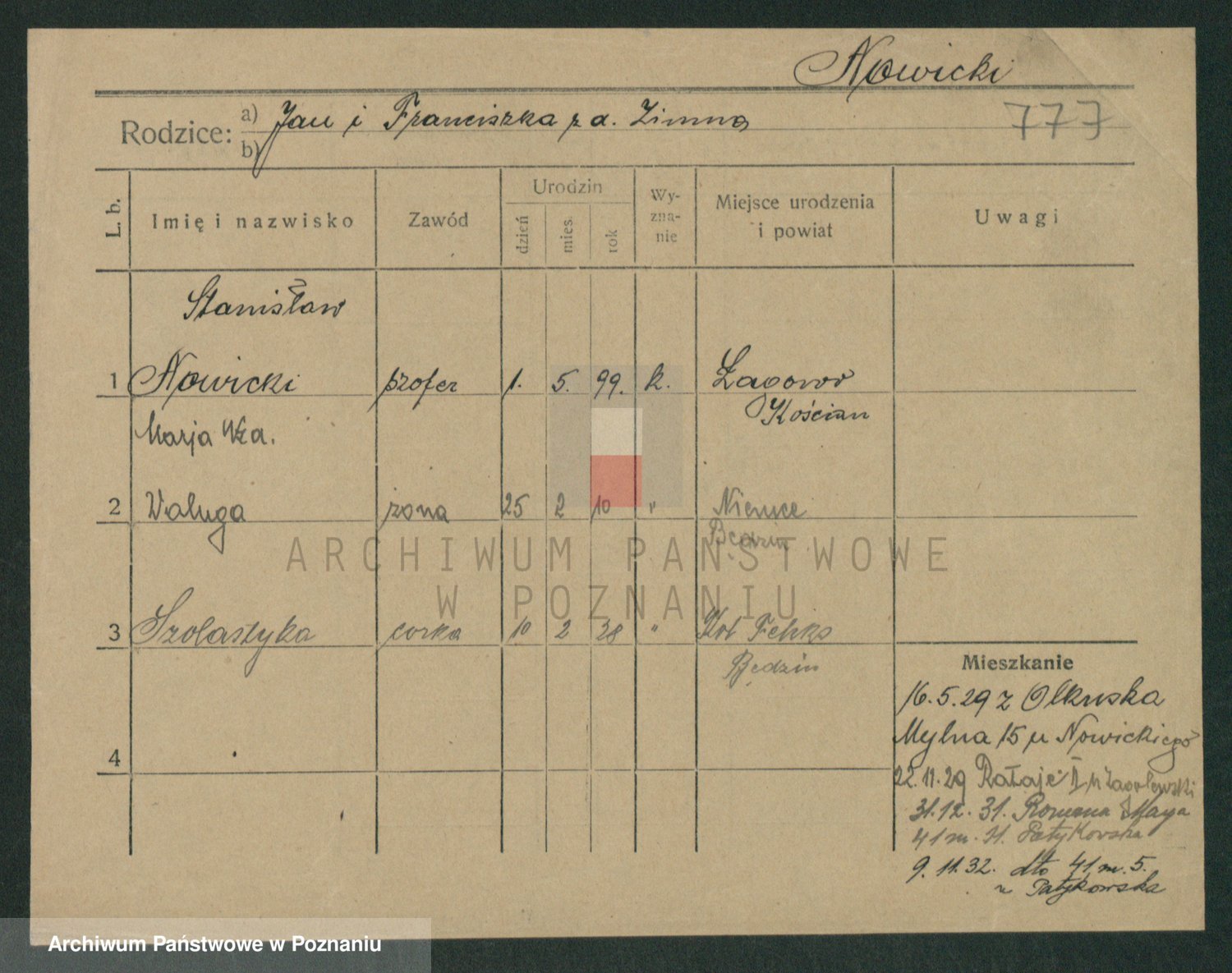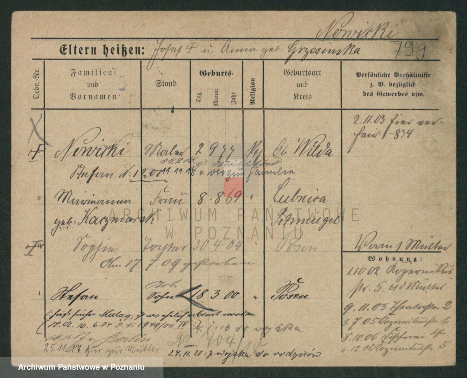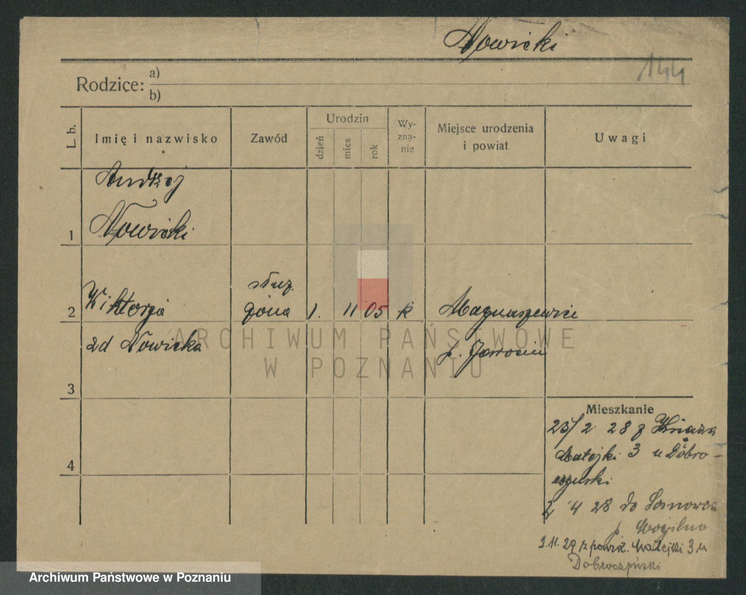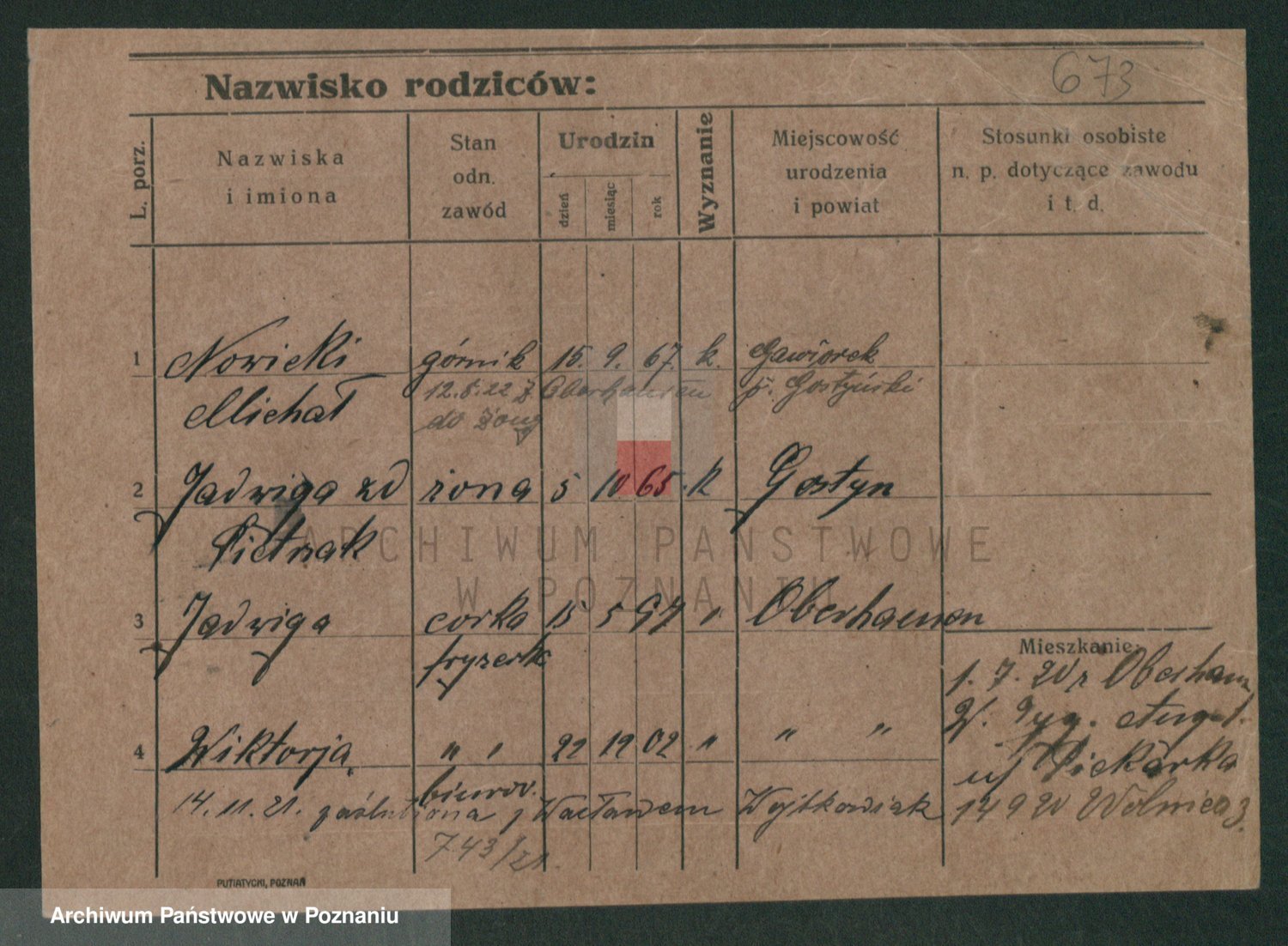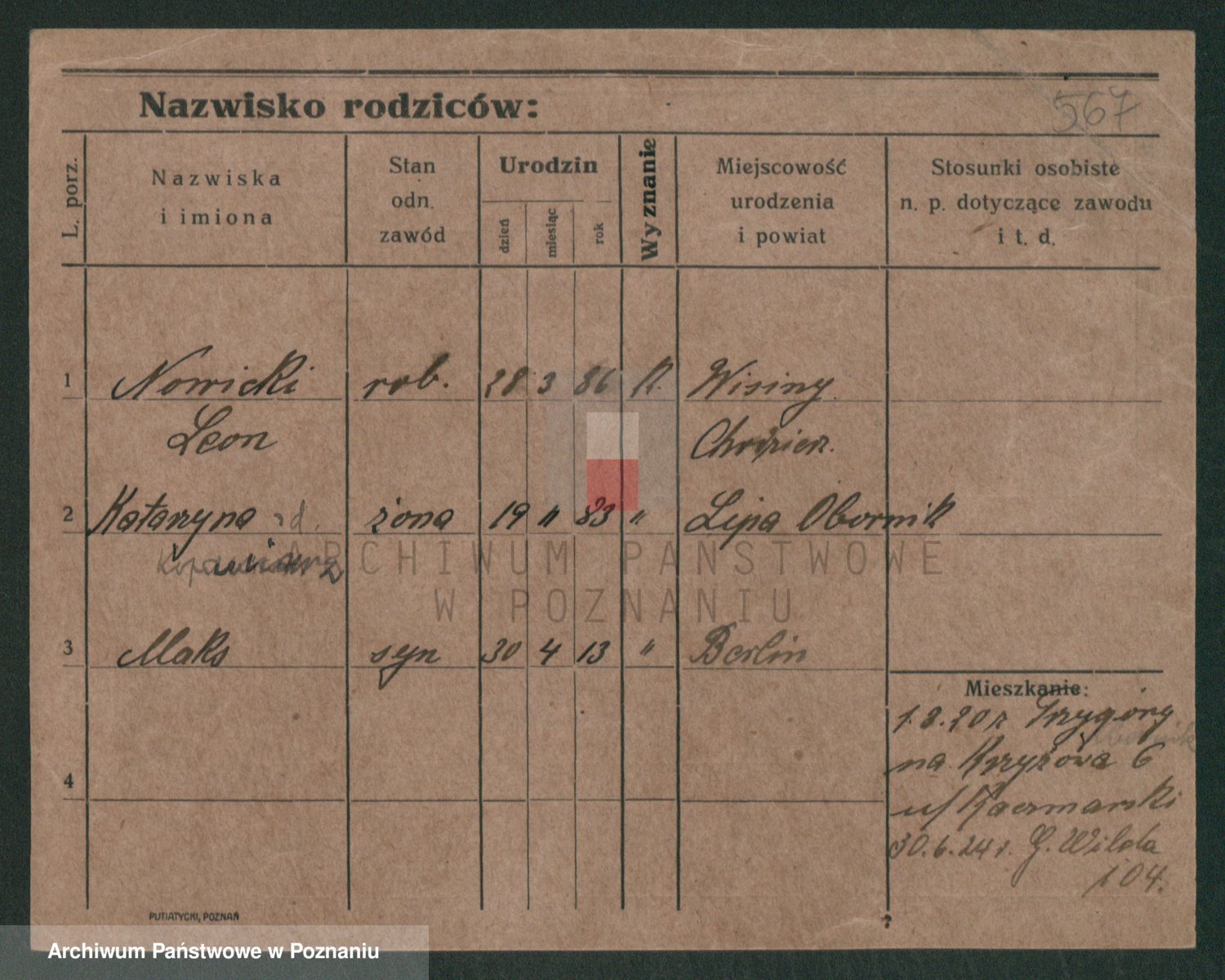 Podgląd karty osobowej dostępny jest po kliknięciu na nazwisko lub ikonkę karty. Można dokonywać powiększenia (ikony na górze) lub przechodzić między kolejnymi skanami (strzałki po bokach).