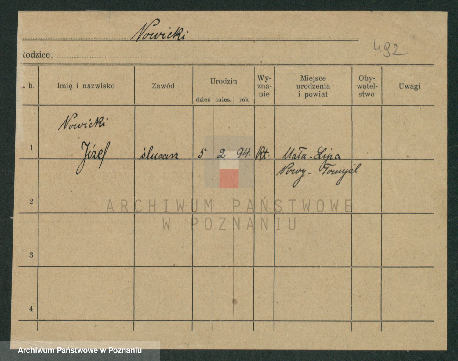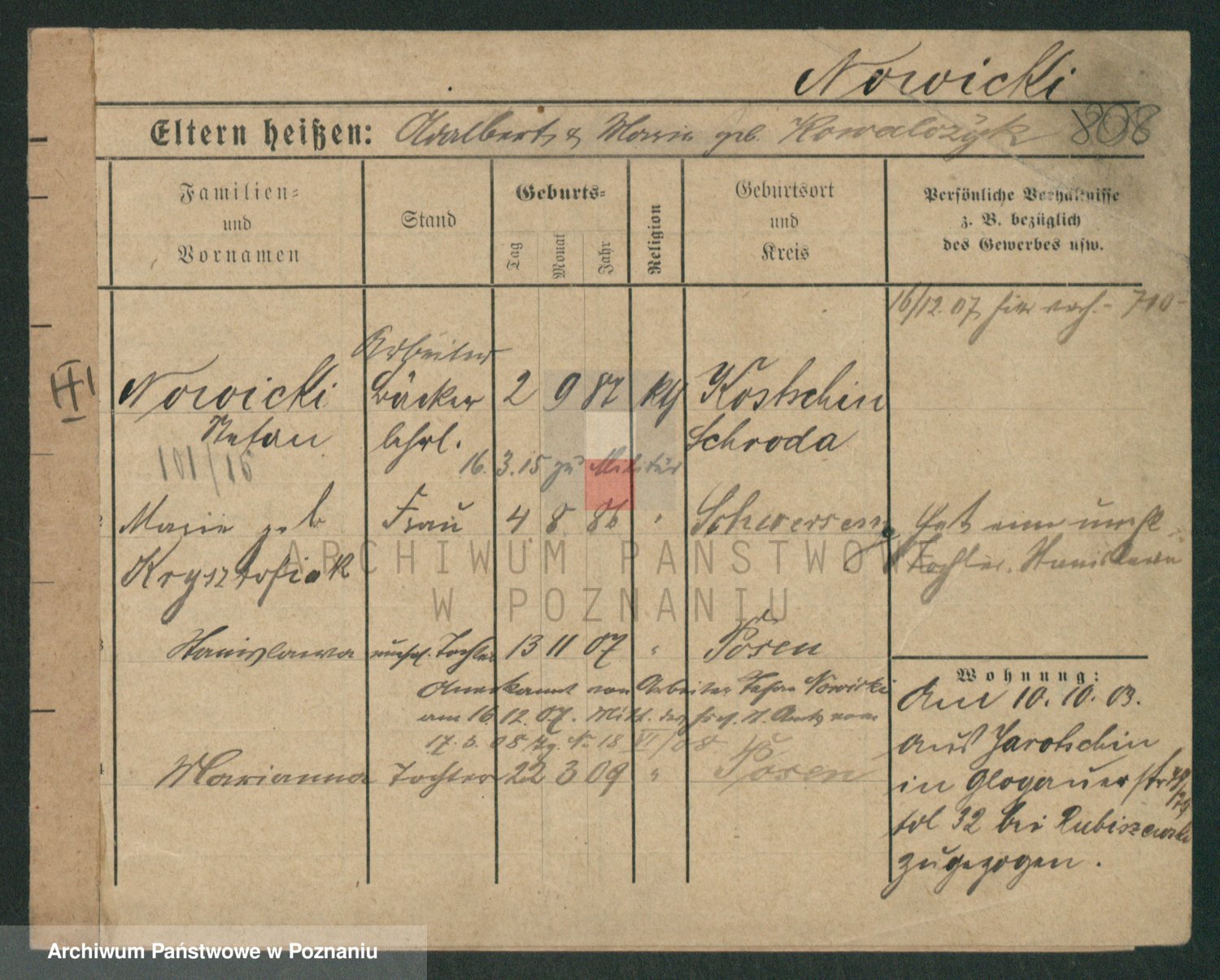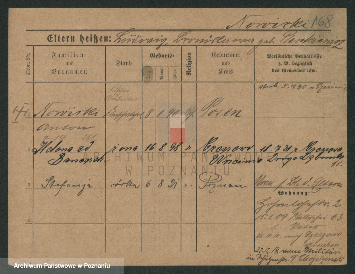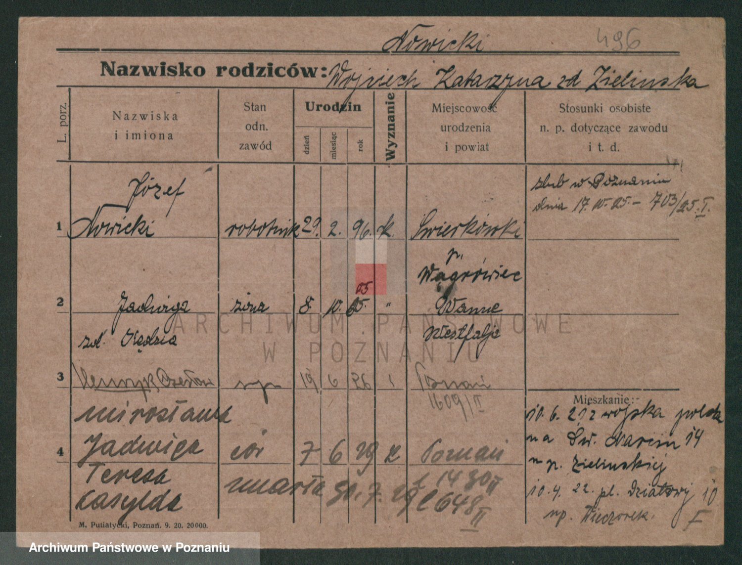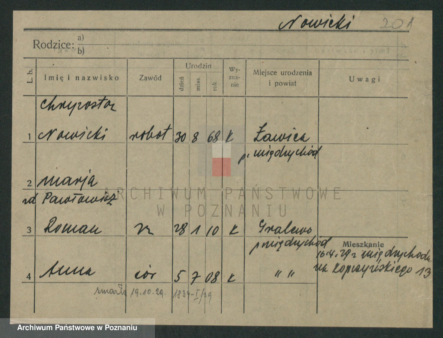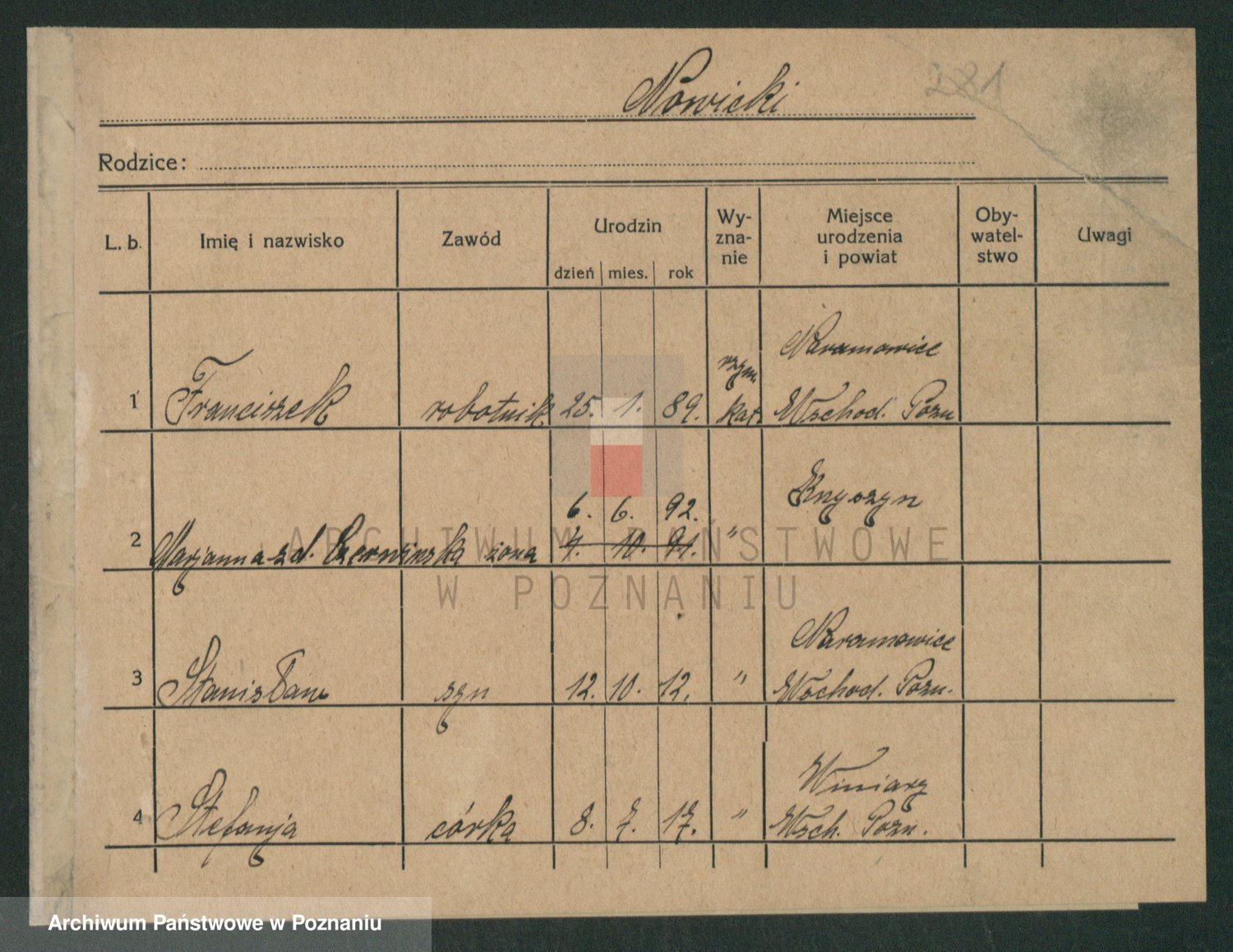 Podgląd karty osobowej dostępny jest po kliknięciu na nazwisko lub ikonkę karty. Można dokonywać powiększenia (ikony na górze) lub przechodzić między kolejnymi skanami (strzałki po bokach).