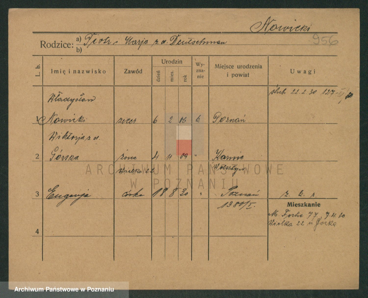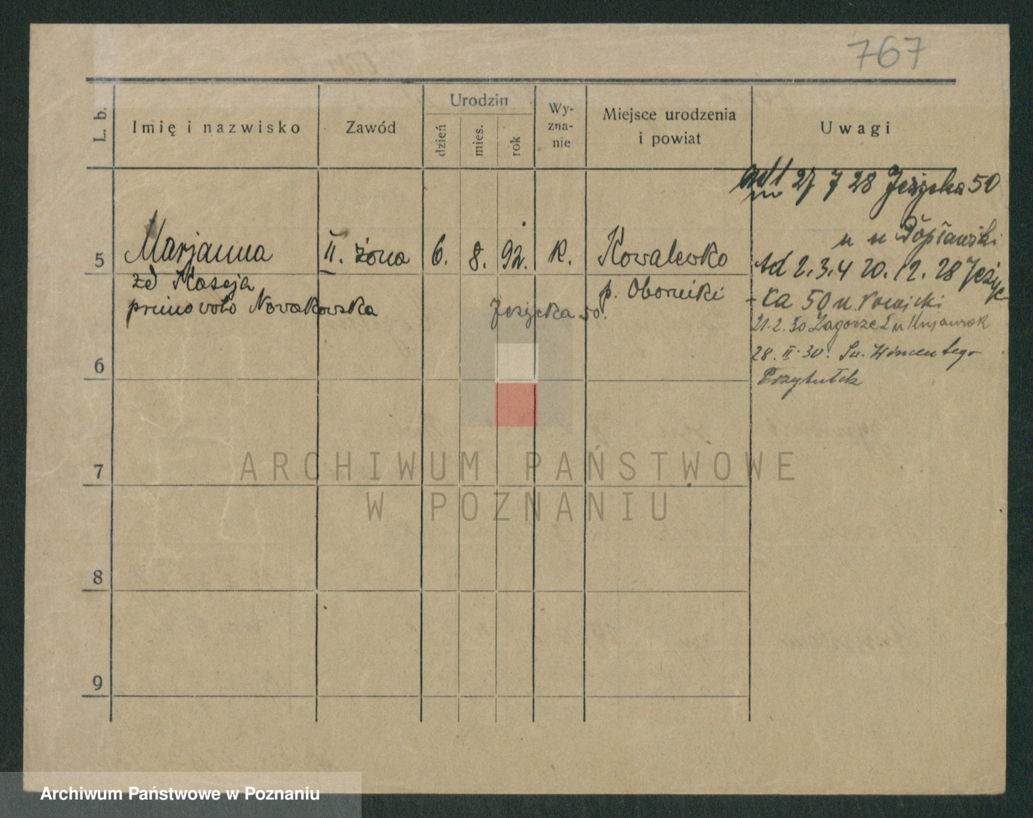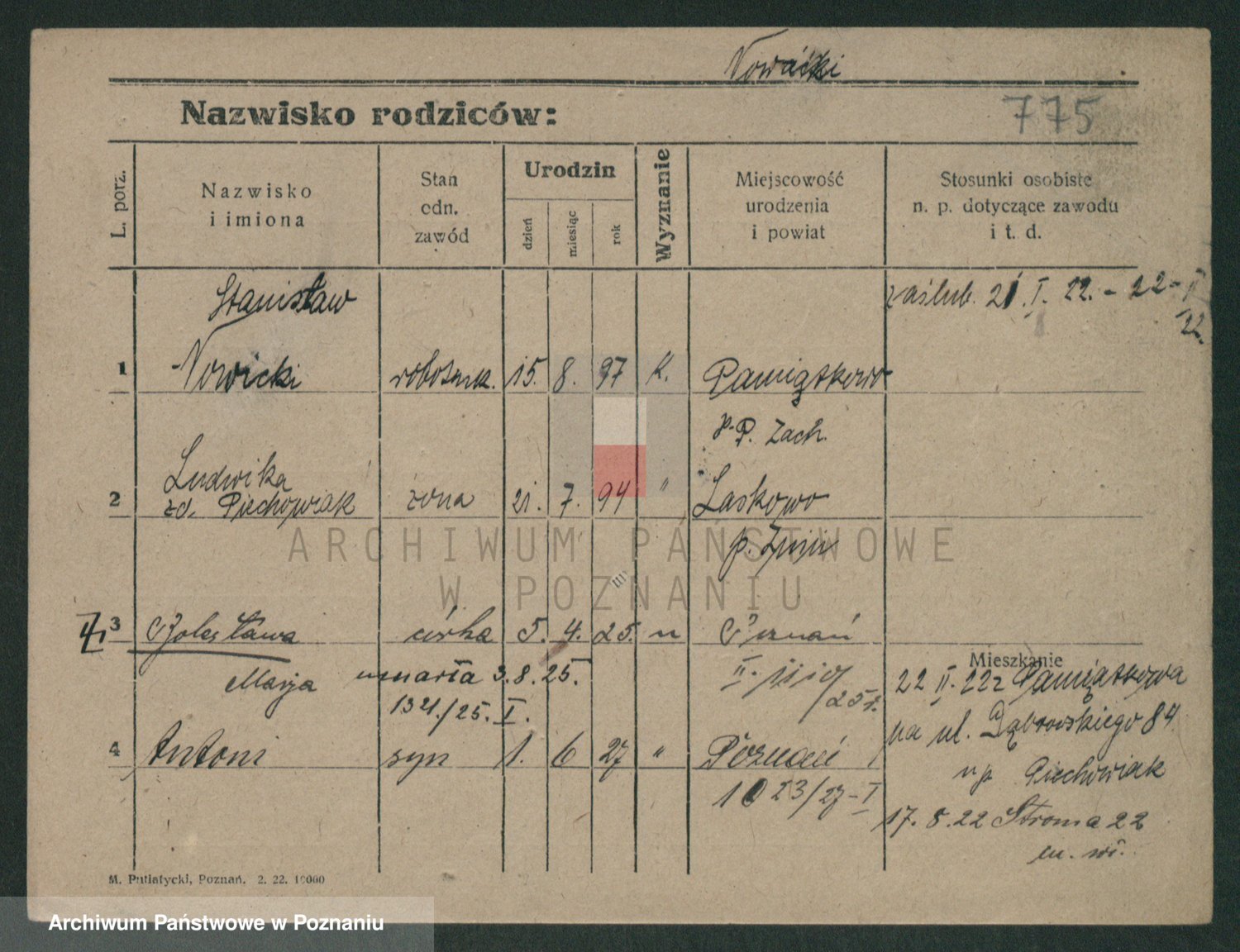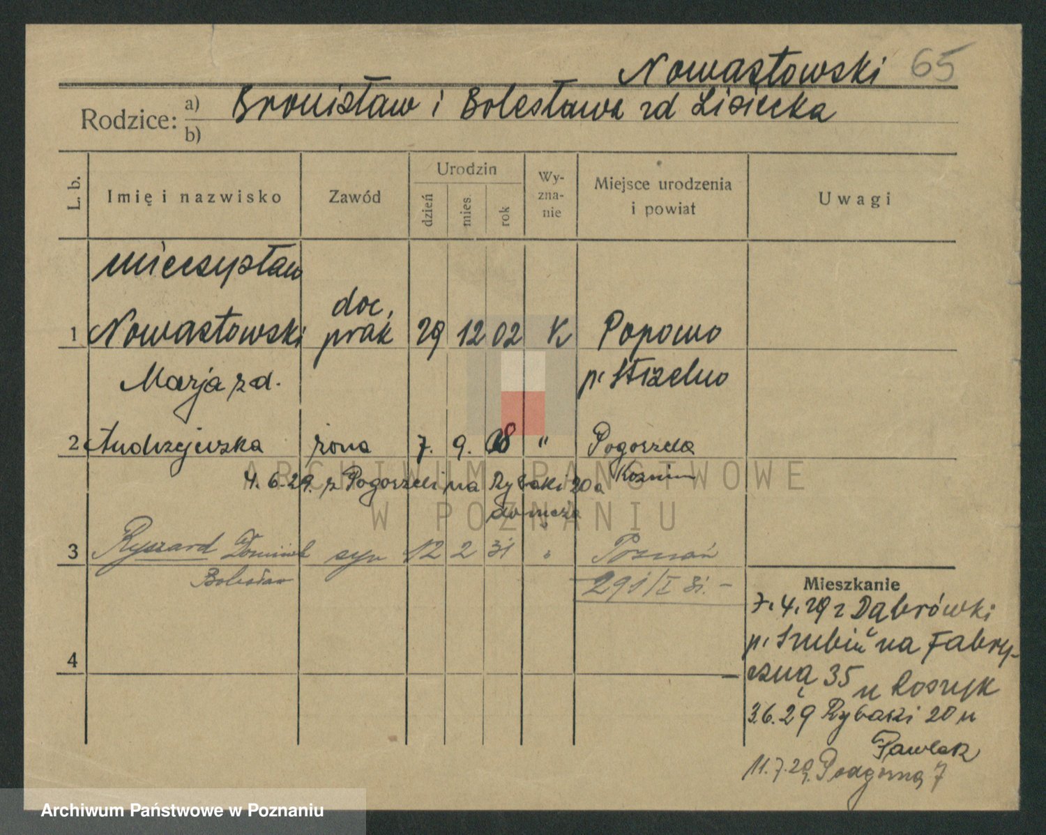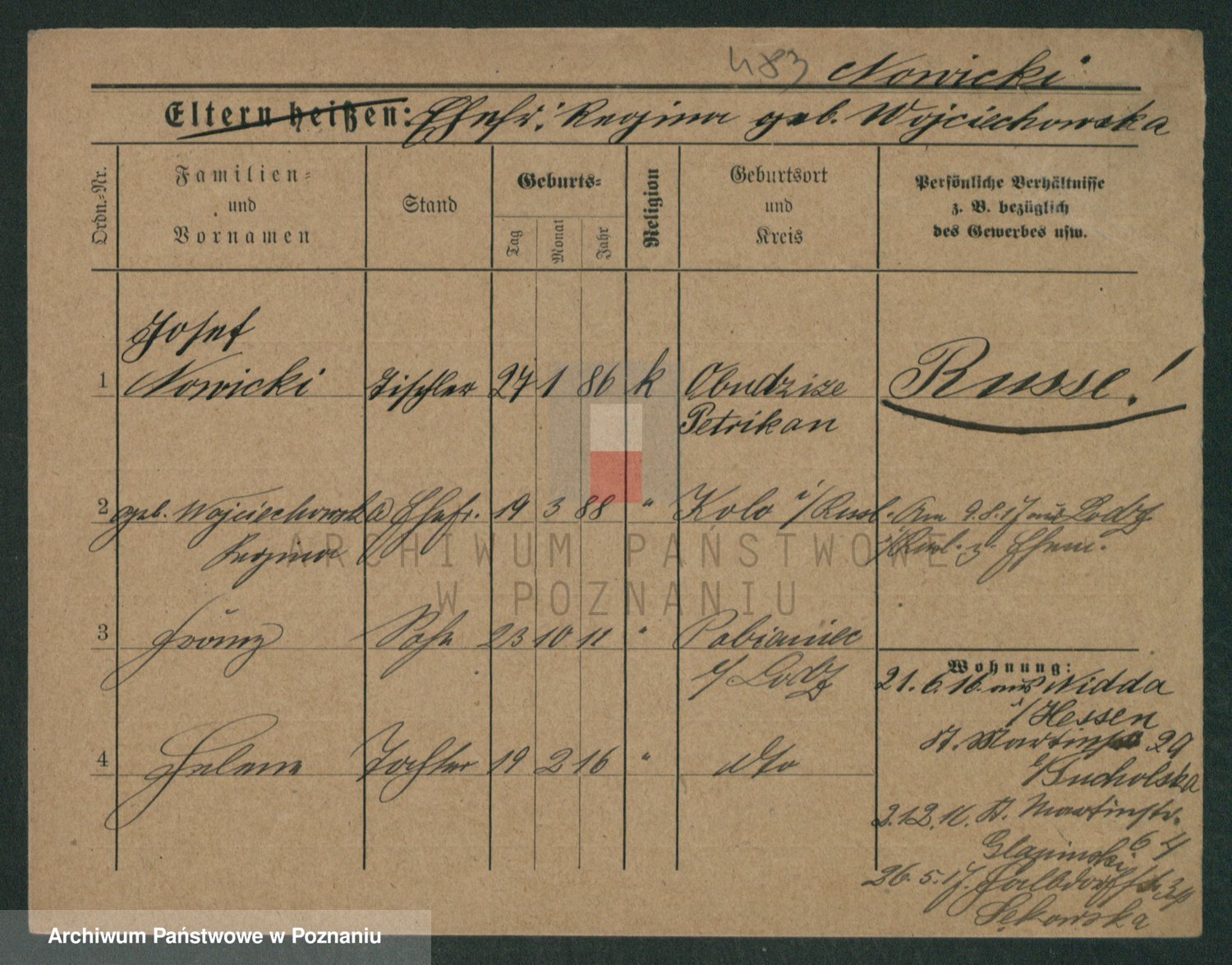 Podgląd karty osobowej dostępny jest po kliknięciu na nazwisko lub ikonkę karty. Można dokonywać powiększenia (ikony na górze) lub przechodzić między kolejnymi skanami (strzałki po bokach).