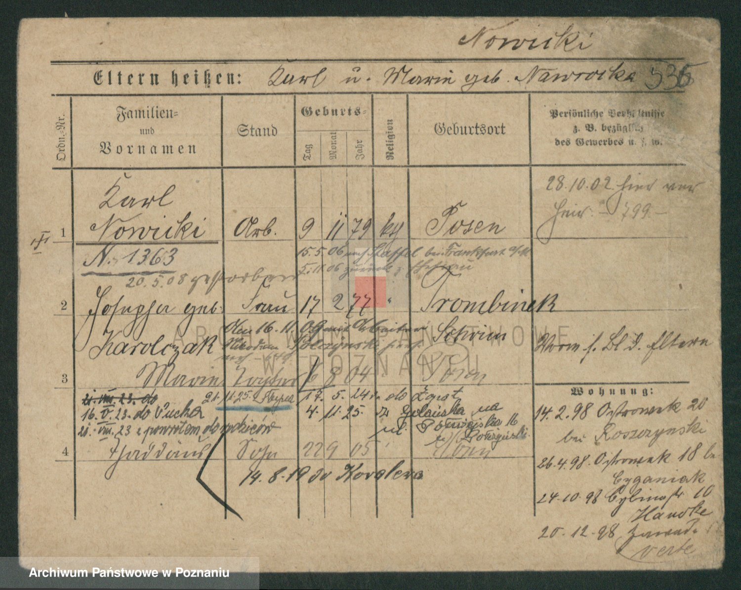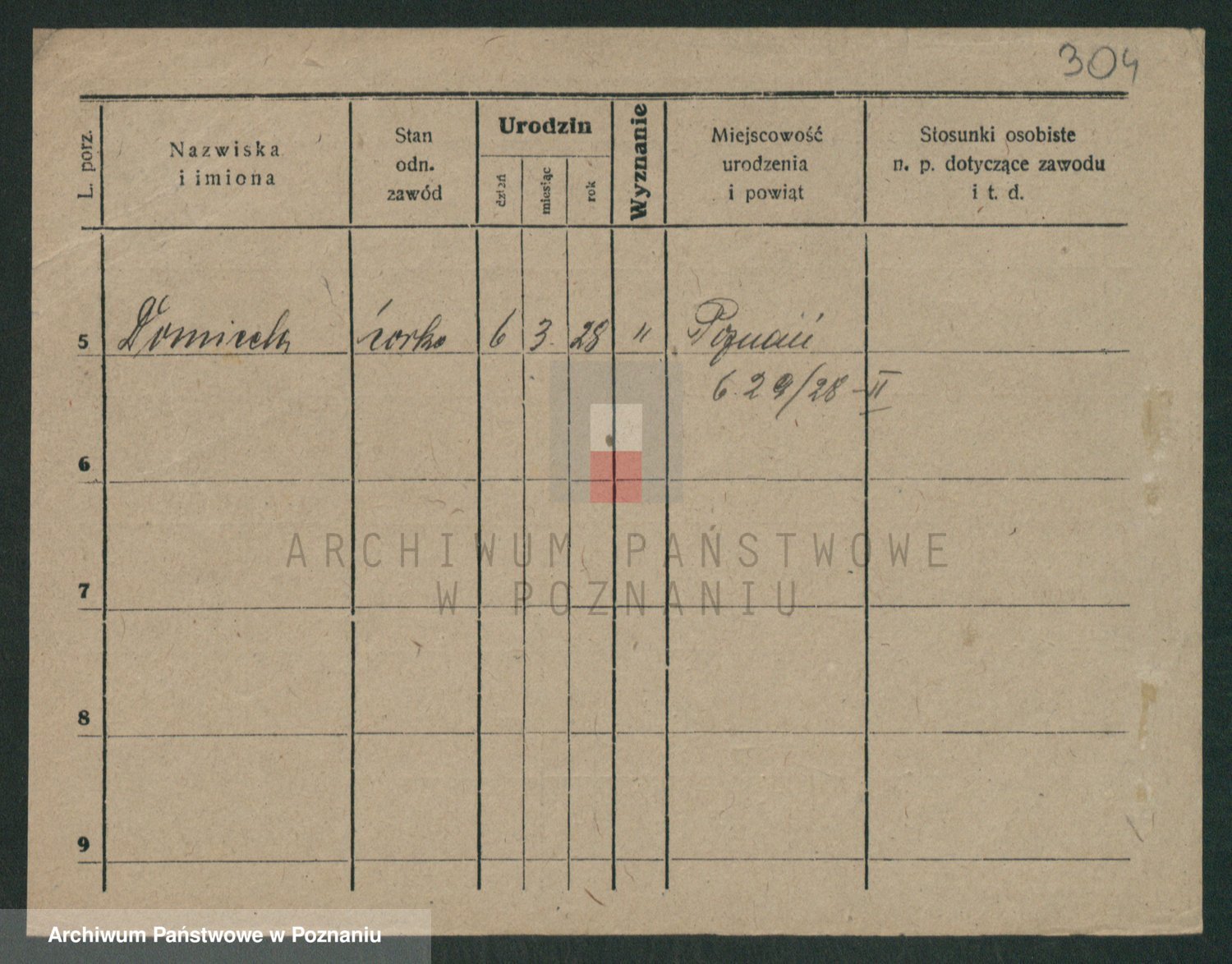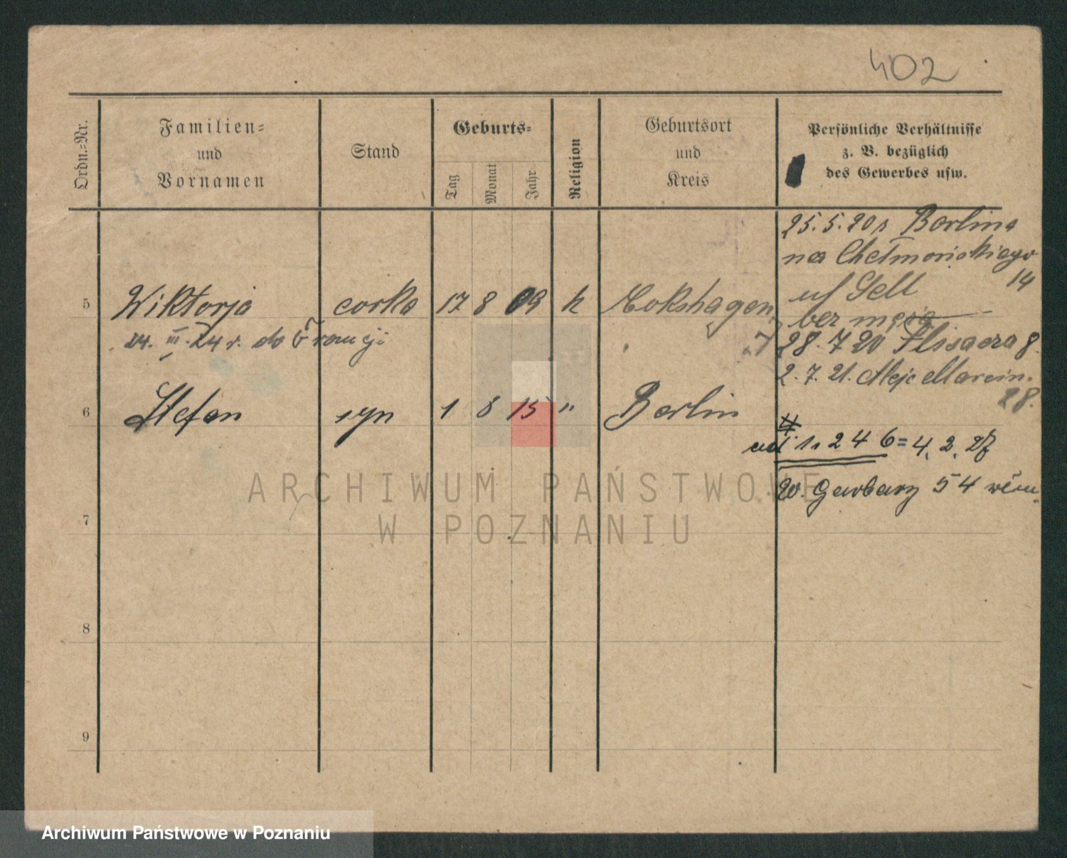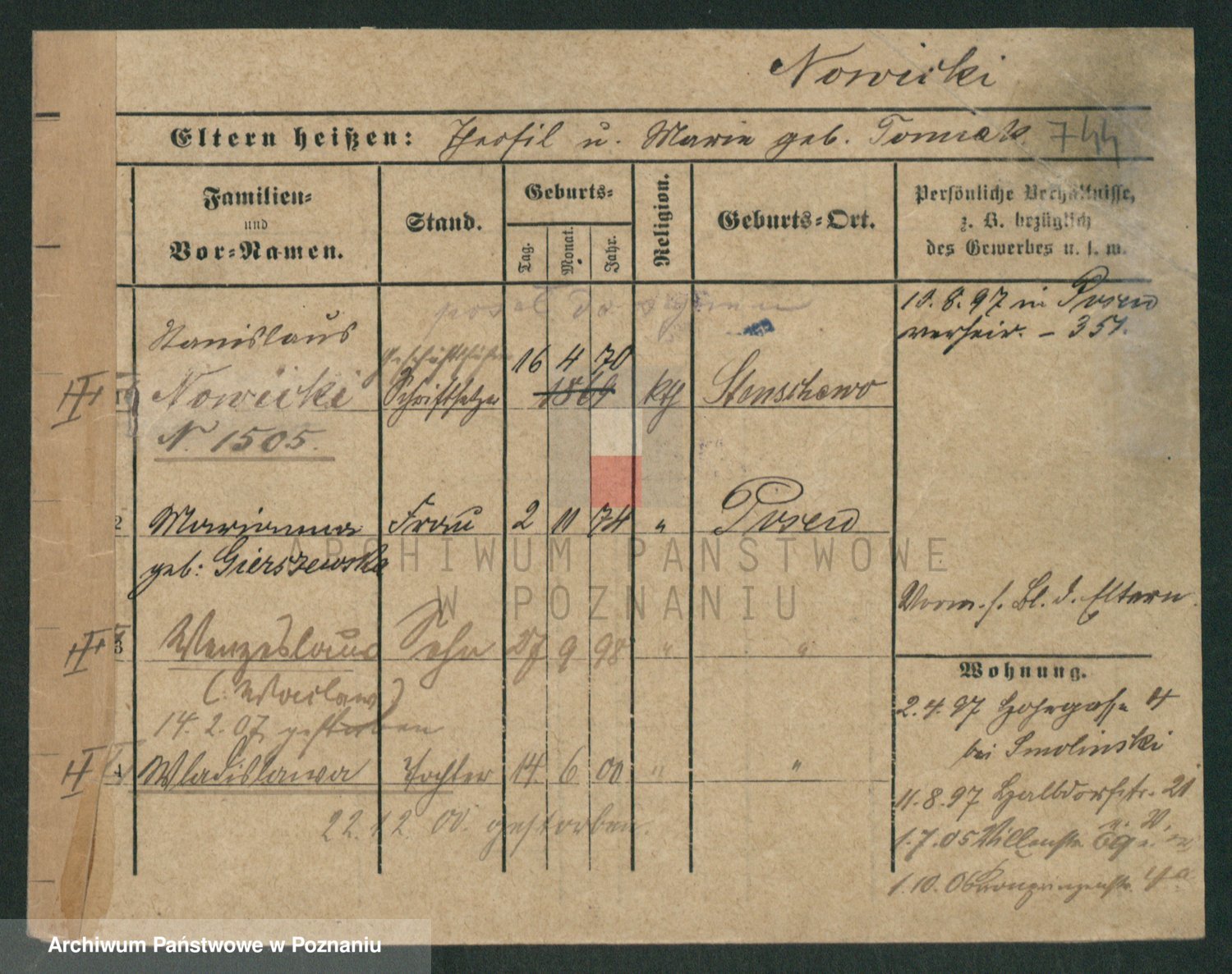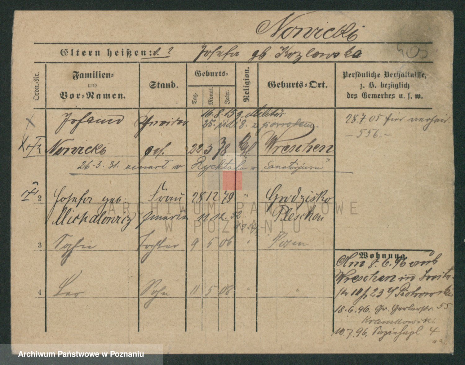 Podgląd karty osobowej dostępny jest po kliknięciu na nazwisko lub ikonkę karty. Można dokonywać powiększenia (ikony na górze) lub przechodzić między kolejnymi skanami (strzałki po bokach).