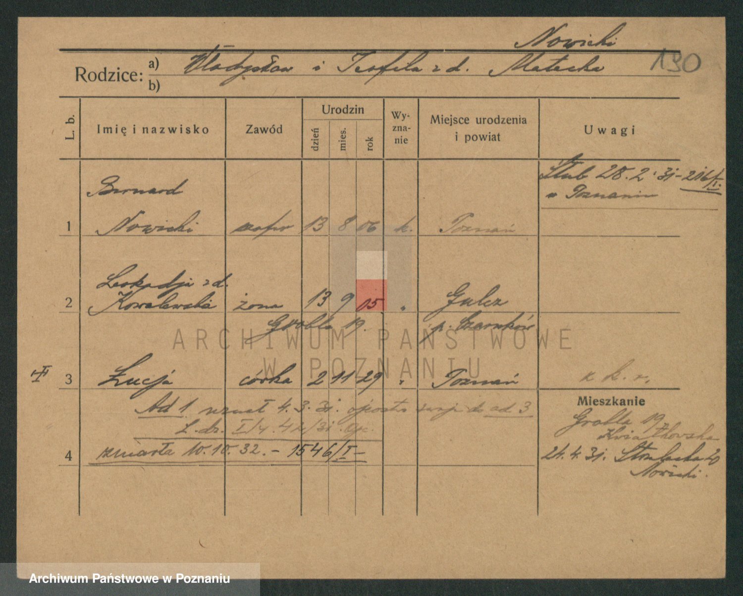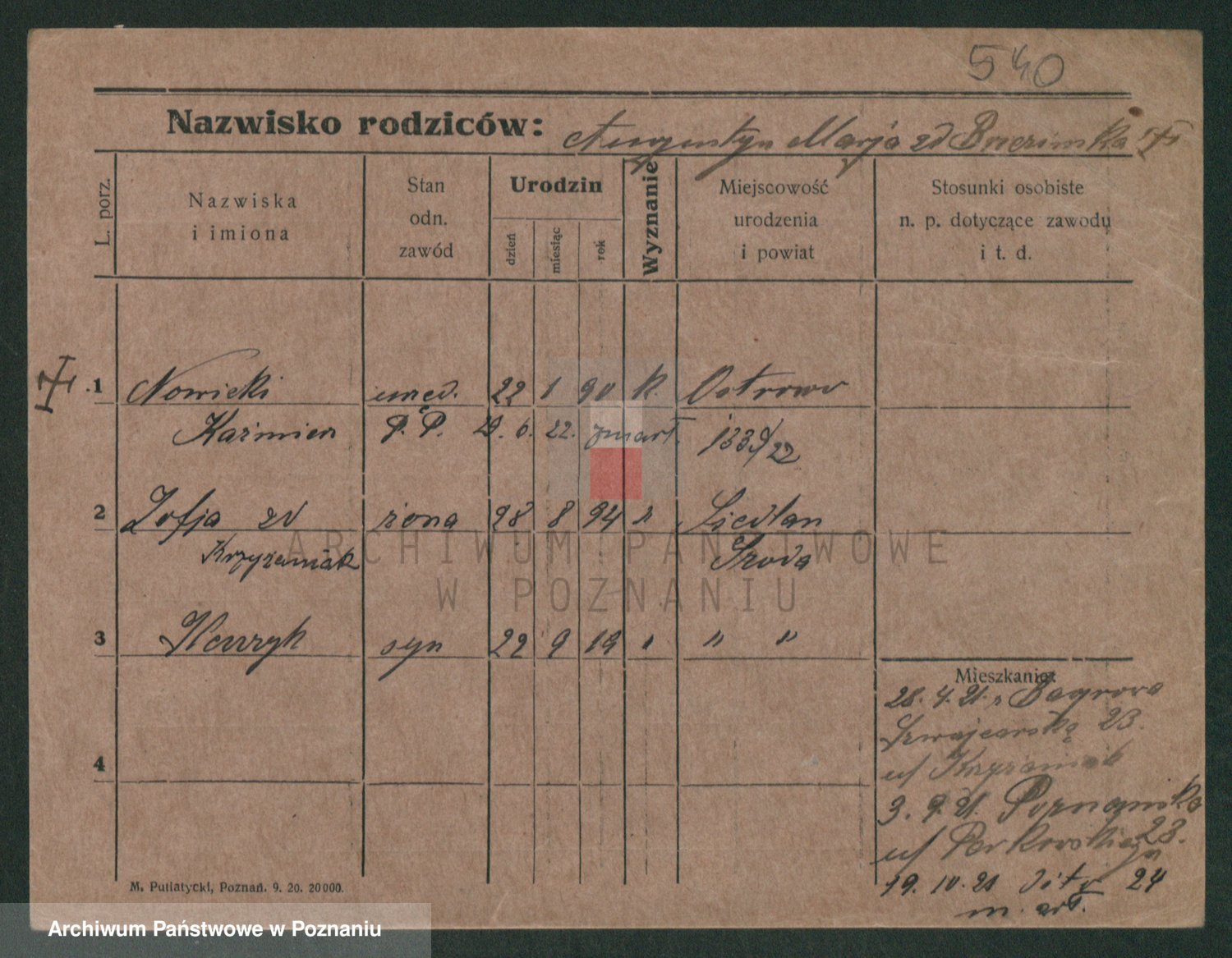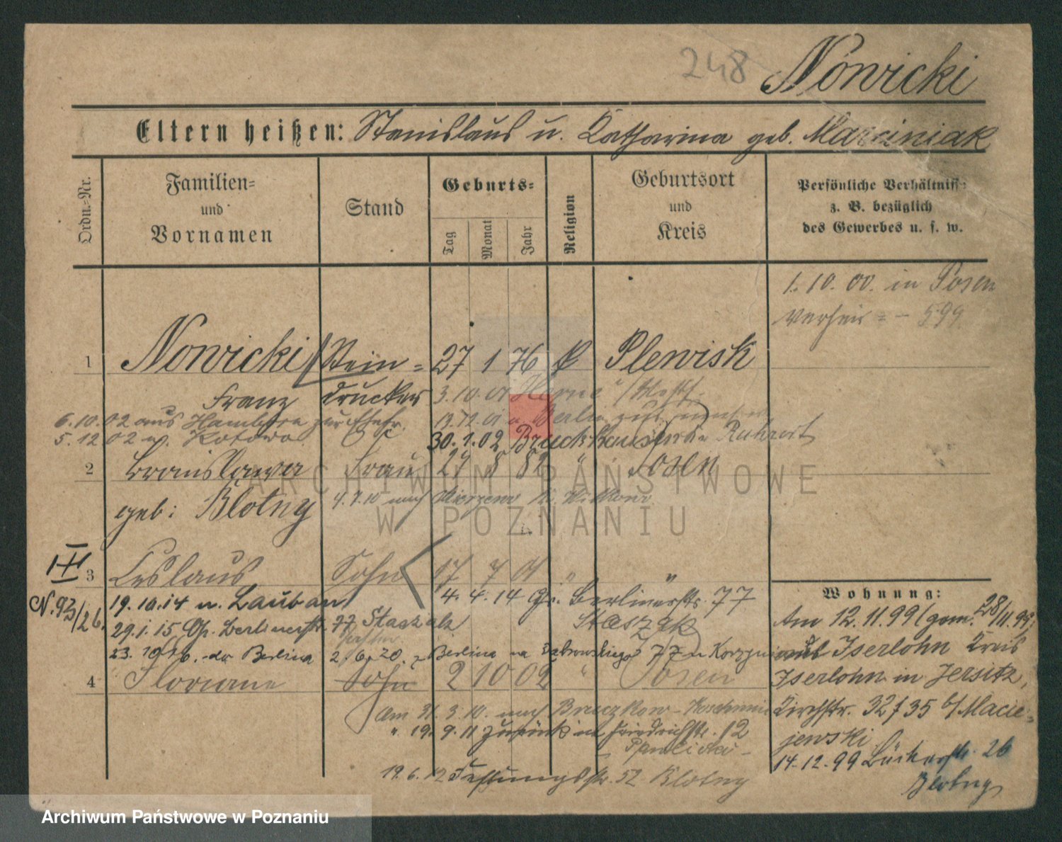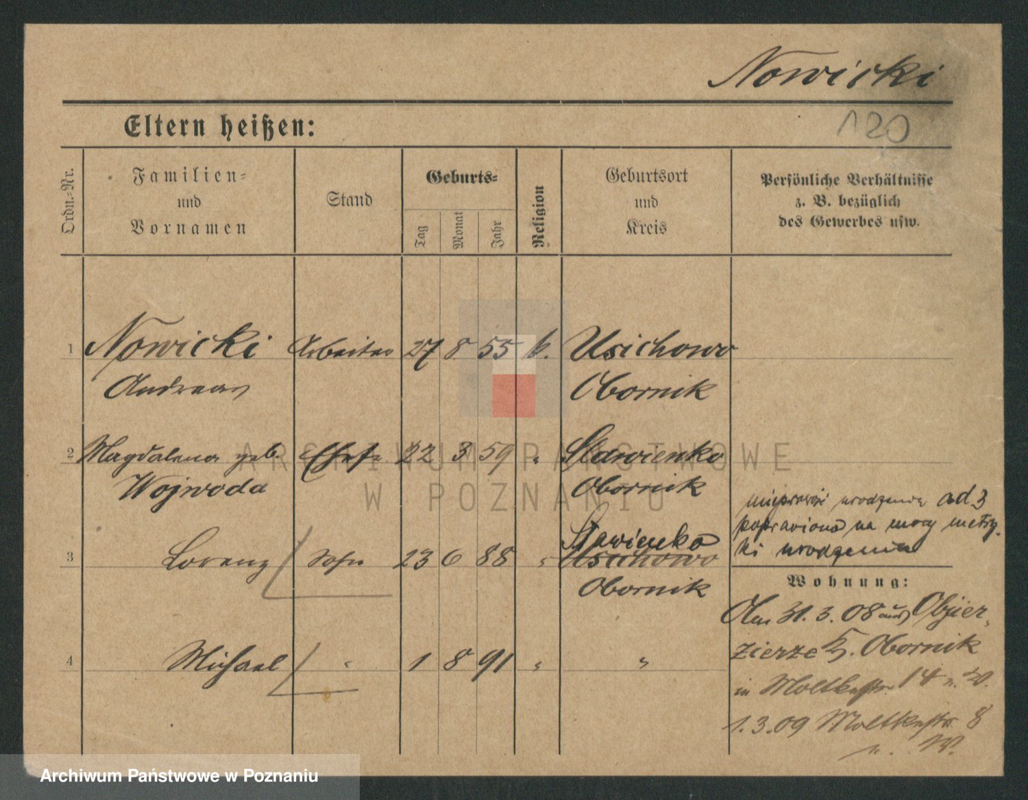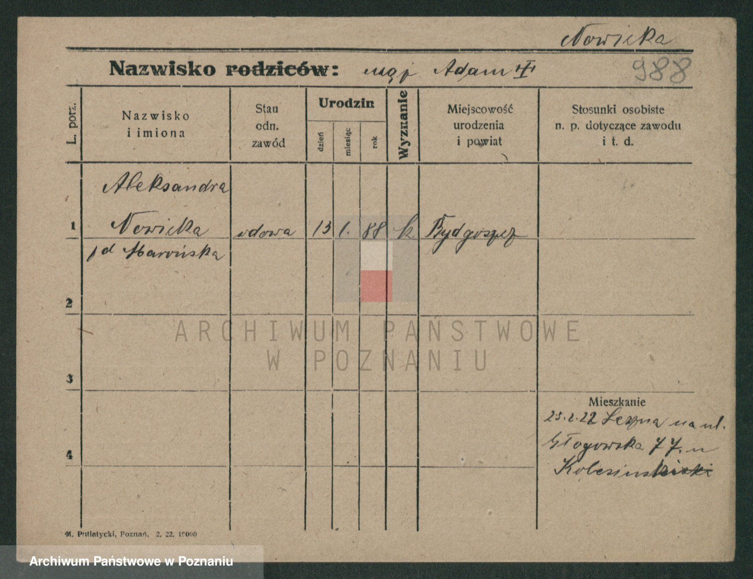 Podgląd karty osobowej dostępny jest po kliknięciu na nazwisko lub ikonkę karty. Można dokonywać powiększenia (ikony na górze) lub przechodzić między kolejnymi skanami (strzałki po bokach).