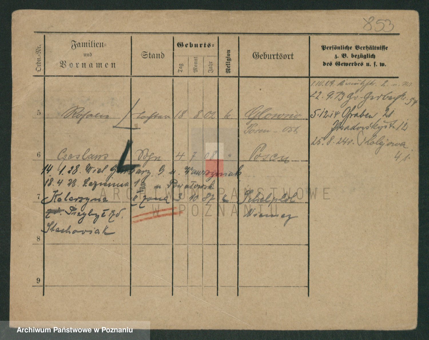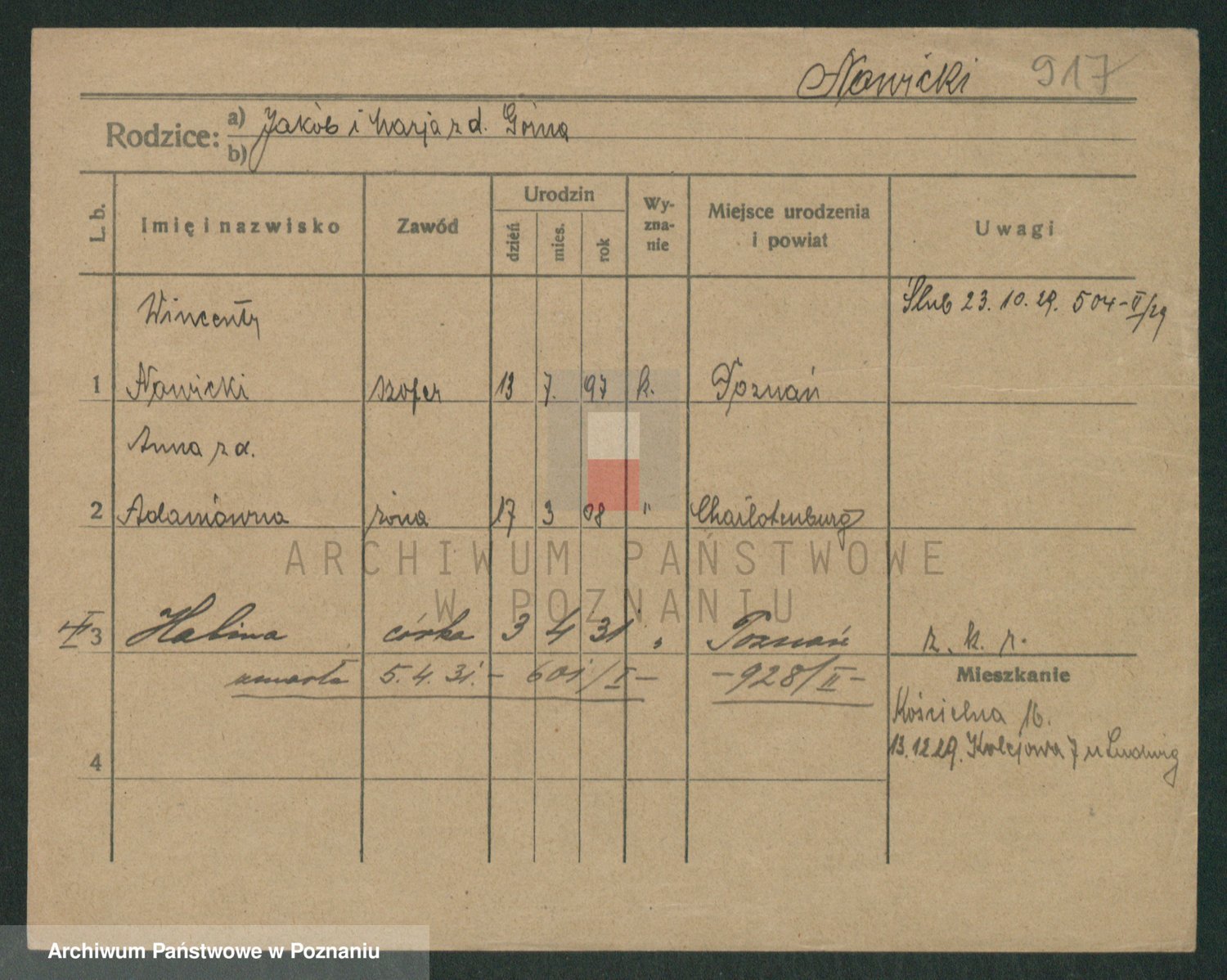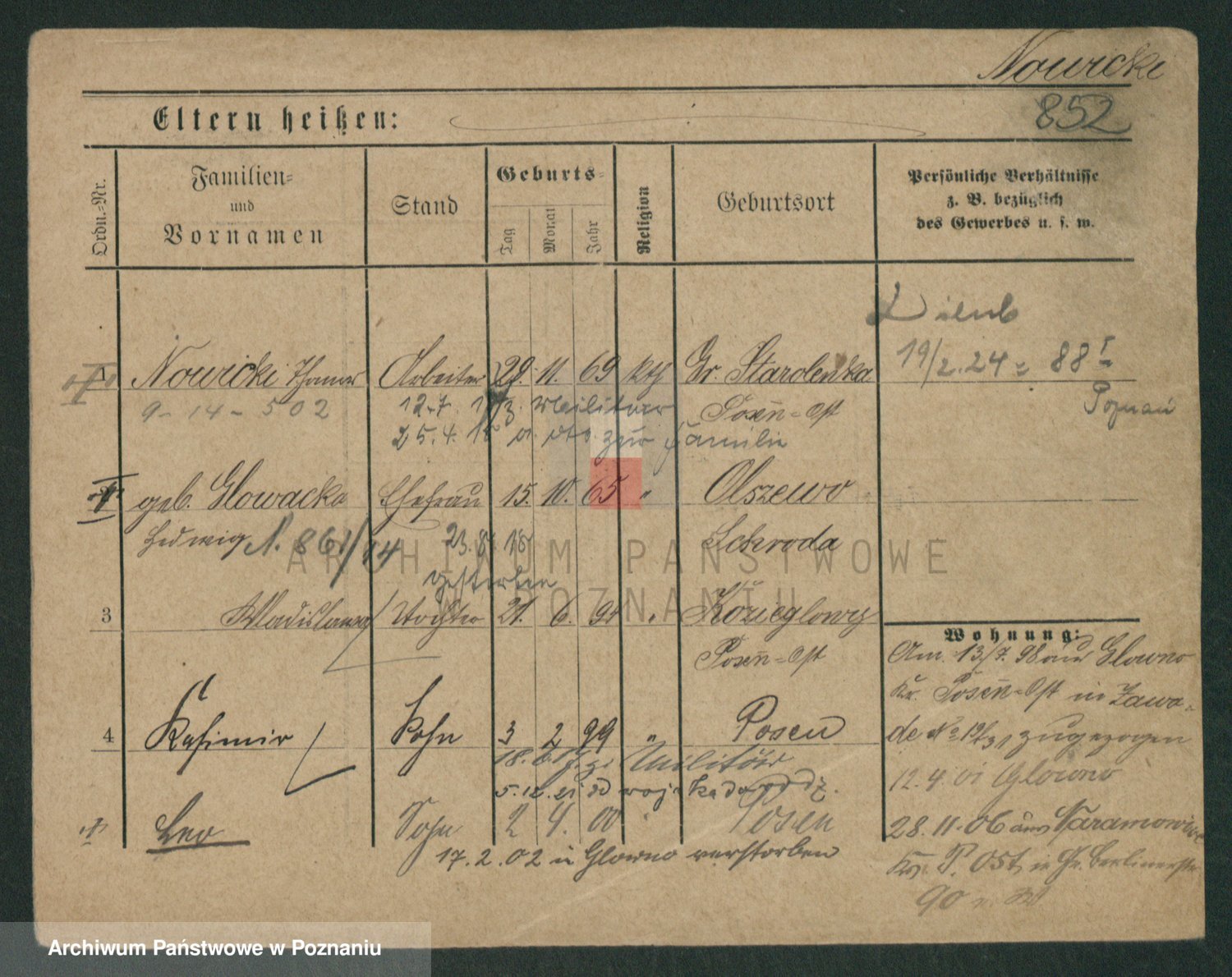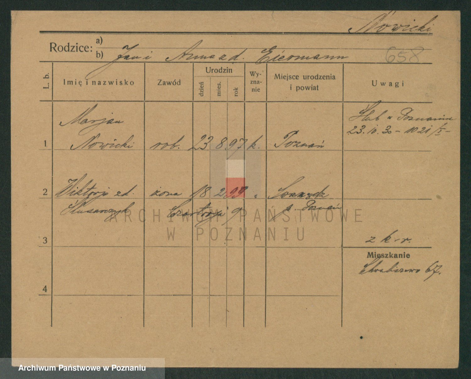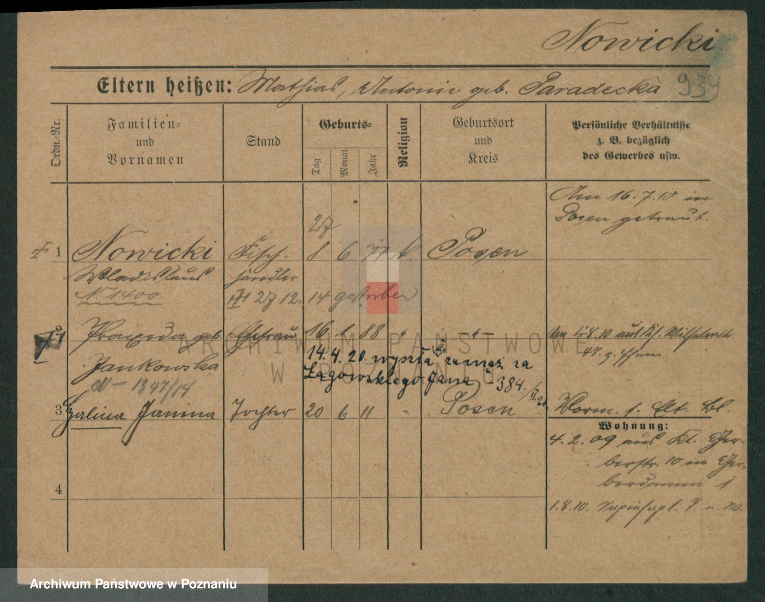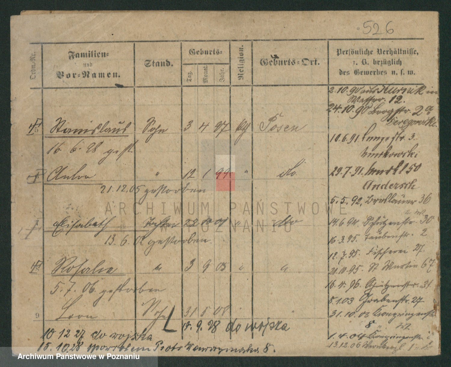 Podgląd karty osobowej dostępny jest po kliknięciu na nazwisko lub ikonkę karty. Można dokonywać powiększenia (ikony na górze) lub przechodzić między kolejnymi skanami (strzałki po bokach).