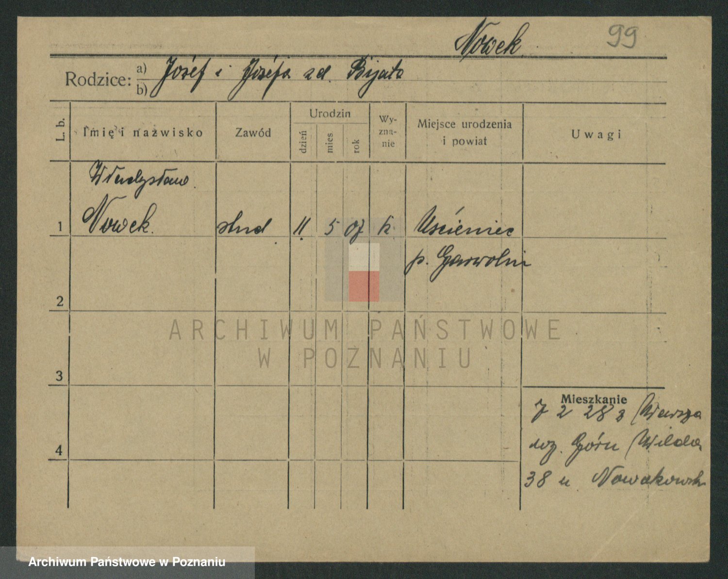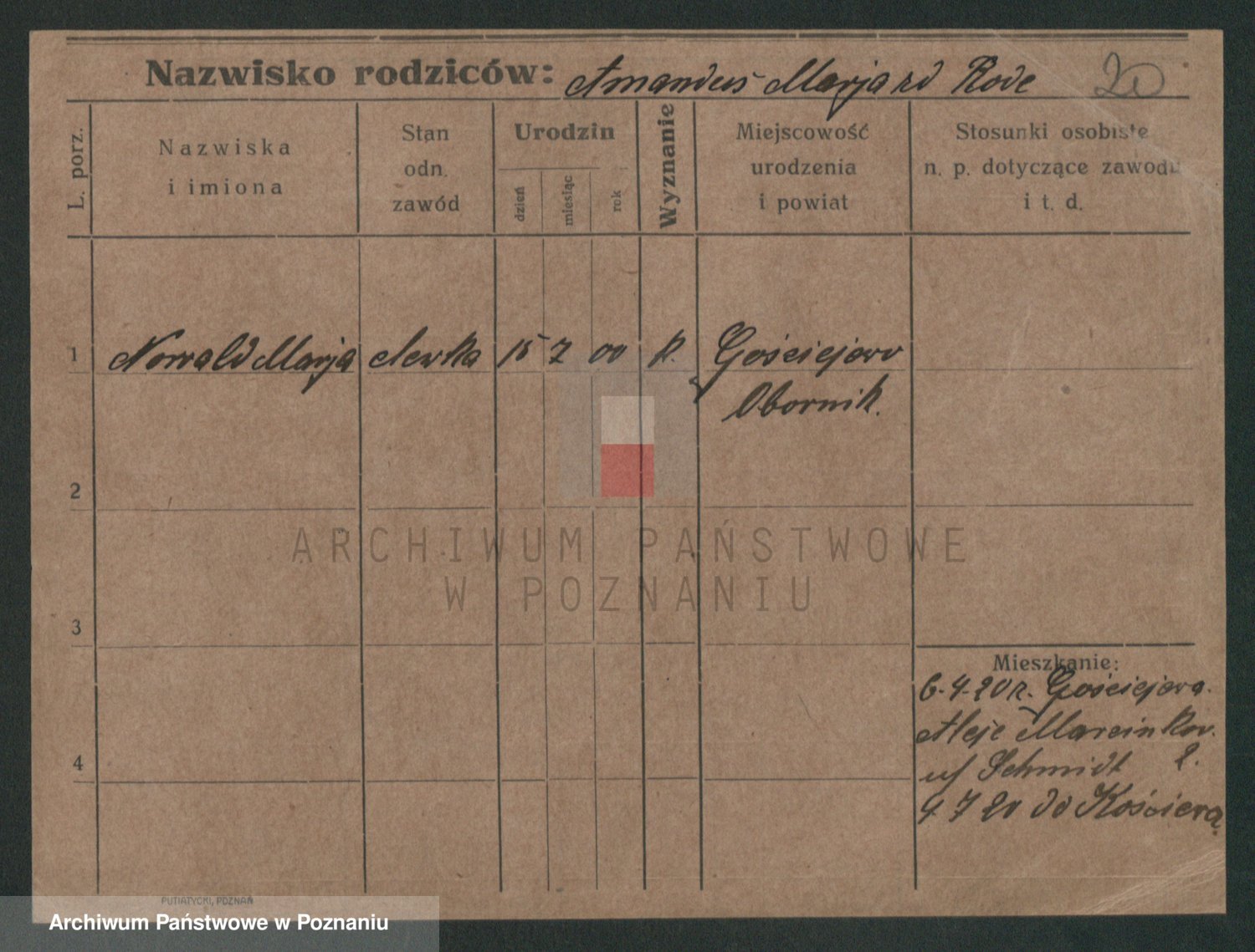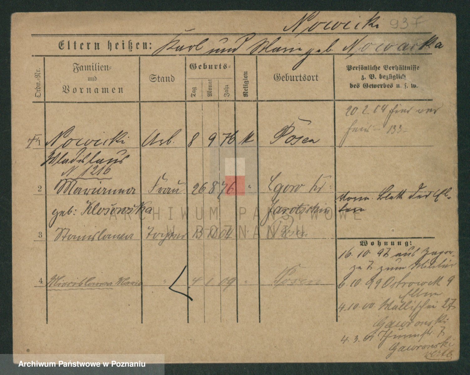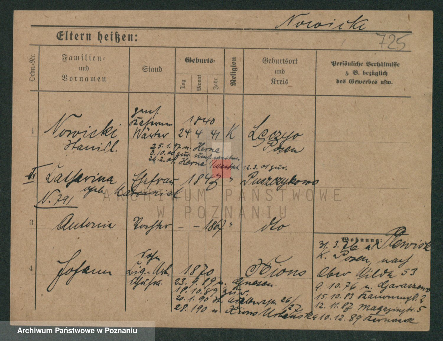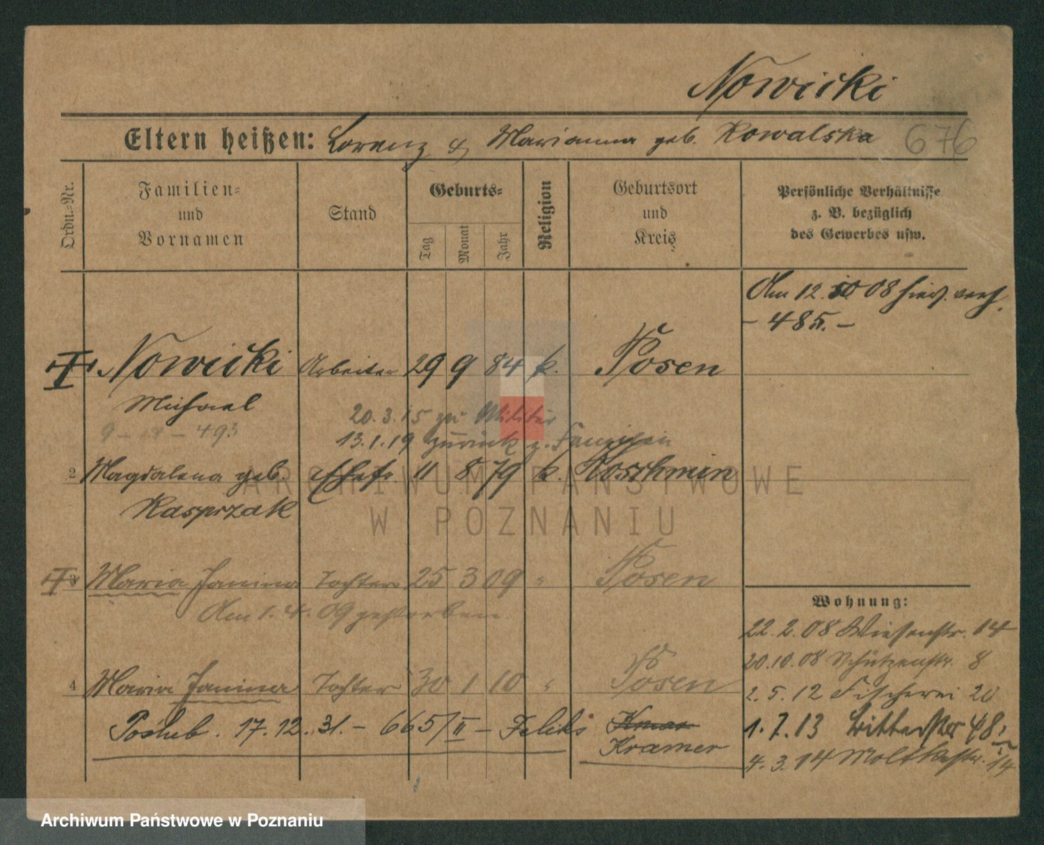 Podgląd karty osobowej dostępny jest po kliknięciu na nazwisko lub ikonkę karty. Można dokonywać powiększenia (ikony na górze) lub przechodzić między kolejnymi skanami (strzałki po bokach).