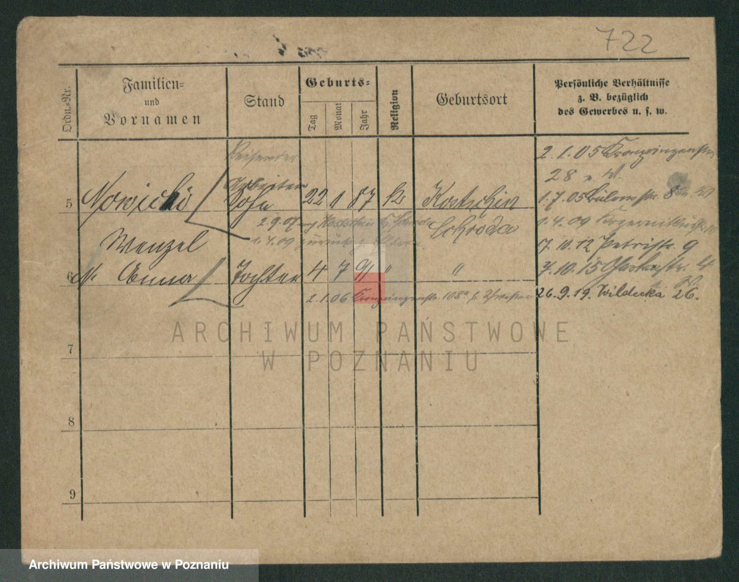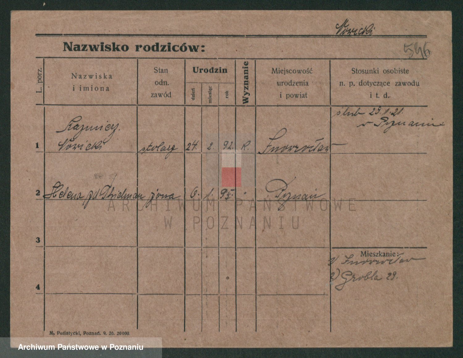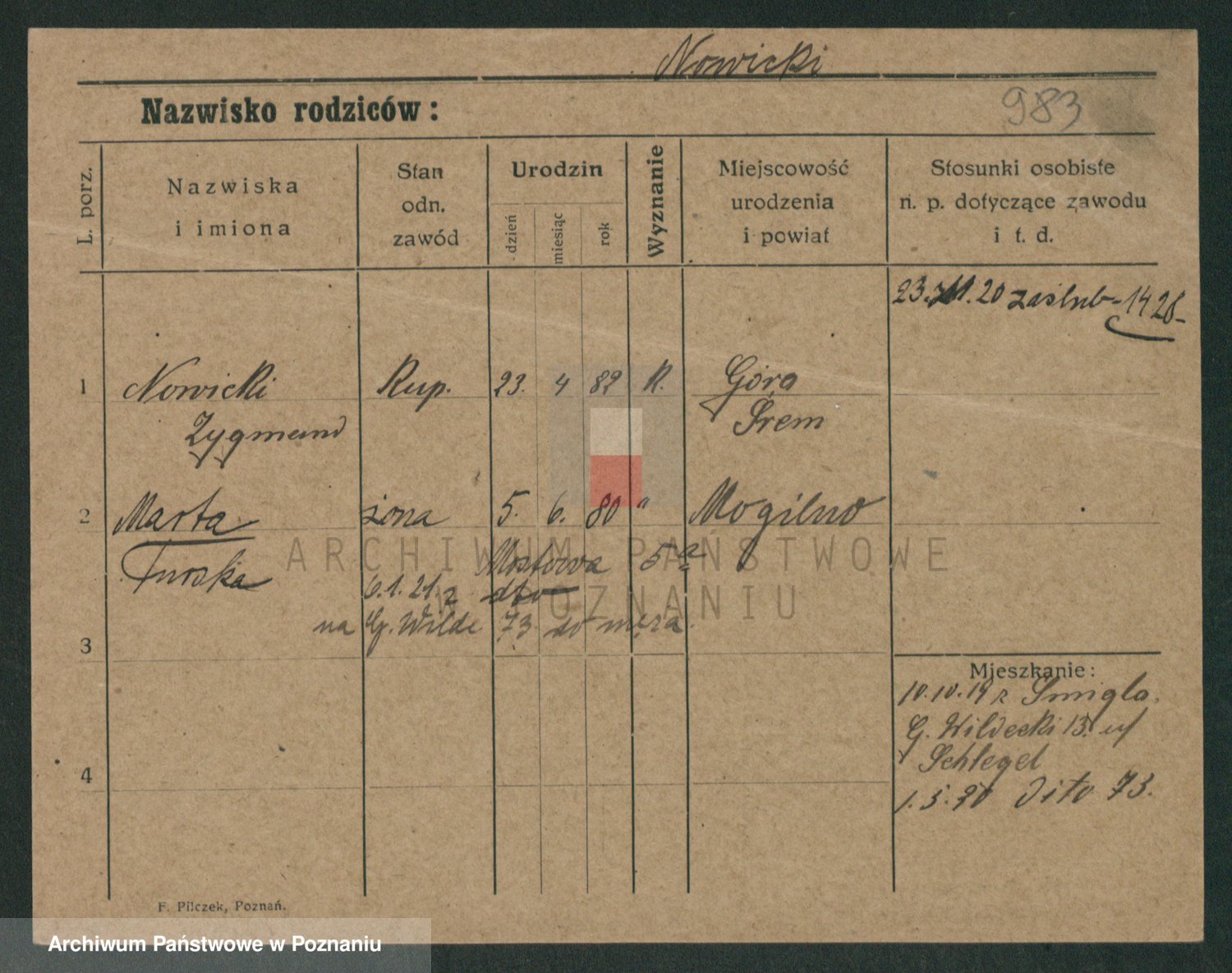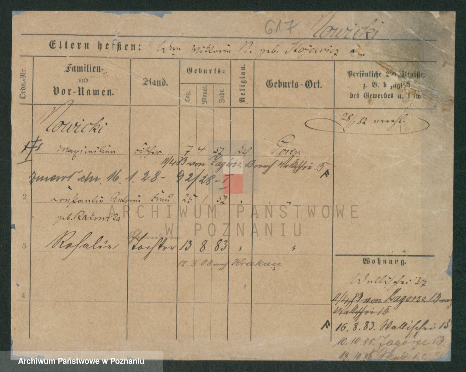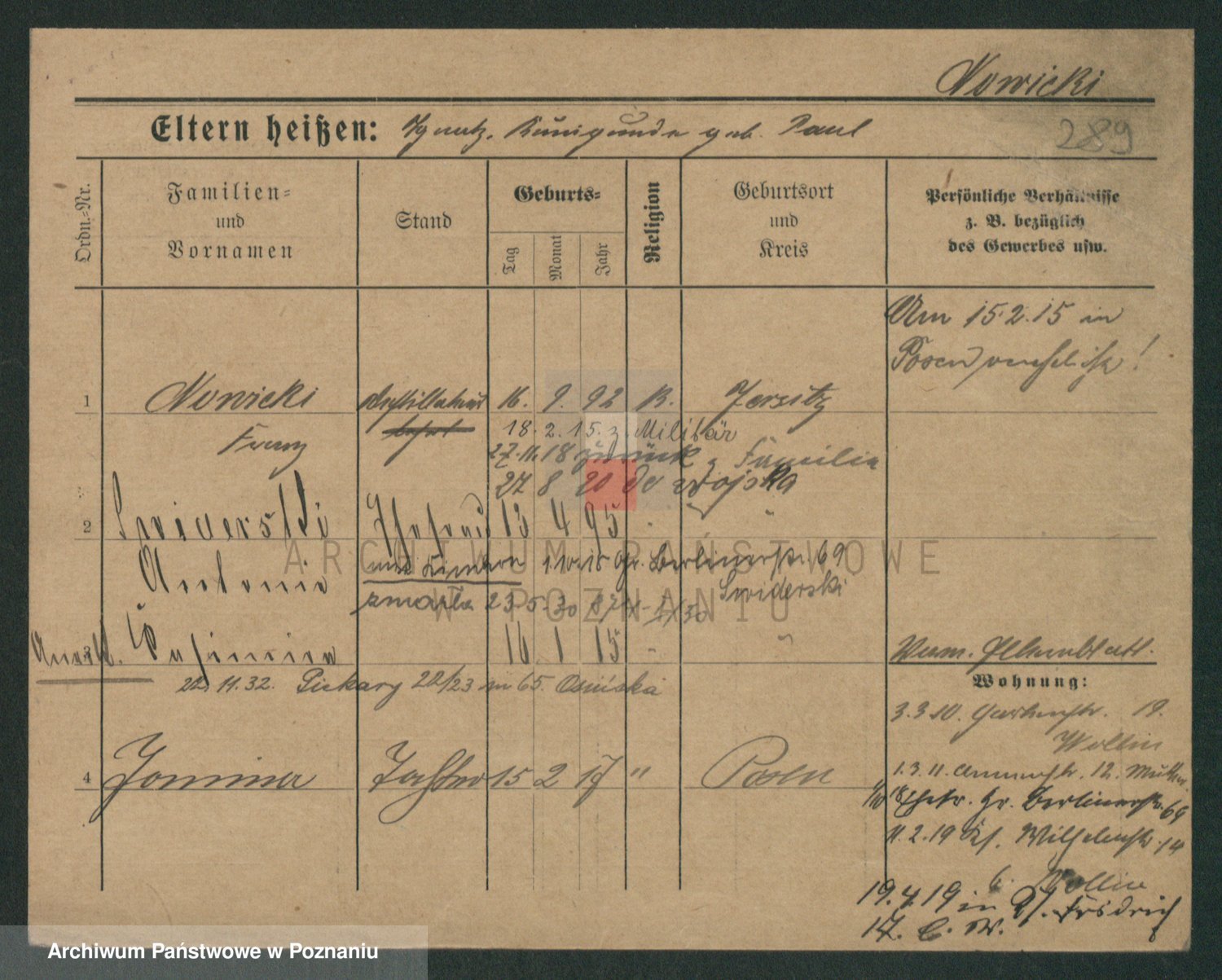 Podgląd karty osobowej dostępny jest po kliknięciu na nazwisko lub ikonkę karty. Można dokonywać powiększenia (ikony na górze) lub przechodzić między kolejnymi skanami (strzałki po bokach).