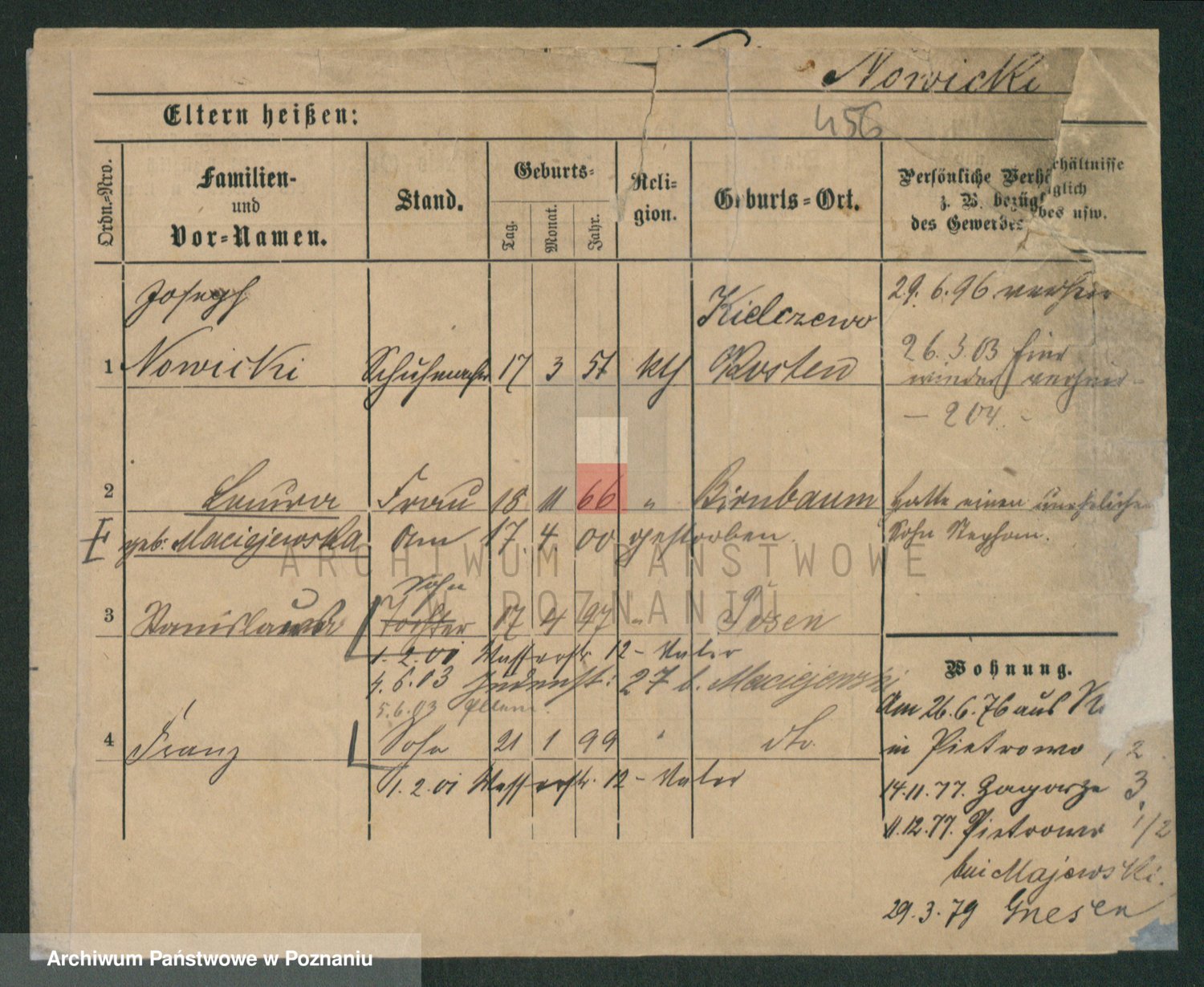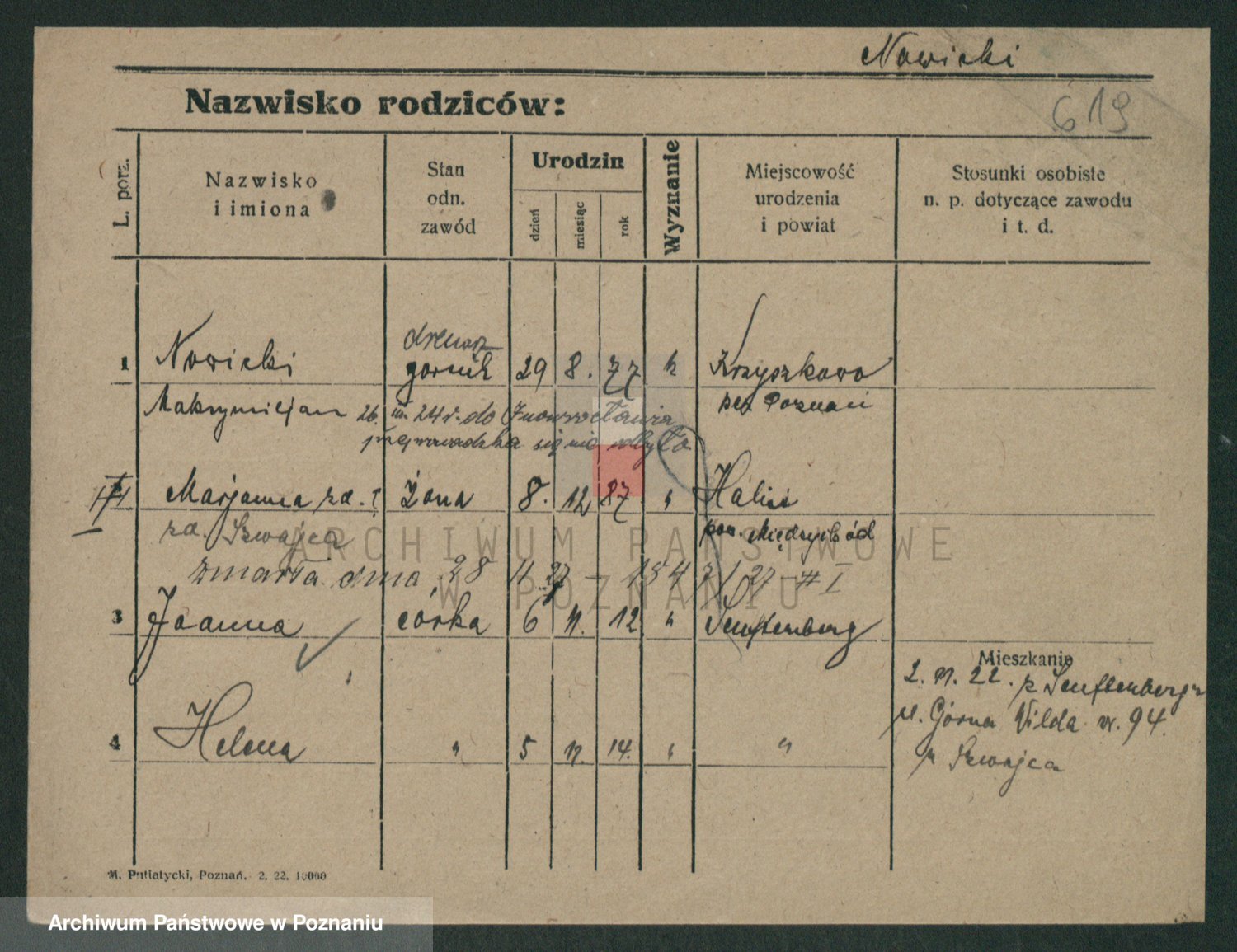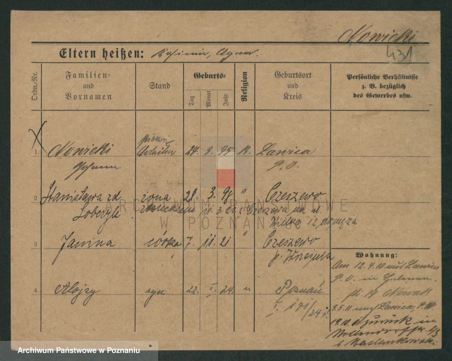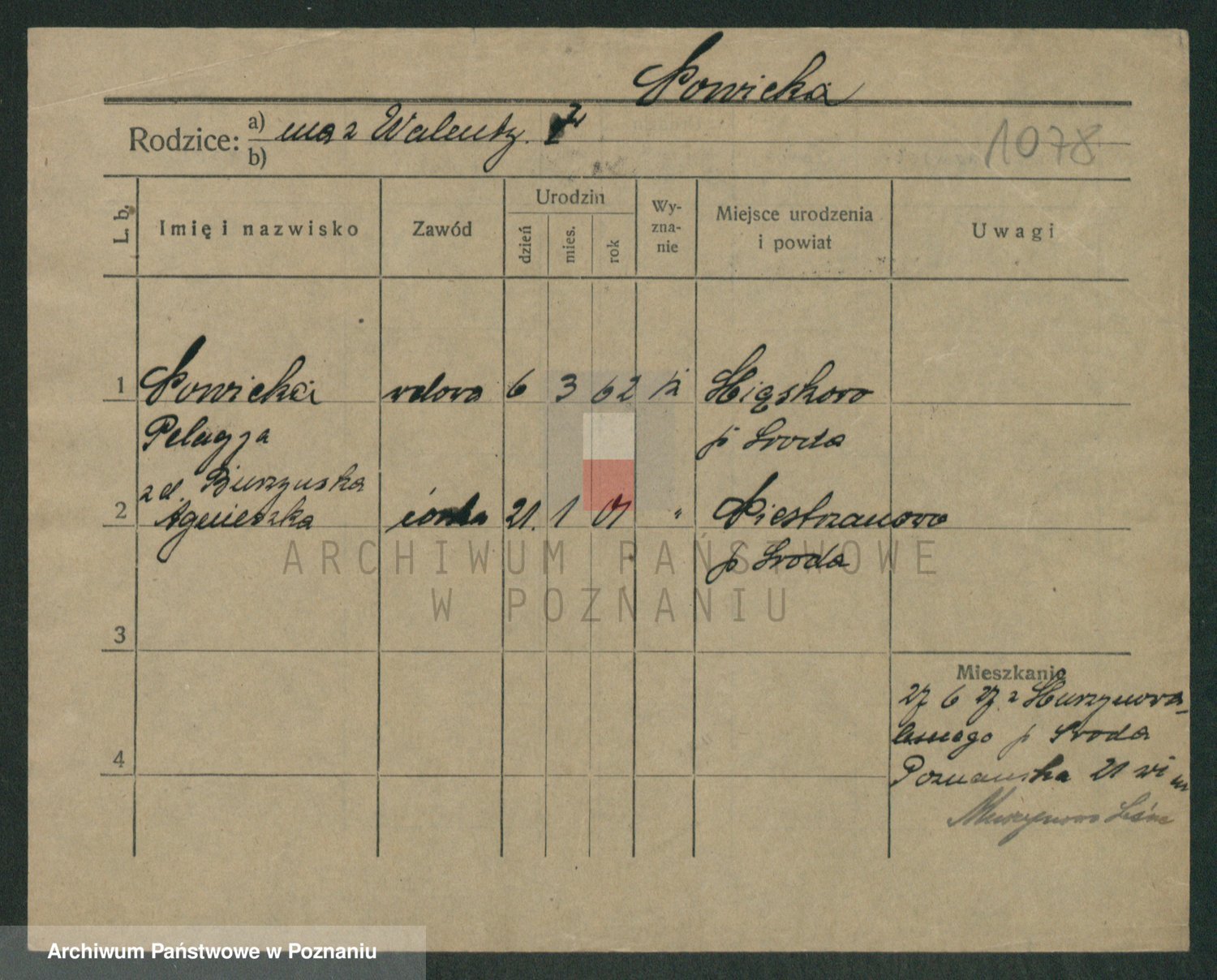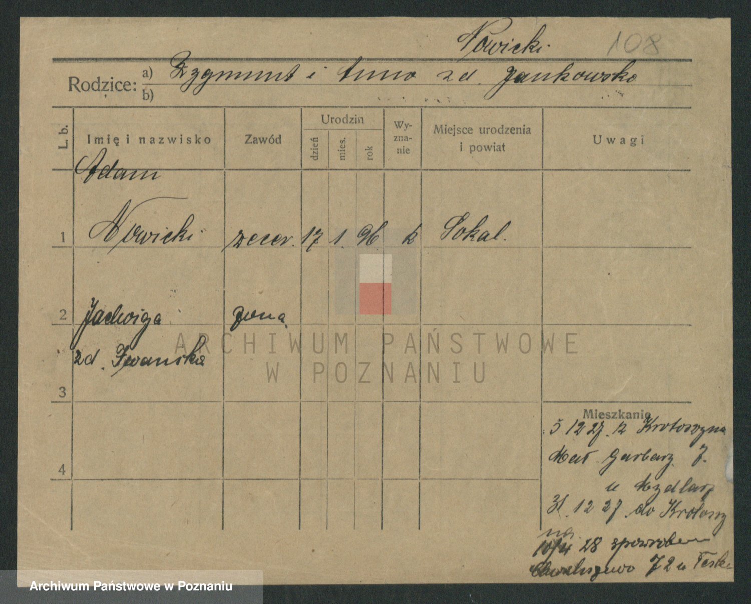 Podgląd karty osobowej dostępny jest po kliknięciu na nazwisko lub ikonkę karty. Można dokonywać powiększenia (ikony na górze) lub przechodzić między kolejnymi skanami (strzałki po bokach).