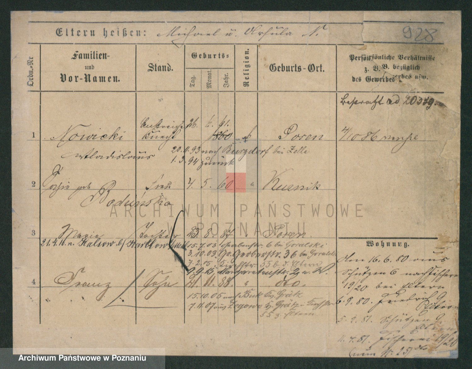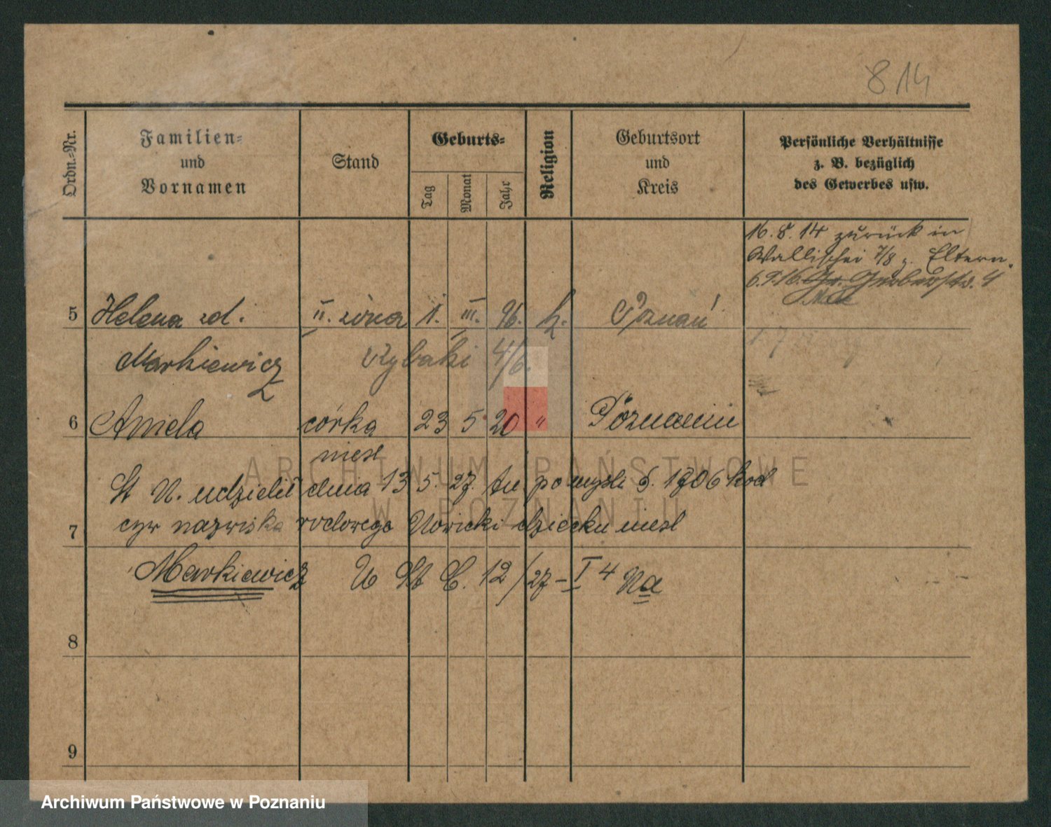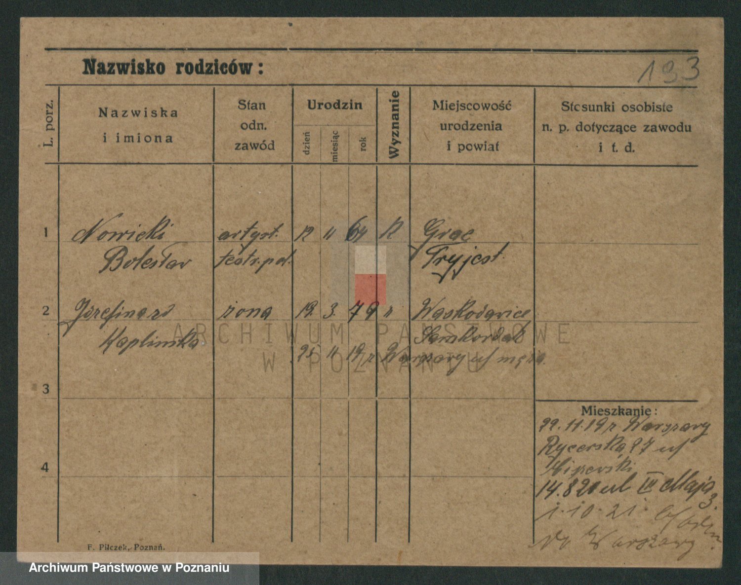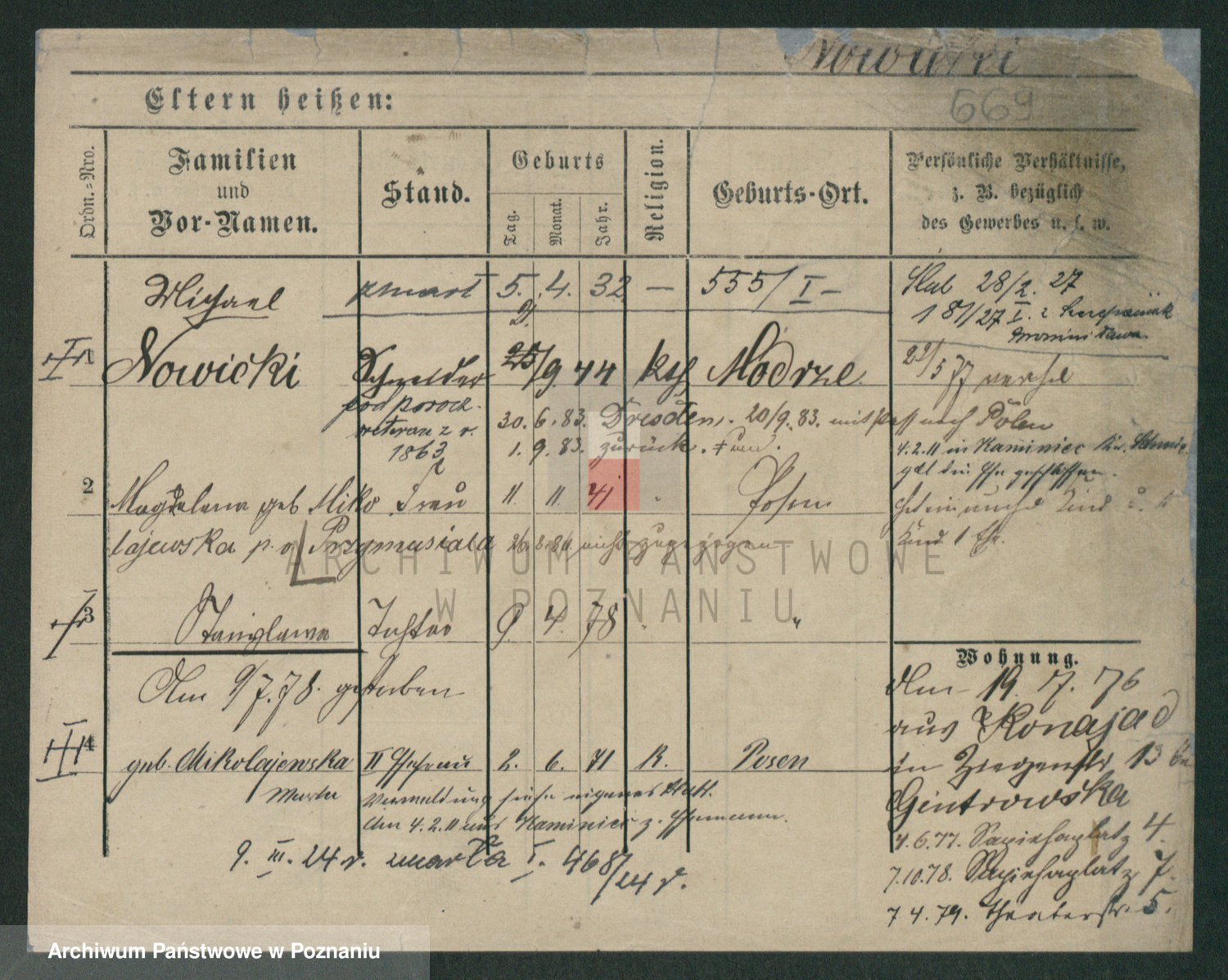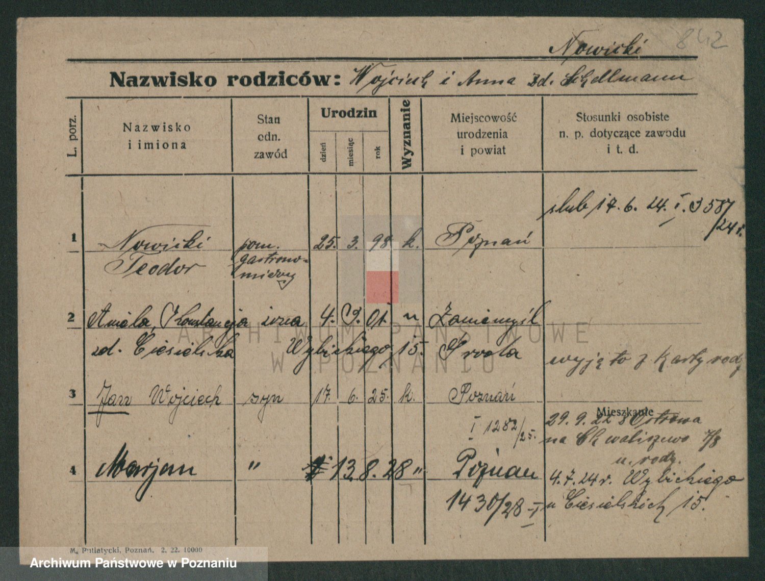 Podgląd karty osobowej dostępny jest po kliknięciu na nazwisko lub ikonkę karty. Można dokonywać powiększenia (ikony na górze) lub przechodzić między kolejnymi skanami (strzałki po bokach).