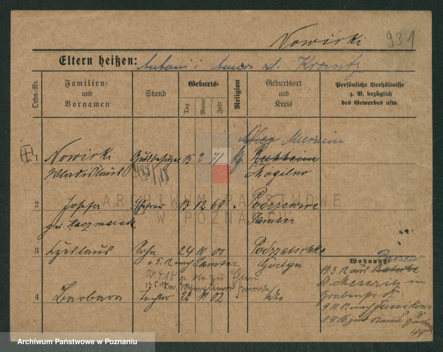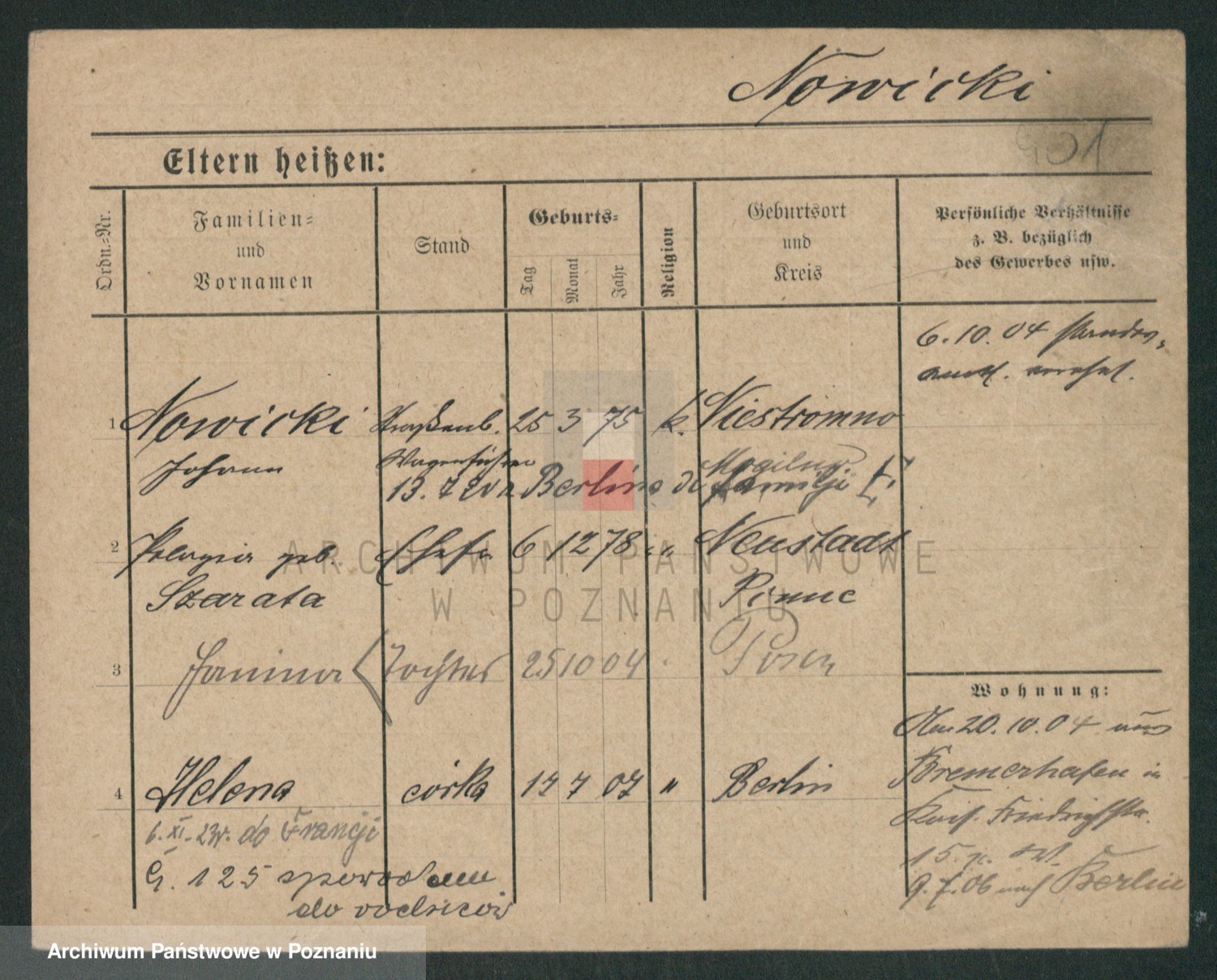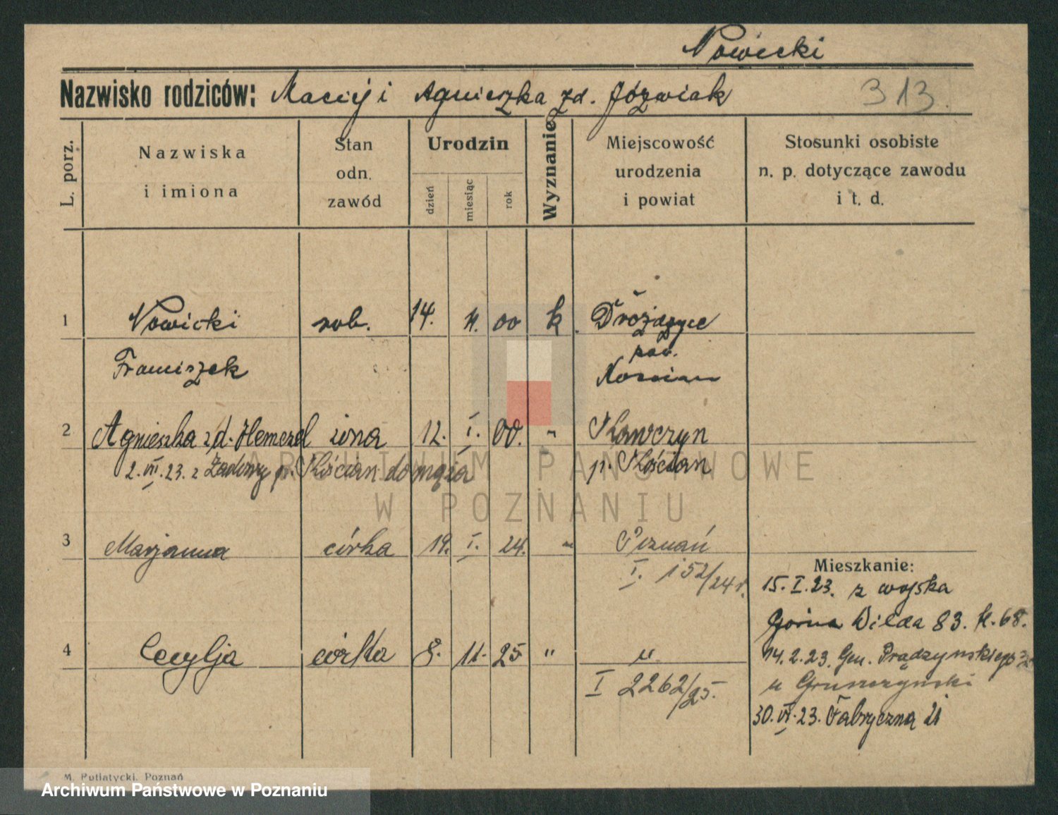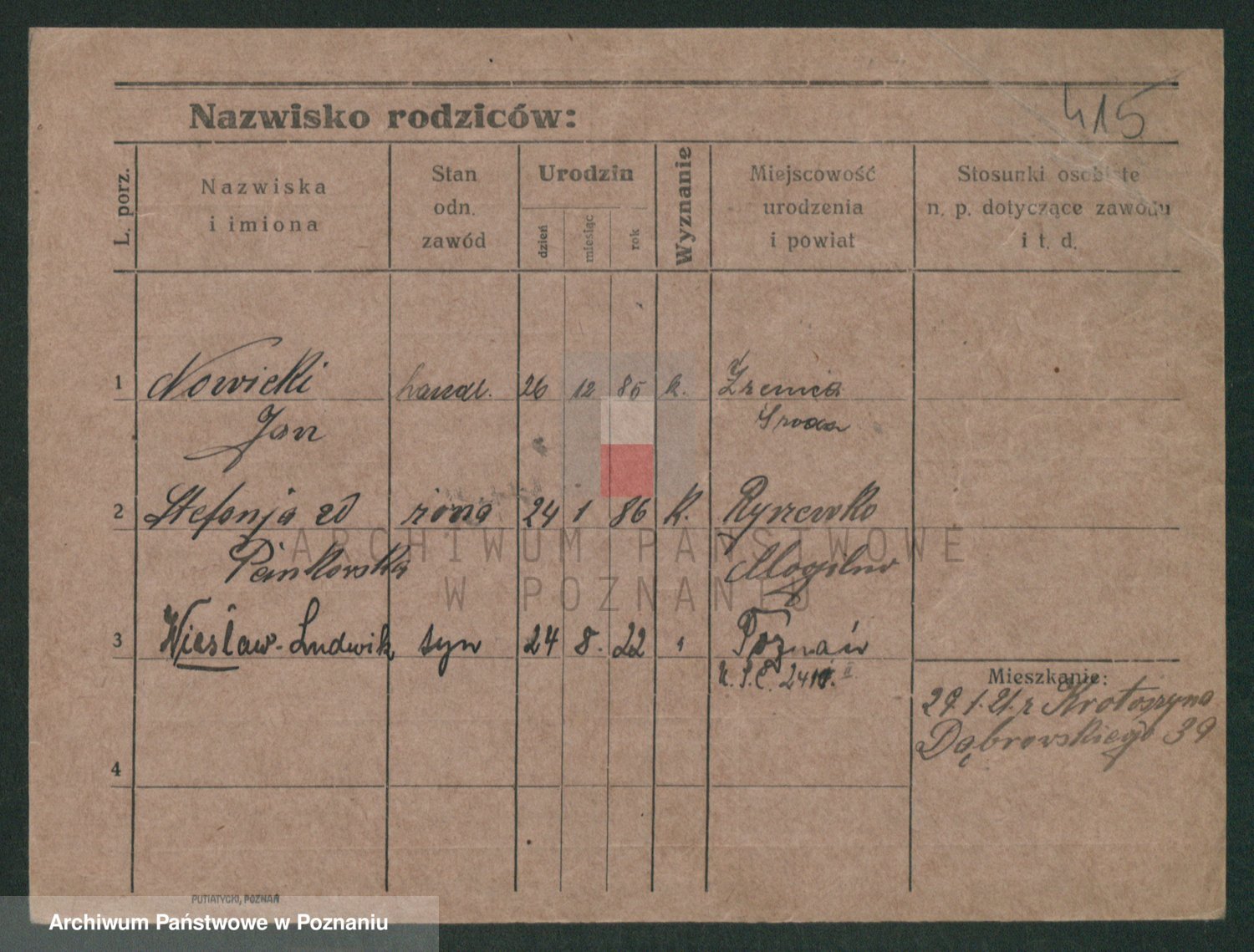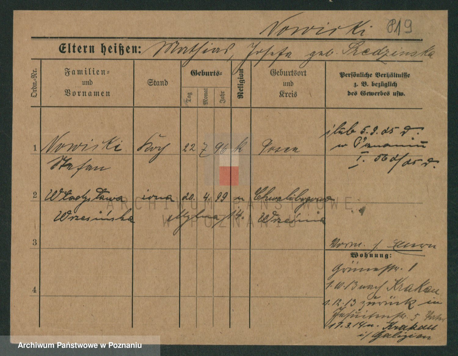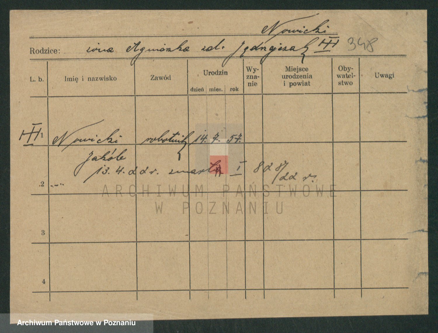 Podgląd karty osobowej dostępny jest po kliknięciu na nazwisko lub ikonkę karty. Można dokonywać powiększenia (ikony na górze) lub przechodzić między kolejnymi skanami (strzałki po bokach).