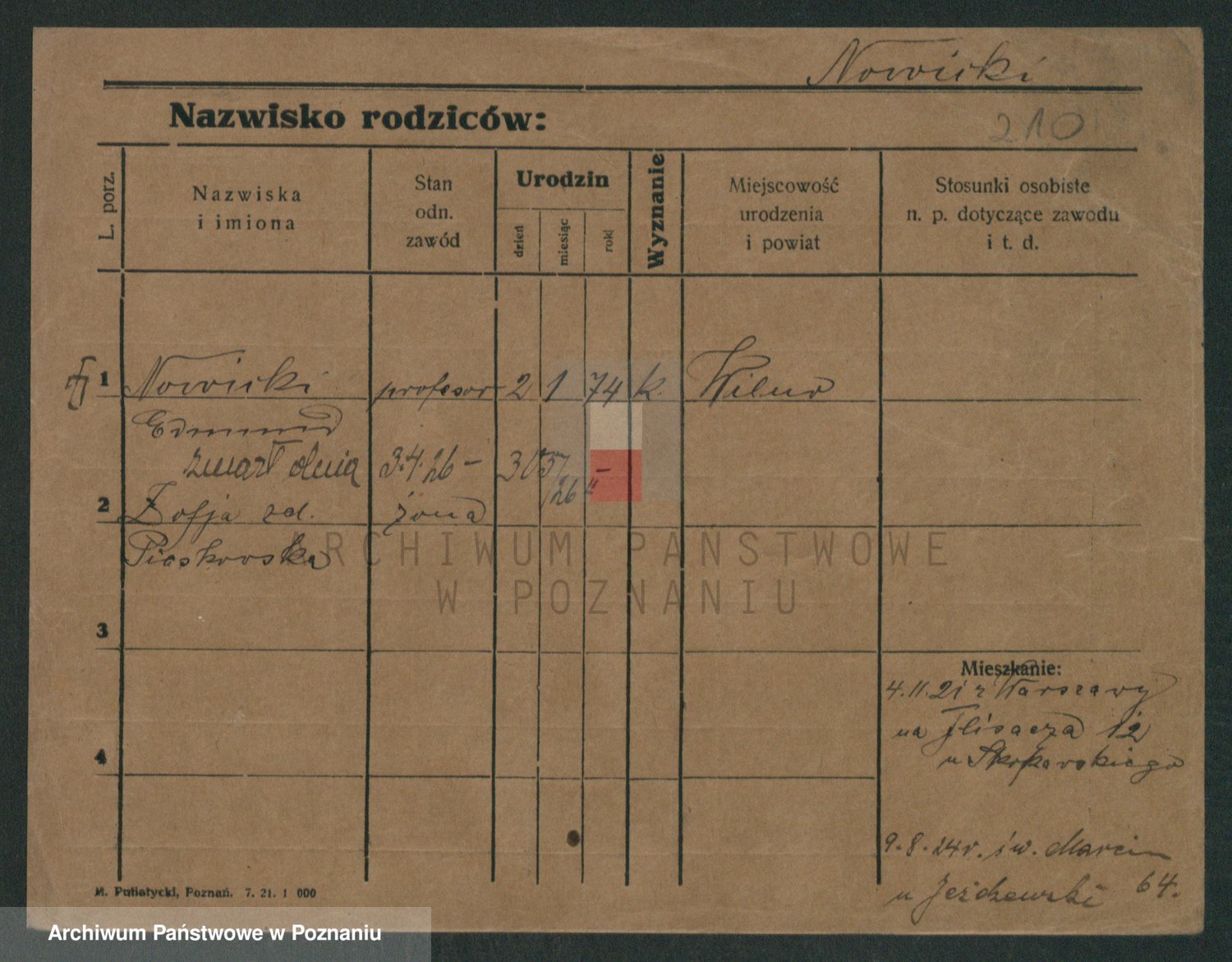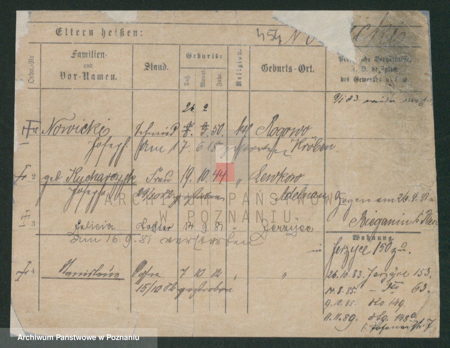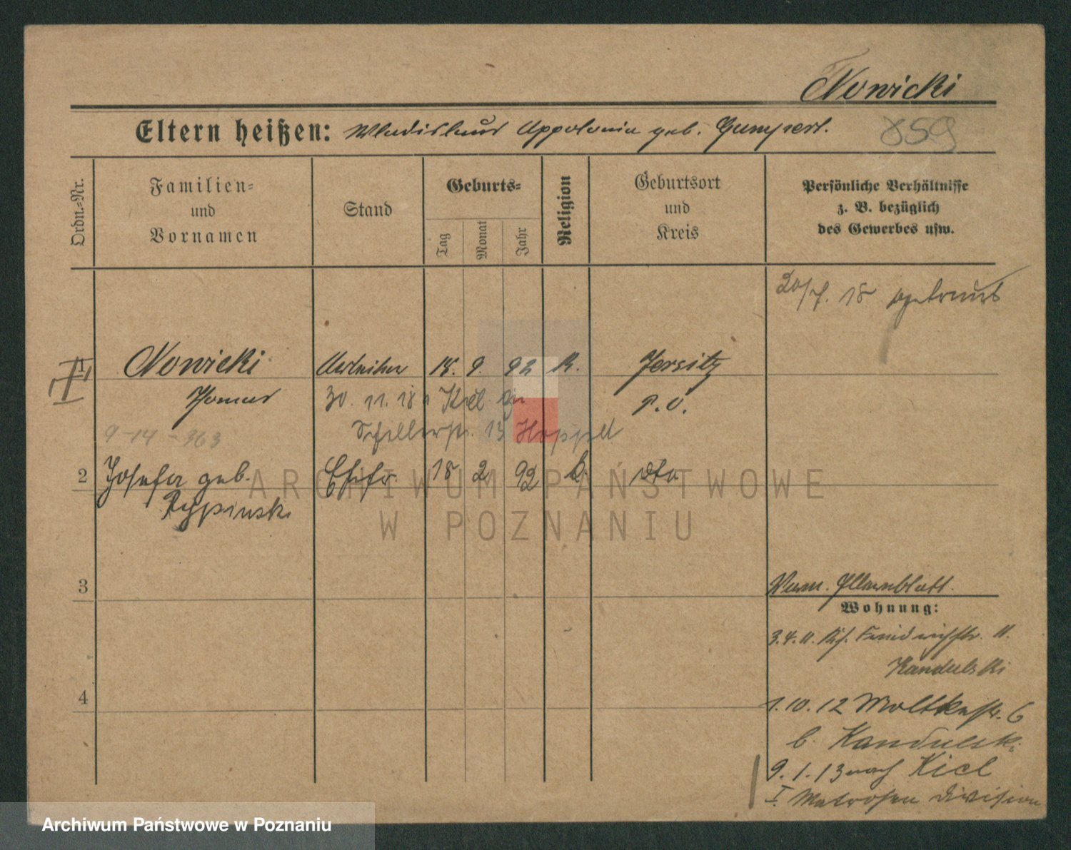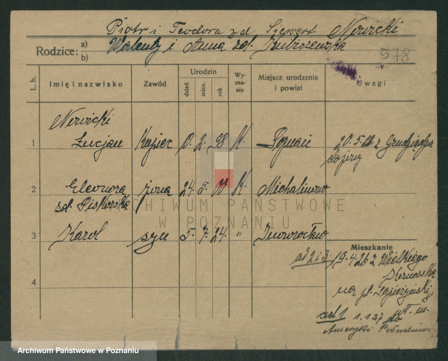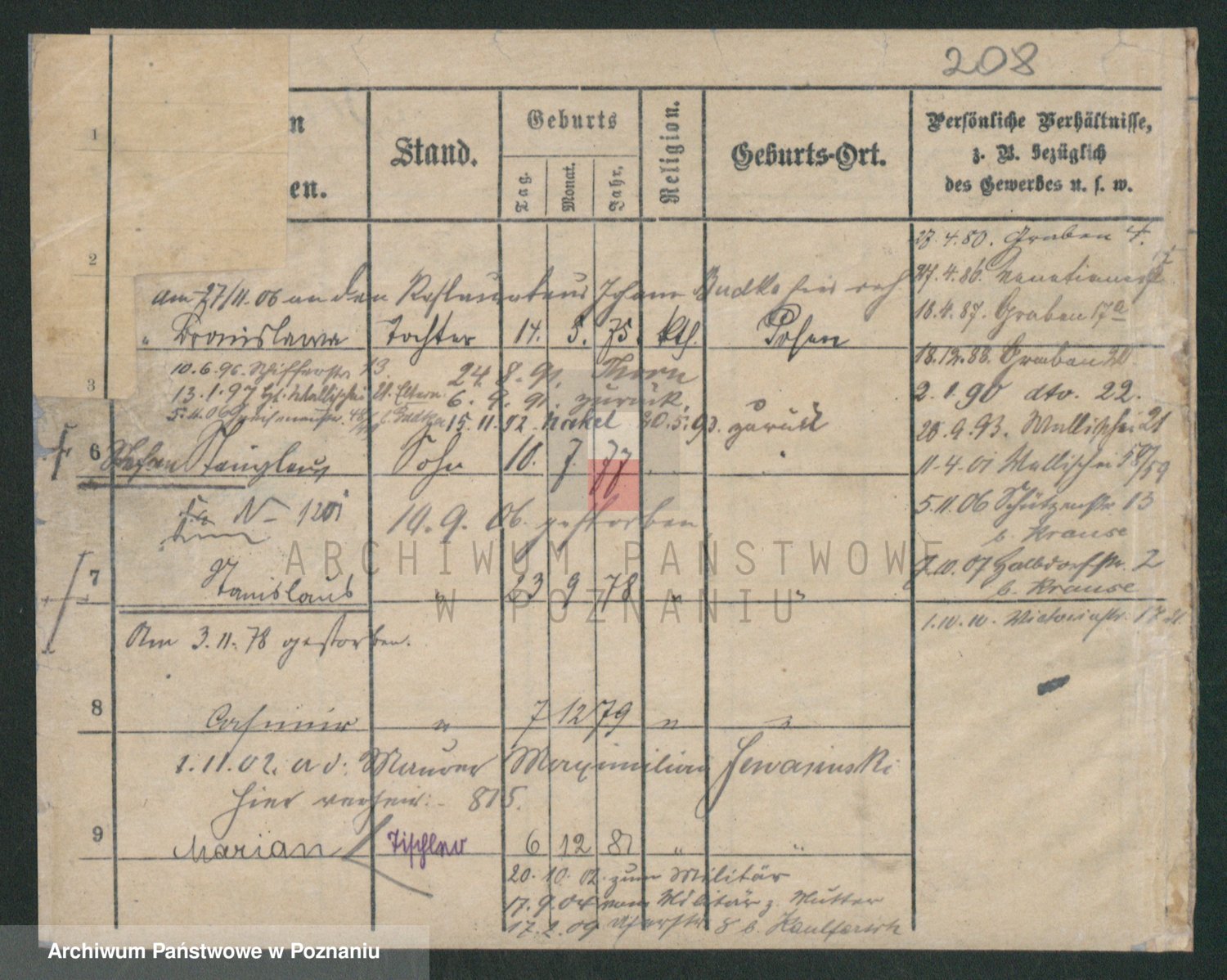 Podgląd karty osobowej dostępny jest po kliknięciu na nazwisko lub ikonkę karty. Można dokonywać powiększenia (ikony na górze) lub przechodzić między kolejnymi skanami (strzałki po bokach).