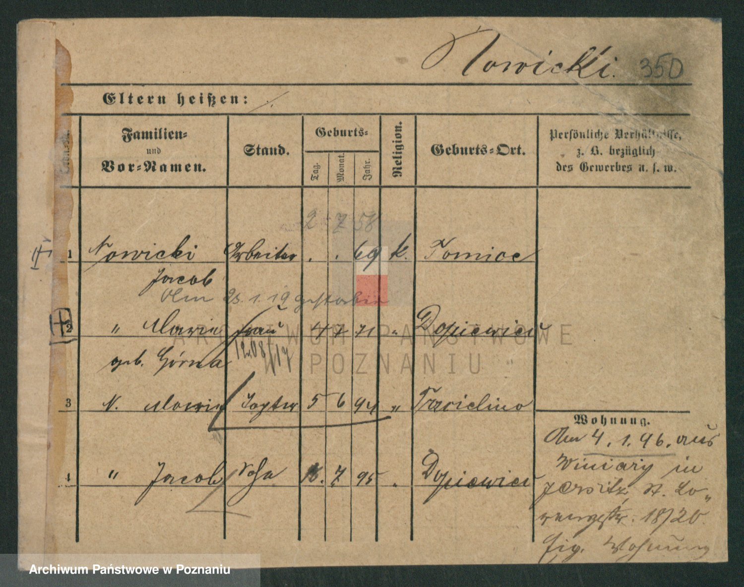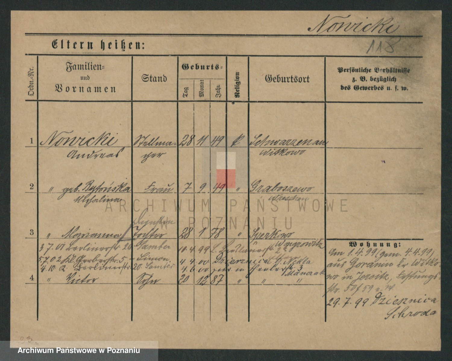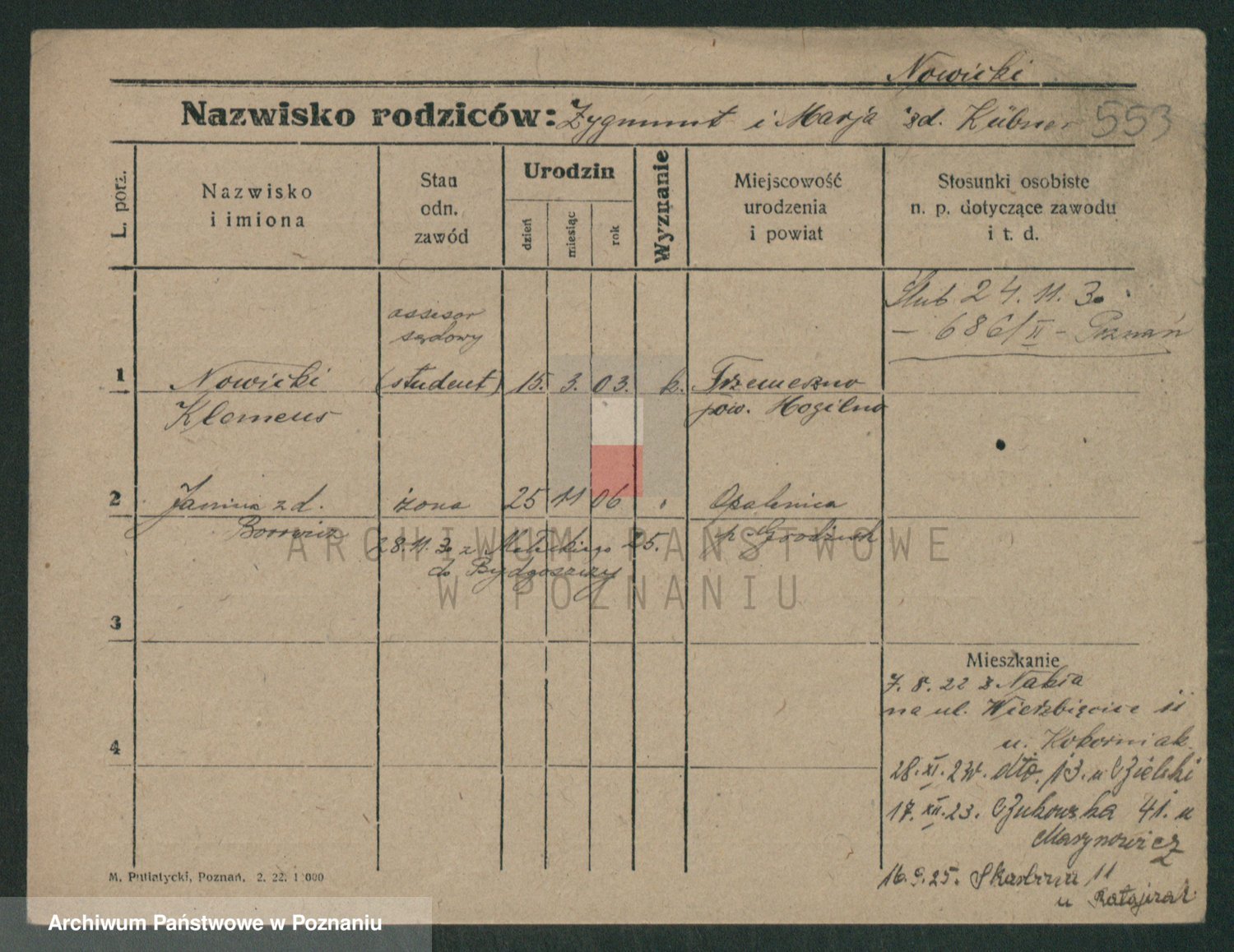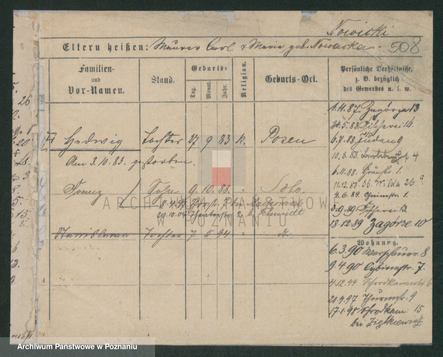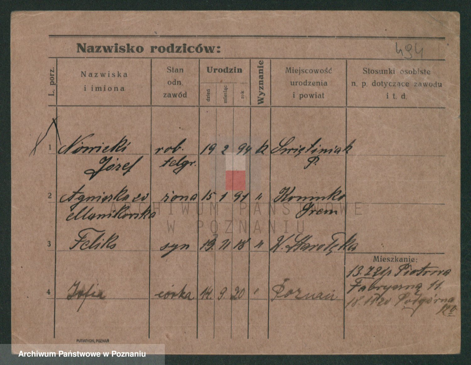 Podgląd karty osobowej dostępny jest po kliknięciu na nazwisko lub ikonkę karty. Można dokonywać powiększenia (ikony na górze) lub przechodzić między kolejnymi skanami (strzałki po bokach).