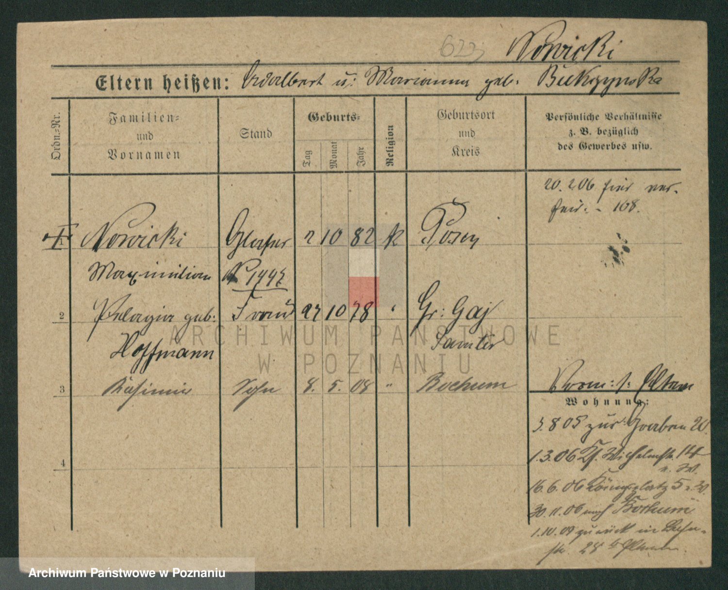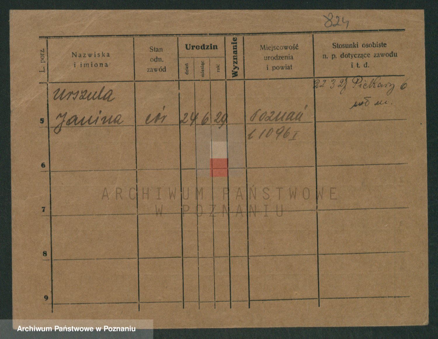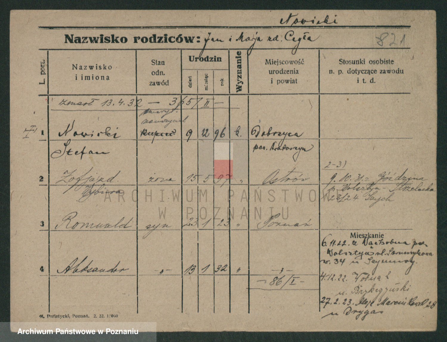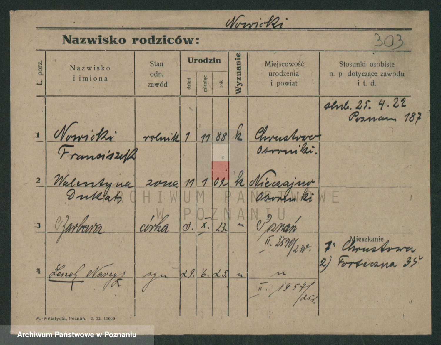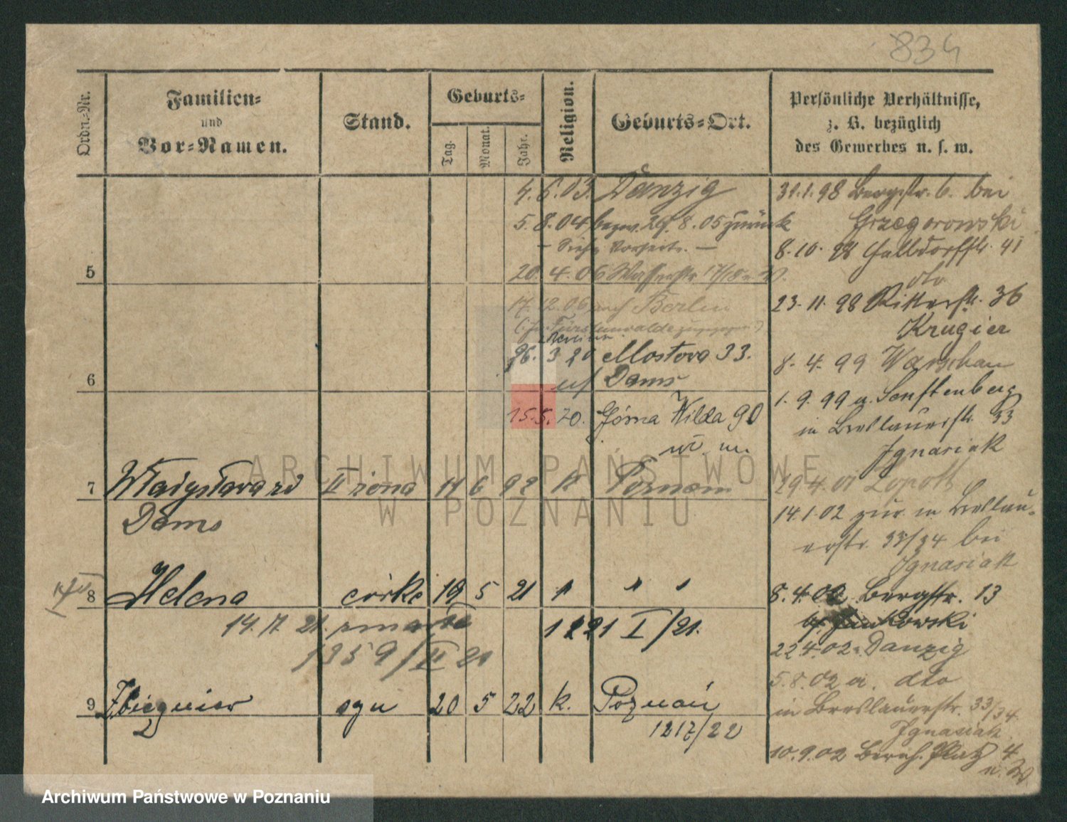 Podgląd karty osobowej dostępny jest po kliknięciu na nazwisko lub ikonkę karty. Można dokonywać powiększenia (ikony na górze) lub przechodzić między kolejnymi skanami (strzałki po bokach).