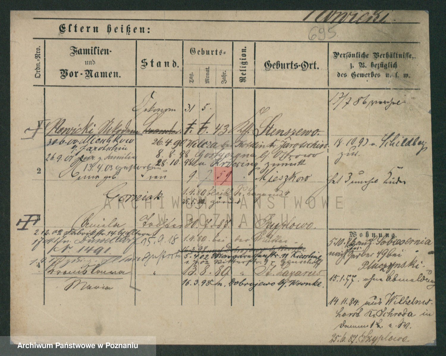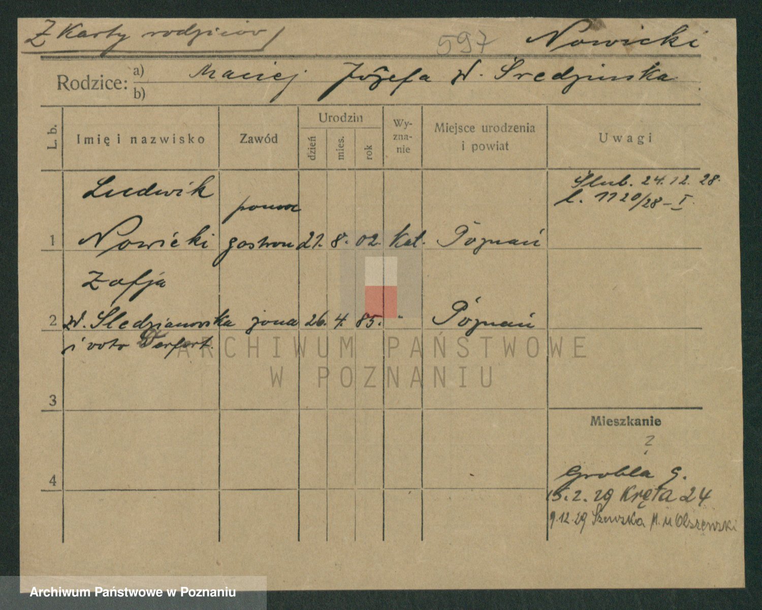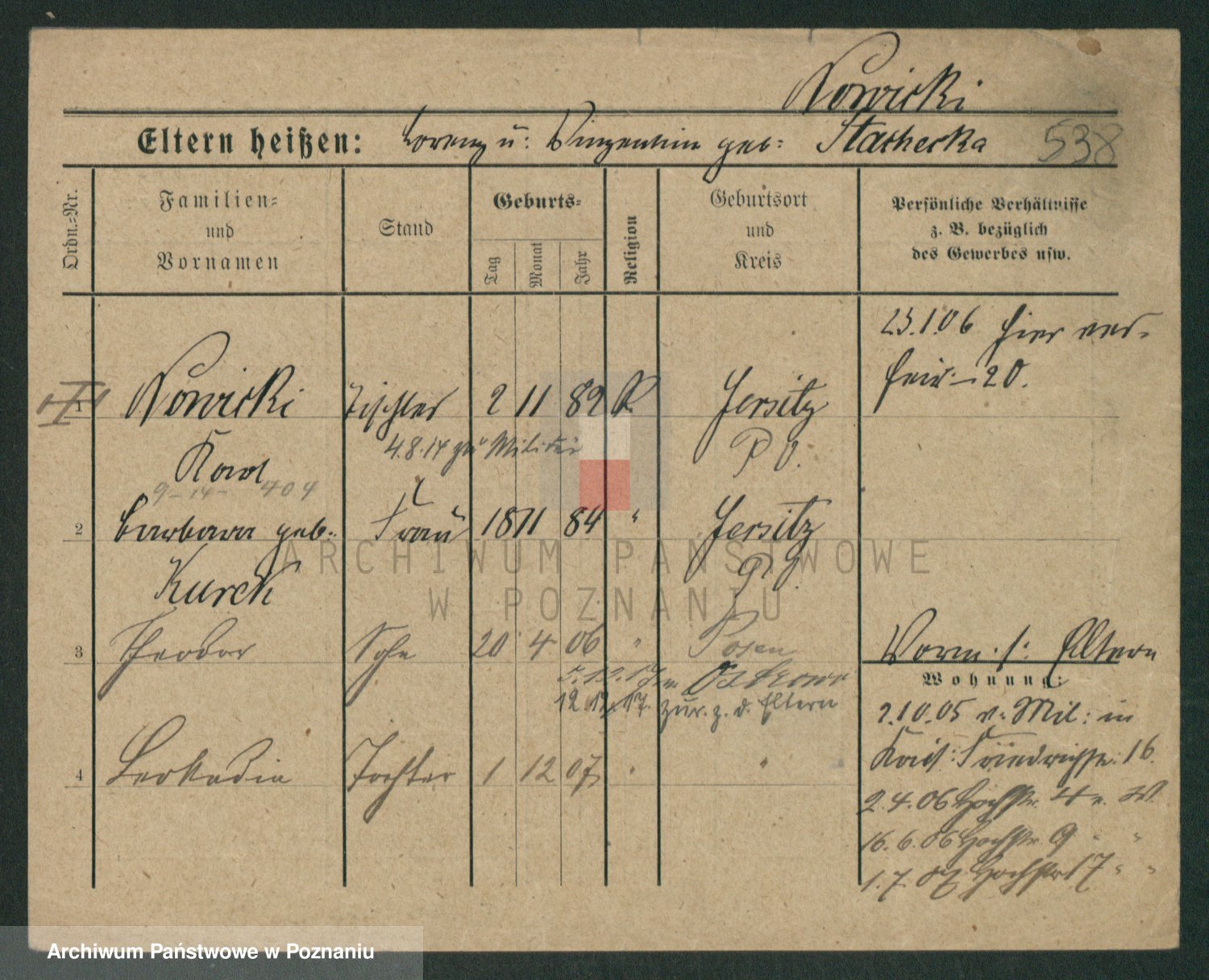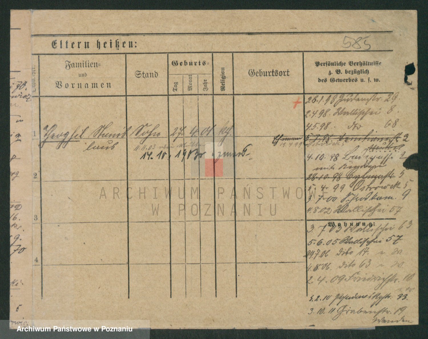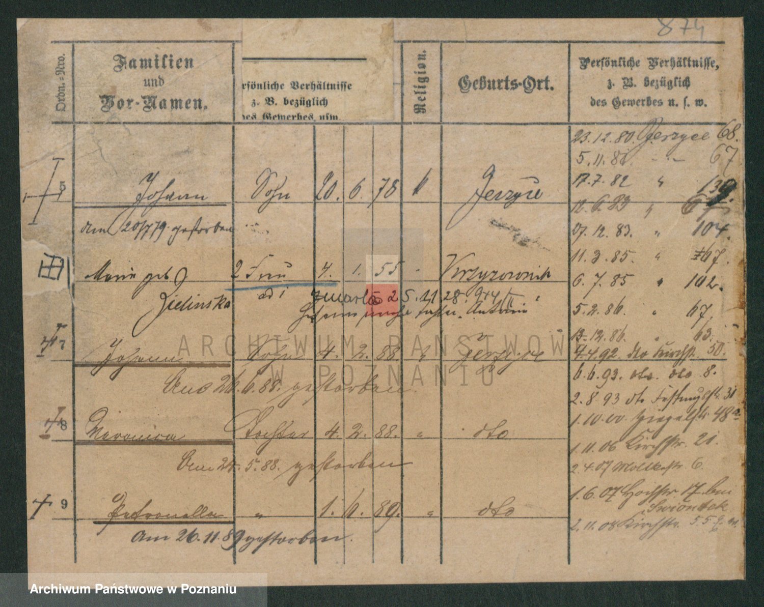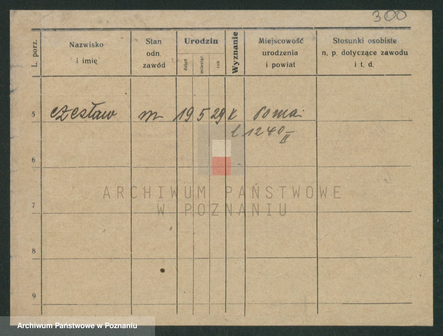 Podgląd karty osobowej dostępny jest po kliknięciu na nazwisko lub ikonkę karty. Można dokonywać powiększenia (ikony na górze) lub przechodzić między kolejnymi skanami (strzałki po bokach).