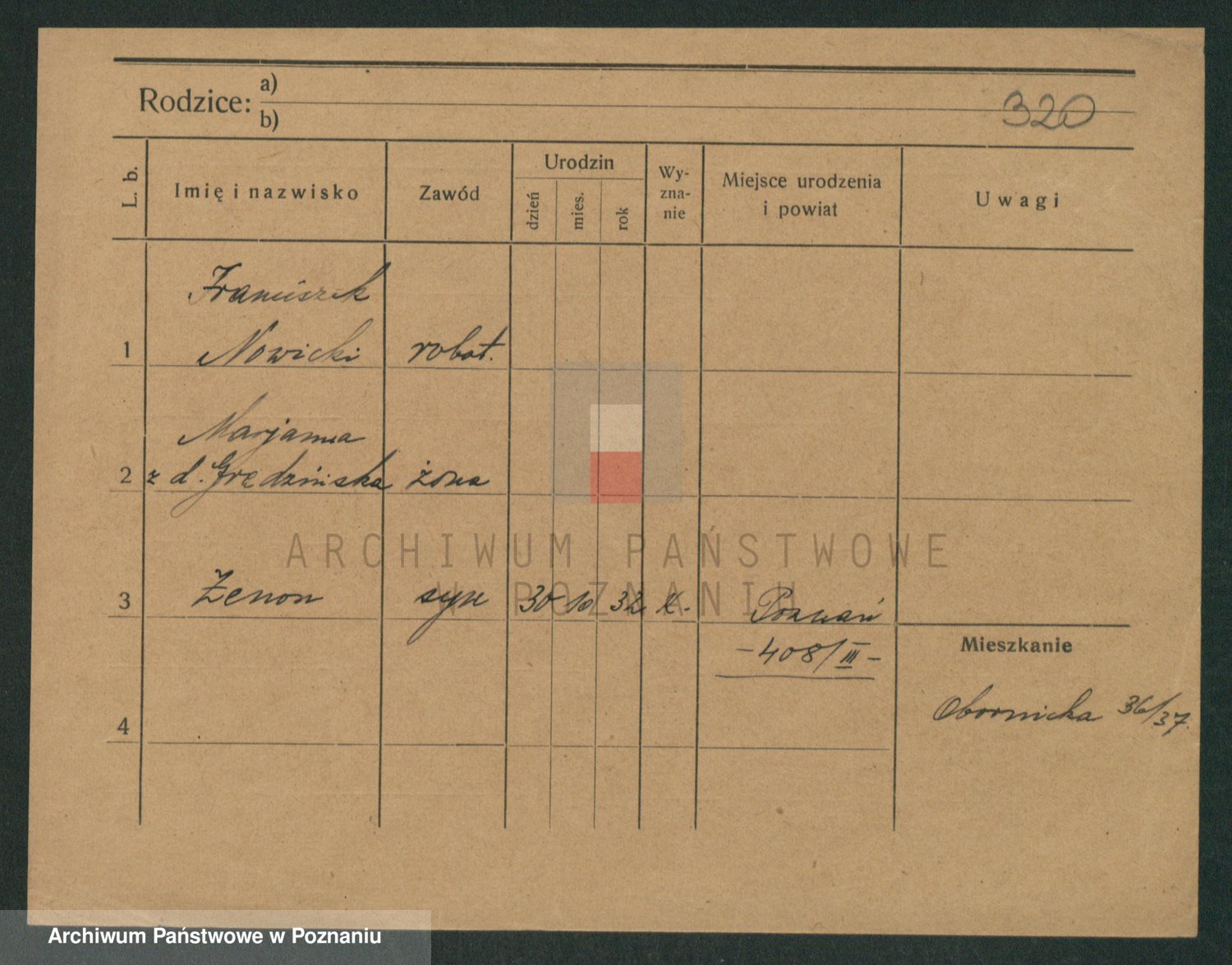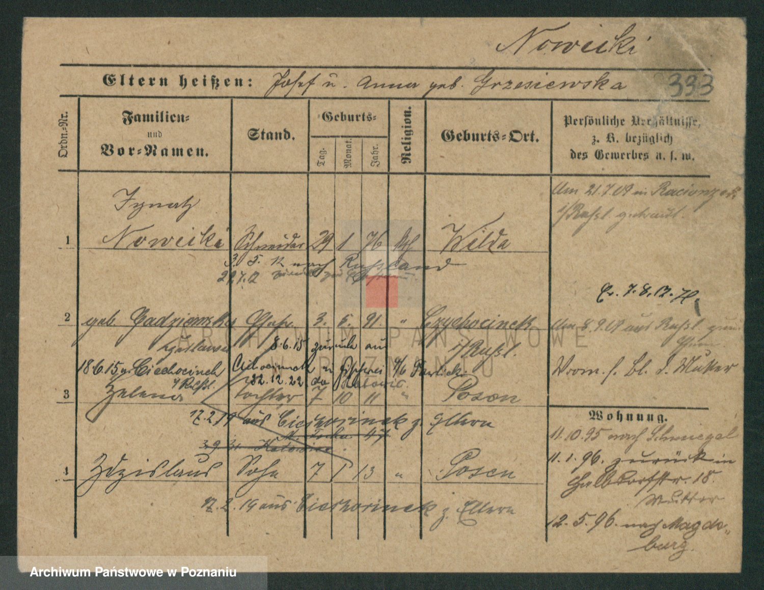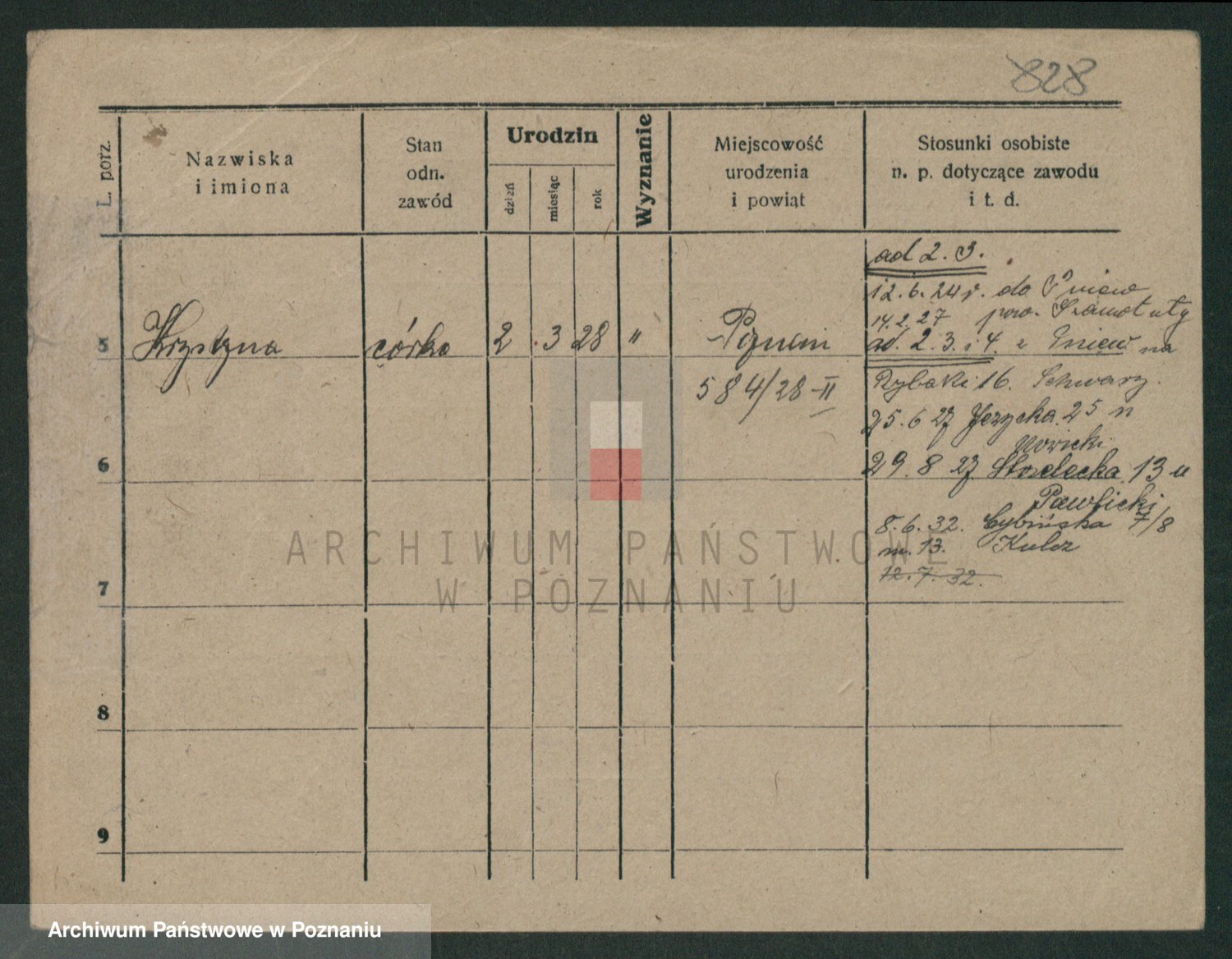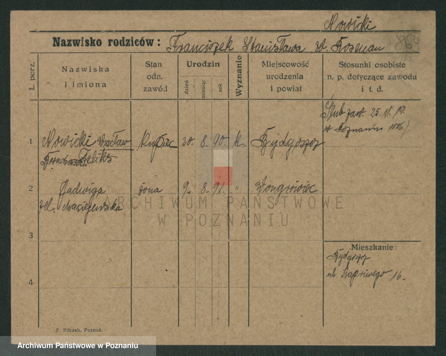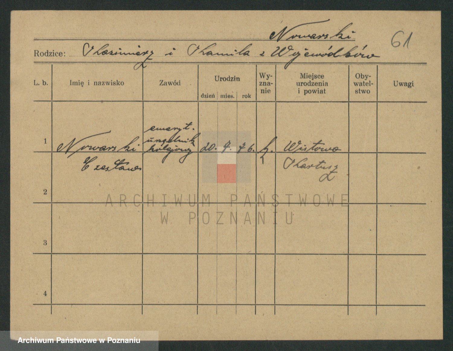 Podgląd karty osobowej dostępny jest po kliknięciu na nazwisko lub ikonkę karty. Można dokonywać powiększenia (ikony na górze) lub przechodzić między kolejnymi skanami (strzałki po bokach).