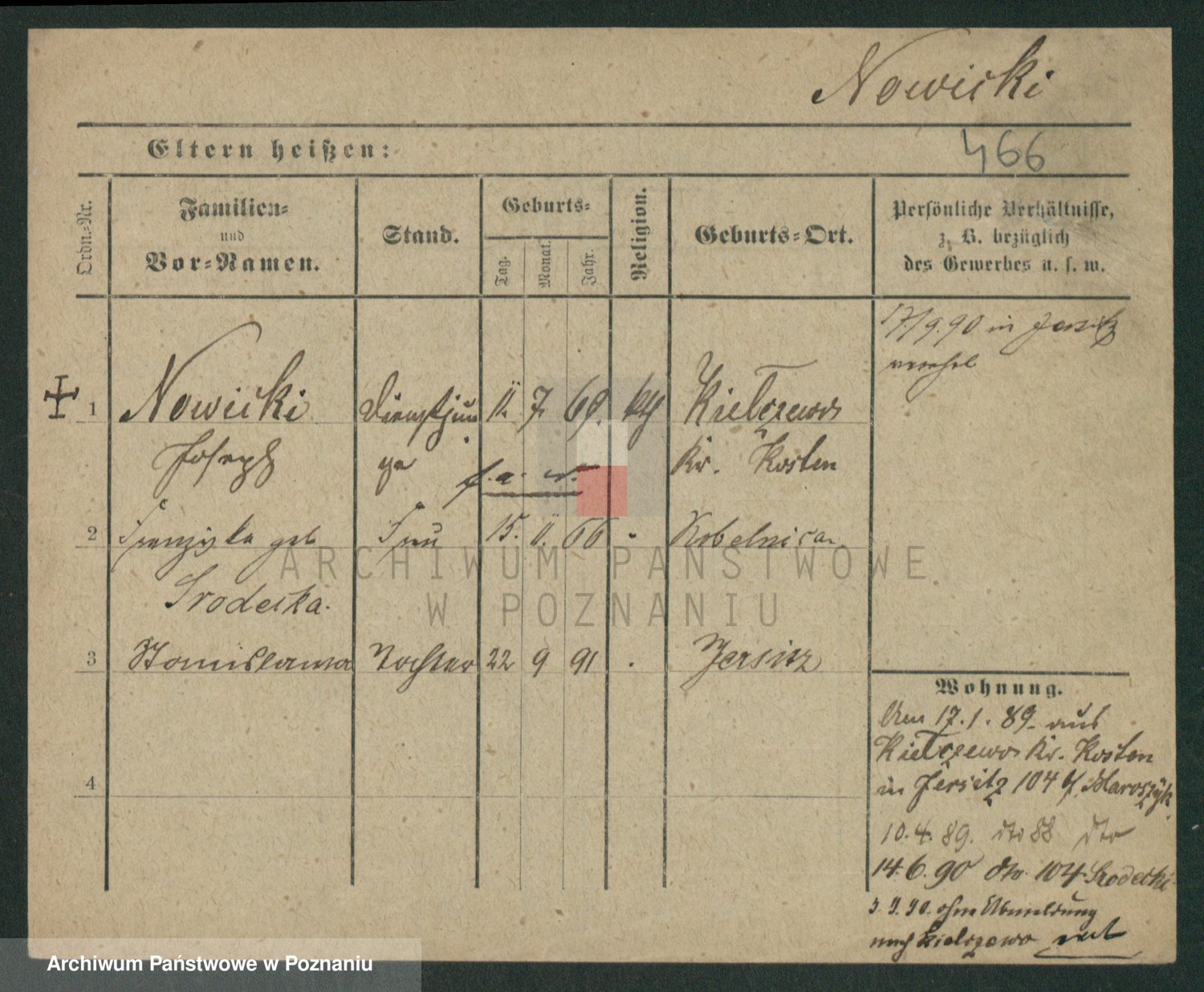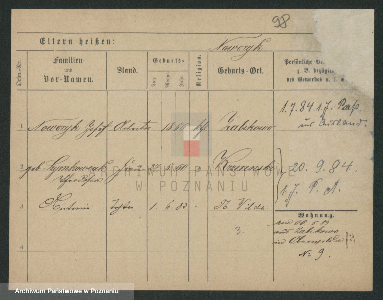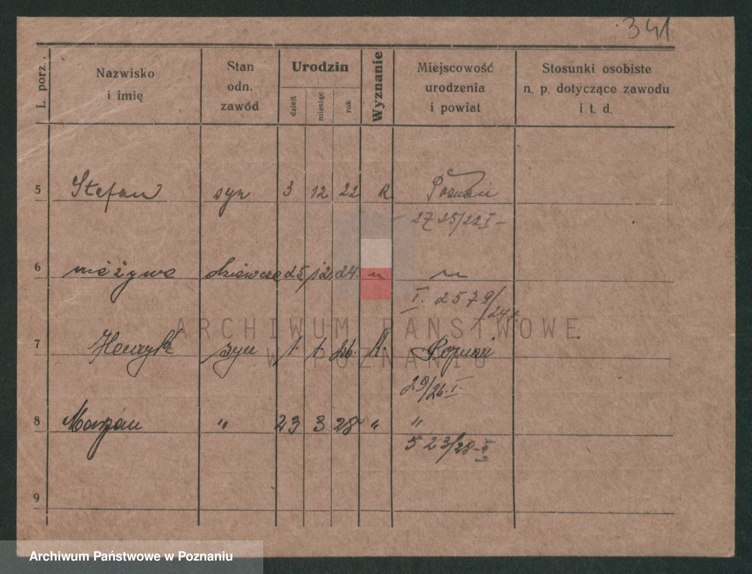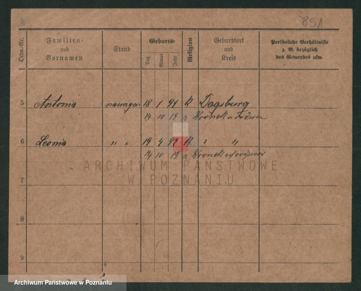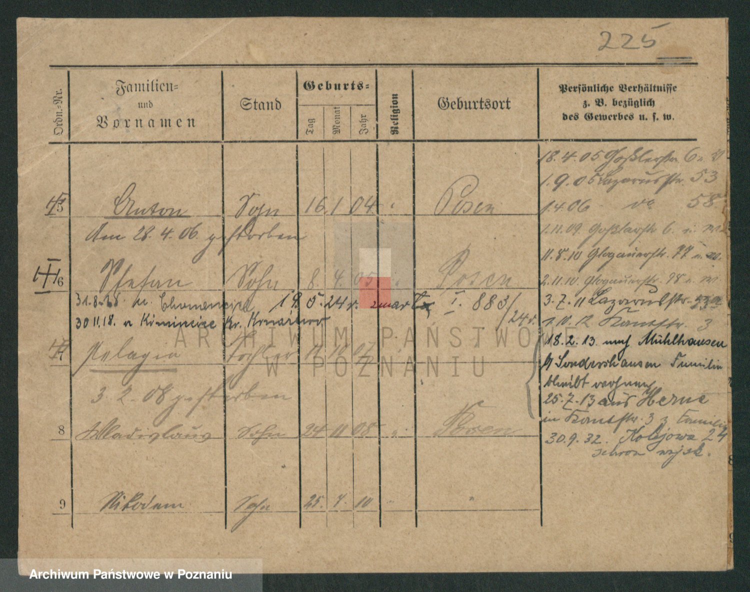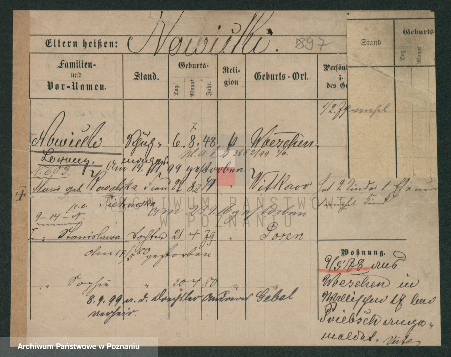 Podgląd karty osobowej dostępny jest po kliknięciu na nazwisko lub ikonkę karty. Można dokonywać powiększenia (ikony na górze) lub przechodzić między kolejnymi skanami (strzałki po bokach).